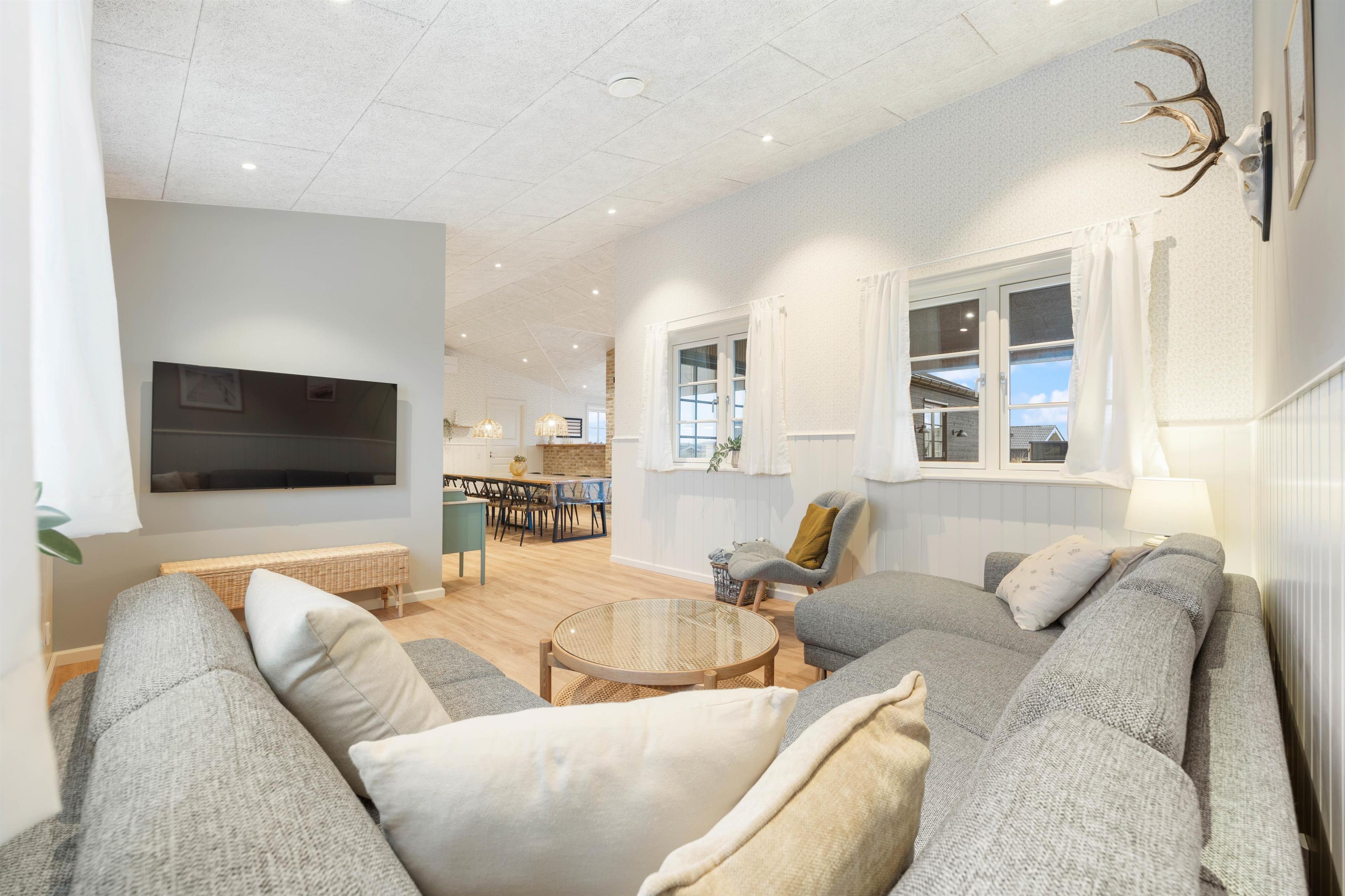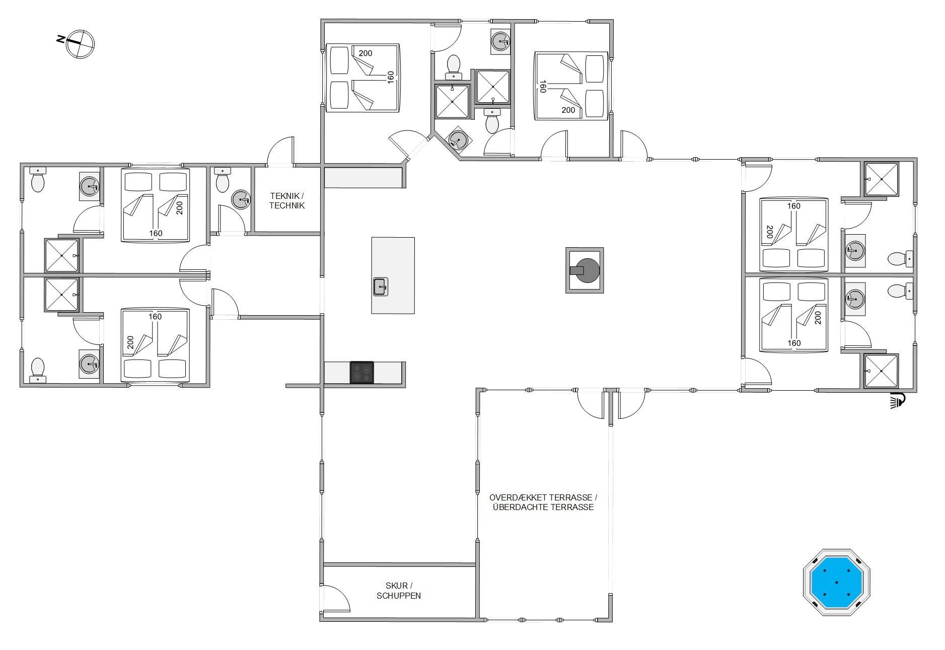 Den praktiske planløsning er med til at gøre dette sommerhus helt specielt. De 6 soveværelser med dobbeltsenge er placeret i sommerhusets hjørner, så man kan trække sig tilbage i fred og ro – og alle har eget badeværelse.