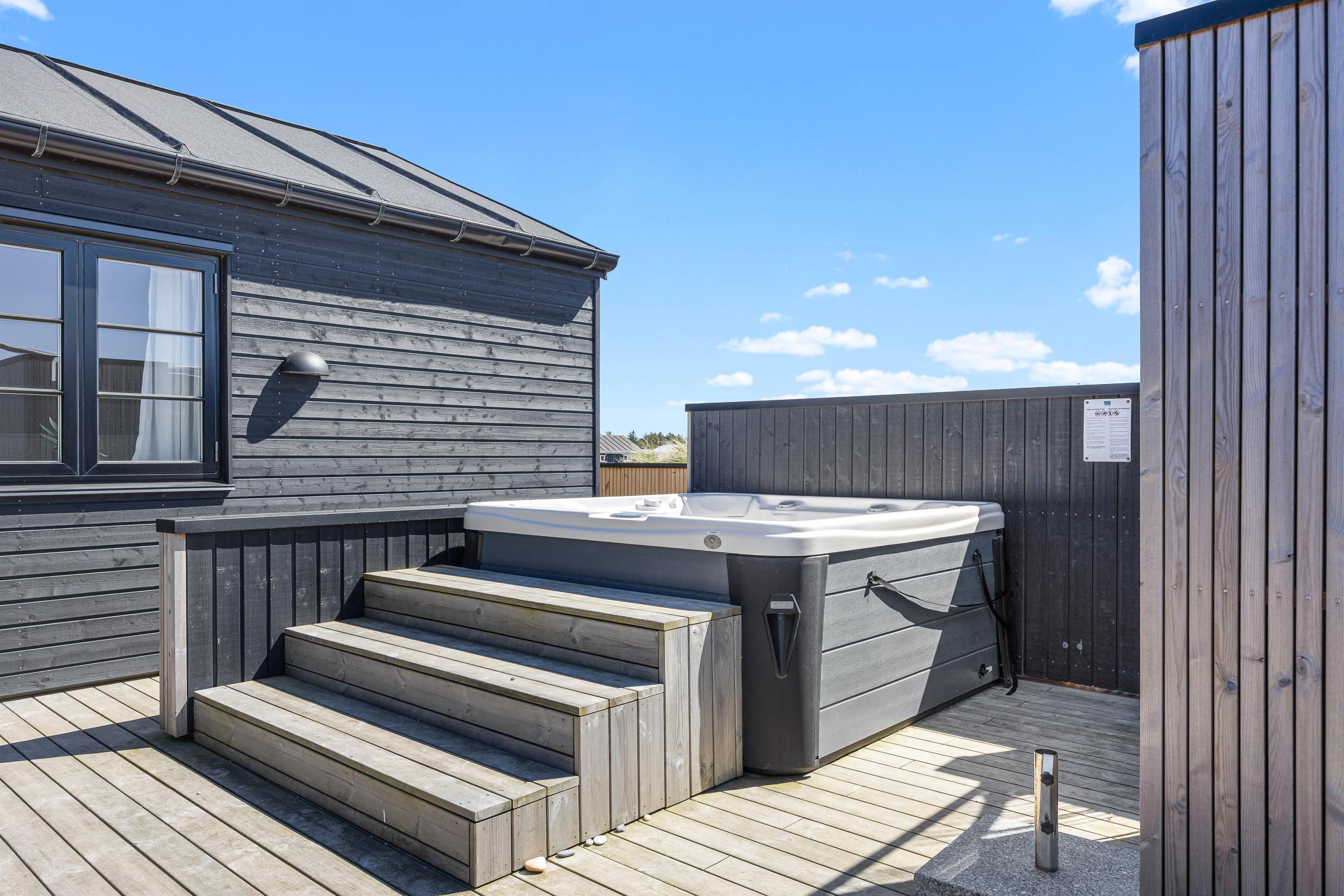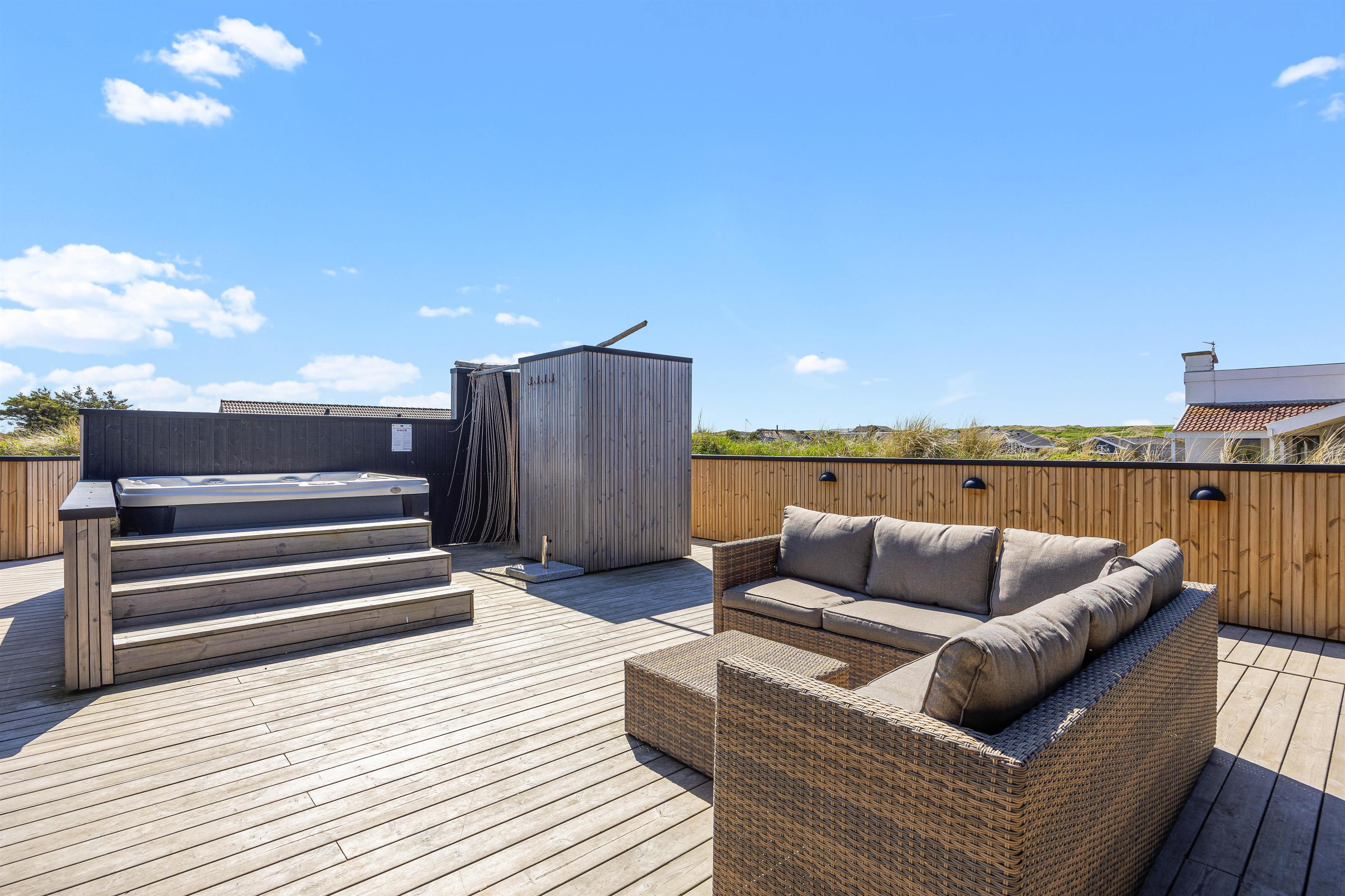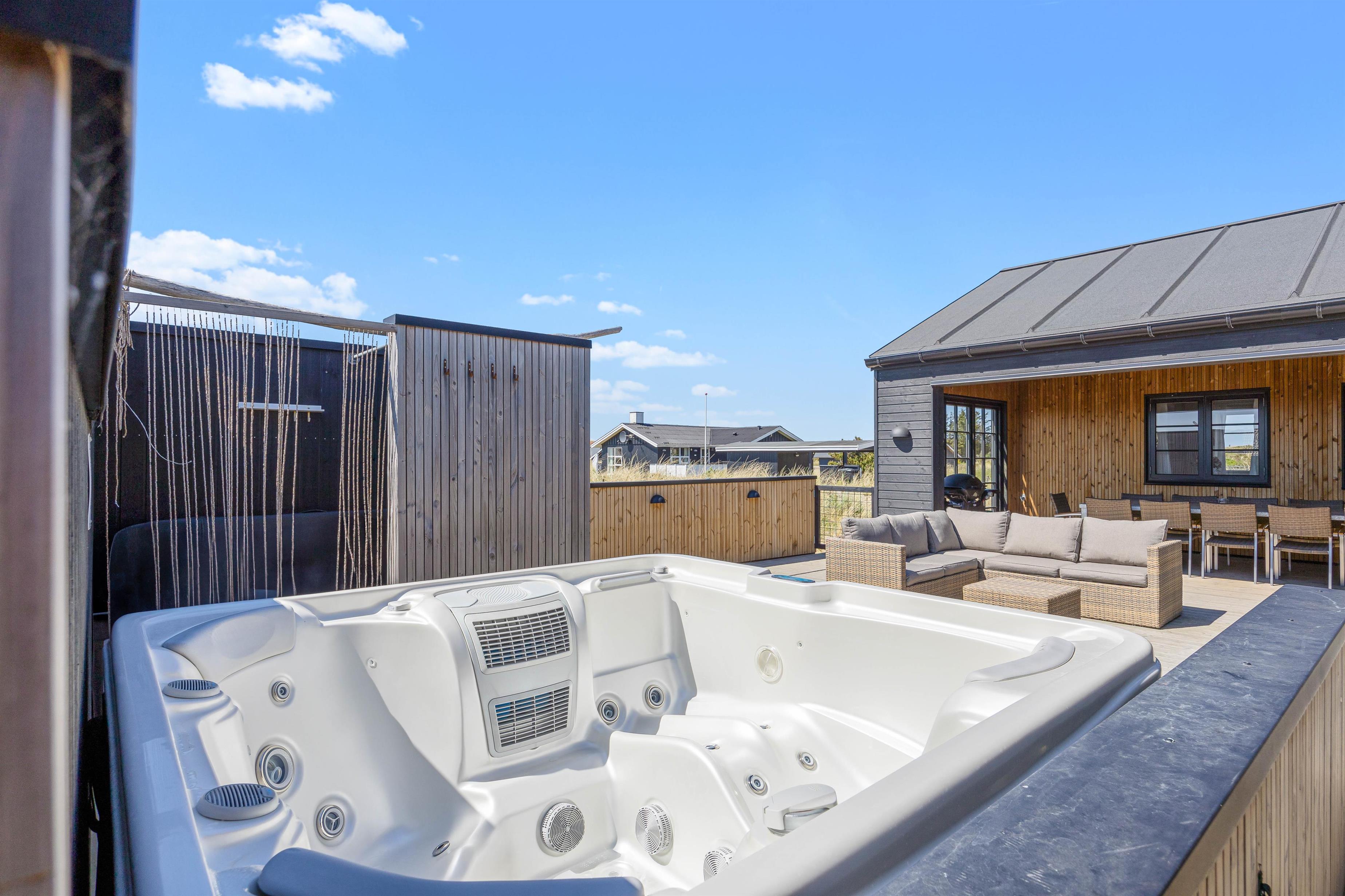 Med kun 450 meter til Vesterhavet vil stranden og bølgernes brus uden tvivl tiltrække jeres opmærksomhed. Her kan I tilbringe mange skønne timer med hunden i snor, slå smut og soppe i strandkanten, solbade eller tage en dukkert. Når I kommer tilbage til sommerhuset, kan I skylle sandet af under udebruseren i de varme måneder, og eventuelt slutte af i den varme udespa. Udebruseren kan benyttes fra april til november.