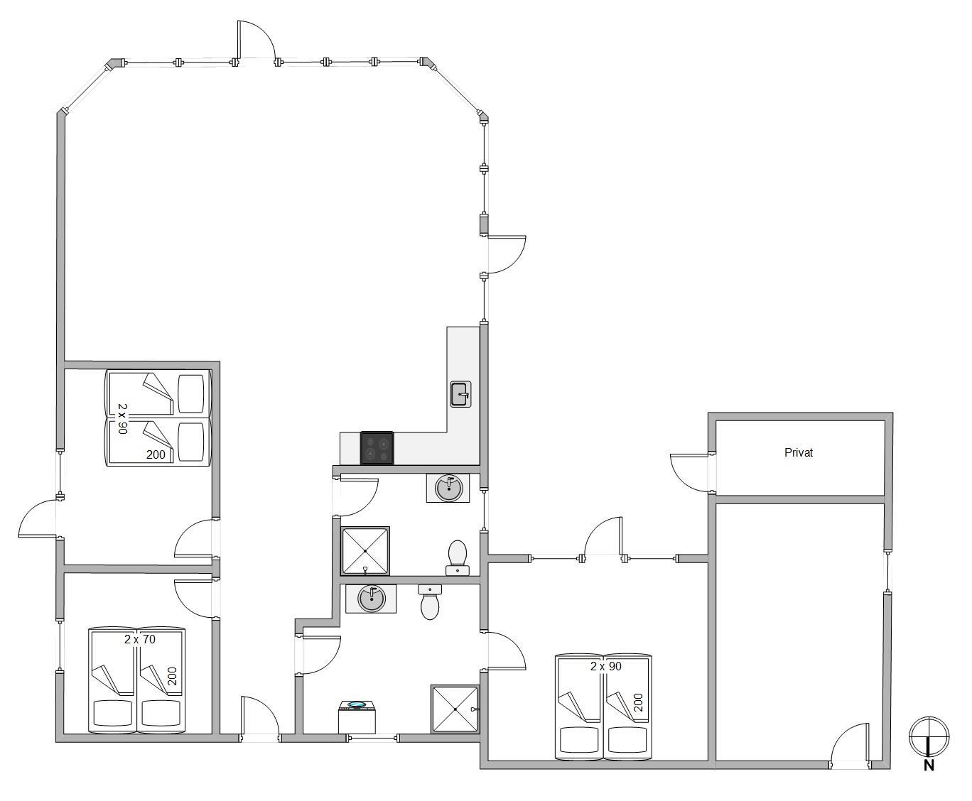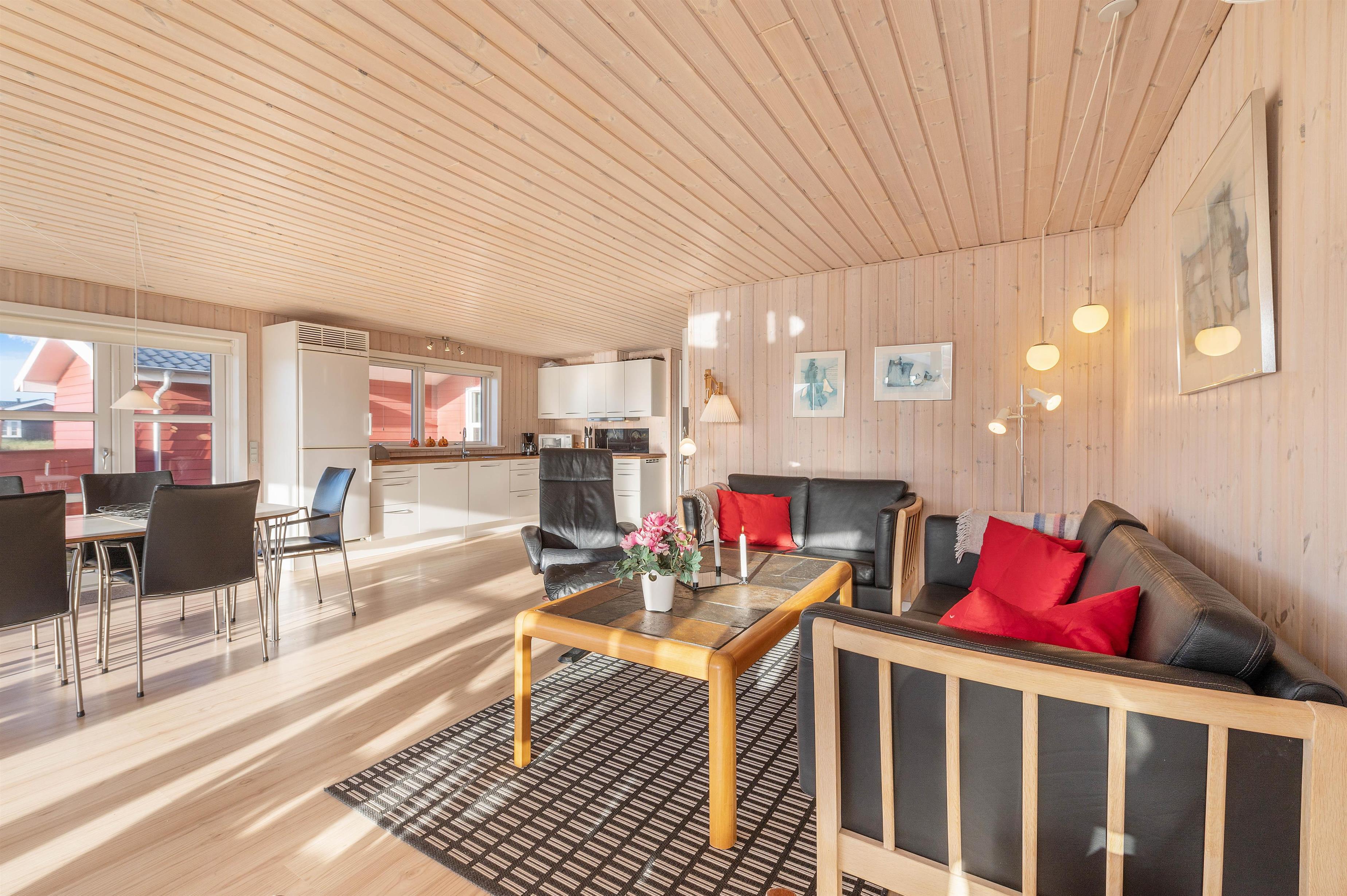 Køkkenet i sommerhuset, som er veludstyret med bl.a. opvaskemaskine og fryser er i åben forbindelse med stuen, som indeholder spiseafdeling og 2 hyggeområder. Her findes varmpepumpe og fladskærmsTV med parabol samt radio. Trægulvene og de træbeklædte vægge går igen i to af de tre soverum, hvoraf alle er med dobbeltsenge. De to af soverummene har direkte udgang til terrasserne.