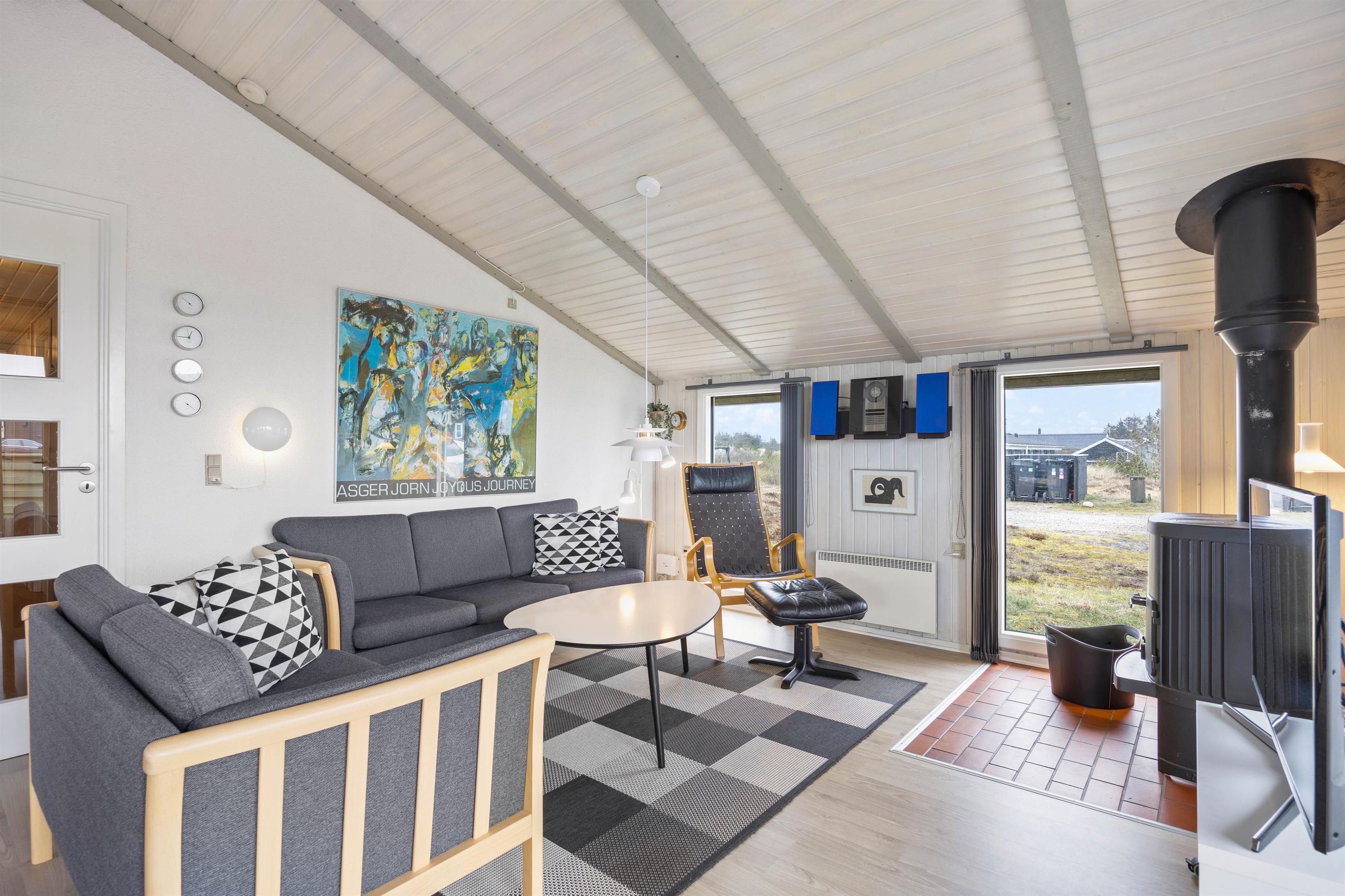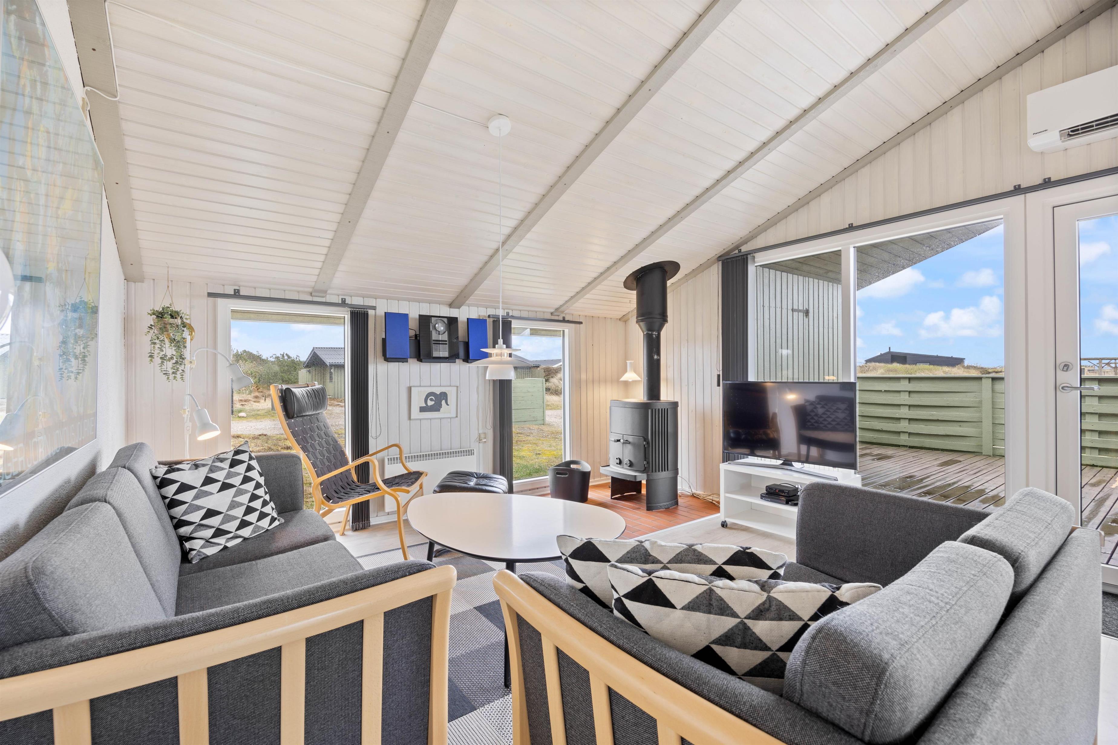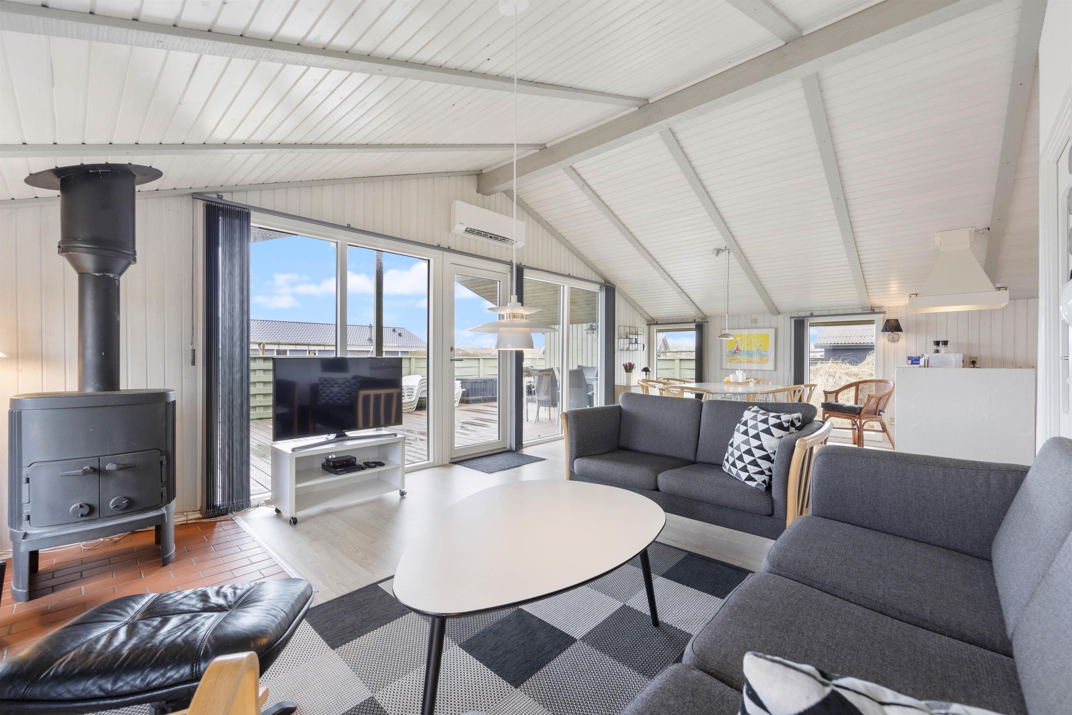 Den hyggelige stue har pæne og komfortable møbler, brændeovn og står i åben forbindelse med køkkenet. Stuen har vinduespartier fra gulv til loft, som skaber et godt lysindfald i rummet. Desuden har sommerhuset en energibesparende varmepumpe, som I kan benytte jer af.