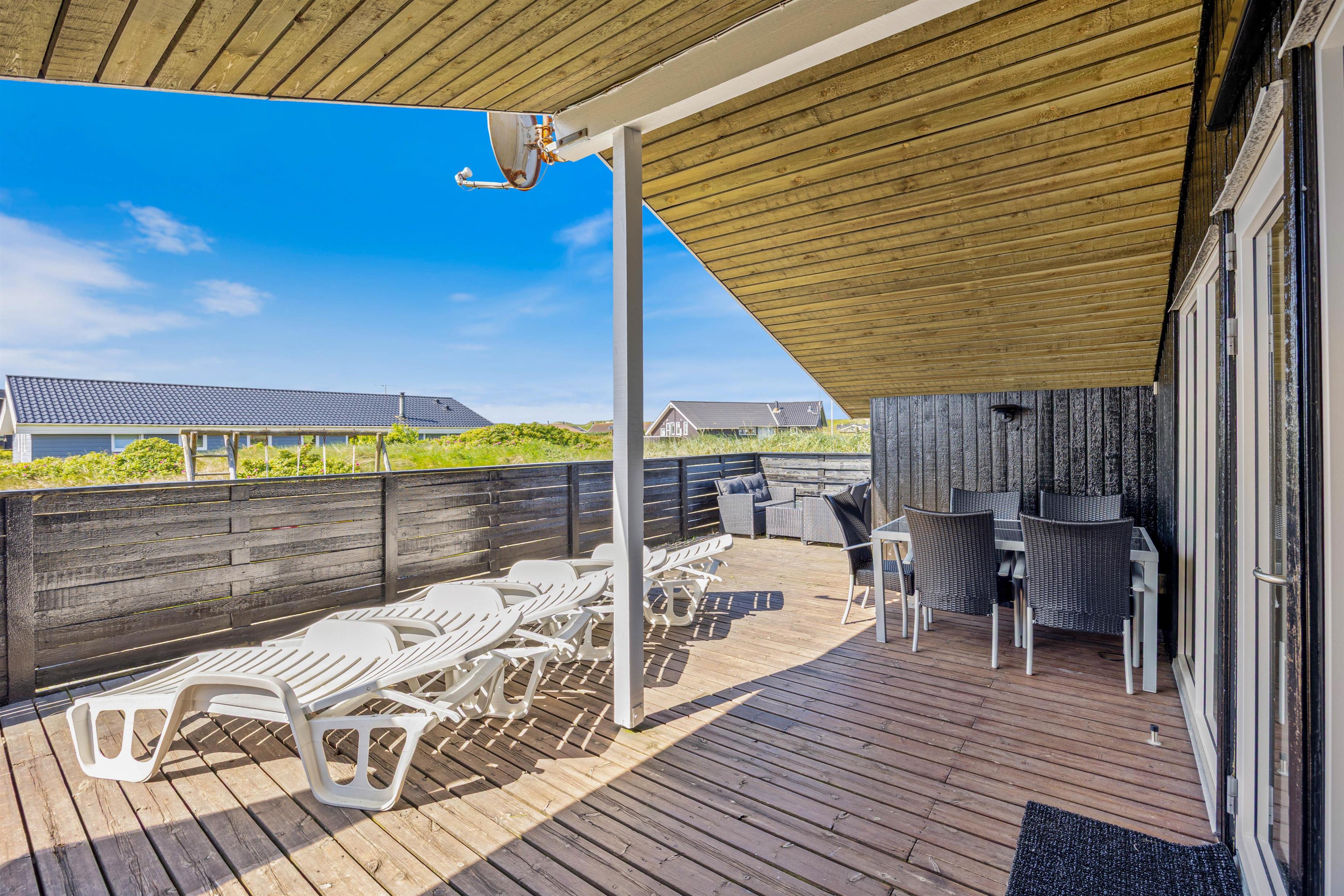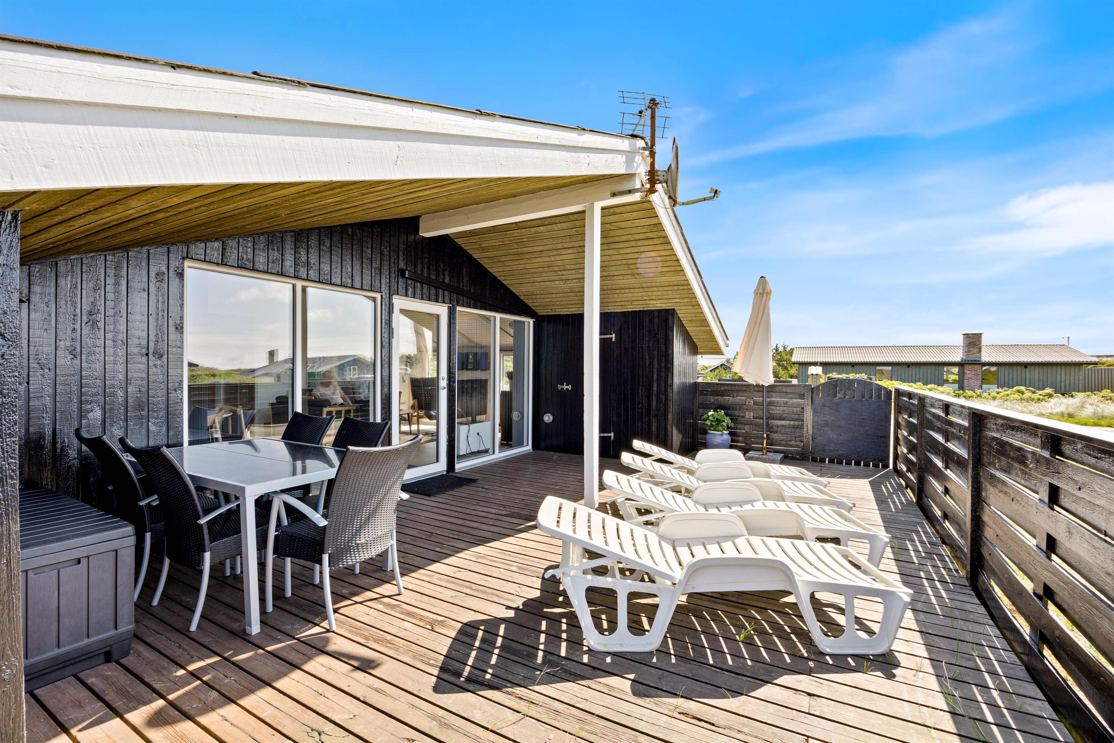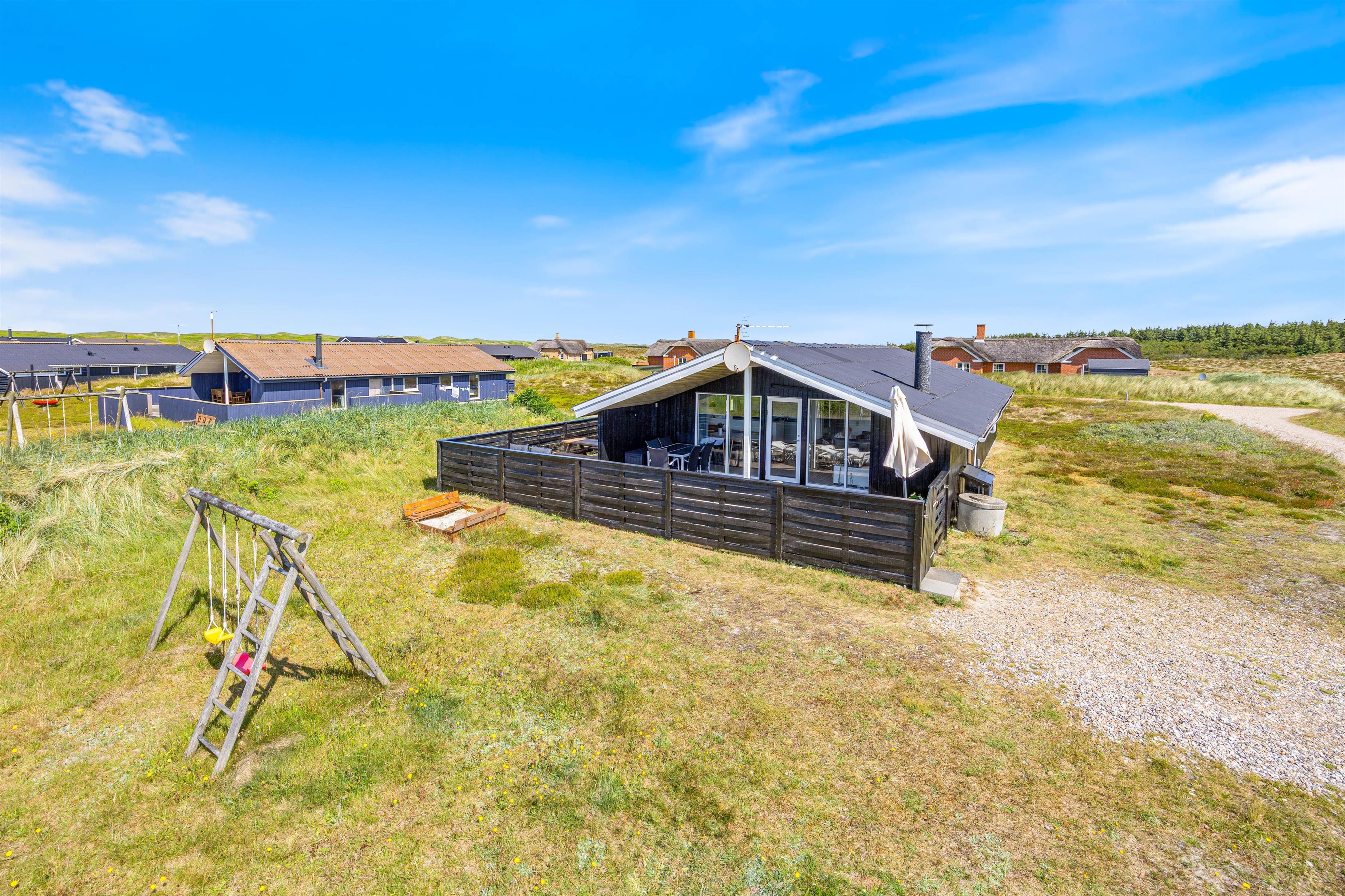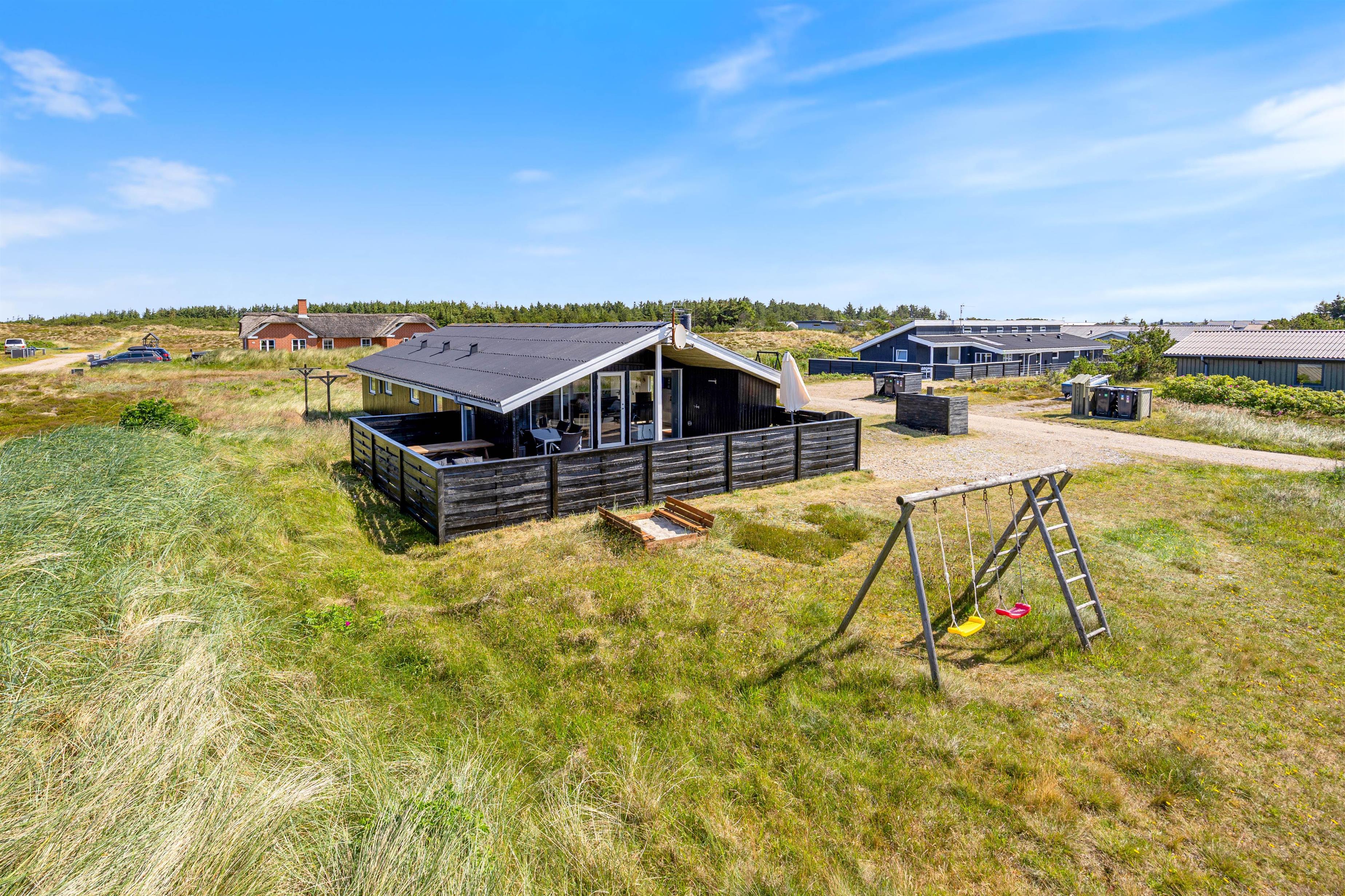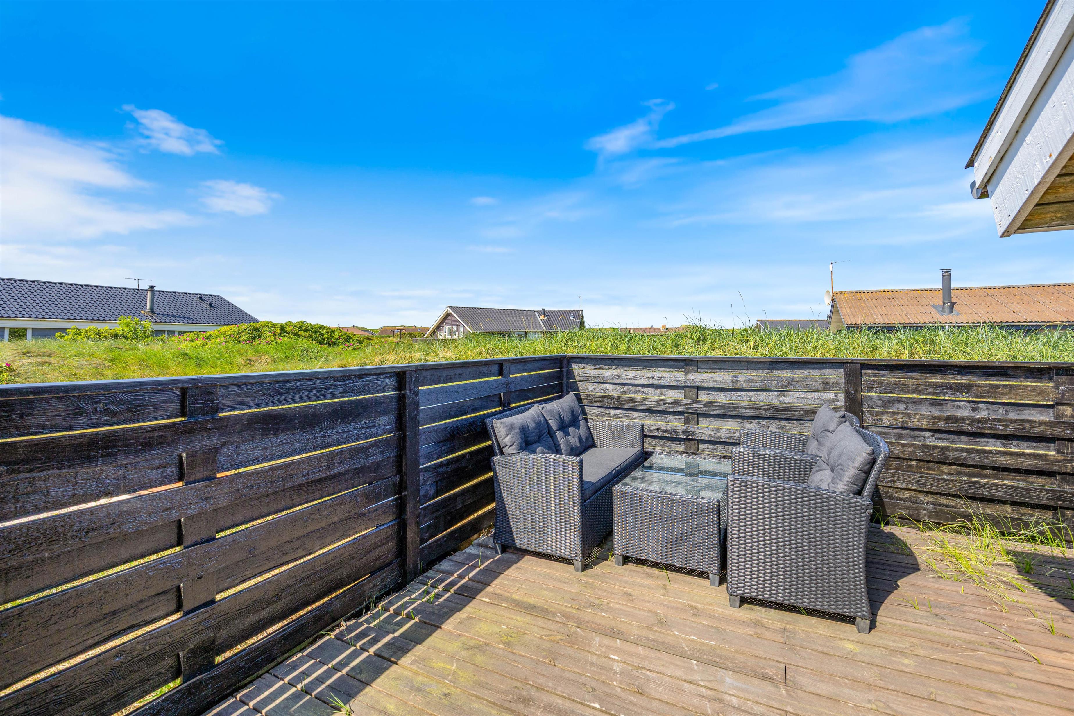 Fra stuen er der udgang til den delvist overdækkede og helt lukkede terrasse. Her er naturligvis havemøbler, liggestole og grill til rådighed, så I kan nyde den friske havluft fra terrassen. Børnene kan få tiden til at gå på naturgrunden, som både er udstyret med gyngestativ og sandkasse.