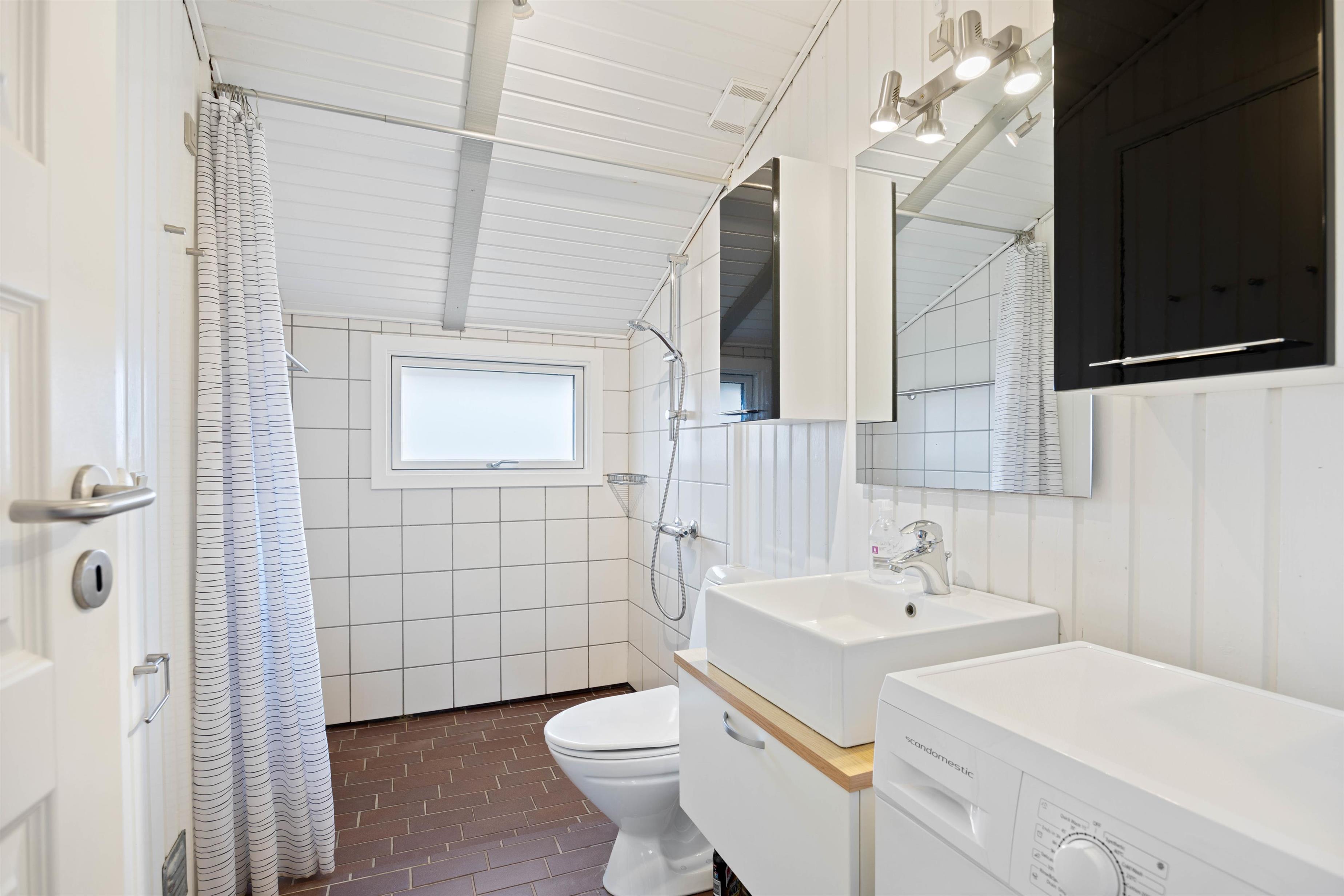 Her er badeværelse med gulvvarme, bruser og sauna. Og som et ekstra plus er der vaskemaskine i feriehuset, så I, hvis nødvendigt, kan vaske lidt tøj eller håndklæder i løbet af ferien.