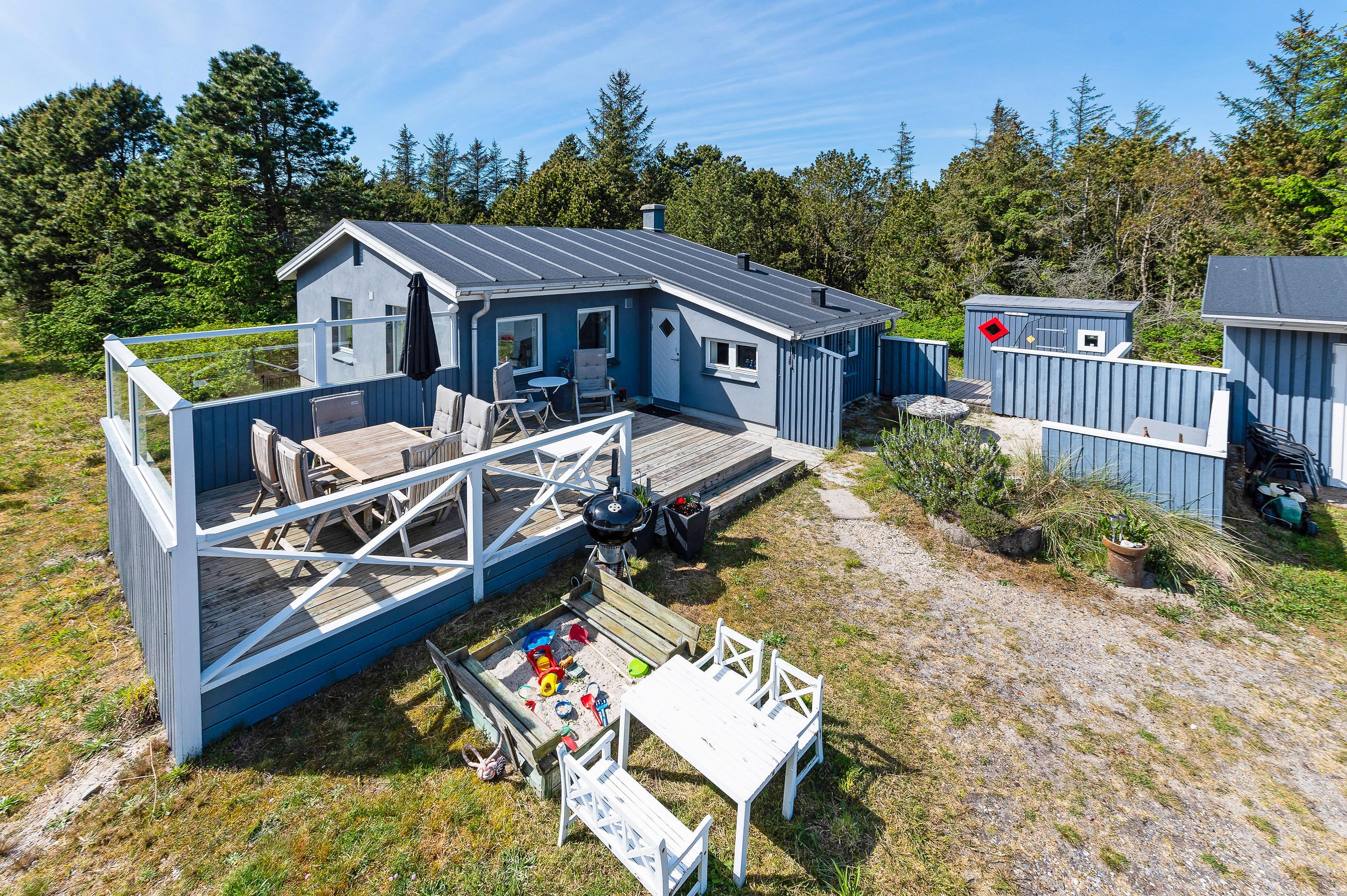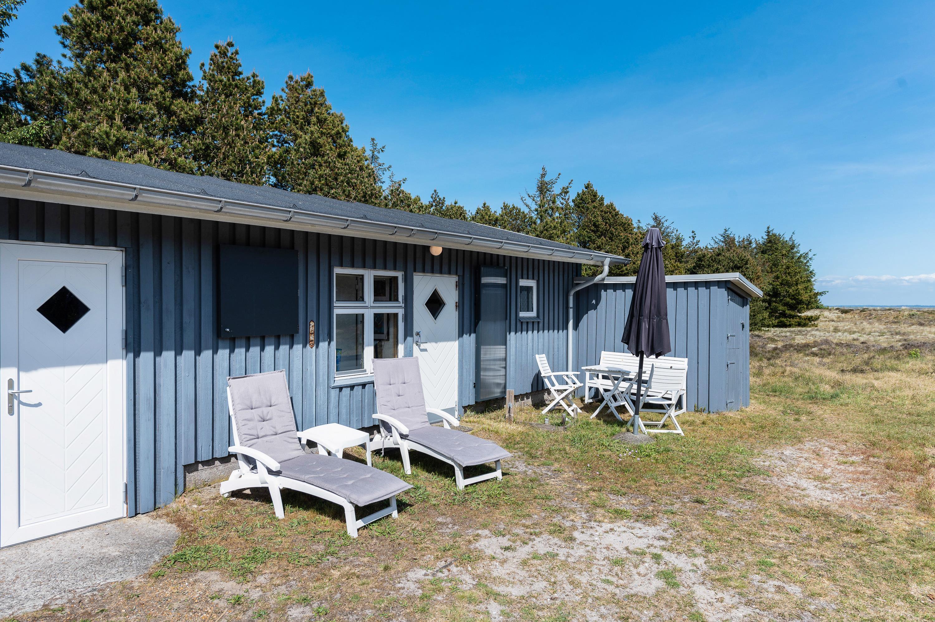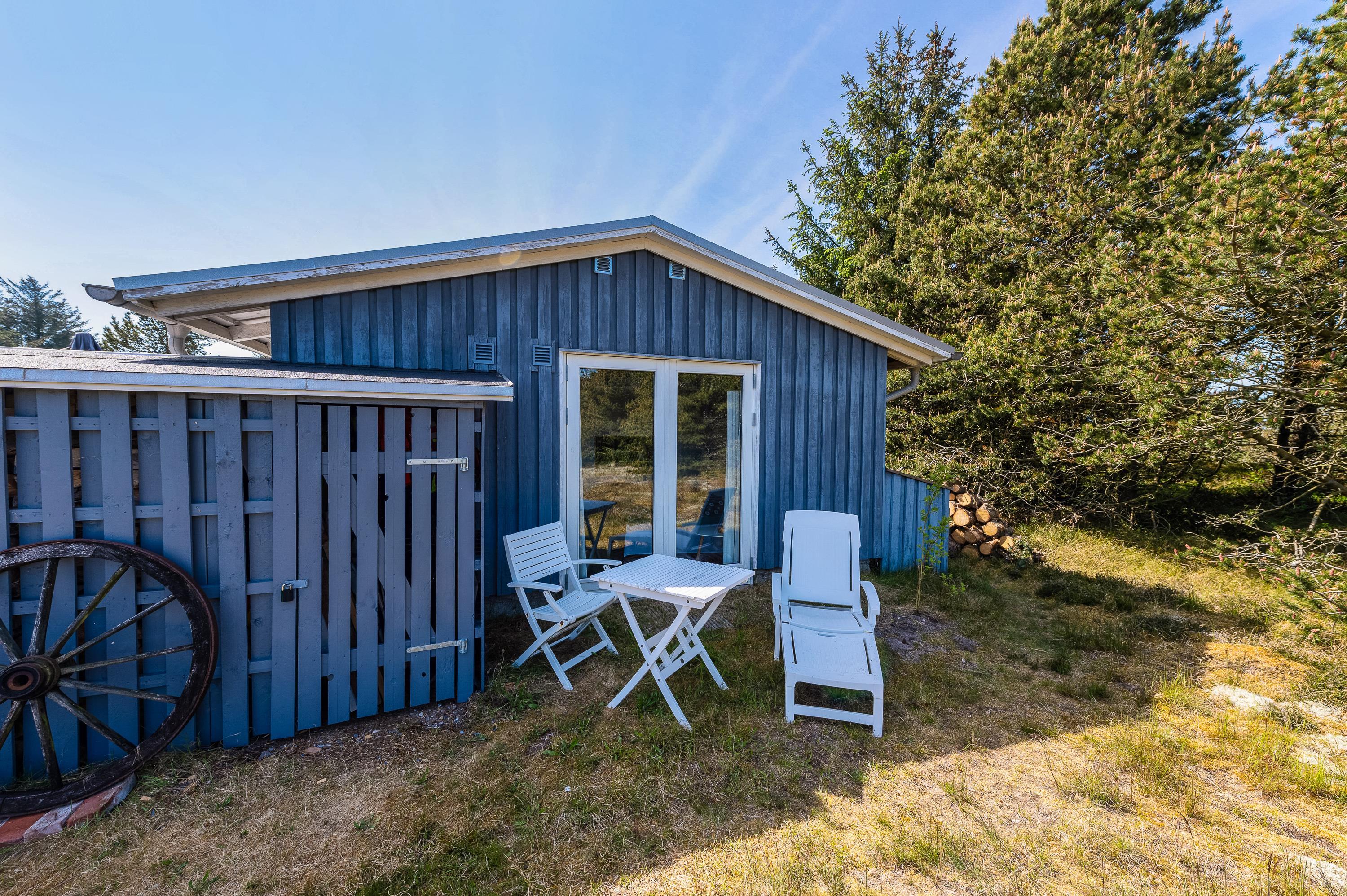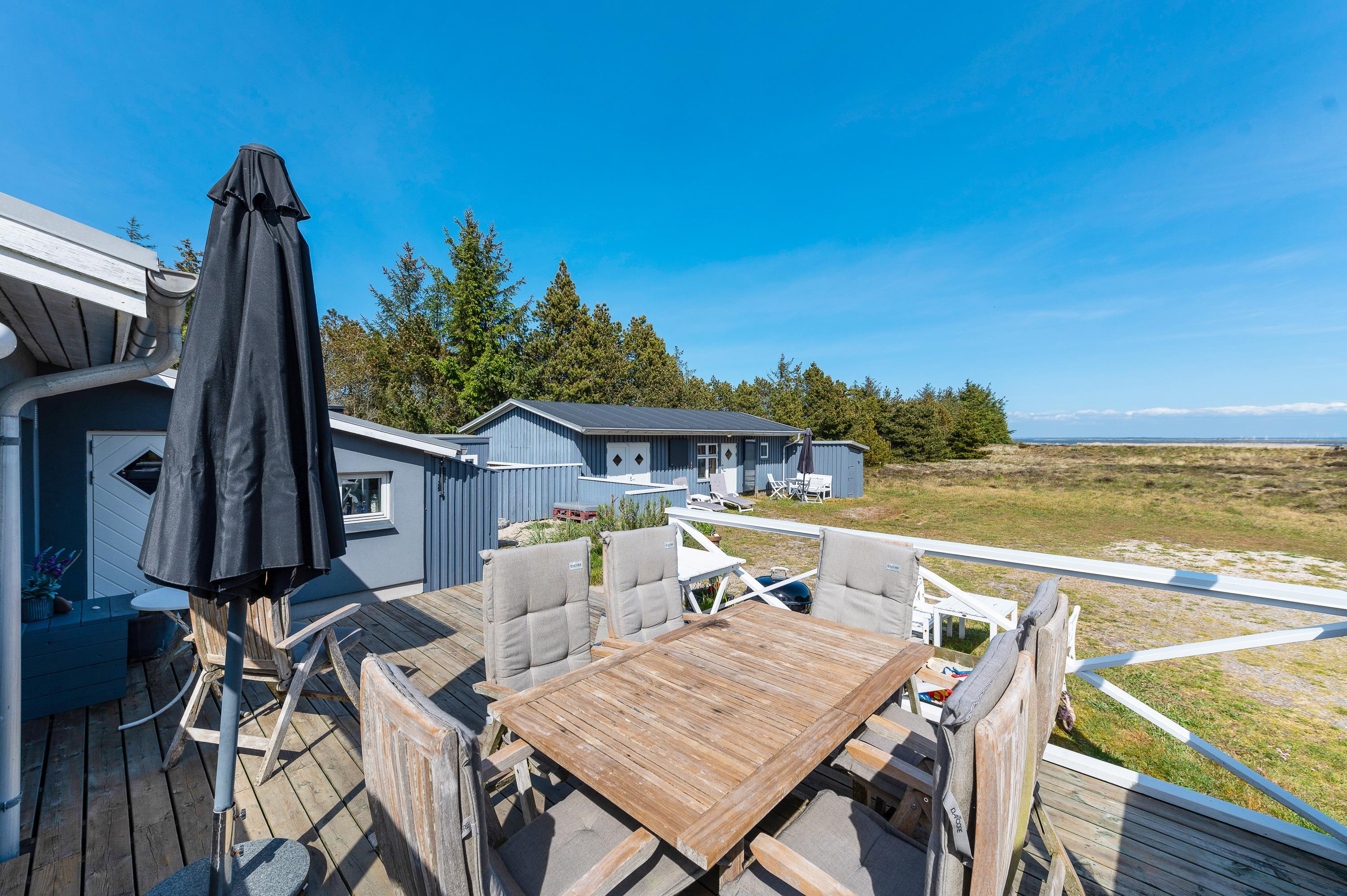 Den sydøstvendte terrasse er det perfekte sted at opholde sig, hvis I kan lide frisk luft, smuk natur, og fred og ro. Mod nord og vest skærmer feriehuset for vinden, så her er som regel læ. Terrassen er hævet, så man får fuld udbytte af de flotte omgivelser. Nyd en solopgang med en kop kaffe i hånden og et tæppe svøbt om skuldrene, – det er rigtig ferie.