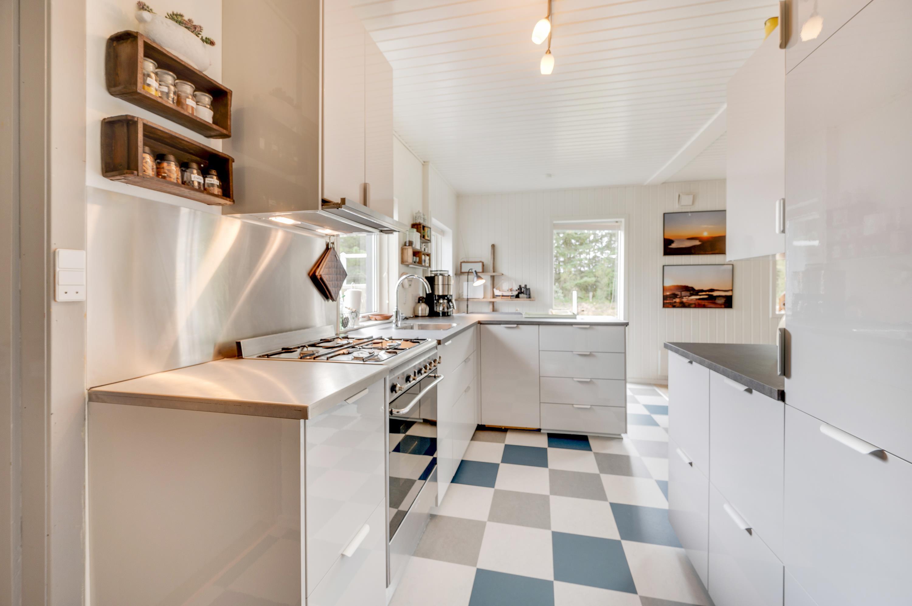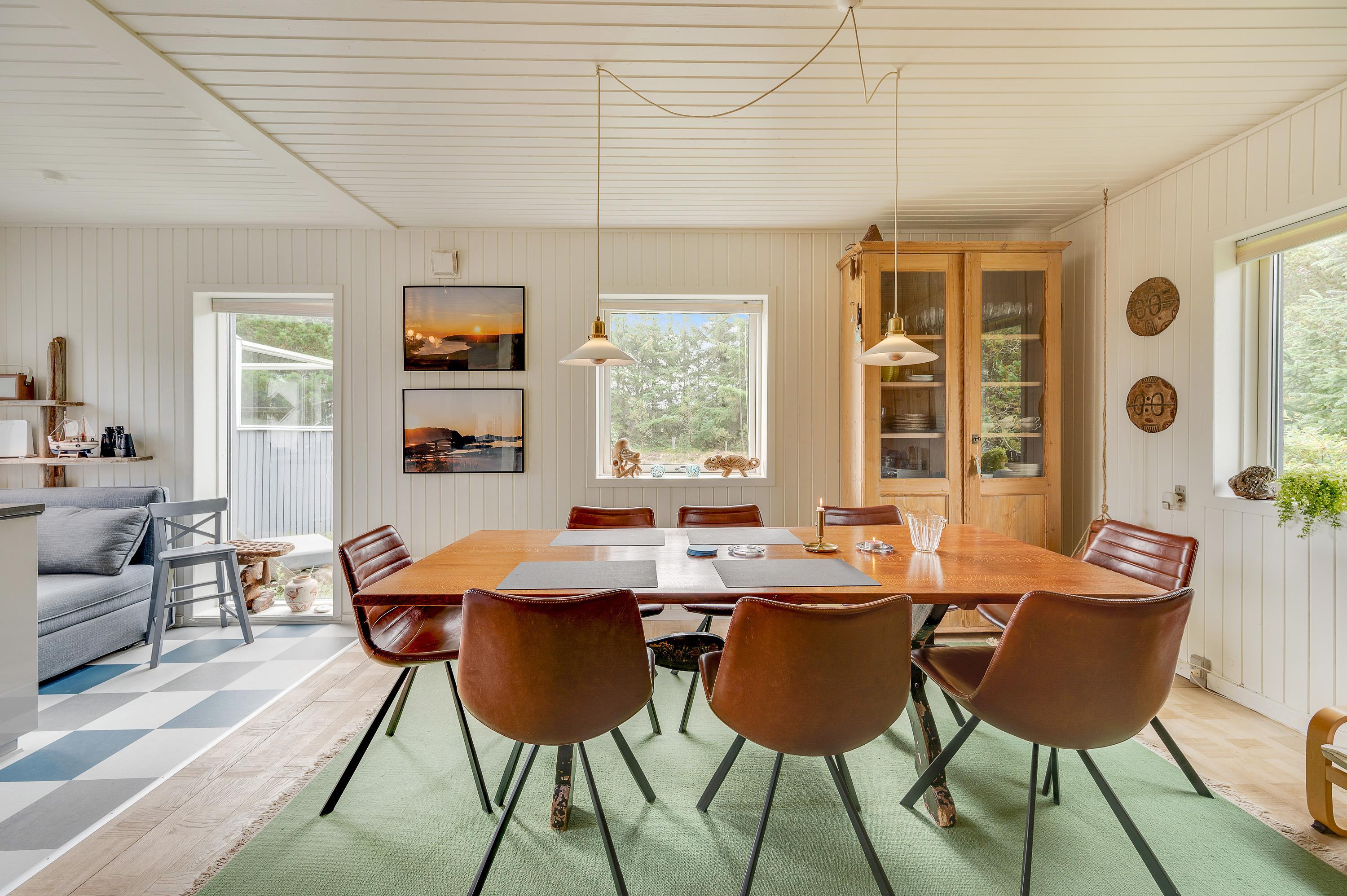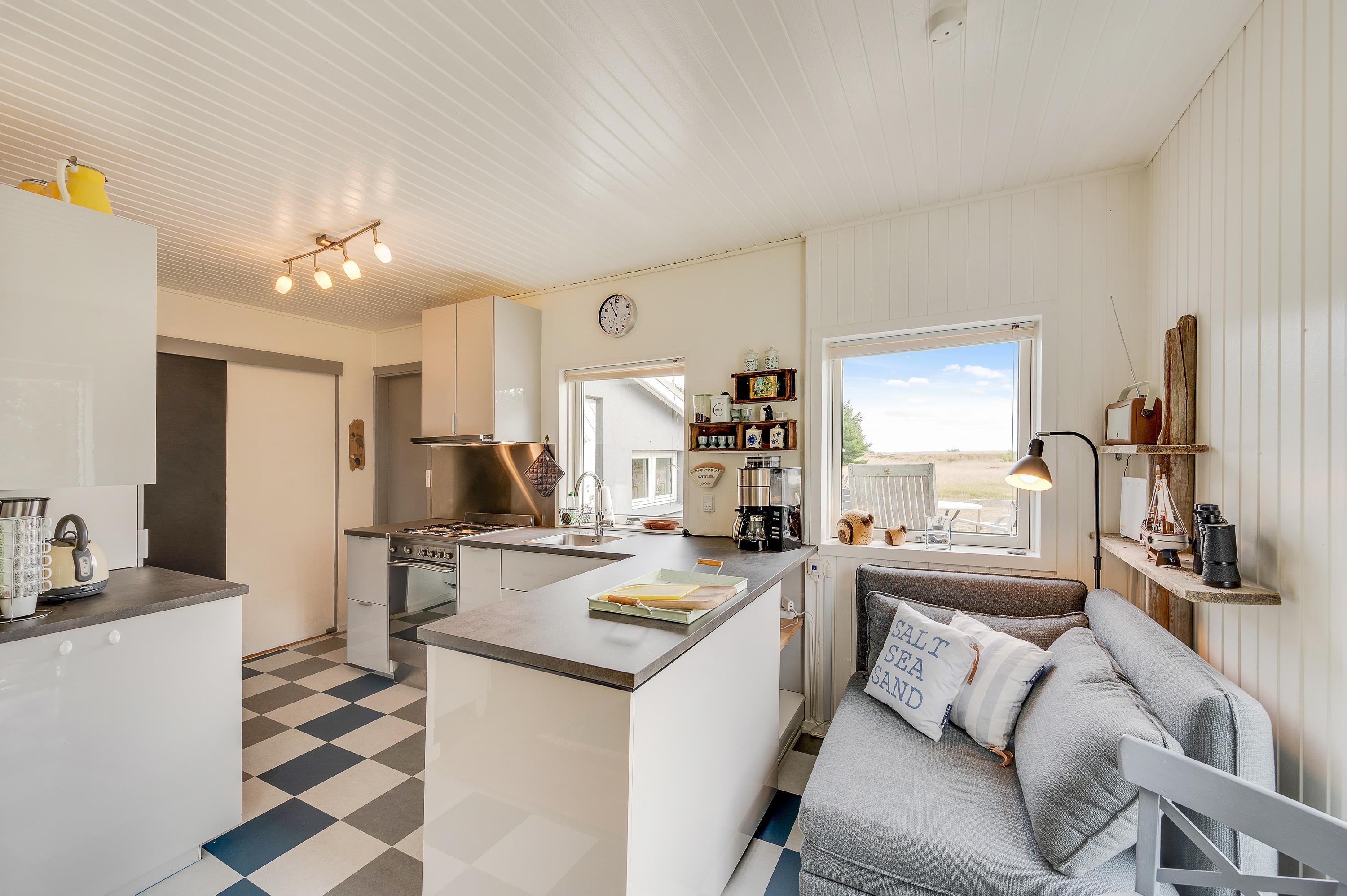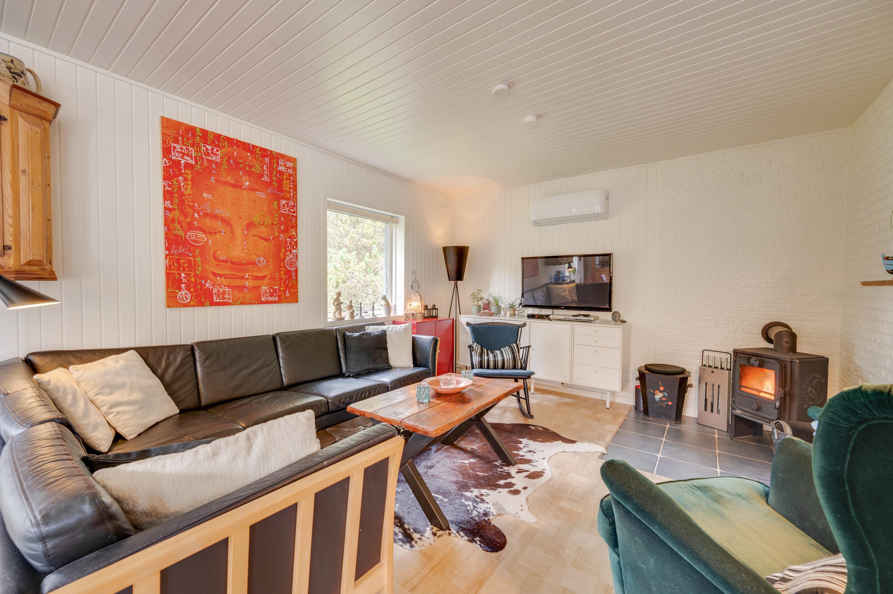 I sommerhusets køkken er der udsigt til fjorden i åben forbindelse med hyggelig og personligt indrettet stue. Tænd op i brændeovnen på en kølig dag, og nyd stilheden og den smukke udsigt.