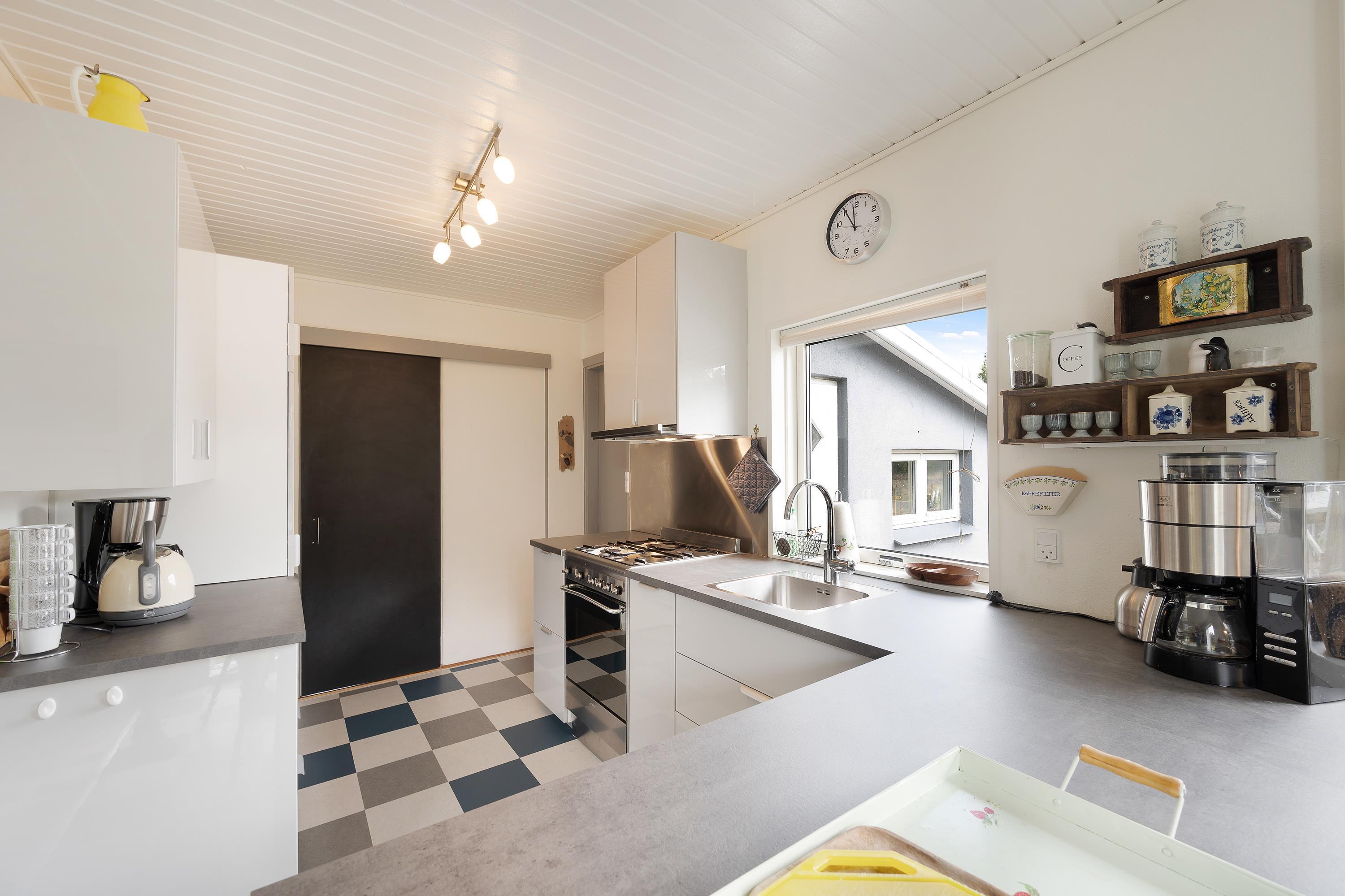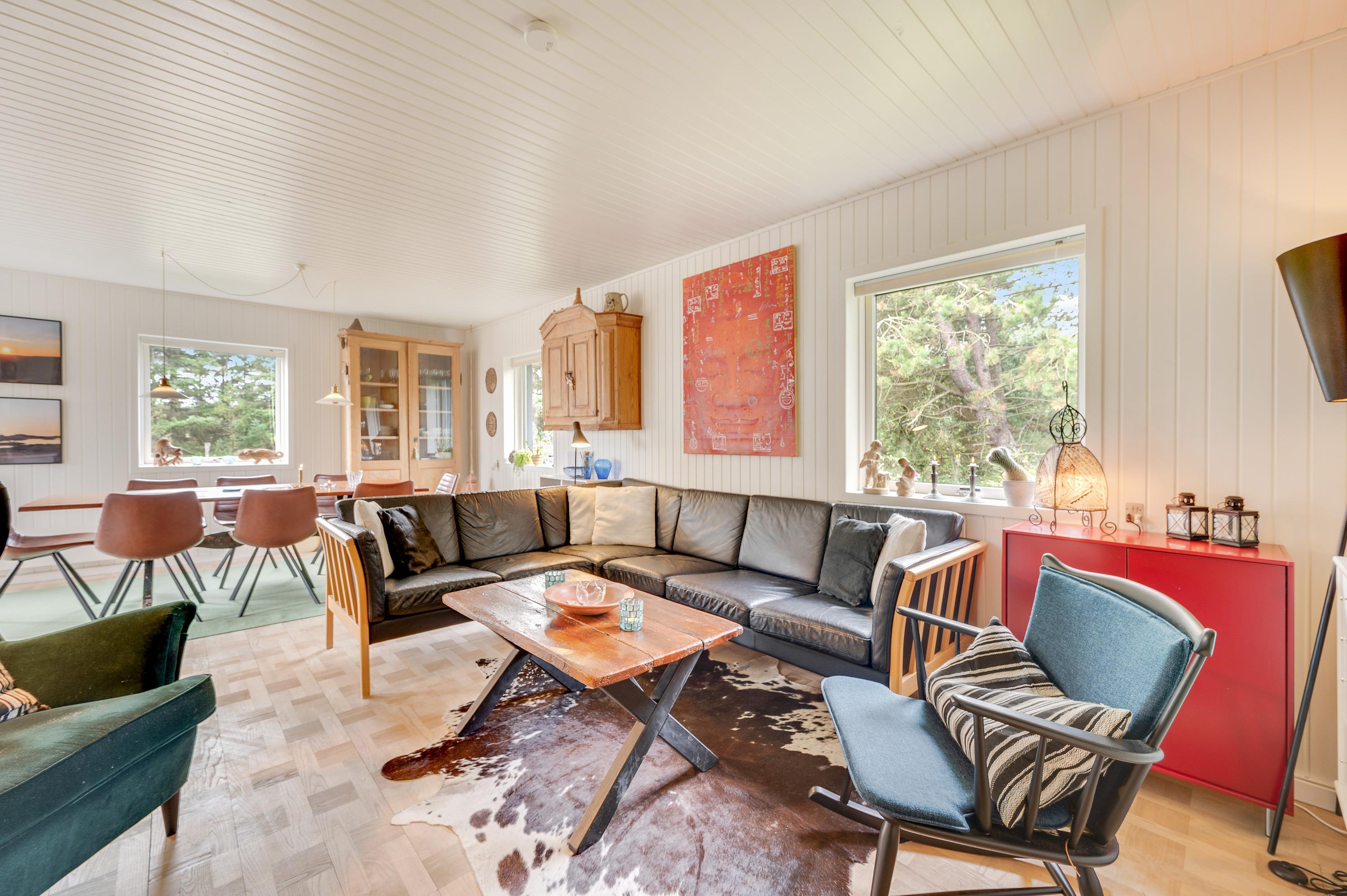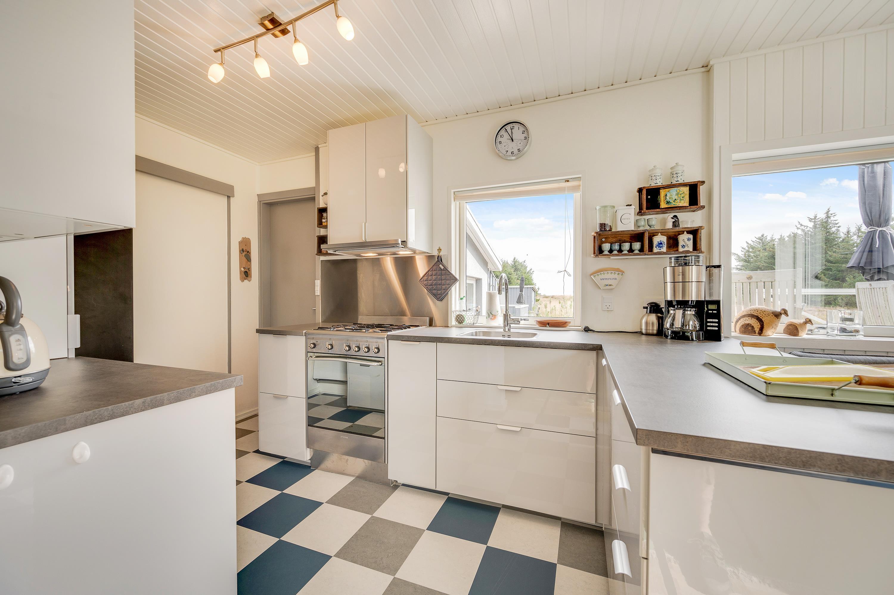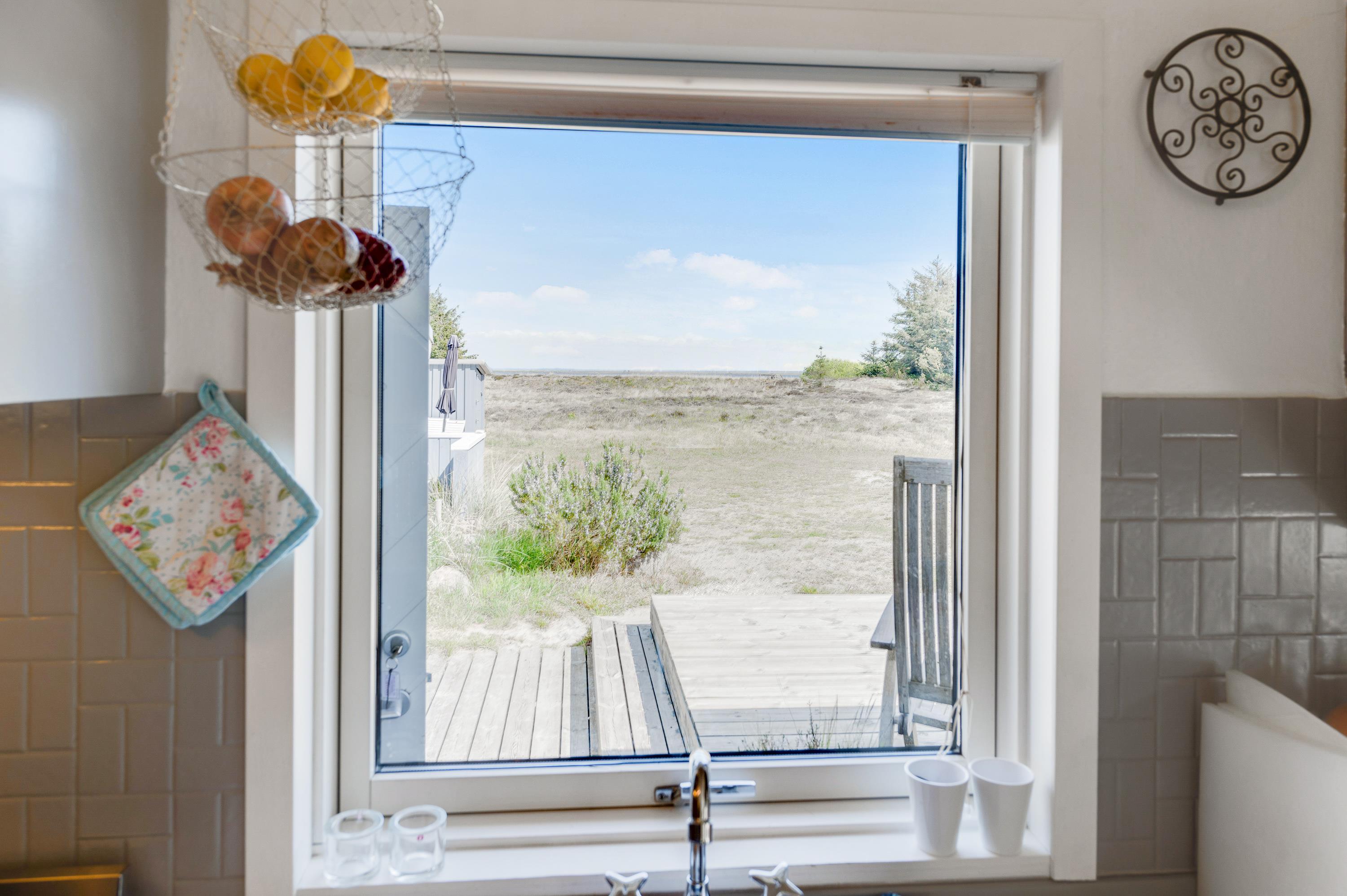 I sommerhusets køkken er der udsigt til fjorden i åben forbindelse med hyggelig og personligt indrettet stue. Tænd op i brændeovnen på en kølig dag, og nyd stilheden og den smukke udsigt.