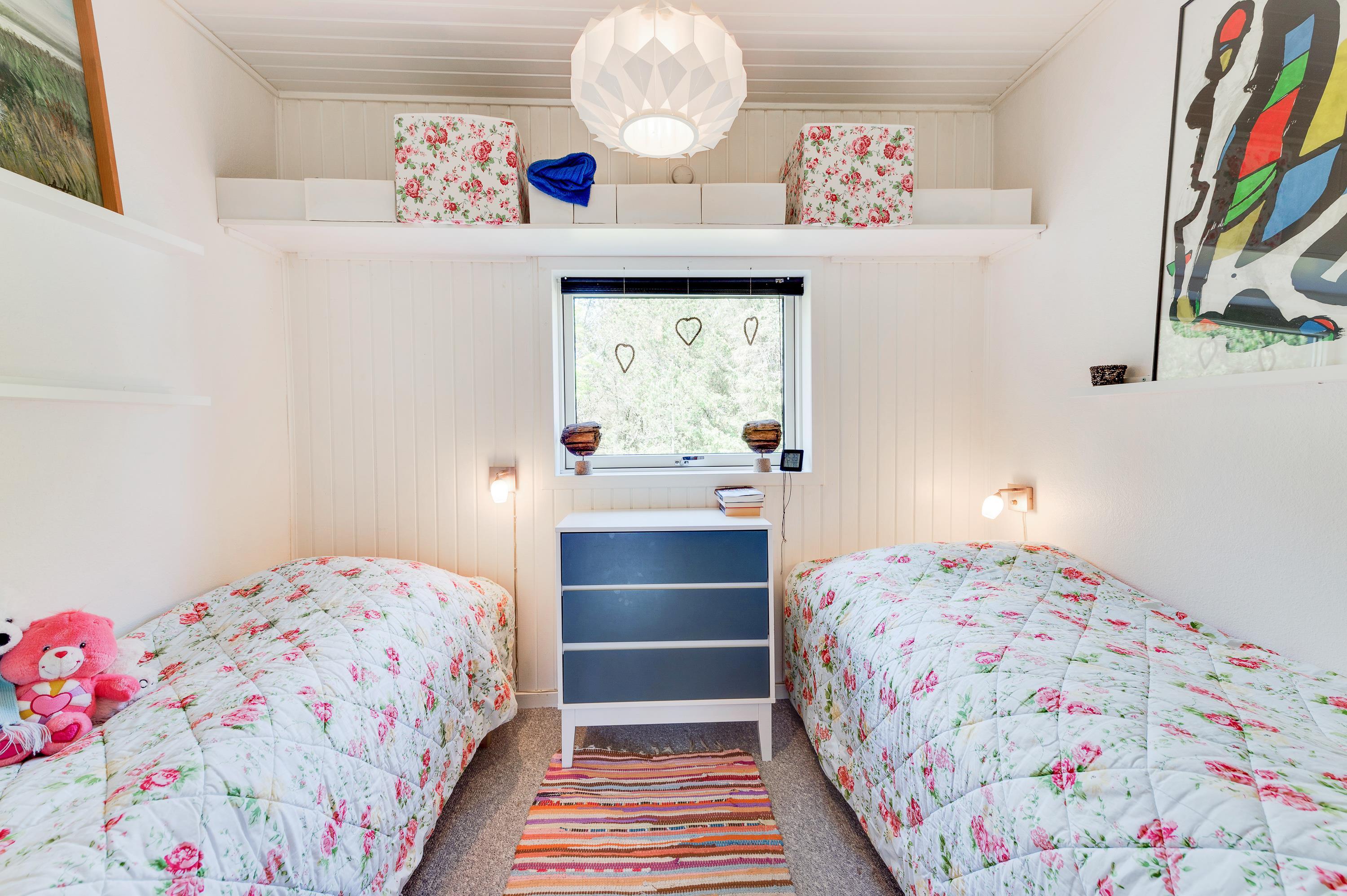 Sommerhuset består af 2 bygninger, – hovedhuset og annekset. Det store anneks er indrettet med stort soveværelse med dobbeltseng og med udsigt til fjorden, et fint badeværelse med brus, og et ekstra rum til f.eks. opbevaring eller alene tid. I hovedhuset er der endnu et soveværelse, indrettet med 2 enkeltsenge senge.