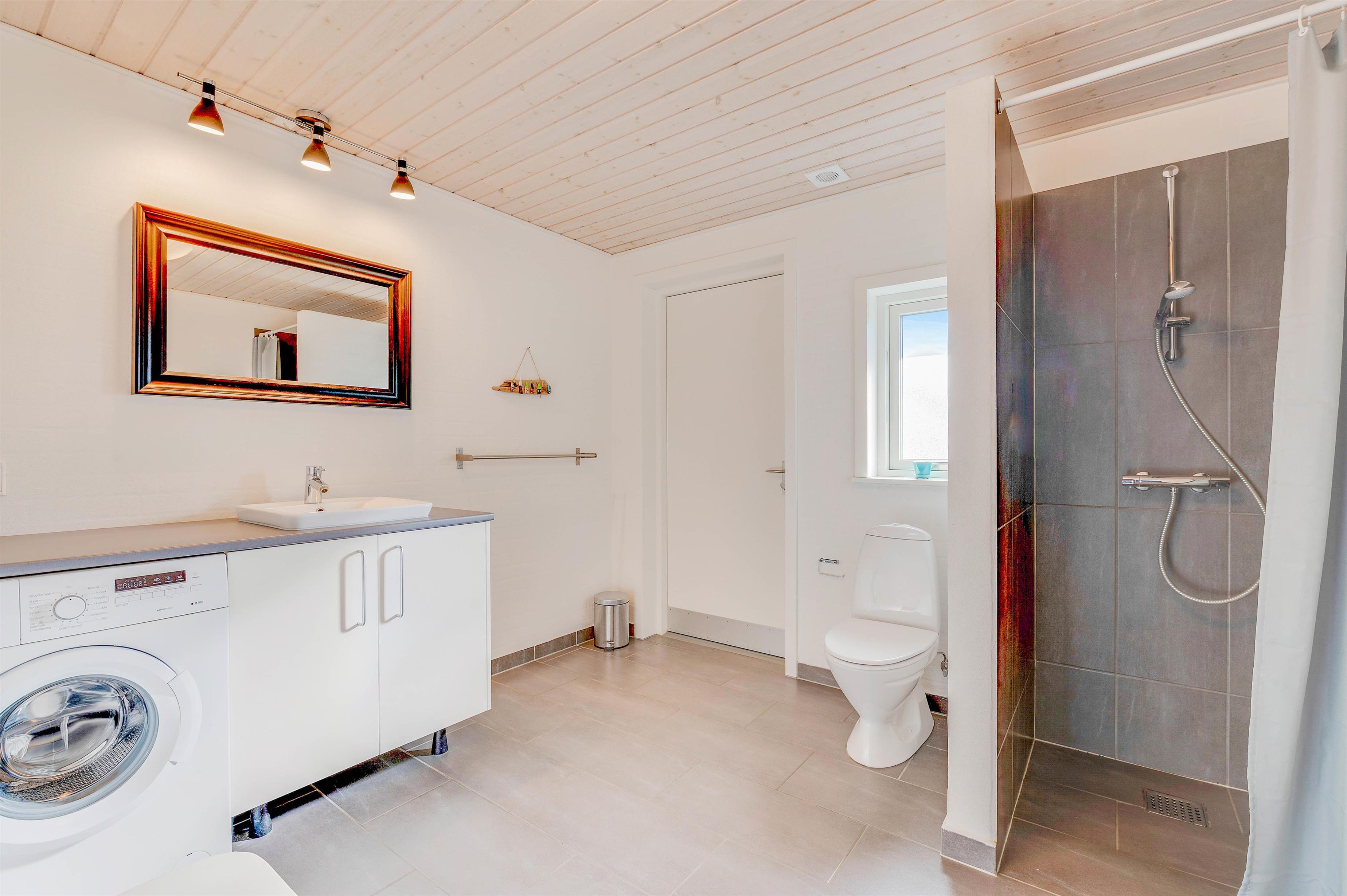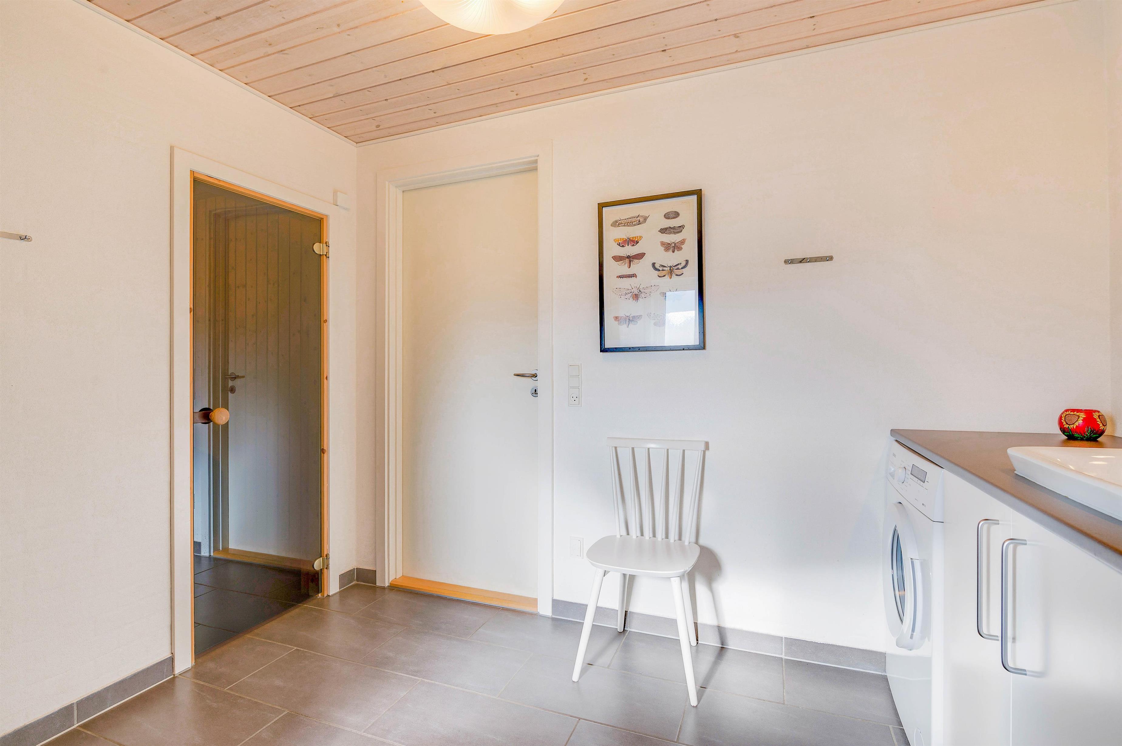 Fra terrassen er der desuden adgang til et praktisk redskabsrum, hvor feriehusets 100 liters fryser står parat til medbragte madvarer eller lystfiskerens fangst.