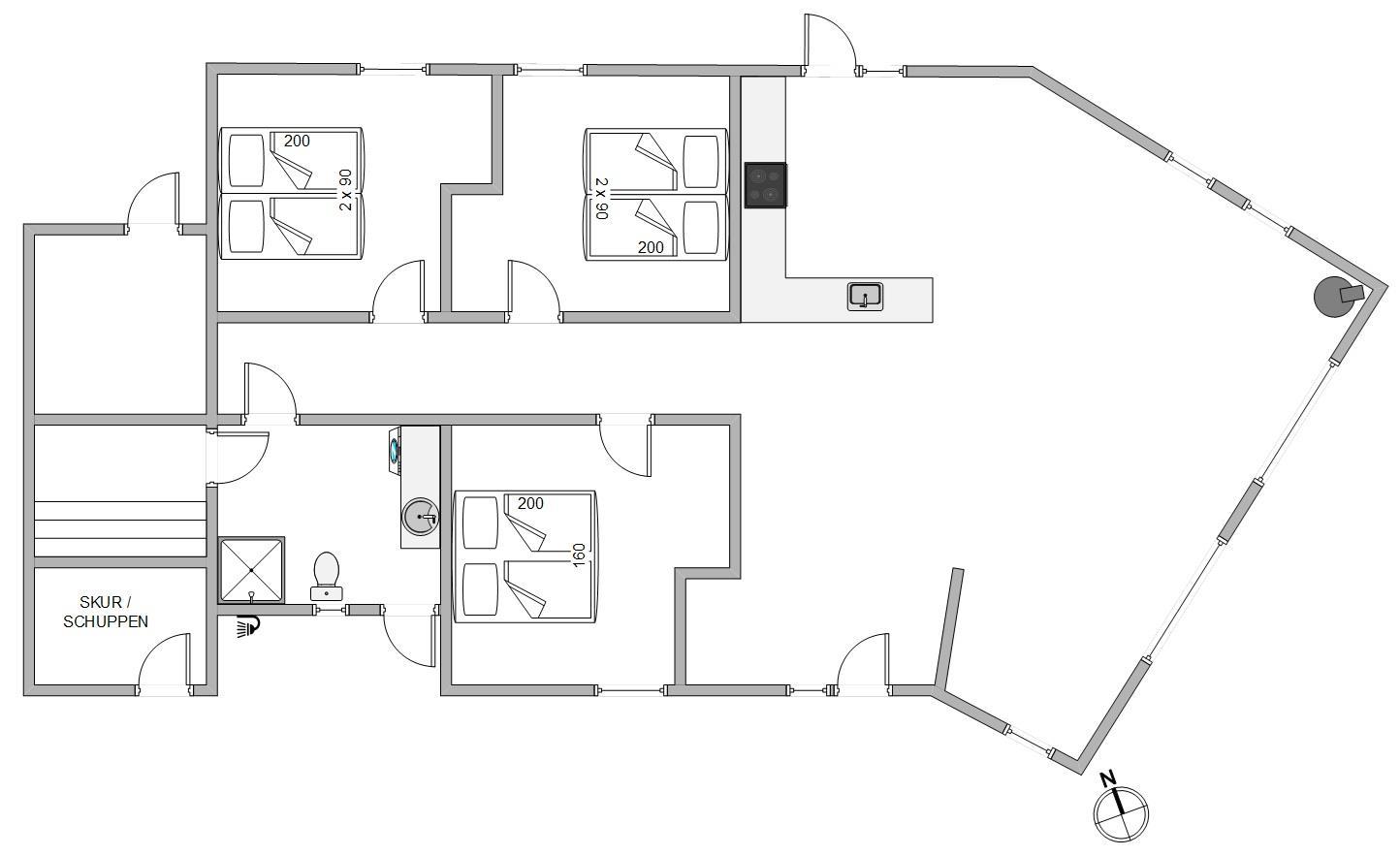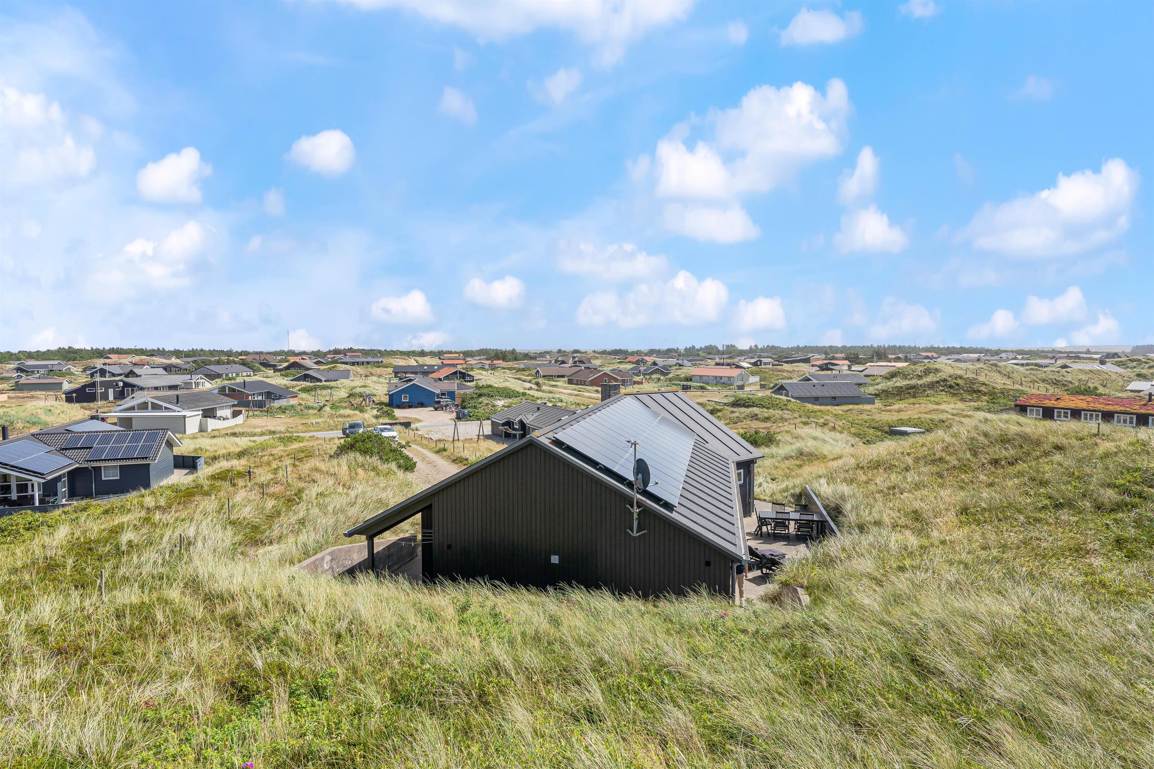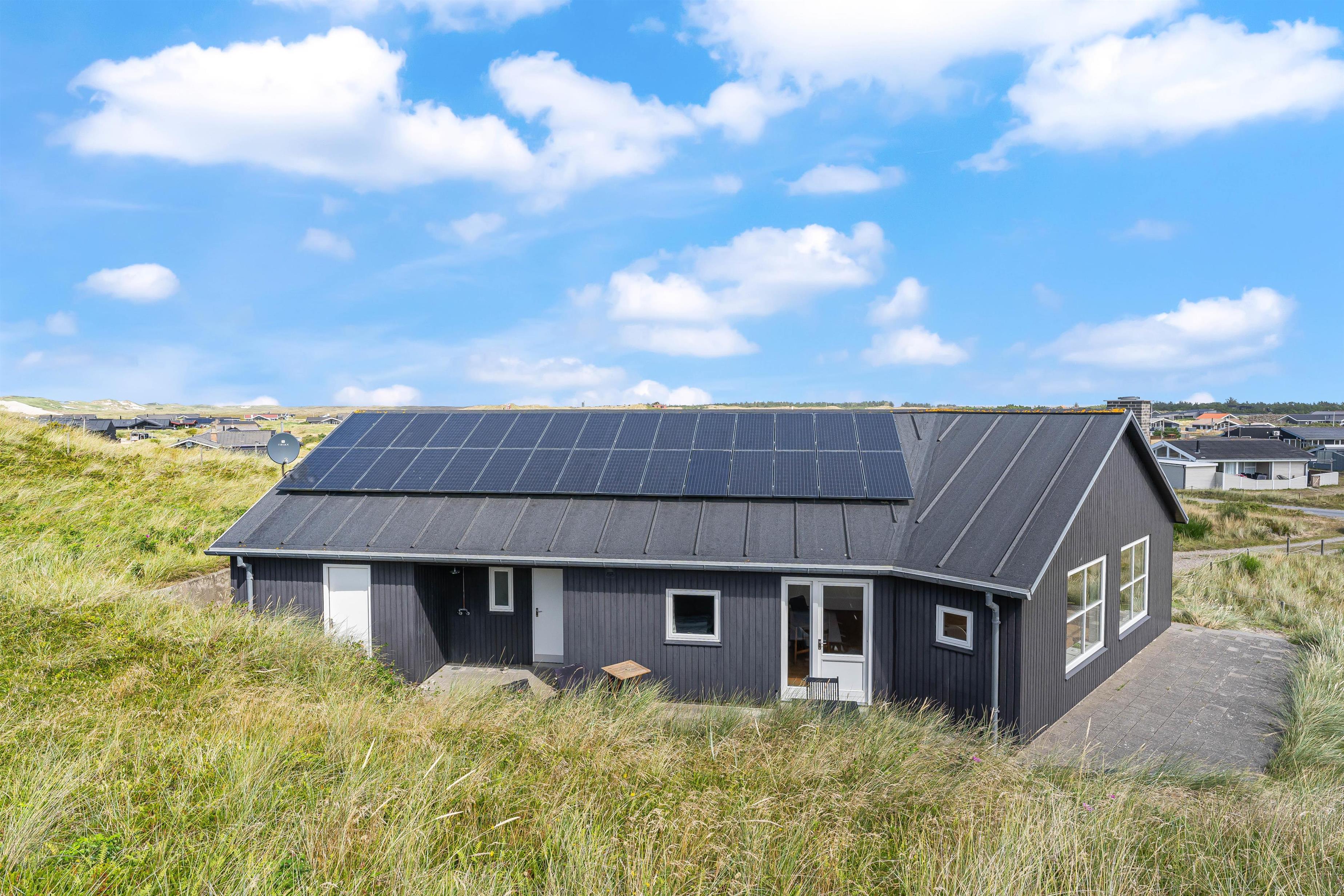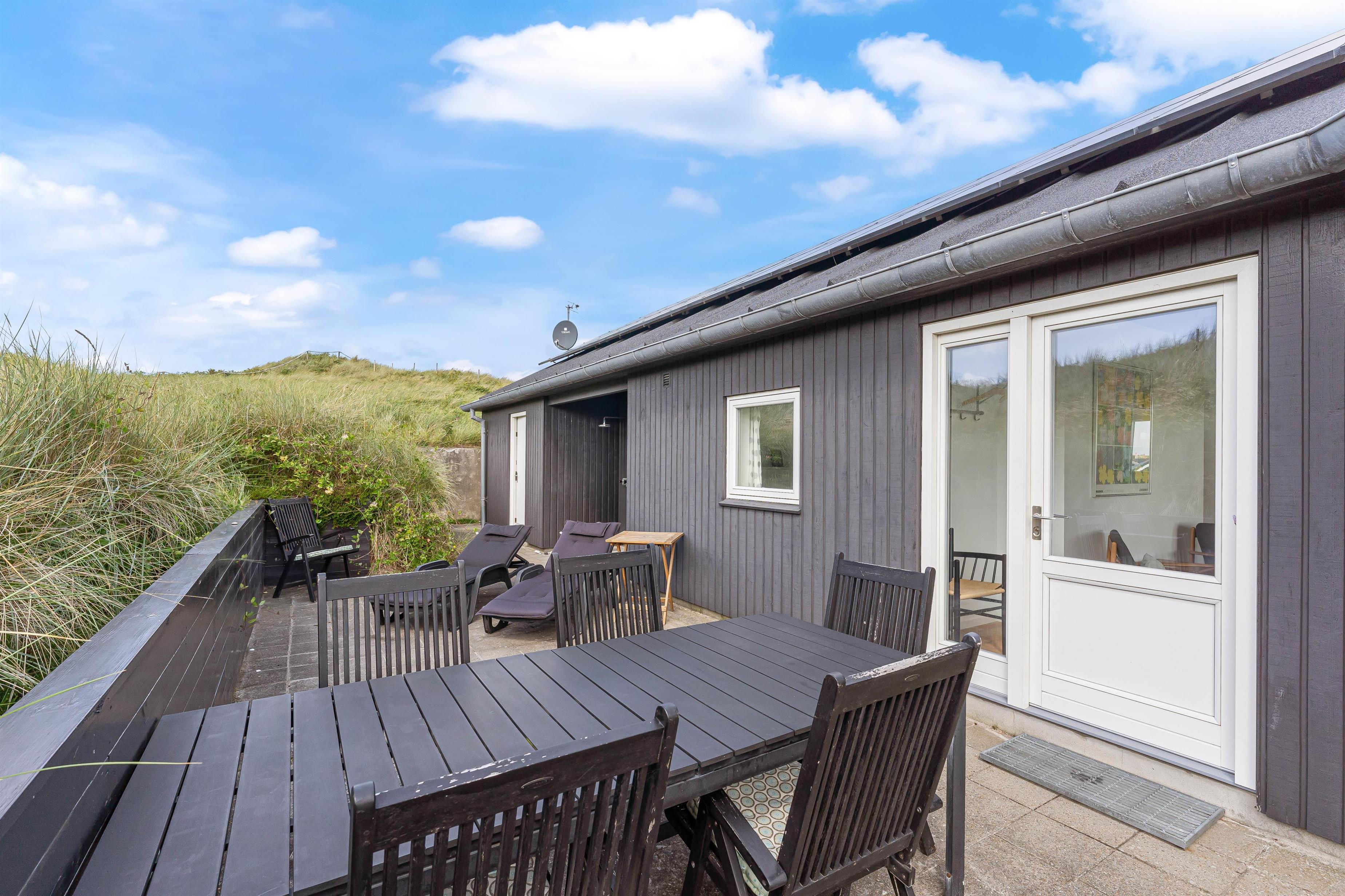 Det flotte sommerhus er omgivet af terrasse på alle sider, også en del der er overdækket. Her er det altid muligt at finde en læfyldt plet, selv på en blæsende dag. Når du kommer hjem fra stranden, kan du blive skyllet af under sommerhusets udebruser (fra april til november) på terrassen, eller som en af vores gæster skrev i et spørgeskema: “Det er fantastisk at bruse udenfor om aftenen i stjernernes skær”.