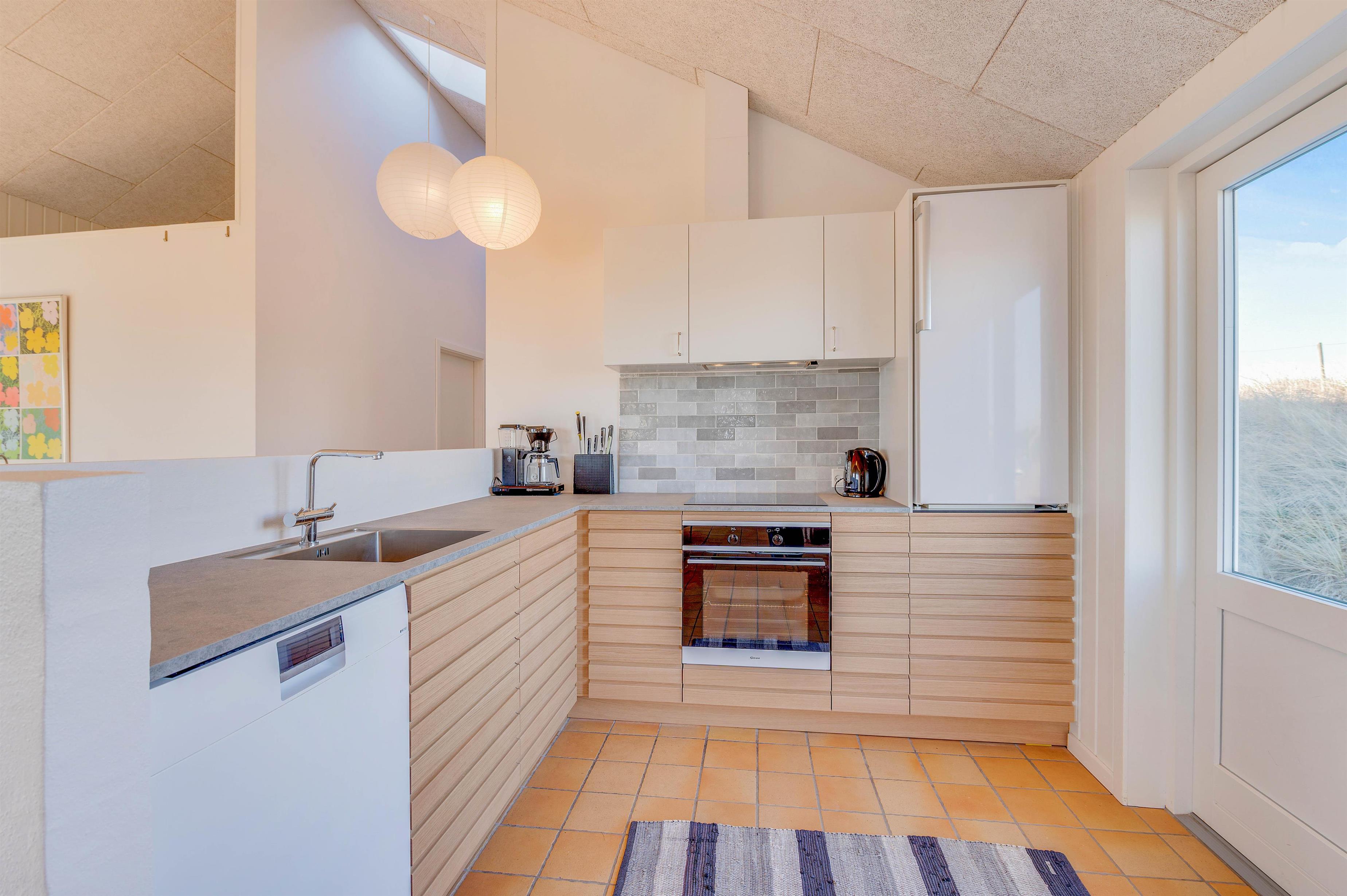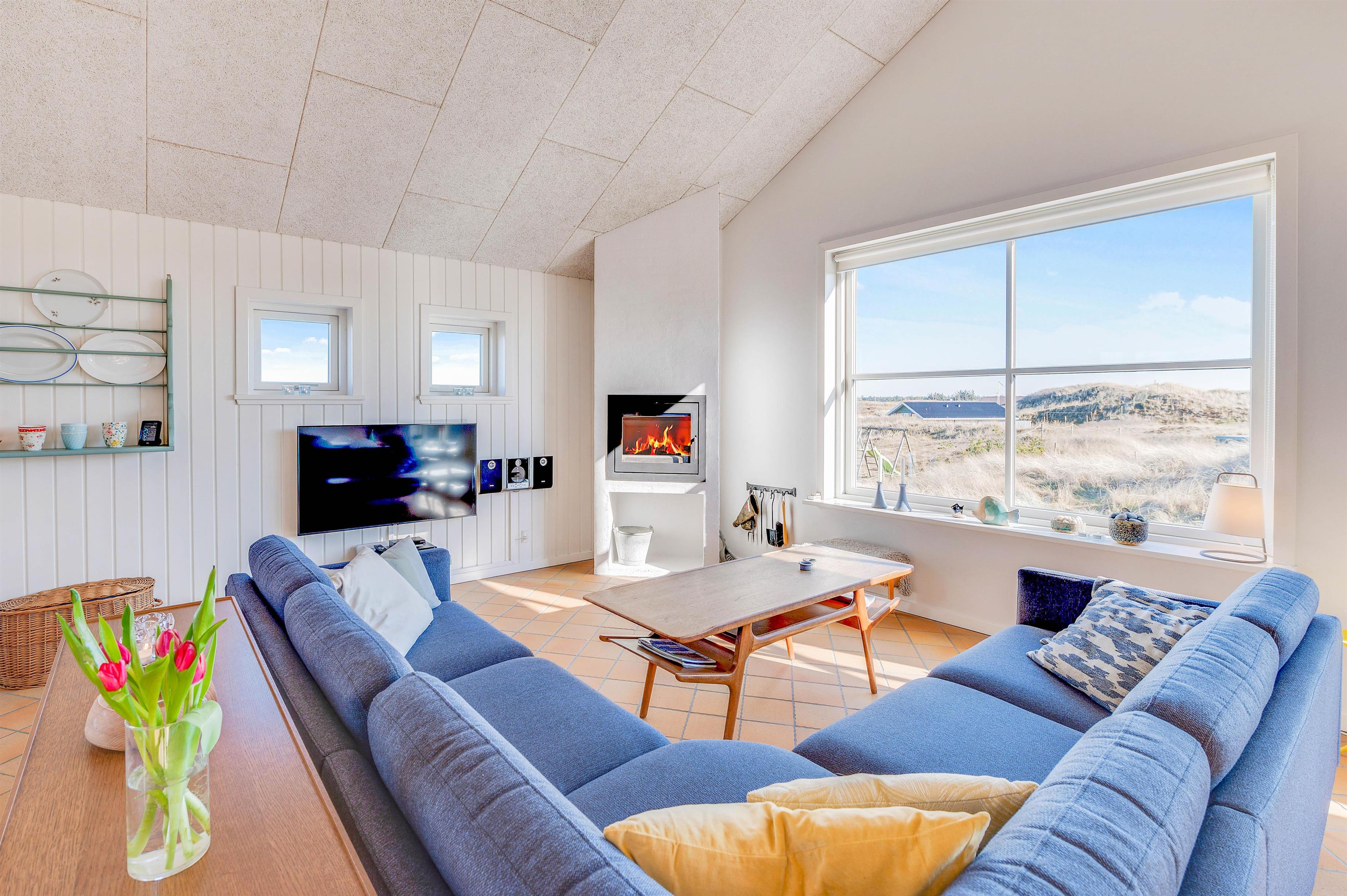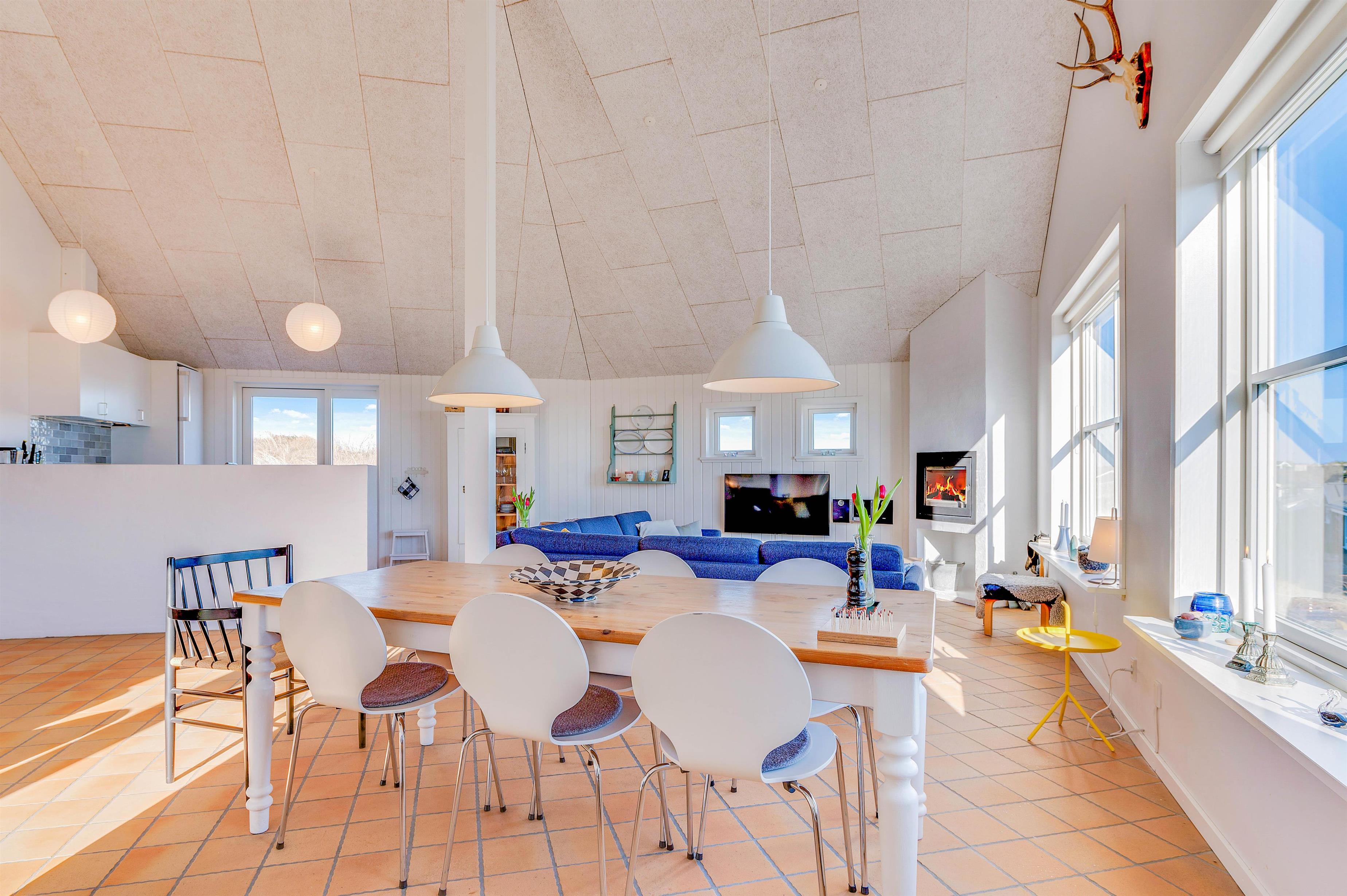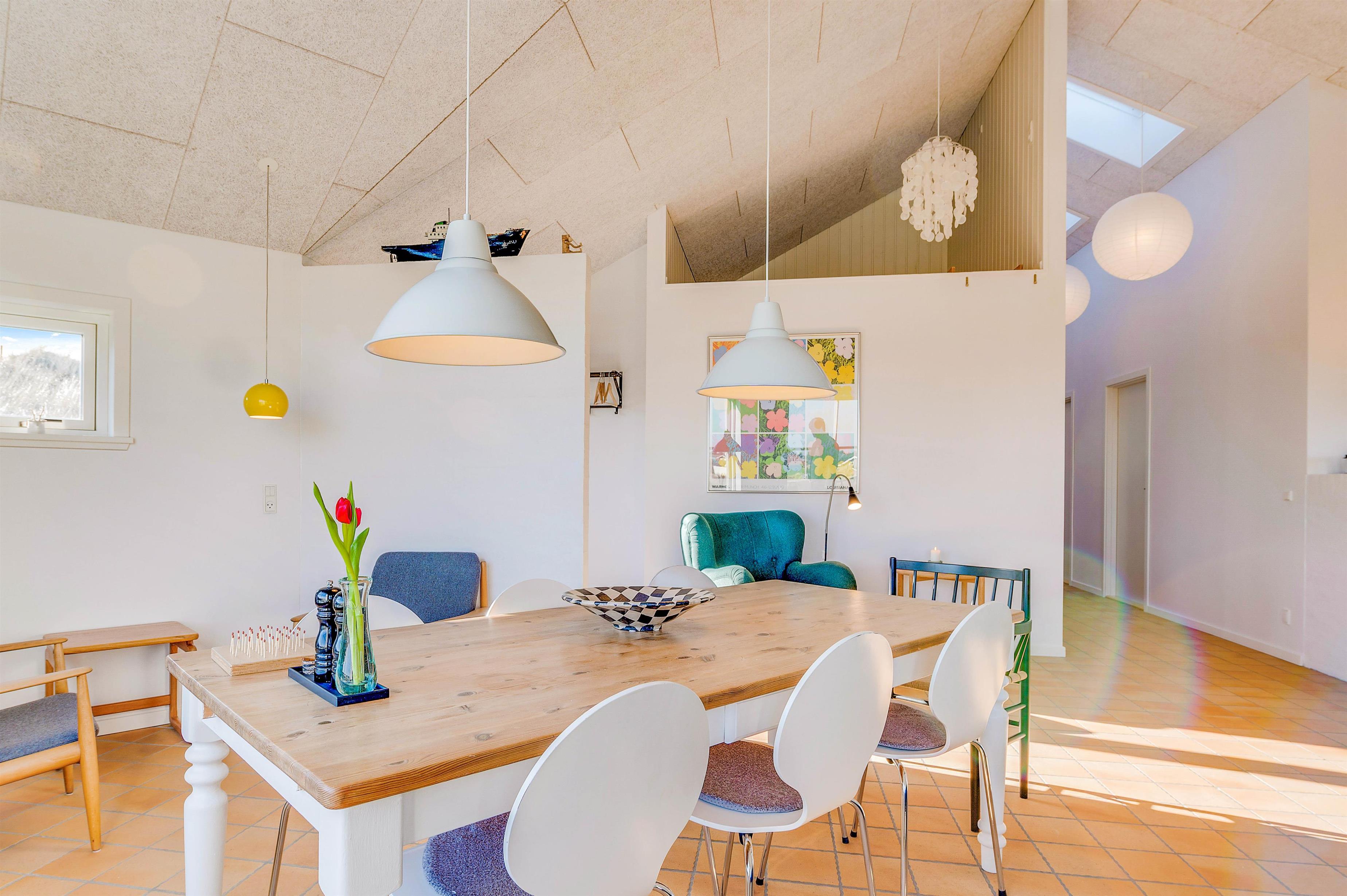 Dette flotte sommerhus er indrettet med sikker hånd i ejerens egen personlige stil, hvor nye møbler og gamle danske klassikere er mikset, så somerhuset fremstår hyggeligt og moderne på en gang. Sommerhusets hjerte er det store opholdsrum, som består af stue og spisestue i åben forbindelse med køkkenet. Det er stedet, hvor man hygger med en bog i sofaen og ild i brændeovnen, indtager en lækker middag, eller spiller et spil, mens vinden rusker udenfor.