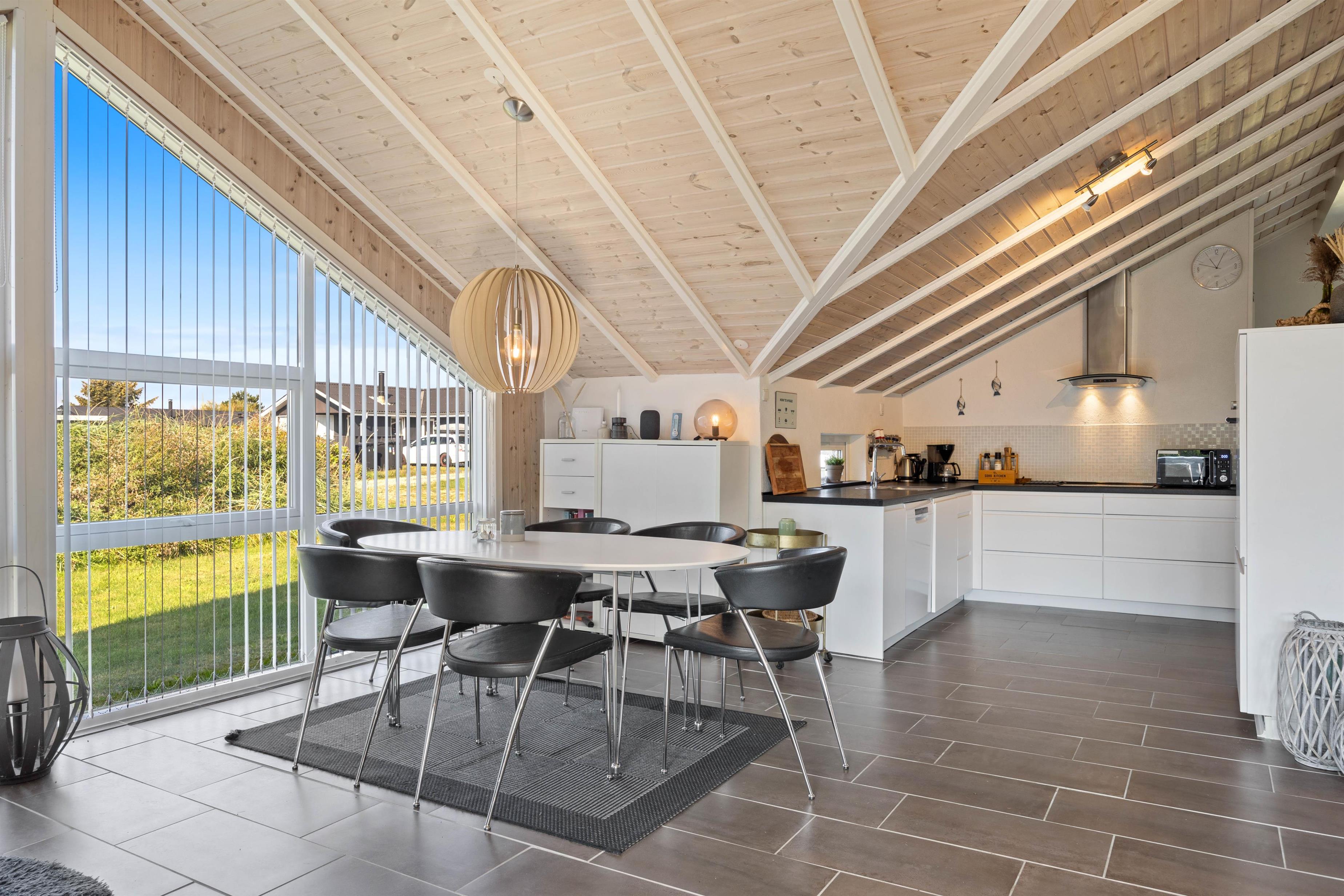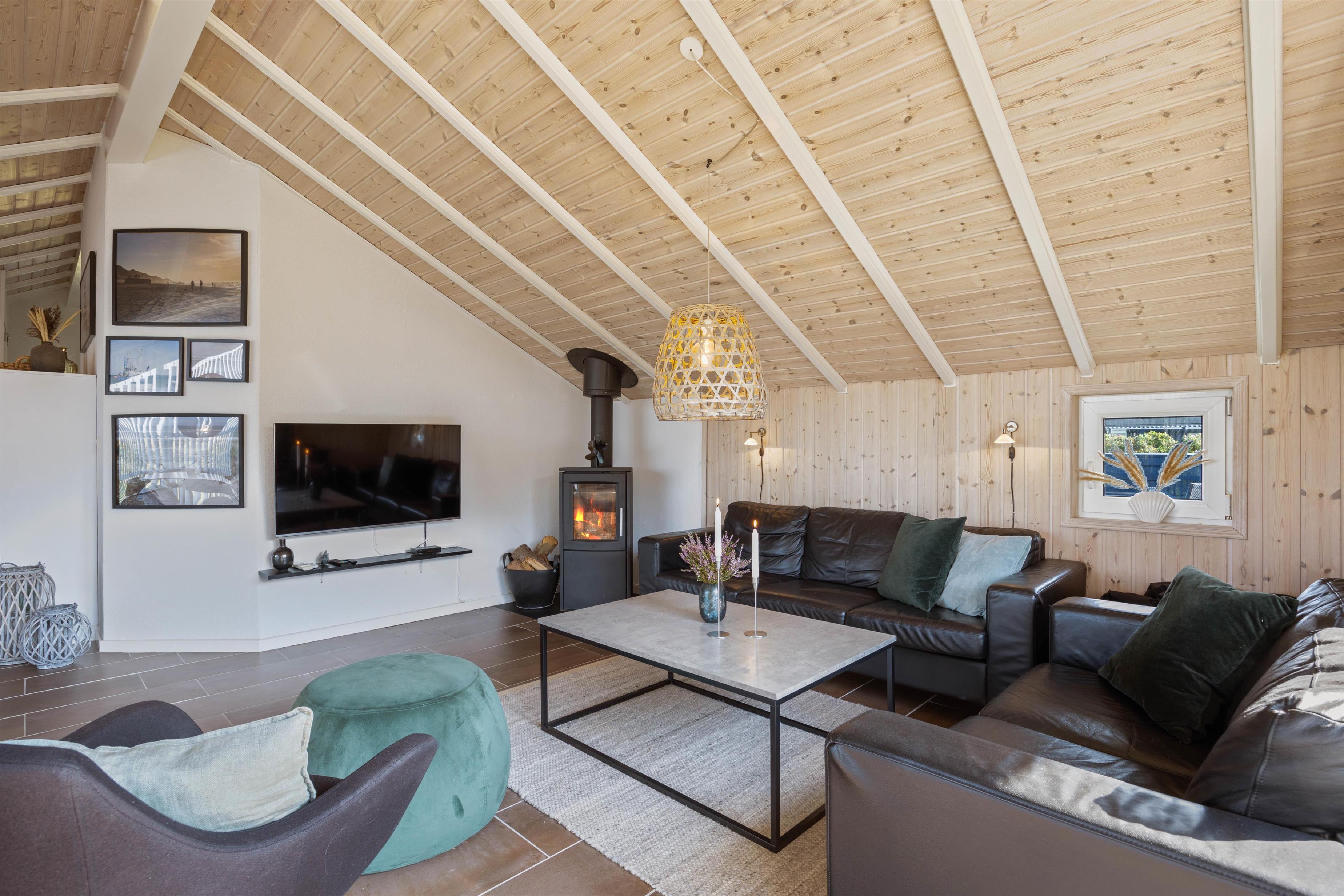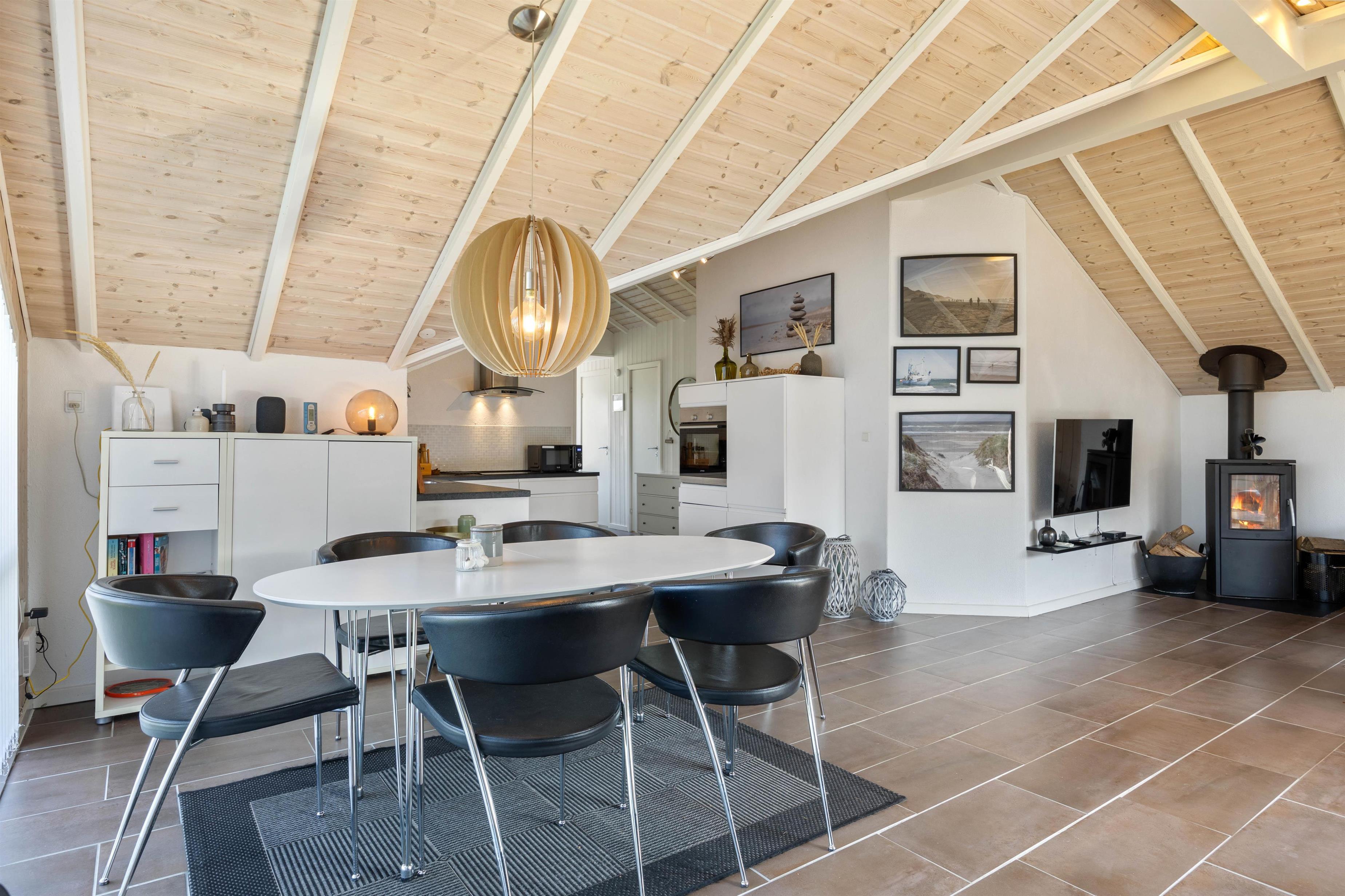 I dette feriehus til 5 personer og 2 hunde kan I nyde en afslappende ferie. Køkken og stue er et stort og dejligt rum, hvor alle er sammen, også under madlavningen. Brændeovnen skaber både varme og hygge, mens I spiser eller spiller kort med børnene. Som et ektra plus er der en energibesparende varmepumpe. De store vinduespartier giver et skønt lys i stuen og virker godt sammen med loftet til kip. Der er naturligvis gratis internet i huset, og der er desuden Chromecast, så I kan holde en hyggelig filmaften.
