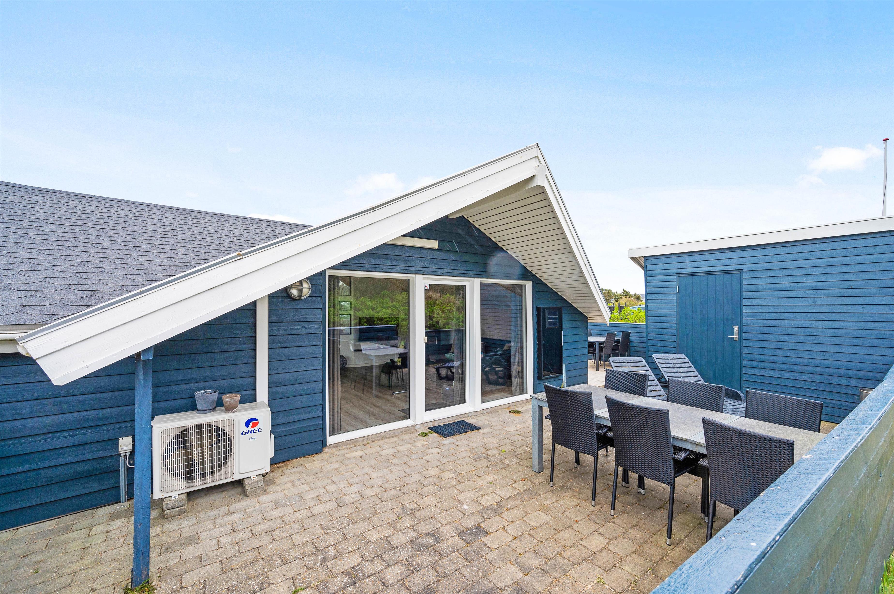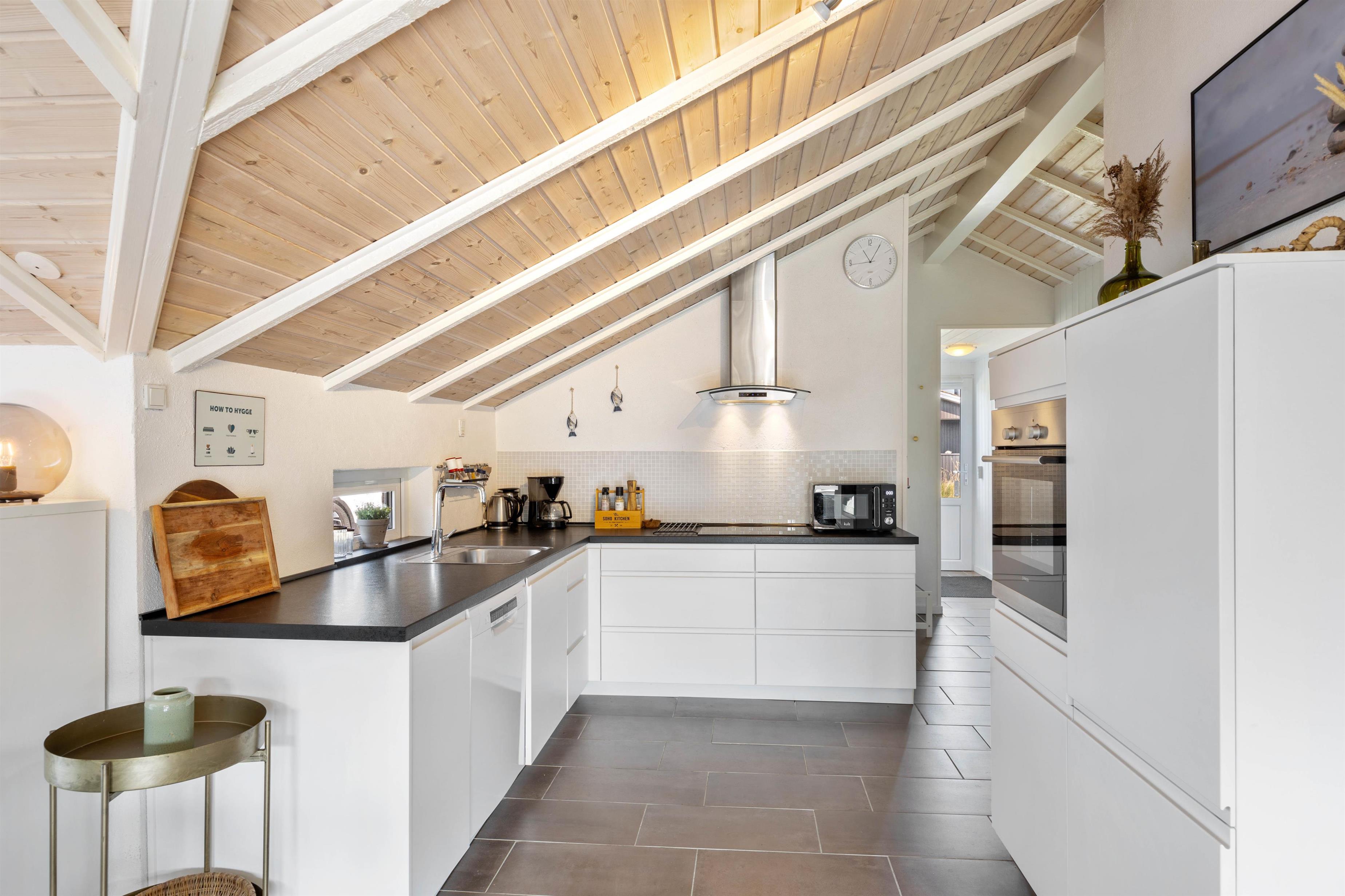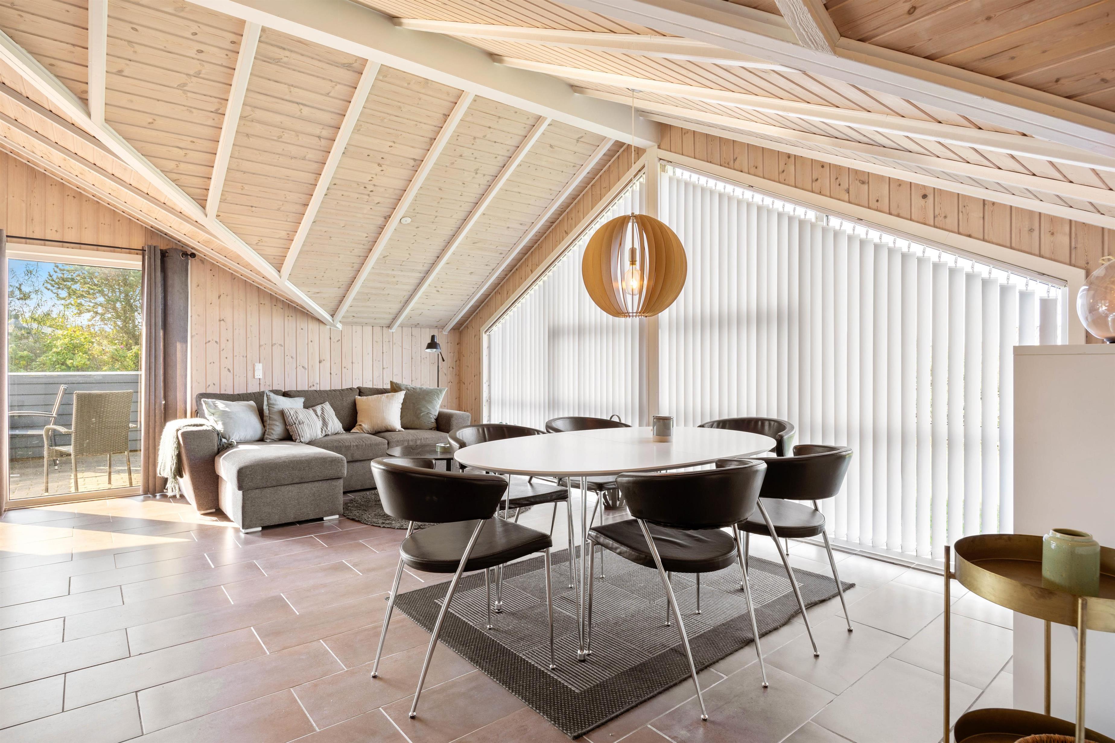 I dette feriehus til 5 personer og 2 hunde kan I nyde en afslappende ferie. Køkken og stue er et stort og dejligt rum, hvor alle er sammen, også under madlavningen. Brændeovnen skaber både varme og hygge, mens I spiser eller spiller kort med børnene. Som et ektra plus er der en energibesparende varmepumpe. De store vinduespartier giver et skønt lys i stuen og virker godt sammen med loftet til kip. Der er naturligvis gratis internet i huset, og der er desuden Chromecast, så I kan holde en hyggelig filmaften.