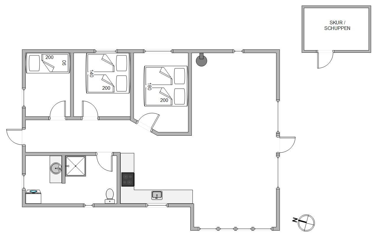 De 5 sovepladser fordeler sig på 3 fine værelser, hvor I kan få en god nats søvn. Det ene værelse er indrettet med en dobbeltseng på 180 cm, det andet med en seng på 140 cm og det sidste værelse med en enkeltseng.