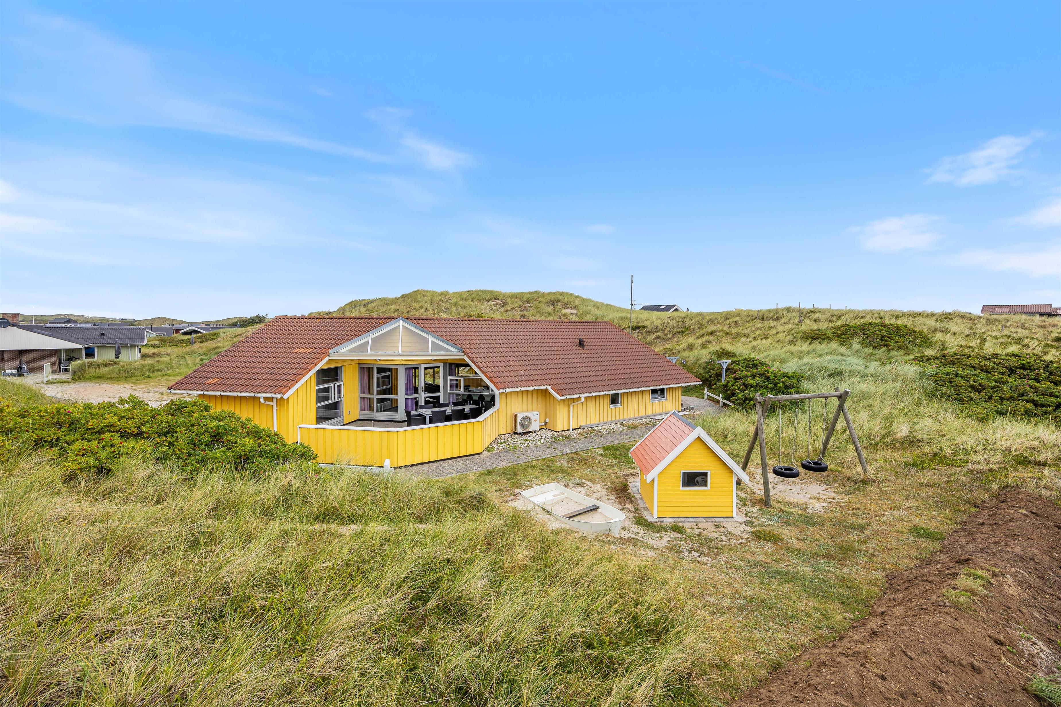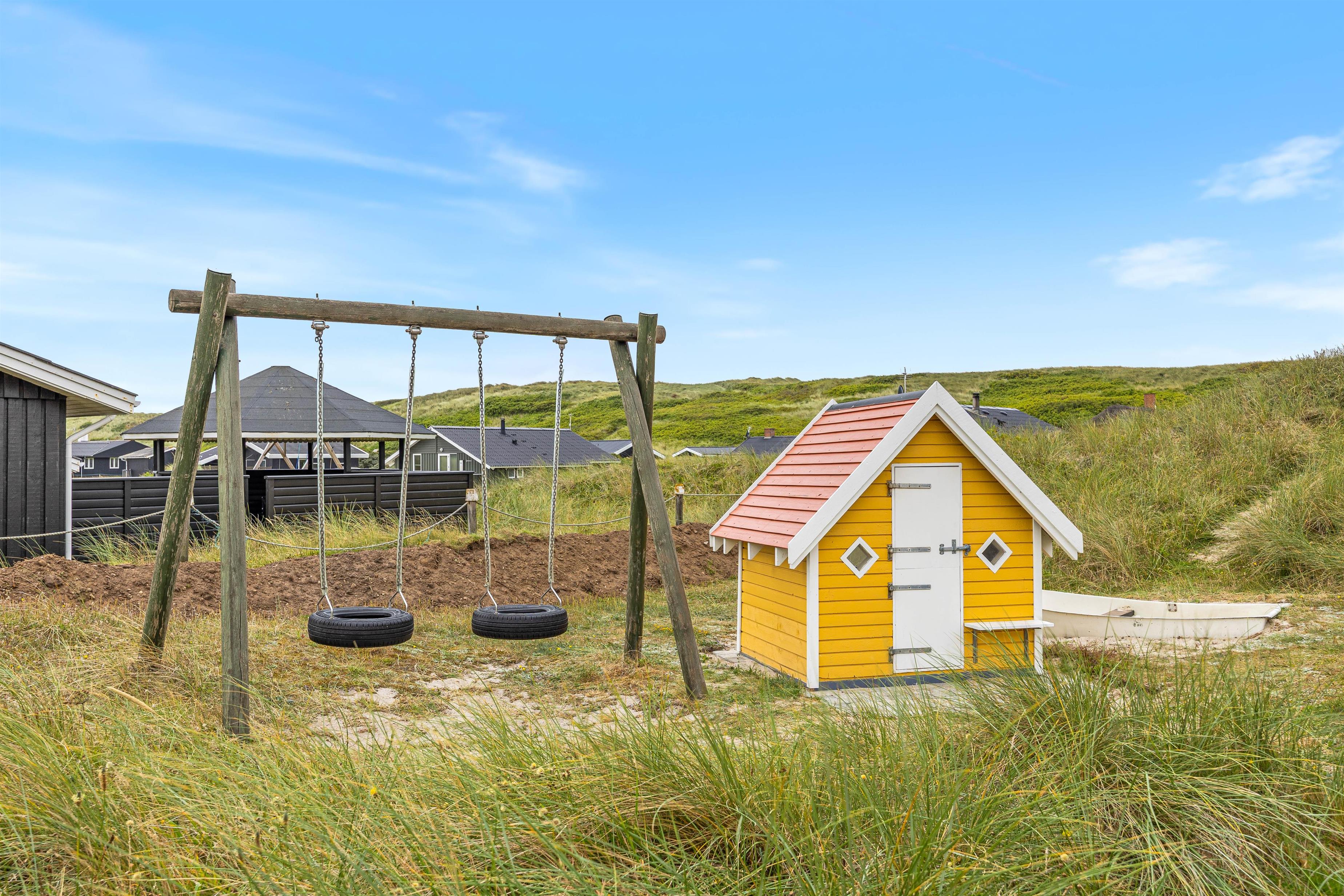 Sommerhuset ligger på en kombineret natur- og klitgrund, hvor I kan nyde den særlige ro, som kun findes tæt på havet. På den overdækkede terrasse kan I samles til fælles måltider i den friske luft, grille på lune sommeraftener eller blot sidde med en bog og lytte til havets brusen. Til børnene er der gynge og sandkasse, så de kan lege frit, mens I nyder omgivelserne og udsigten til klitterne.