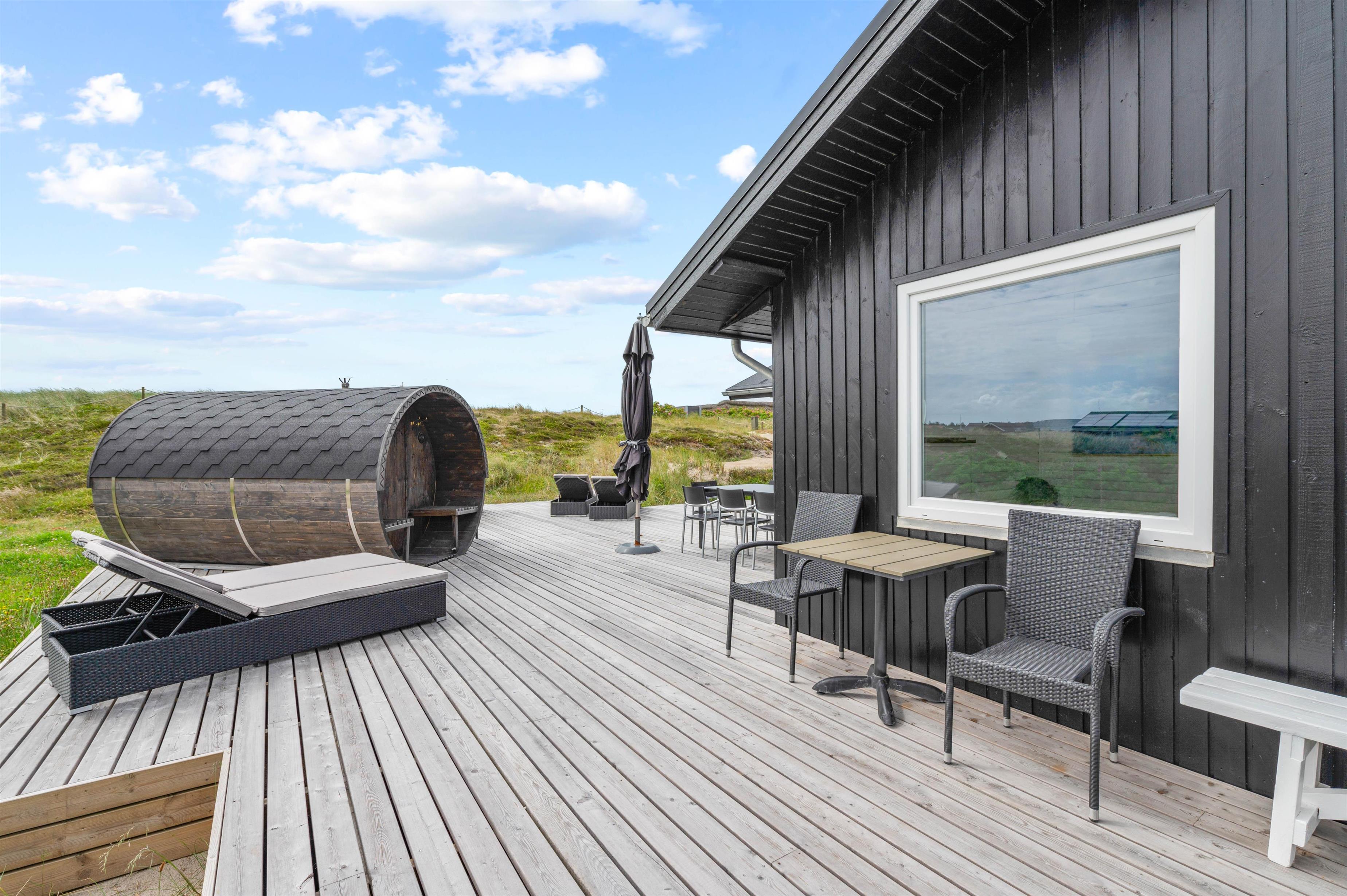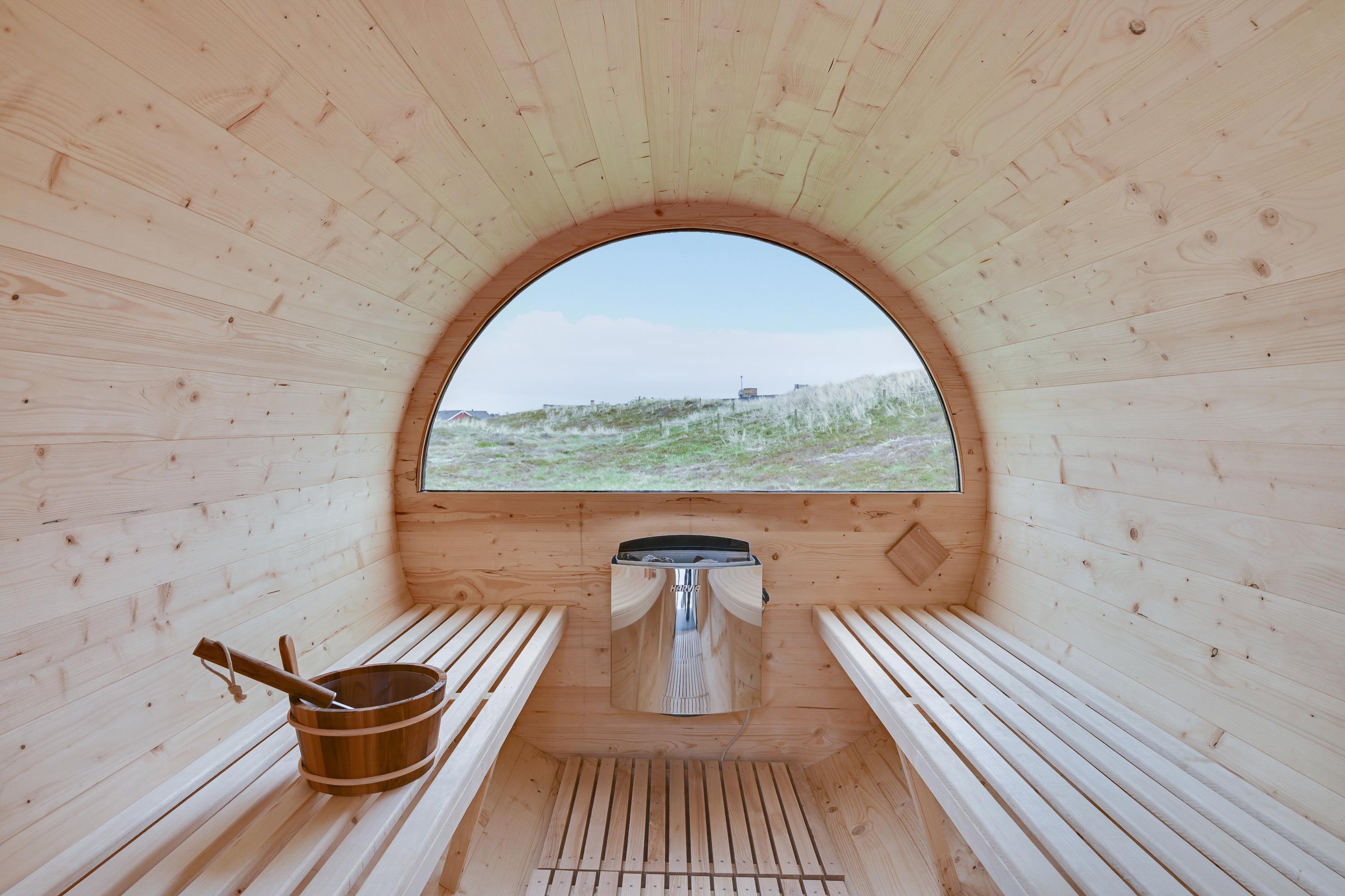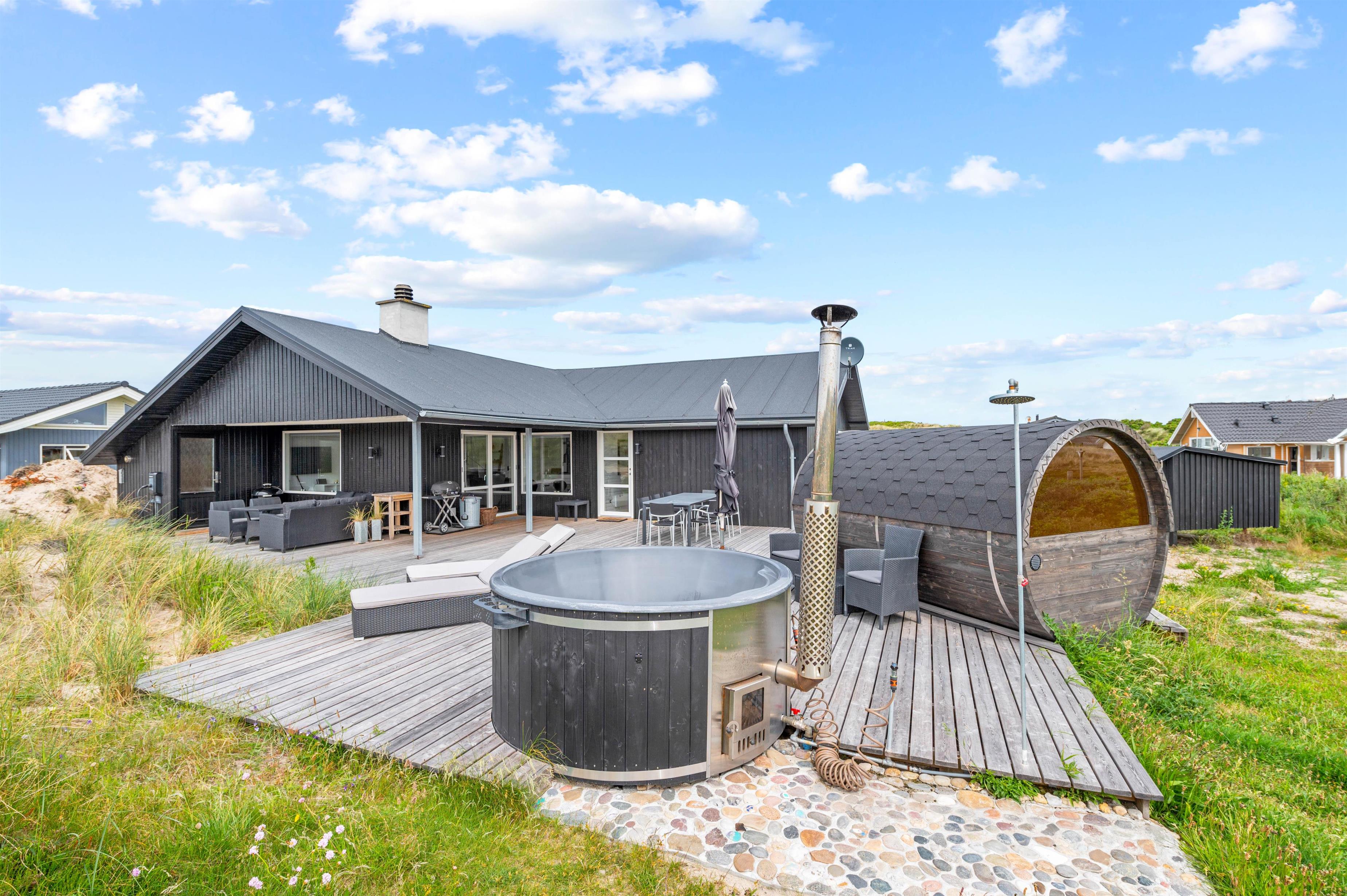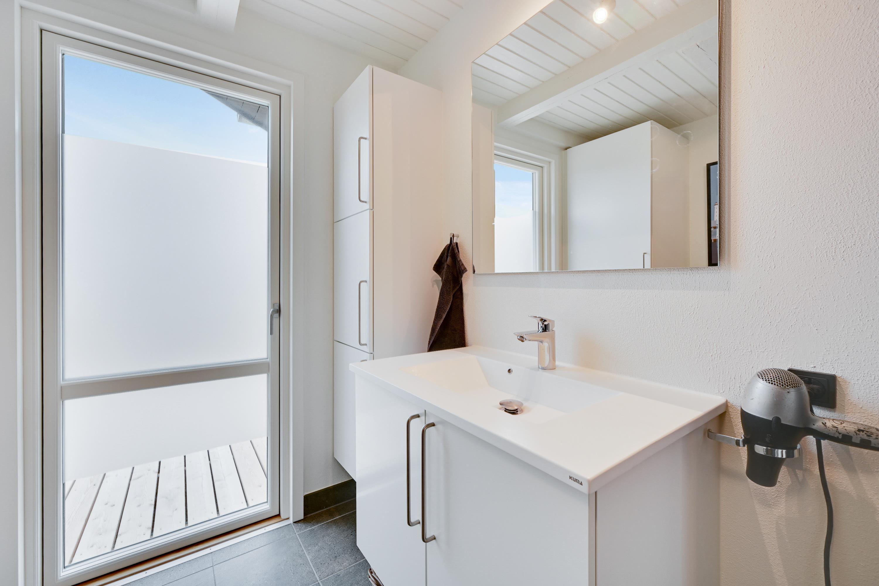 Badeværelset er med gulvvarme og har en vaskemaskine og tørretumbler samt en bruseniche. Fra badeværelset har I udgang til udearealet, som byder på både sauna og vildmarksbad. Det er en perfekt afslutning på en god dag i naturen, hvor I rigtig kan slappe af. Har I været en tur på stranden, kan I også skylle jer under den udendørs bruser (kan benyttes fra april til november).