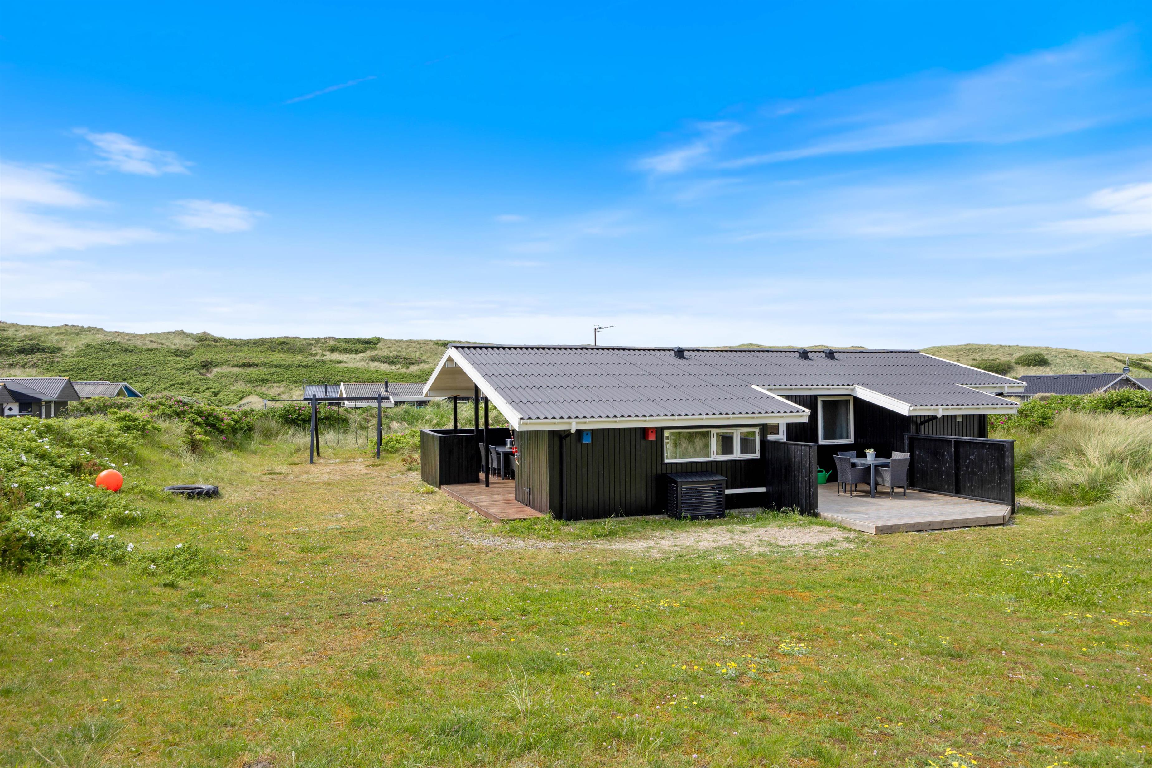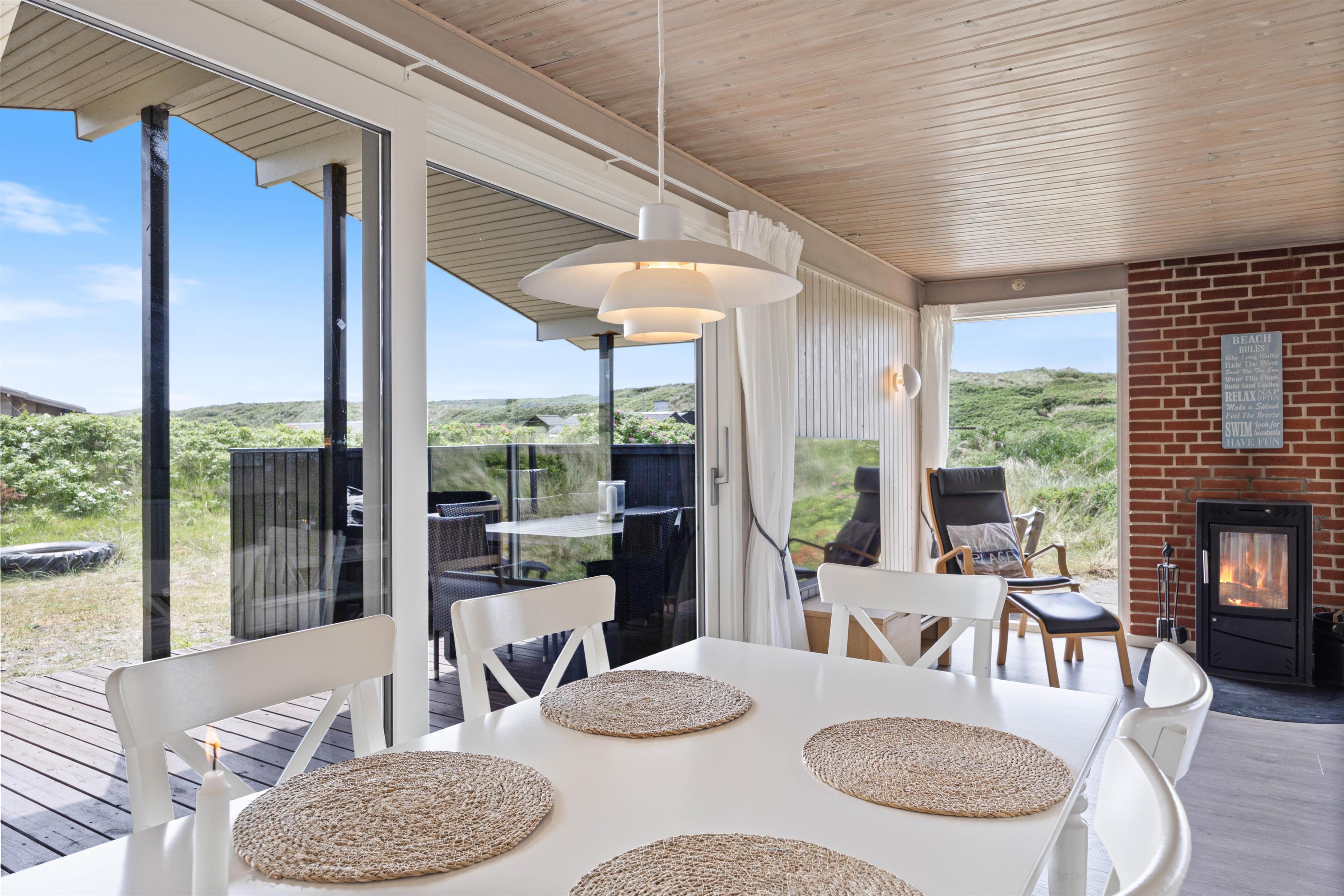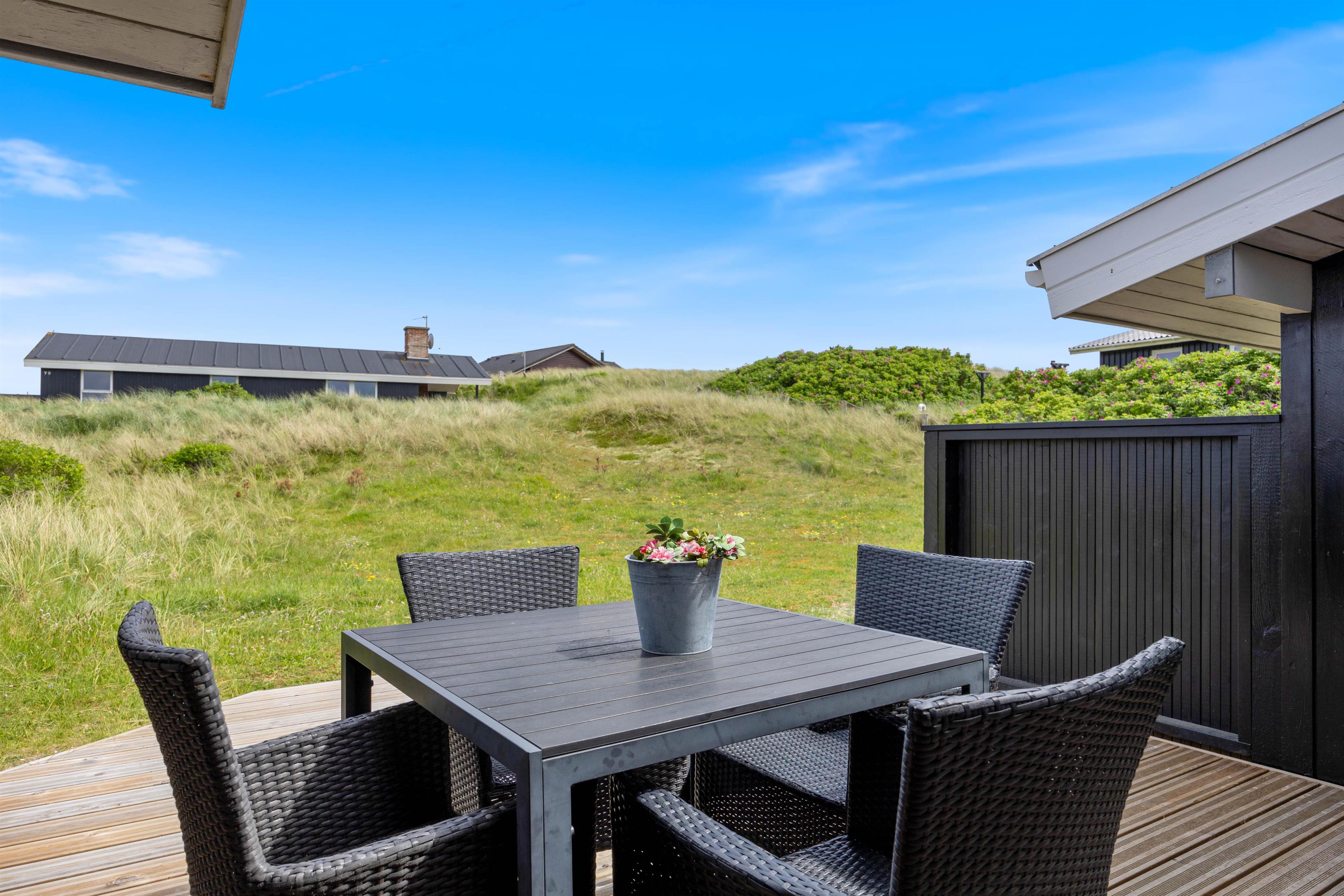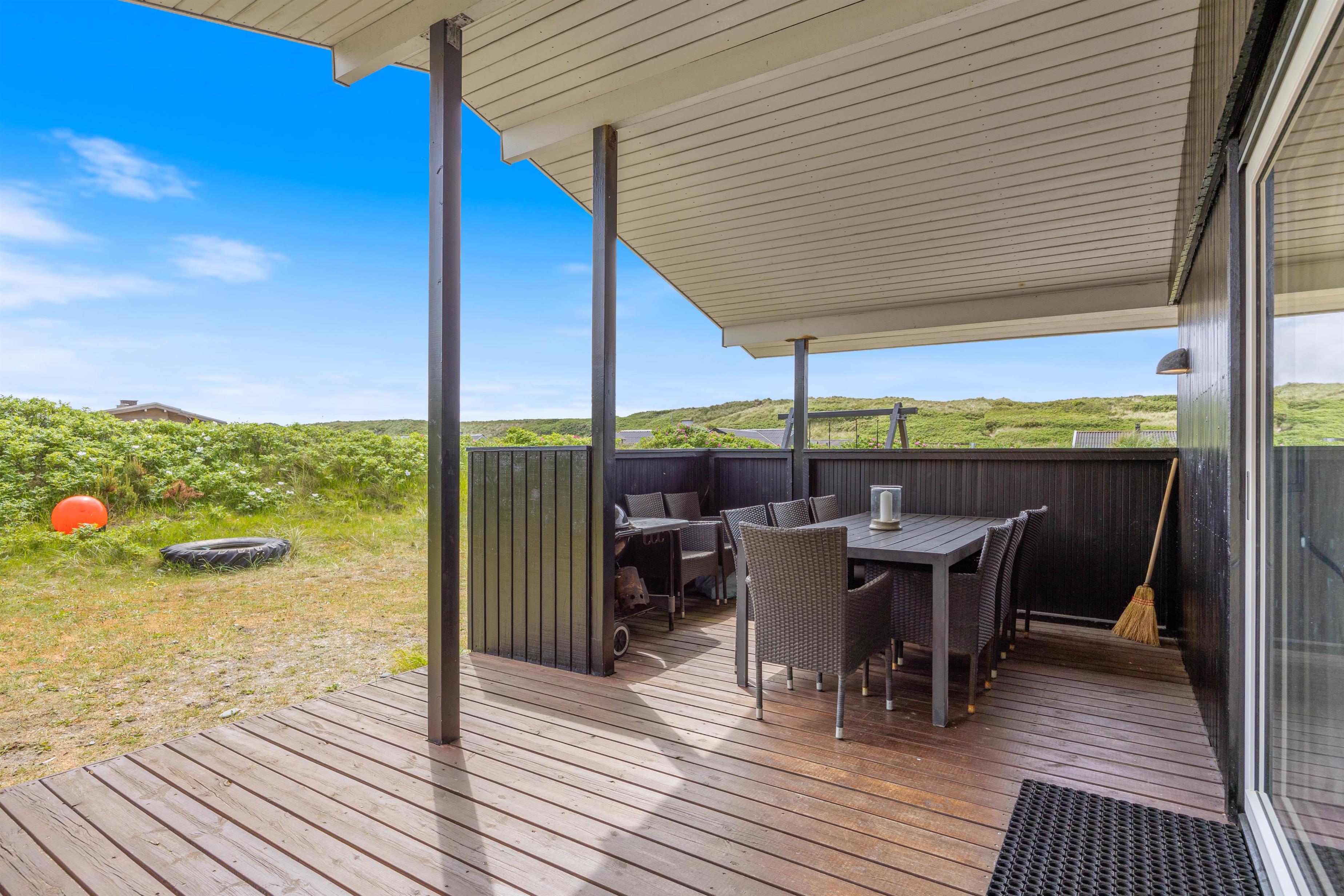 Middagen kan naturligvis tilberedes på feriehusets grill og nydes på terrassen, imens solen går ned bag klitterne og farver himlen purpurrød - og med havet salte duft og dets brusen i baggrunden.