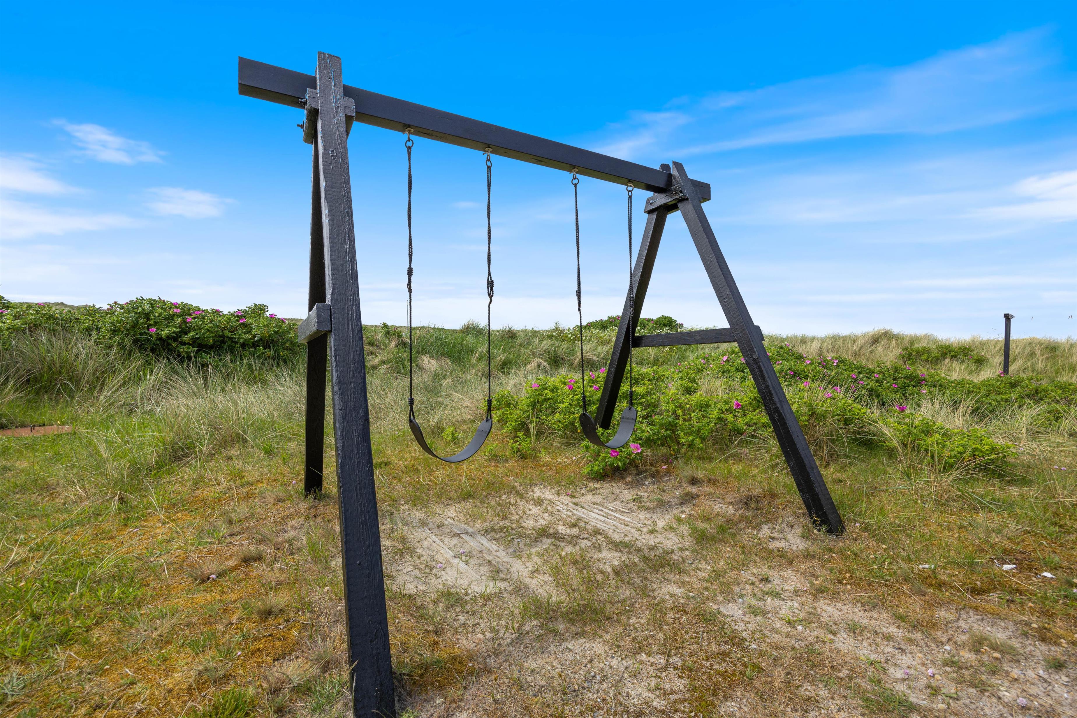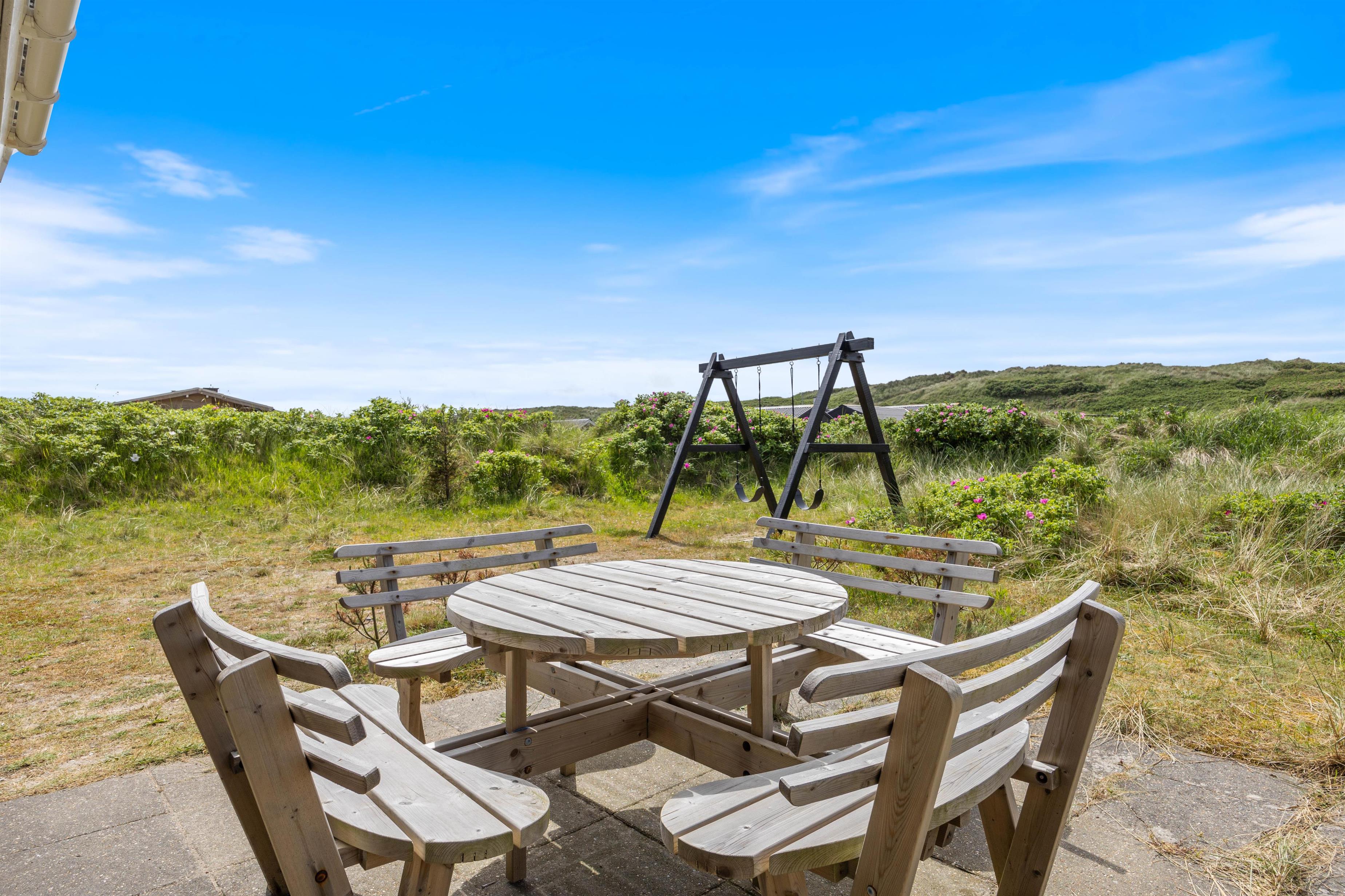 Dette feriehus har flere gode terrasser, hvor I altid nemt kan finde en dejlig lækrog. Drik morgenkaffen på den østvendte terrasse, mens I nyder morgensolen. Den sydvendte terrasse er overdækket og delvist afskærmet - her kan I slappe af i liggestolene, mens børnene gynger eller leger i sandkassen.