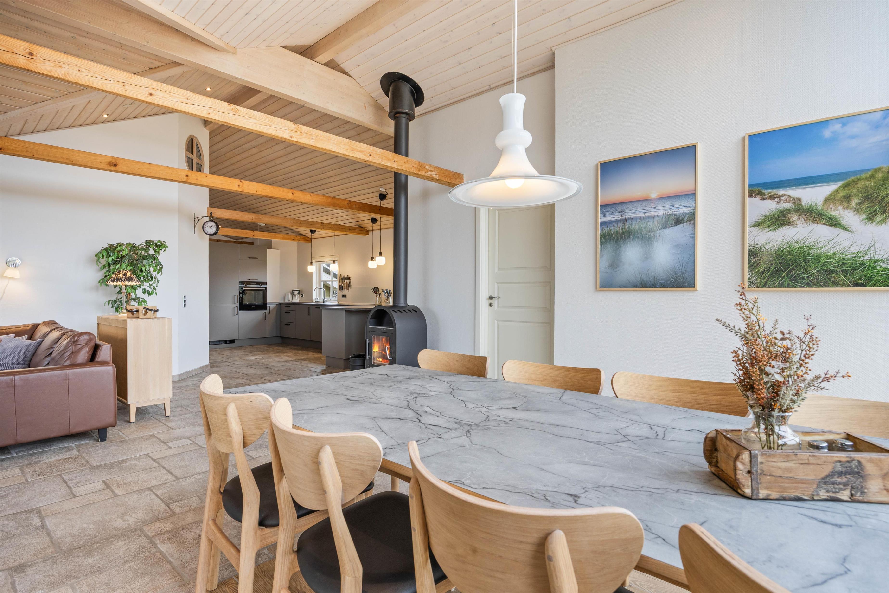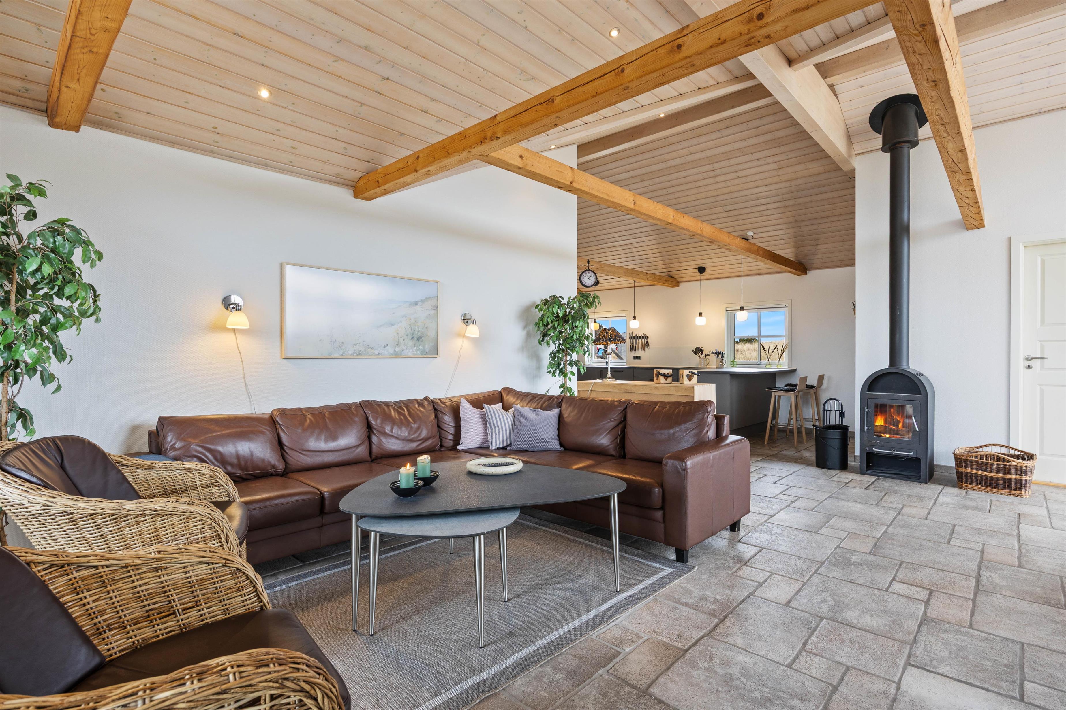 Sommerhuset er lækkert indrettet, og her er tænkt på det meste, så du kan holde en skøn og afslappende ferie i dejlige omgivelser. I det store opholdsrum er der er dejligt lysindfald fra de mange vinduerne, og bjælkerne i loftet sætter prikket over i'et, og gør det ekstra hyggeligt. Her kan I tilbringe tid sammen i sofaen, spille brætspil og lave mad i det veludstyrede køkken, mens brændeovnen knitrer i baggrunden. Feriehuset er udstyret med både vaskemaskine og tørretumbler, så I altid kan have rent tøj. Derudover er der også både barneseng og barnestol til rådighed.