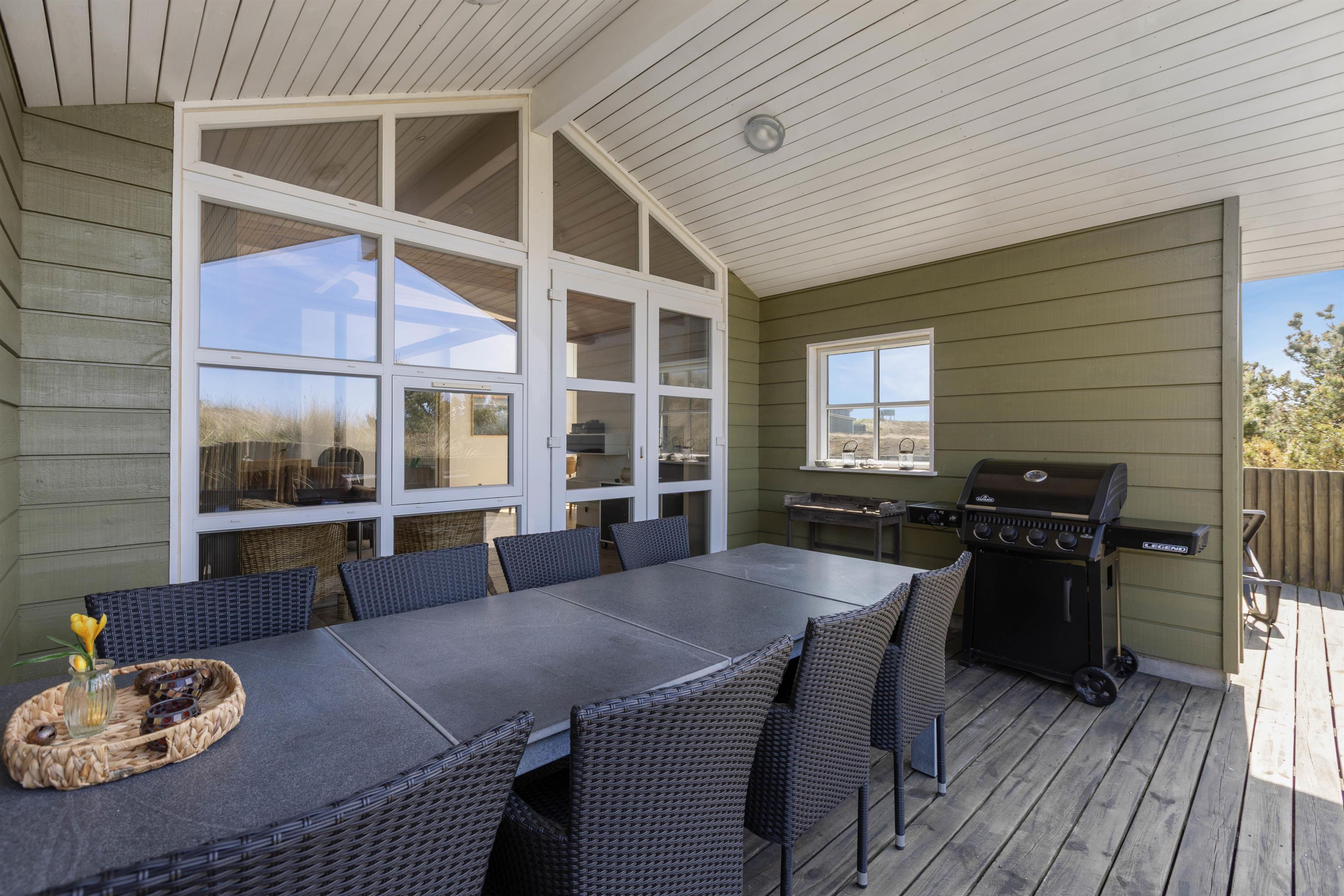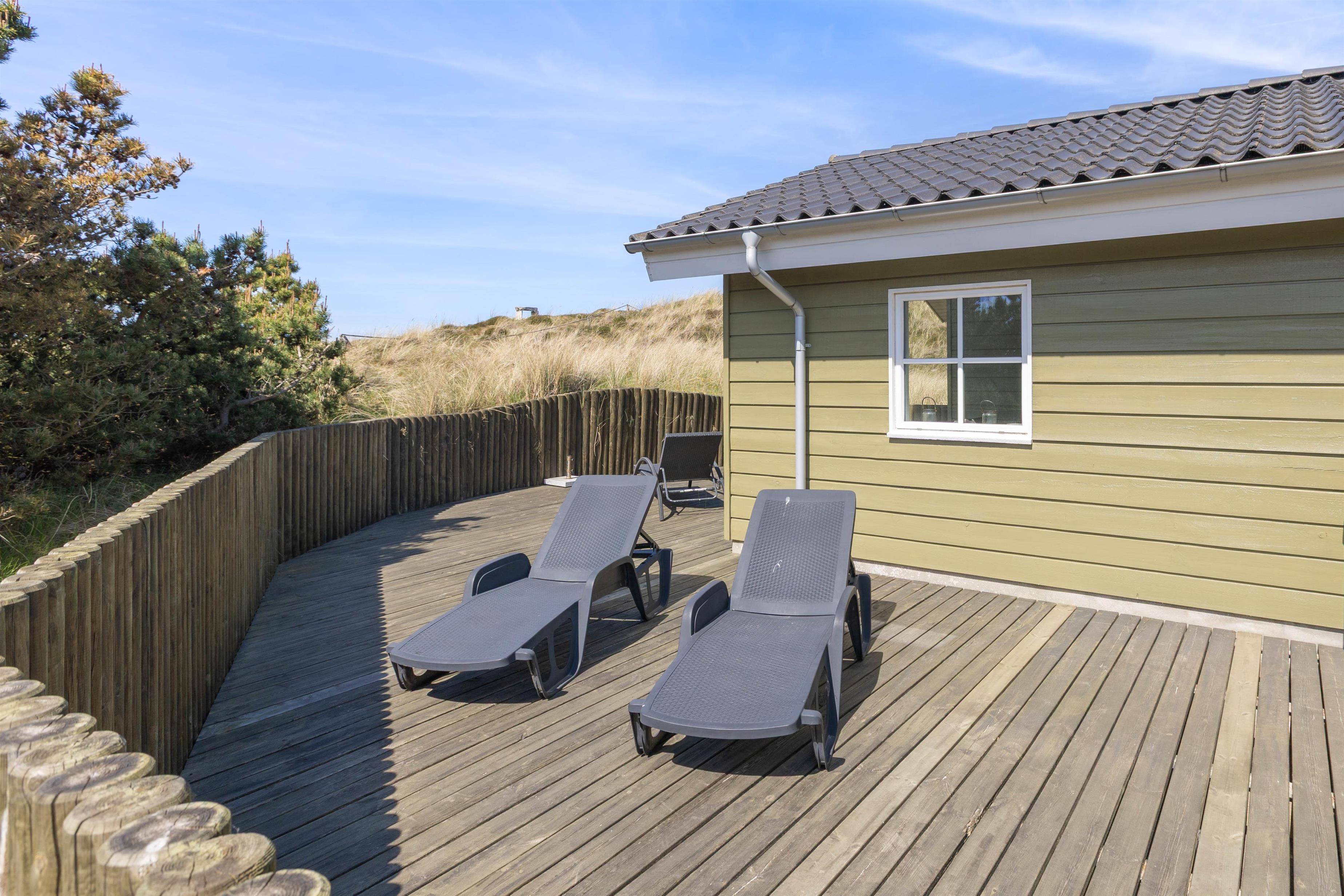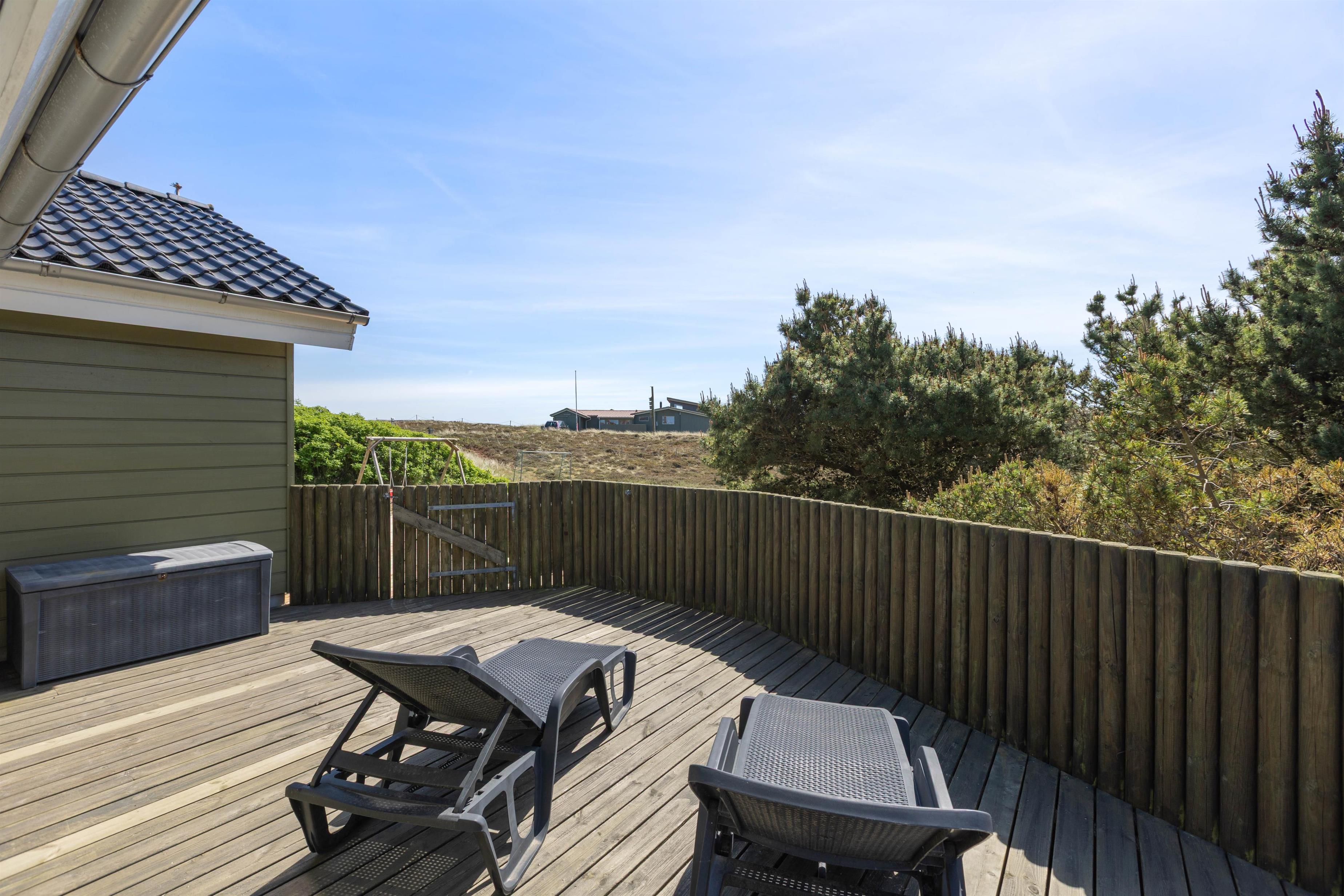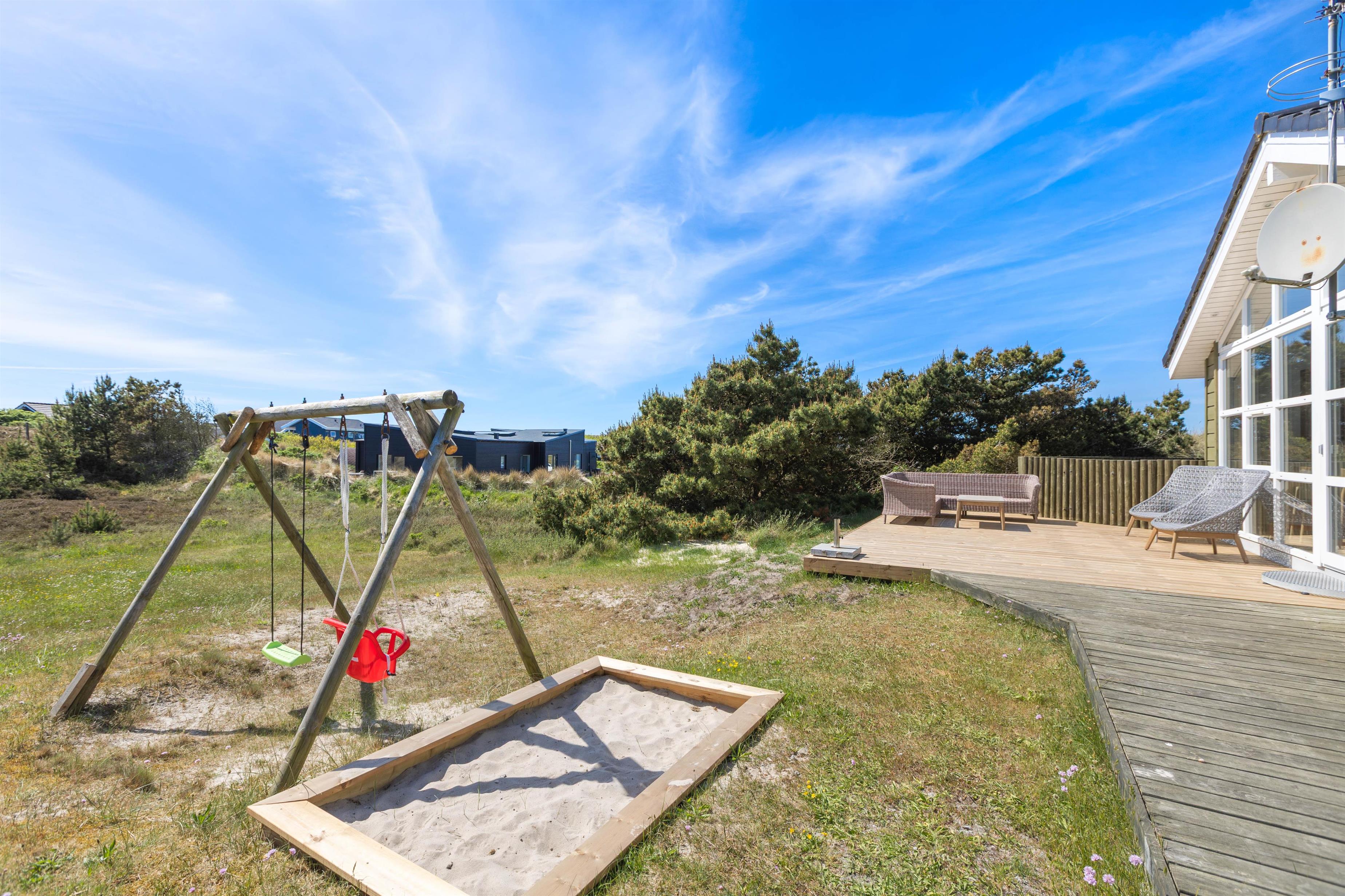 Sommerhuset er omgivet af terrasser, der er udstyret med gode havemøbler og liggestole. Her kan I følge solen rundt på himlen, og her kan I altid finde en herlig hyggekrog. Den vestvendte og overdækkede terrasse er perfekt til en herlig grillaften og et godt glas rødvin. Den delvist afskærmede terrasse gør også, at I altid kan finde en lækrog, hvor I kan nyde en dejlig kop kaffe. Den lukkede terrasse er praktisk, idet I kan lade hundene løbe frit, og de mindste kan lege for sig selv. Til de mindste er der også både sandkasse og gyngestativ, som de kan holde sig beskæftigede på.