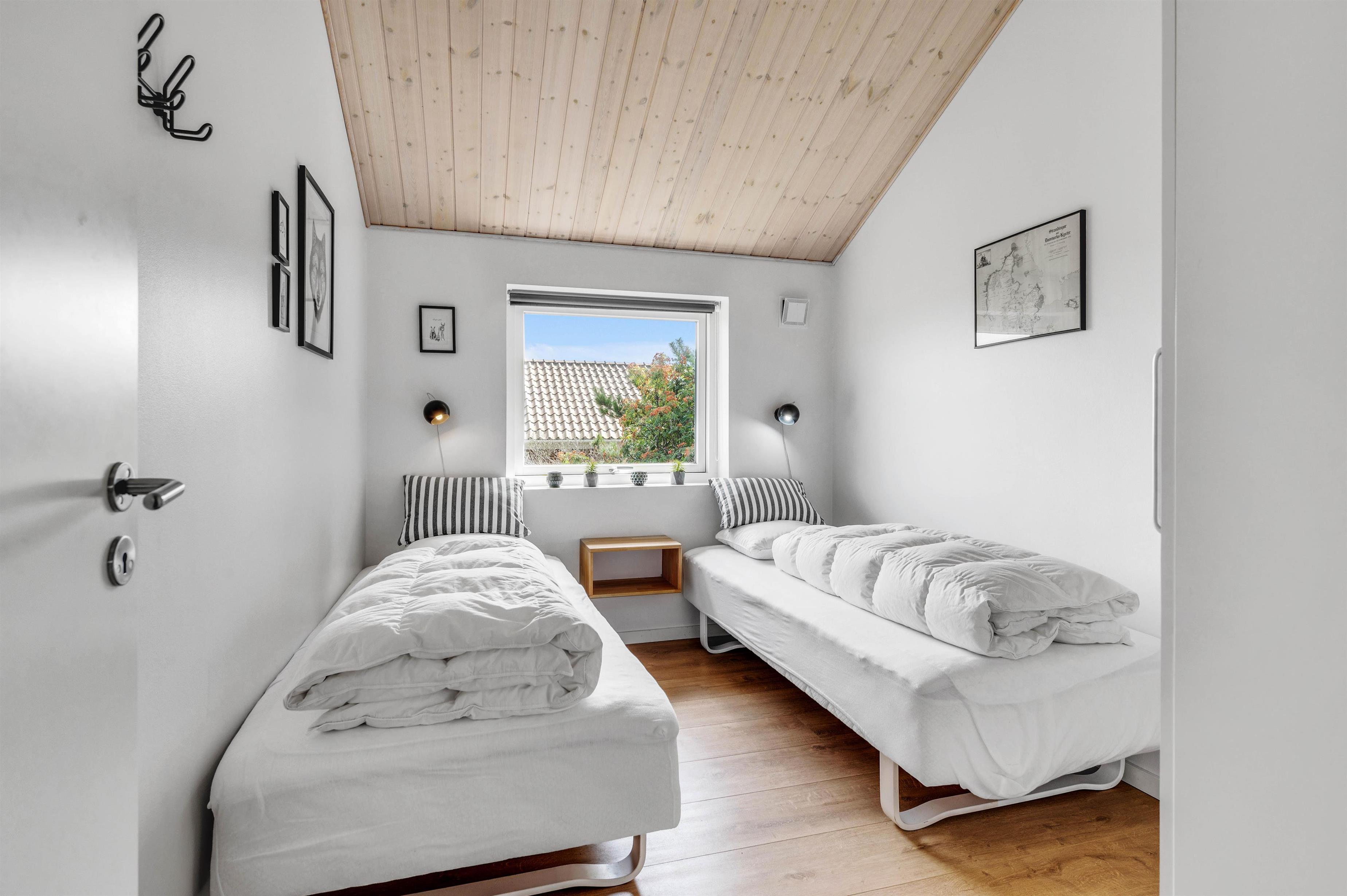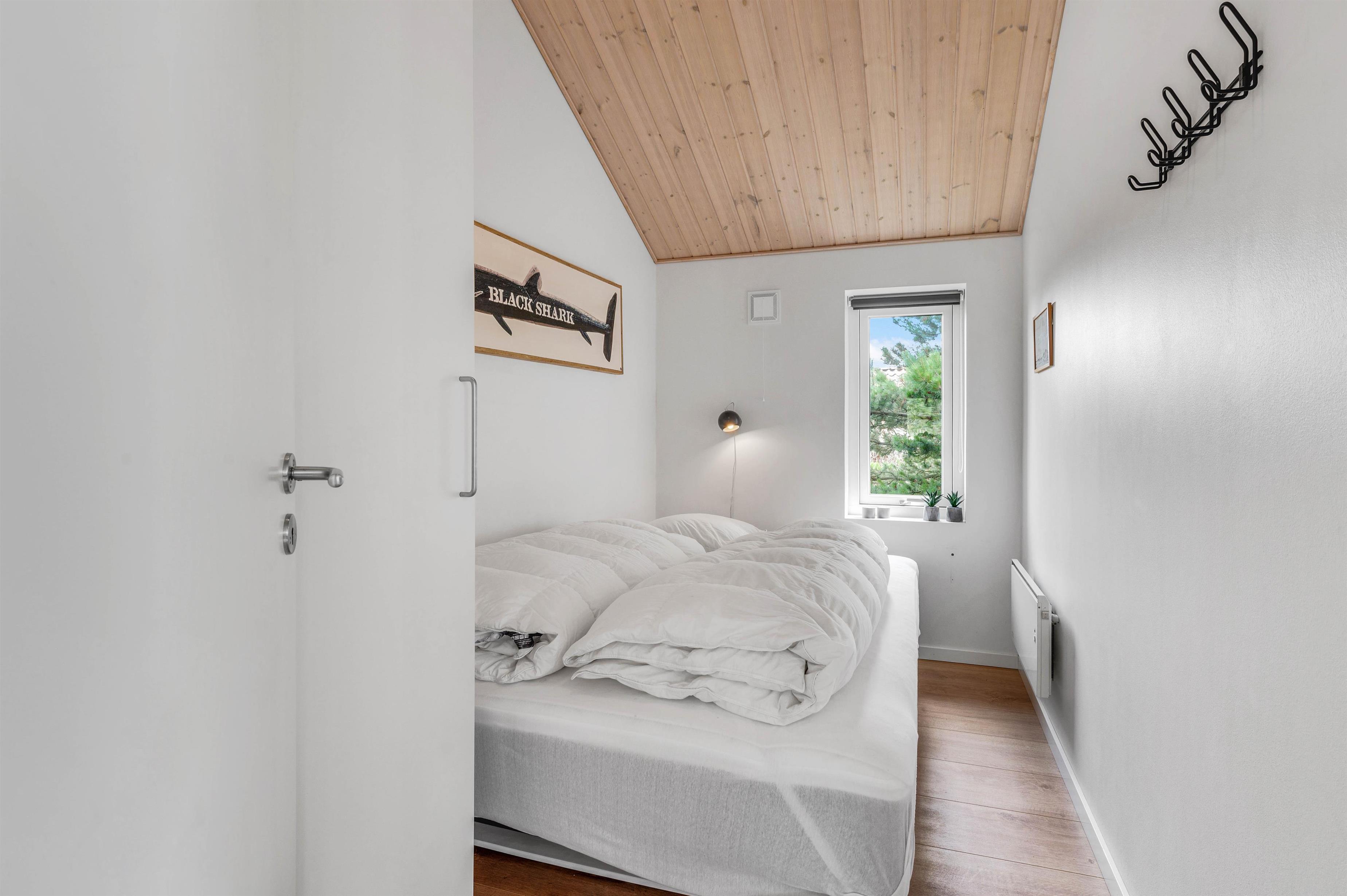 Feriehuset er til 6 personer, fordelt på 3 fine soverum. På to af værelserne finder I dobbeltsenge, mens det sidste værelse er med to enkeltsenge, som evt. kan rykkes sammen. Badeværelset er lækkert og praktisk indrettet med stor bruseniche og gulvvarme. Den energibesparende varmepumpe sørger for at holde energiforbruget på passende niveau.