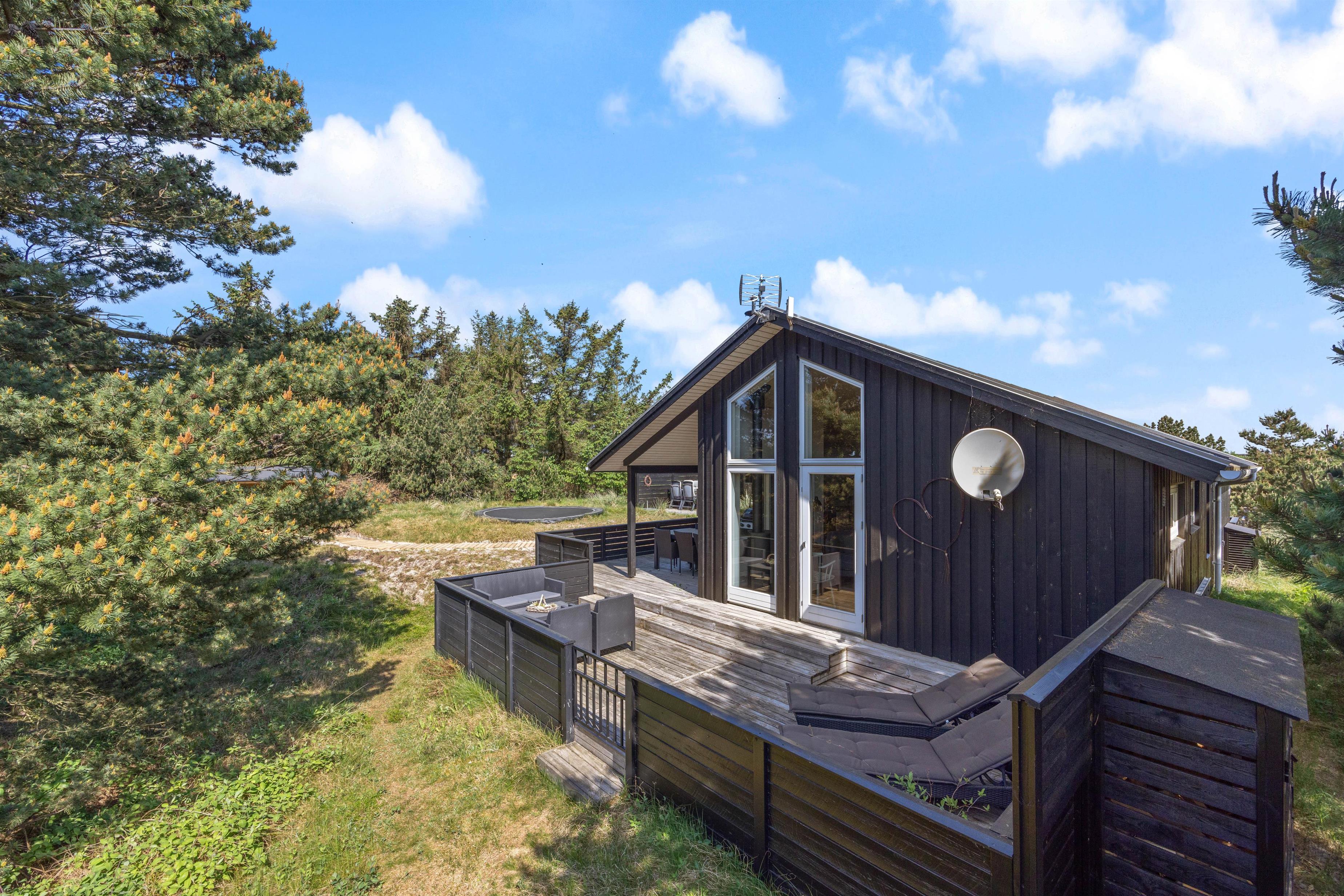 Sommerhuset her på Bjerregårdsvej 46 er omgivet af fine og næsten lukkede terrasser hele vejen rundt, og det ligger på en dejlig og kuperet naturgrund med læ og sandkasse.