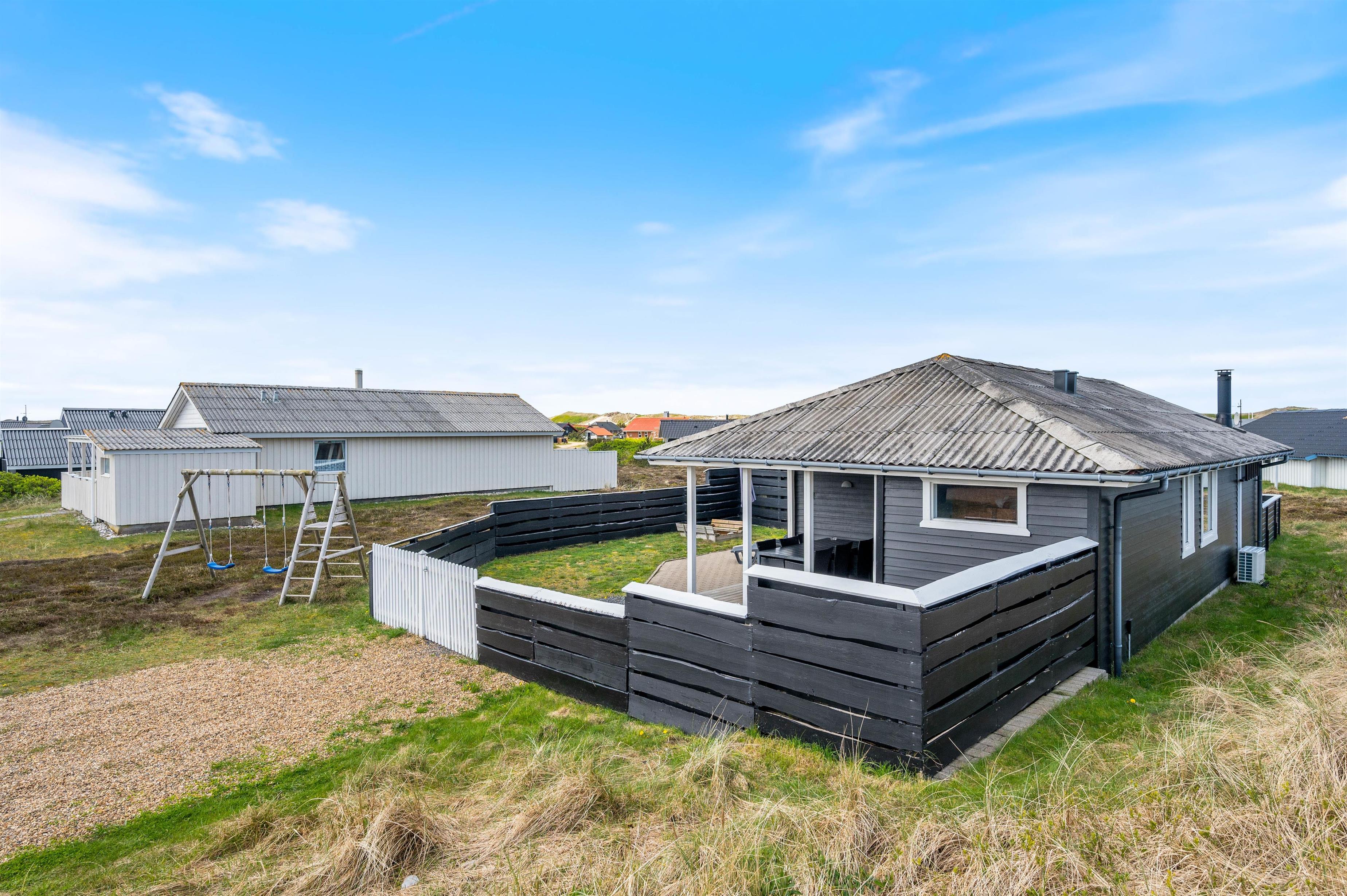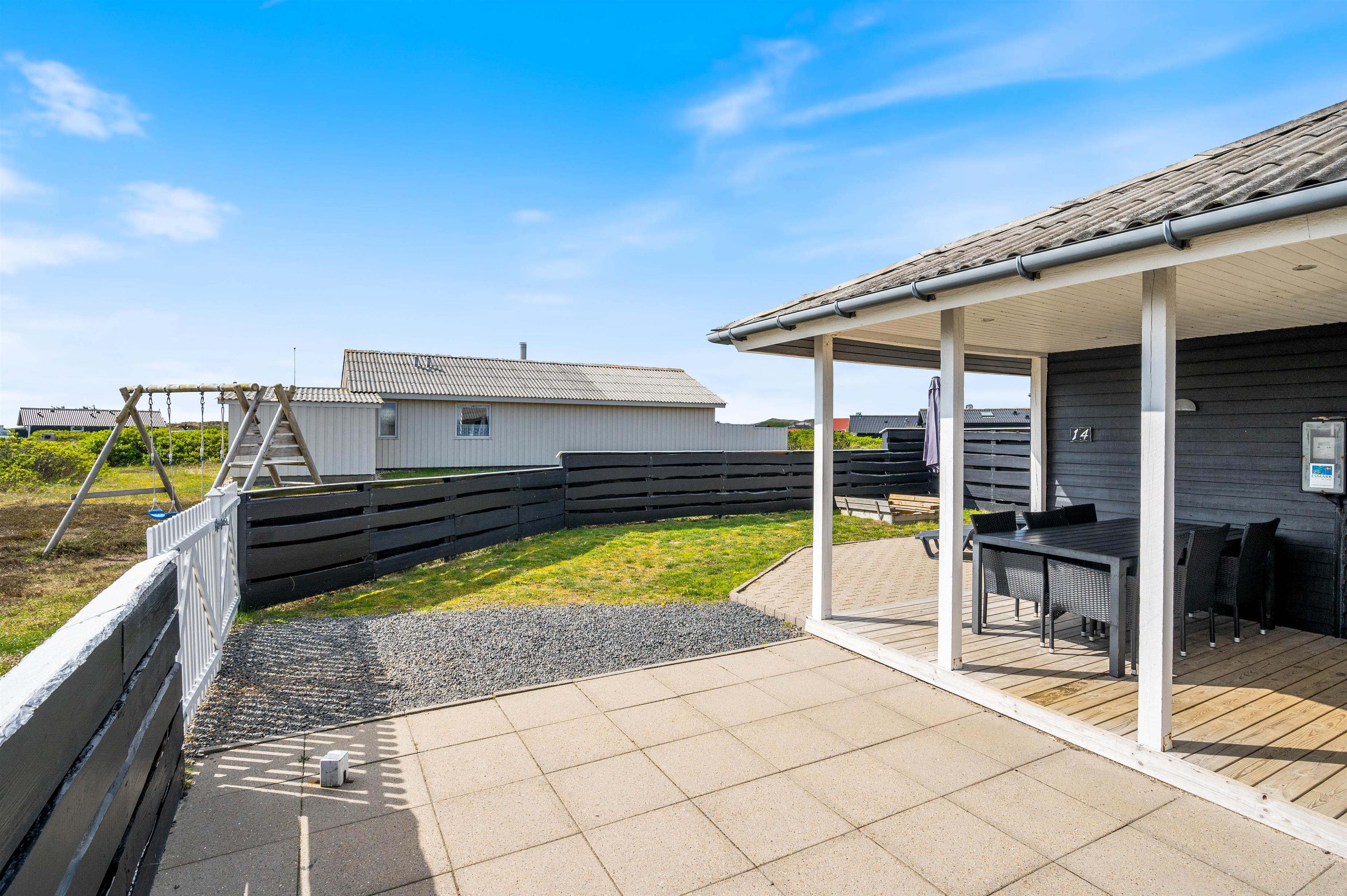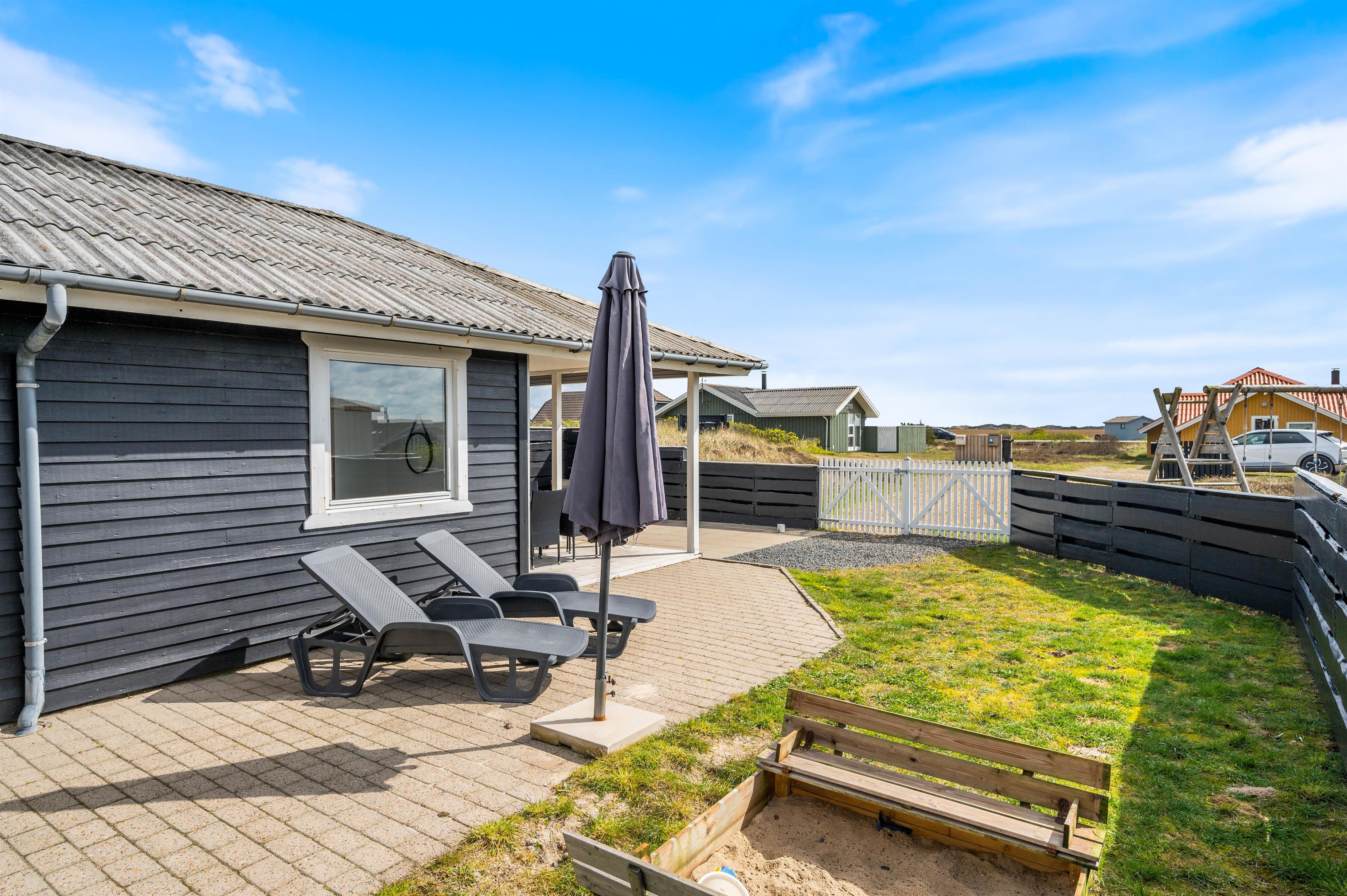 Med til huset hører en stor, lukket terrasse, som er rigtig praktisk, hvis I har små børn eller hunde med. Her kan de få lov til at løbe frit, mens I daser i solsengene eller tænder op i grillen og gør klar til en lækker middag. Til børnene er der også sørget for et gyngestativ og en sandkasse.
