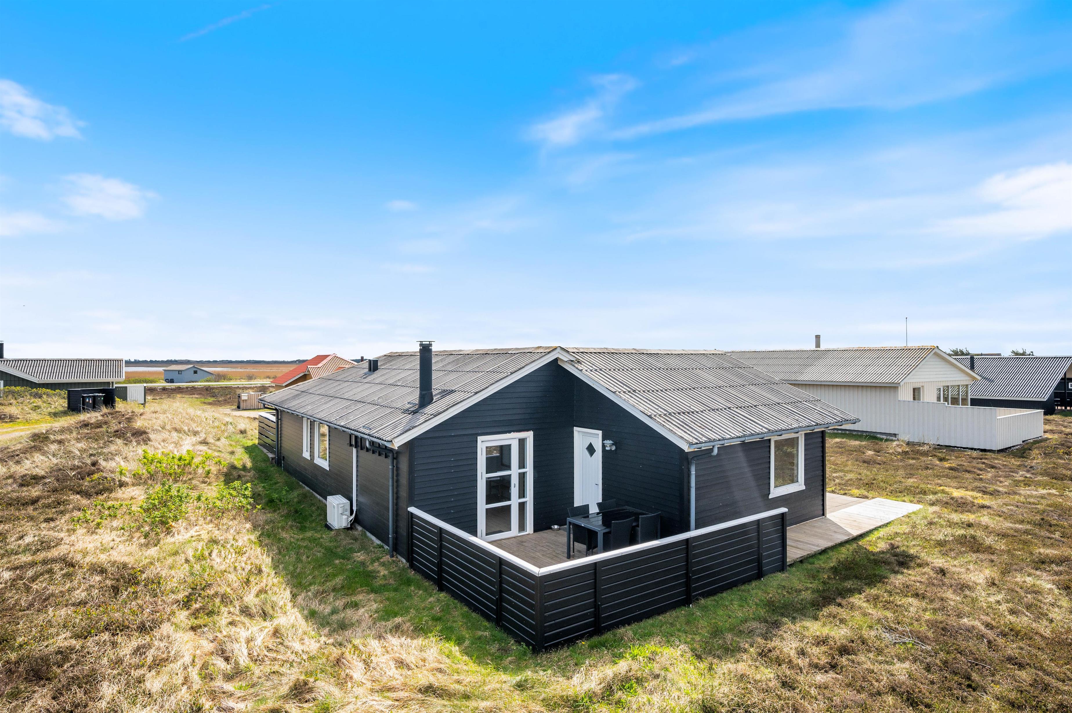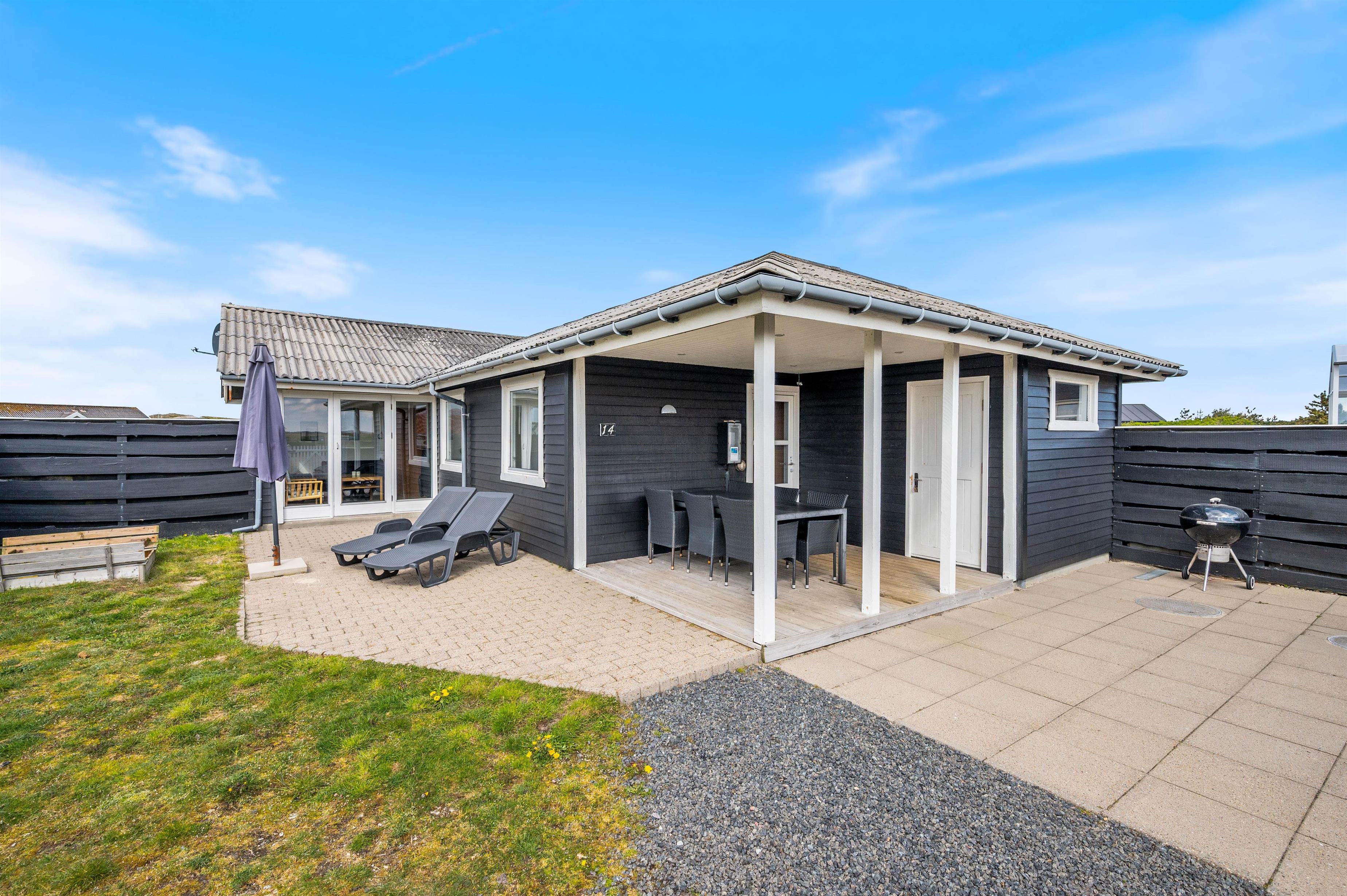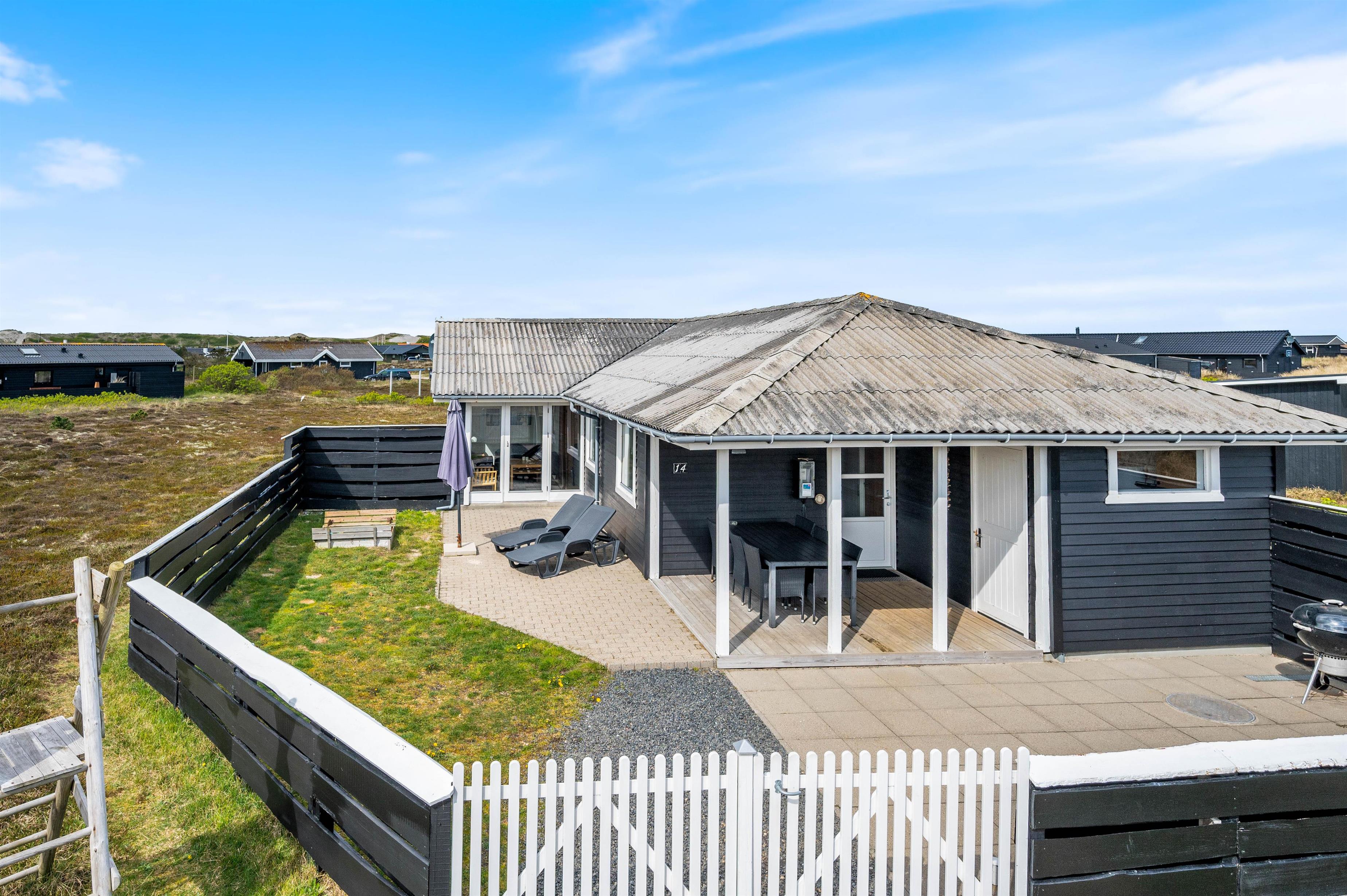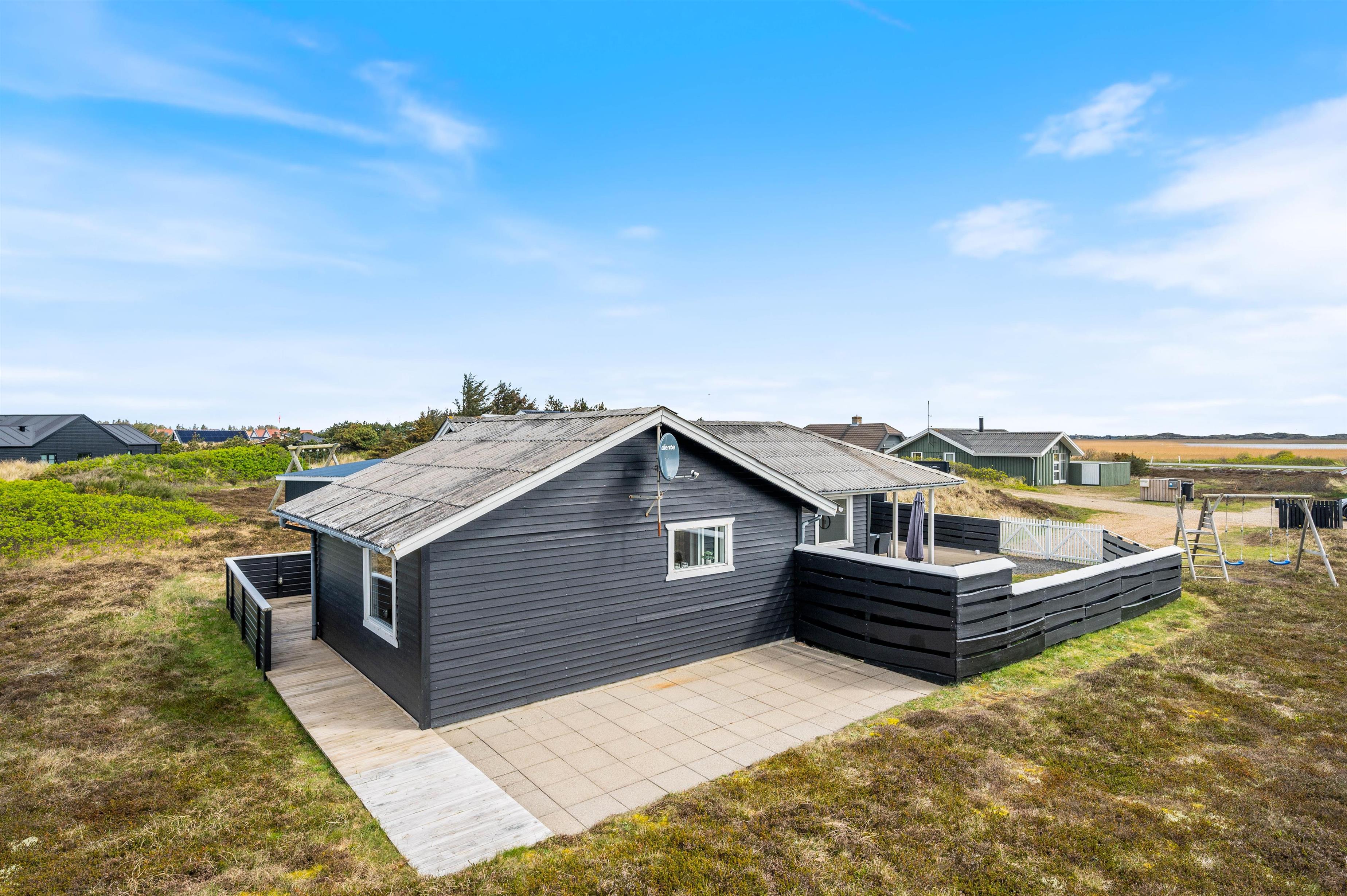 Med til huset hører en stor, lukket terrasse, som er rigtig praktisk, hvis I har små børn eller hunde med. Her kan de få lov til at løbe frit, mens I daser i solsengene eller tænder op i grillen og gør klar til en lækker middag. Til børnene er der også sørget for et gyngestativ og en sandkasse.