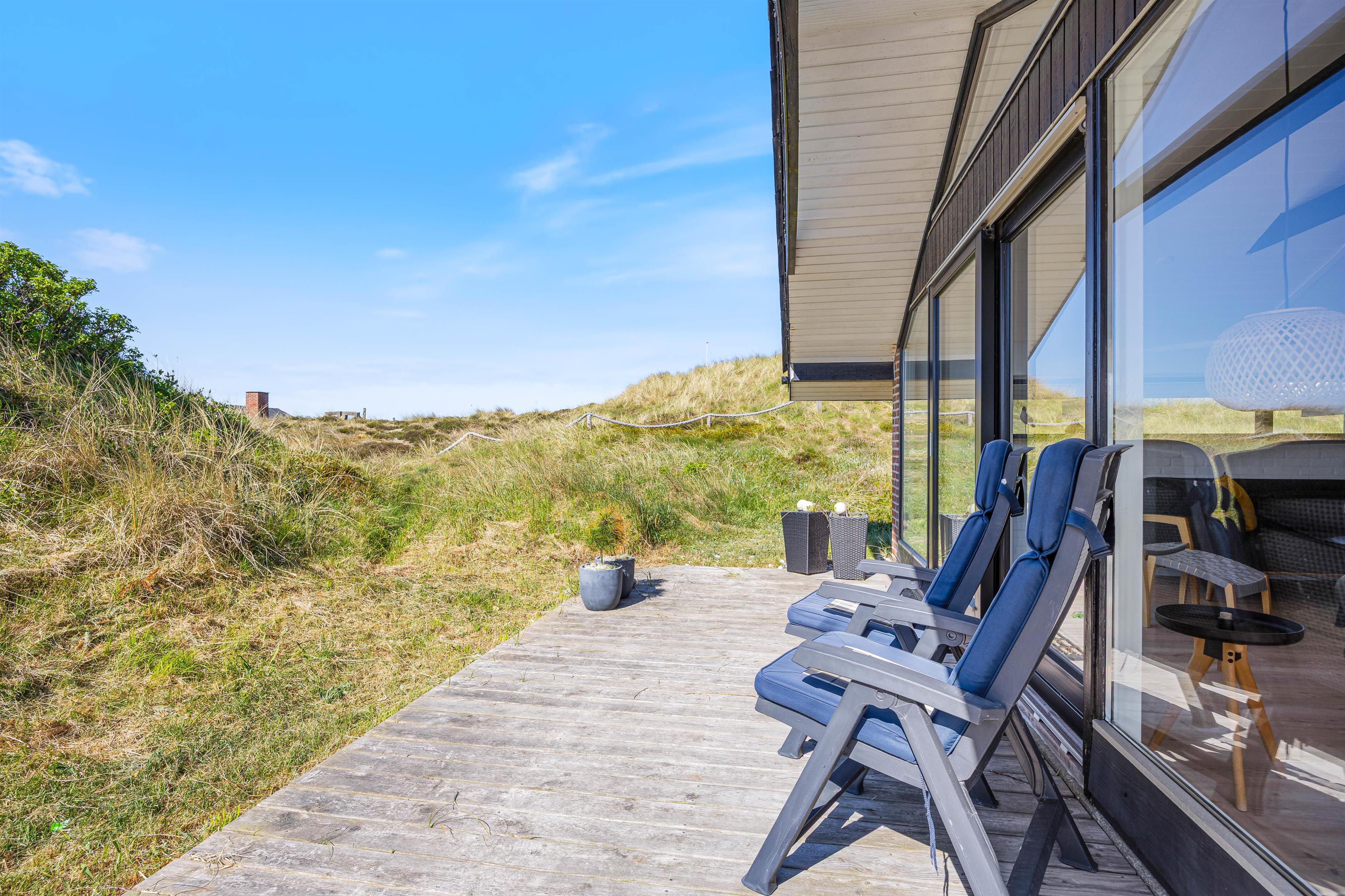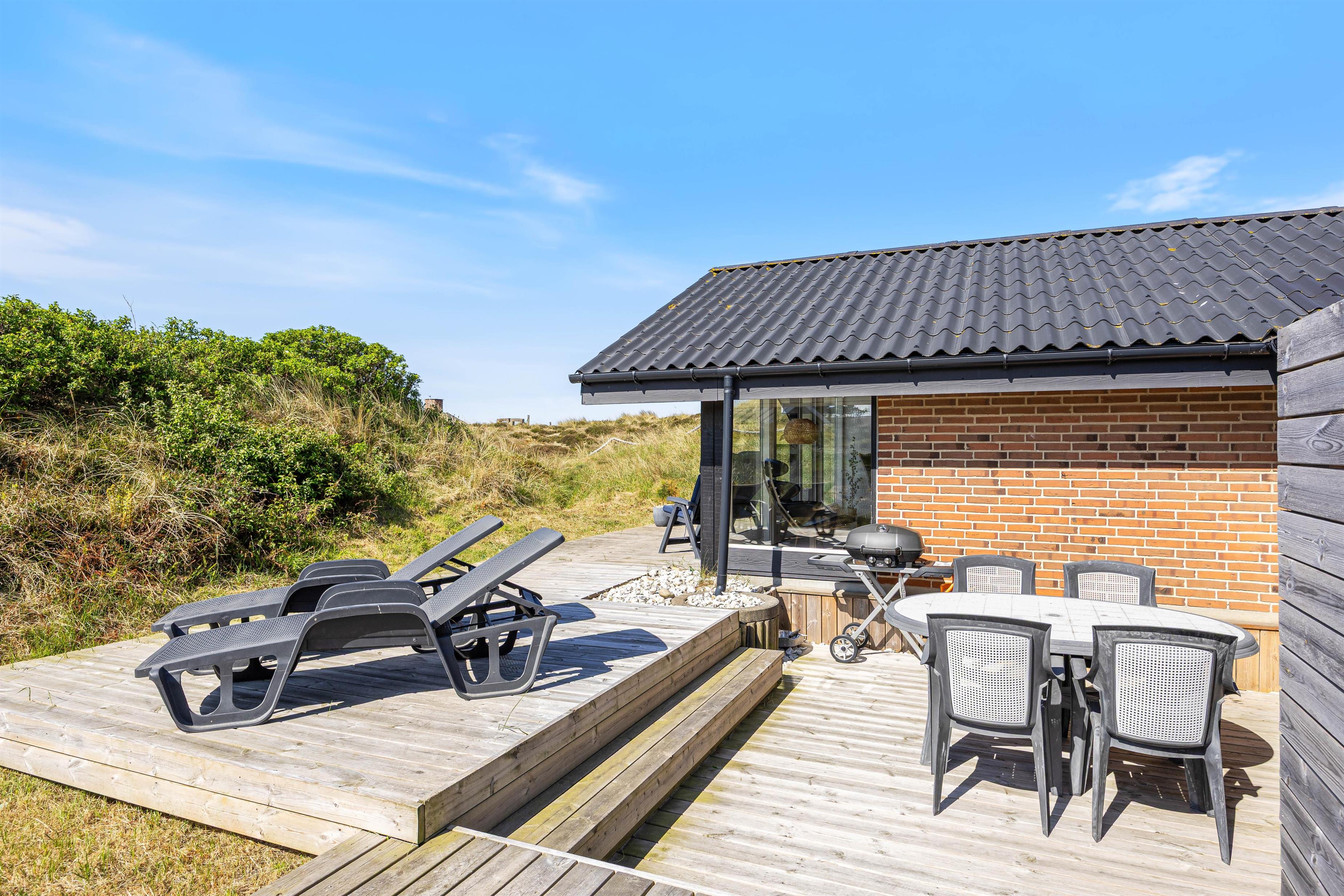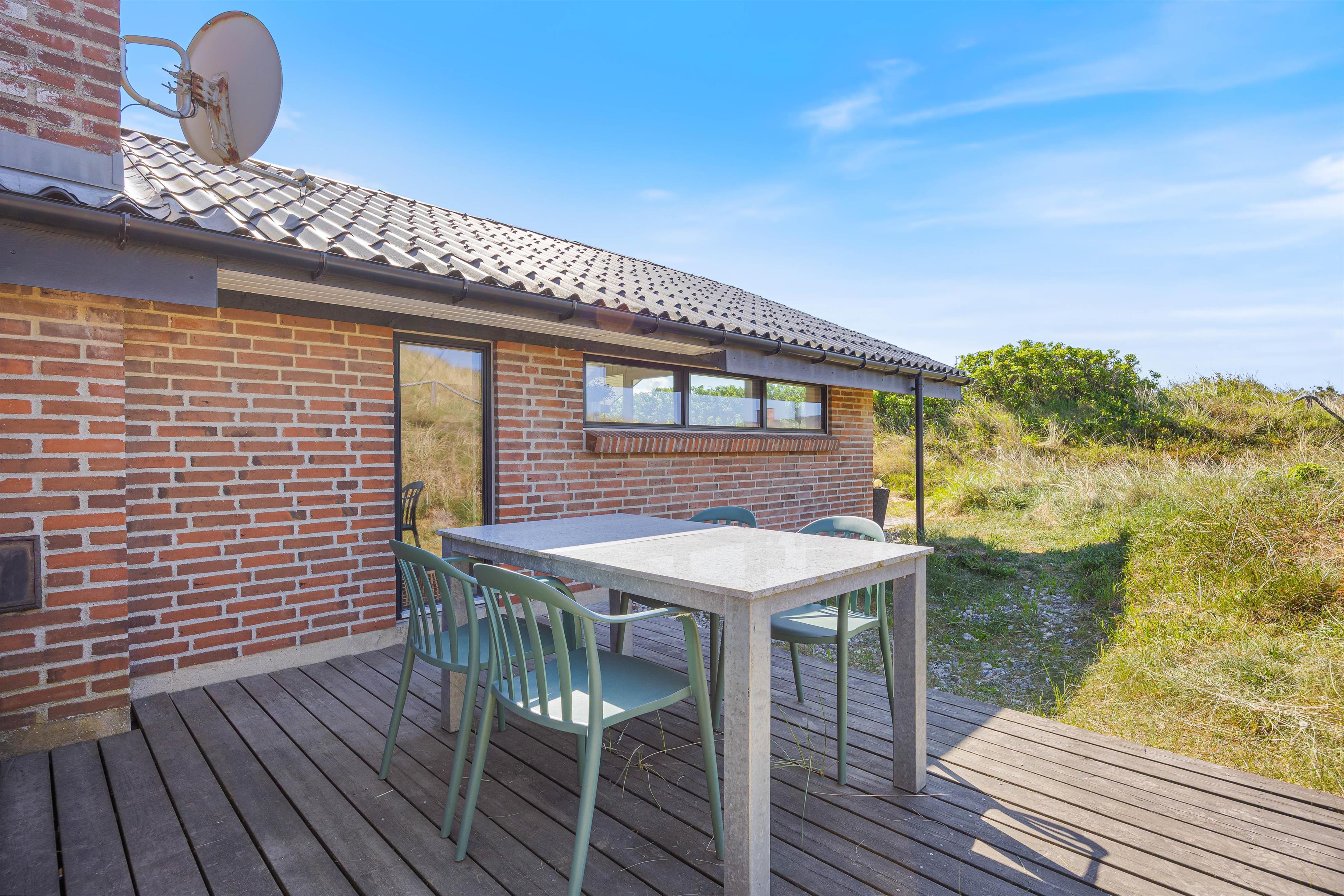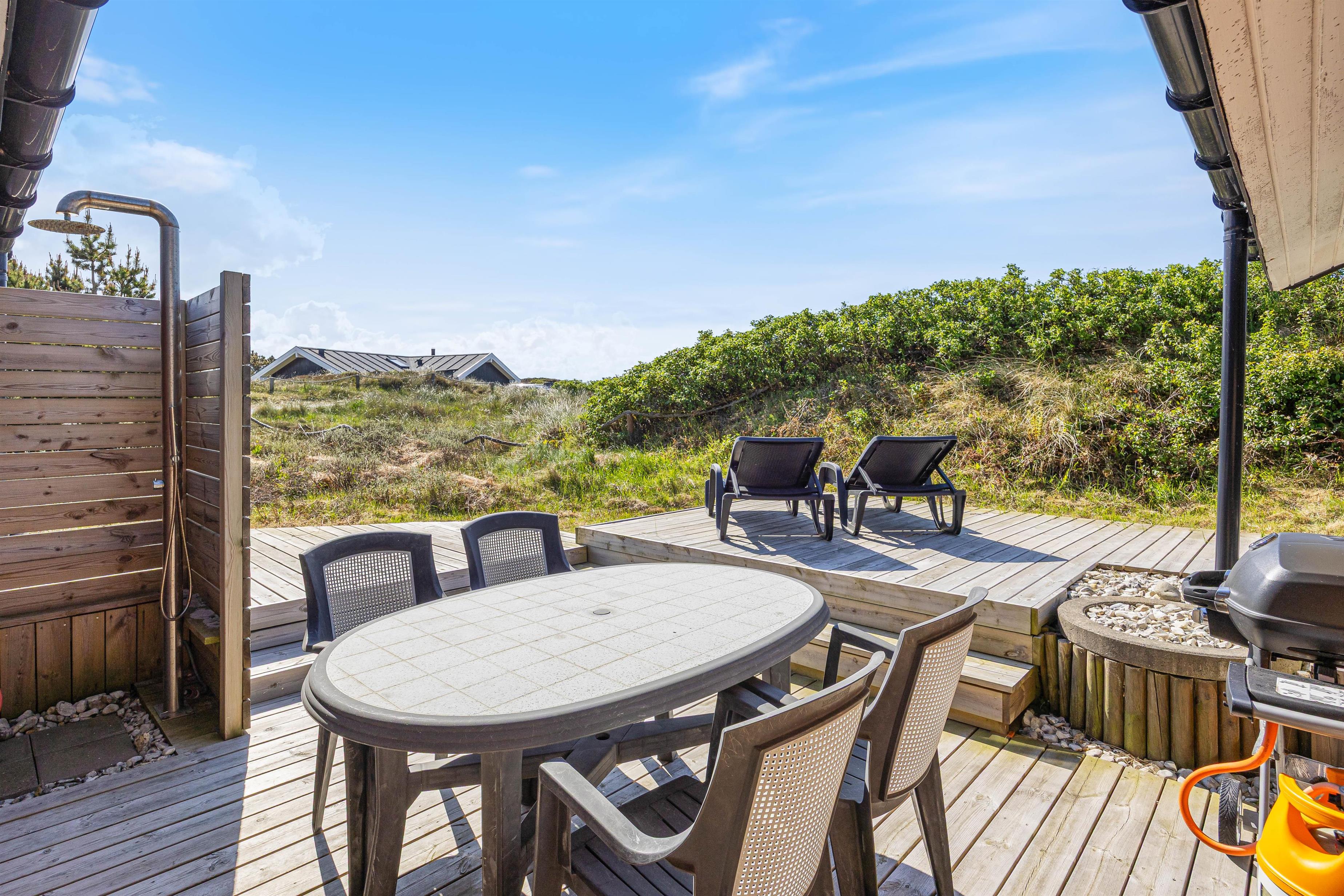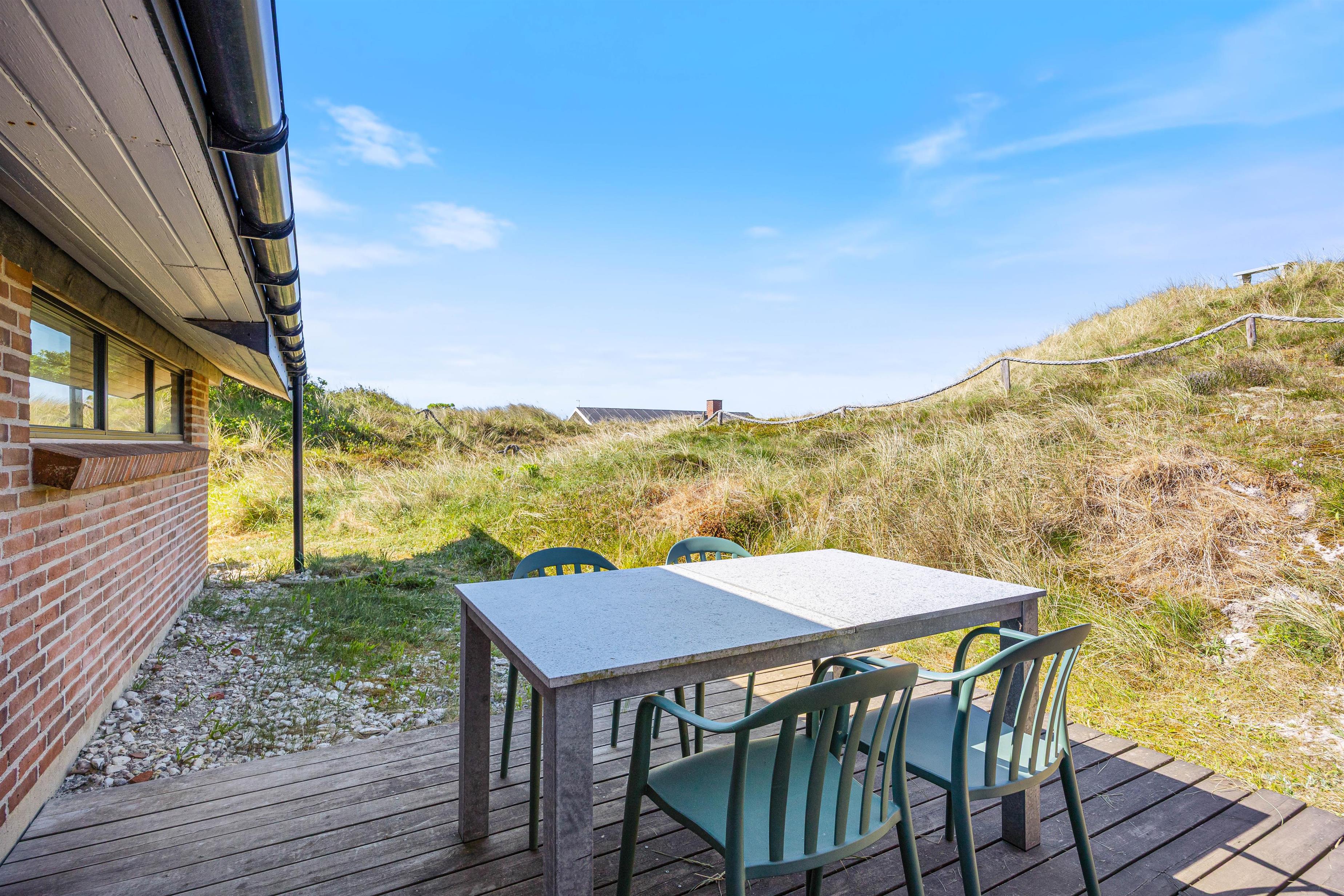 Spisebordet har en fantastisk placering foran stuens panoramavinduer med udsigt til klitterne. Fra stuen har I udgang til den sydvendte terrasse. Afhængig af årstiden kan I hygge jer både ude og inde med følelsen af at sidde midt i den dejlige natur, og klitterne giver god afskærmning til naboer, så I kan føle jer ugeneret. Om aftenen kan I nemt og hurtigt tilberede en lækker middag på husets gasgrill, hvilket er til stor fornøjelse hos både store og små.