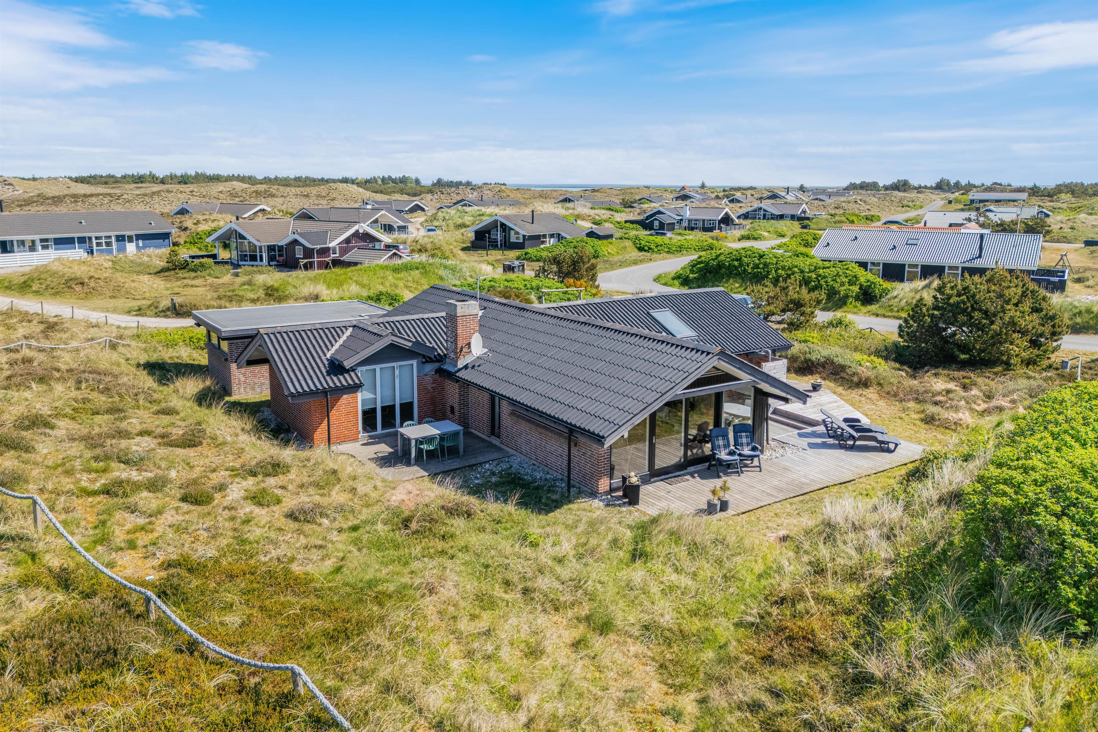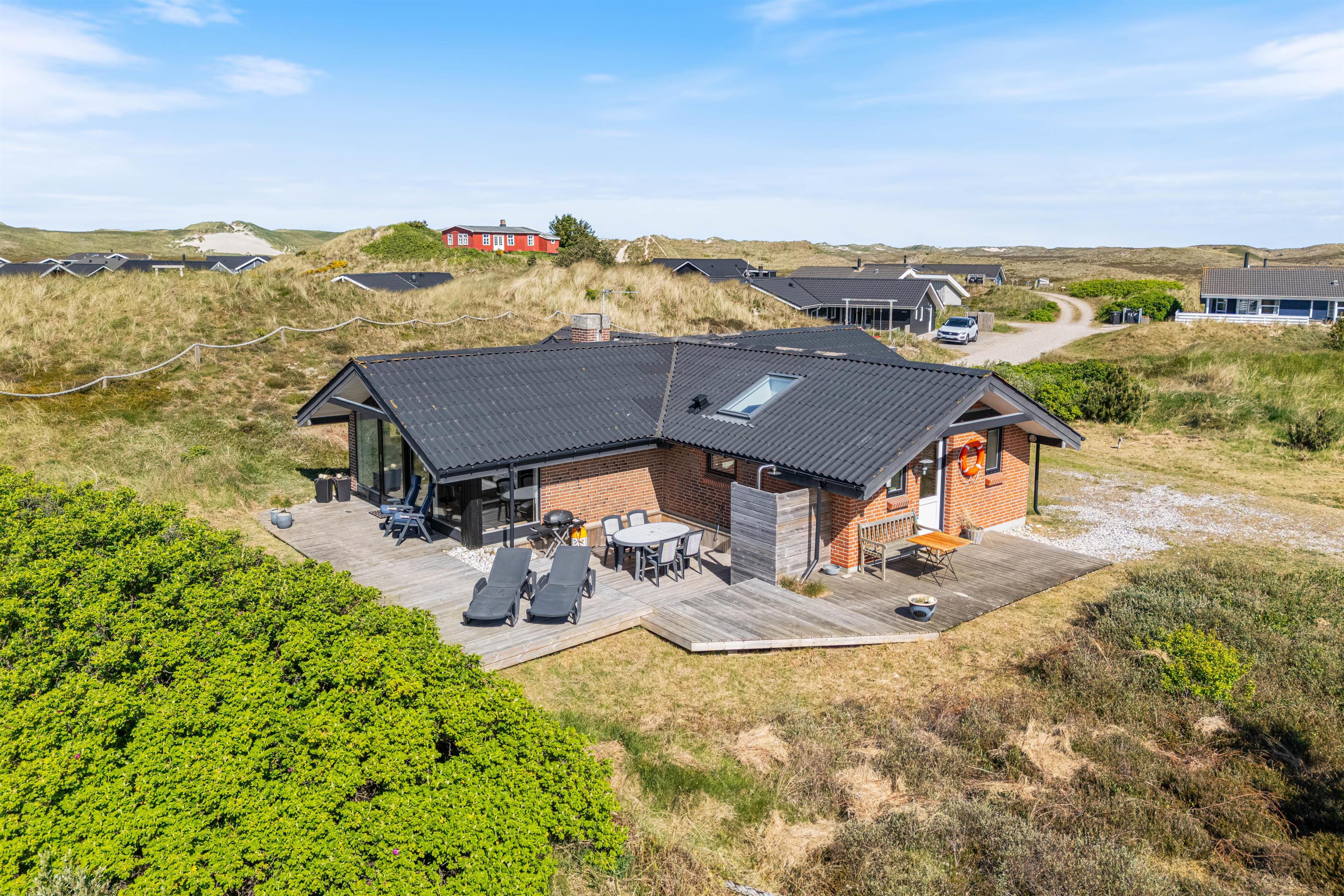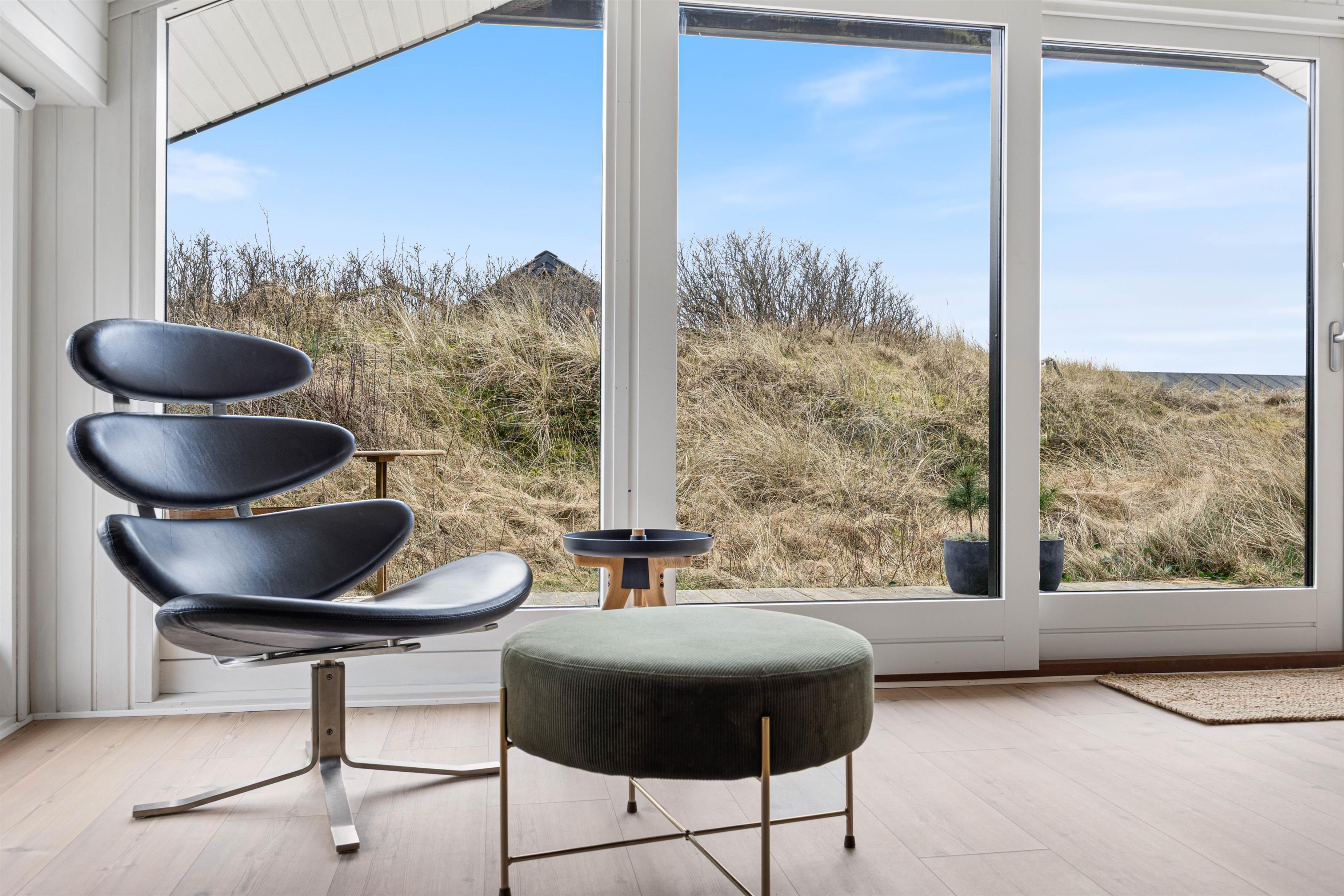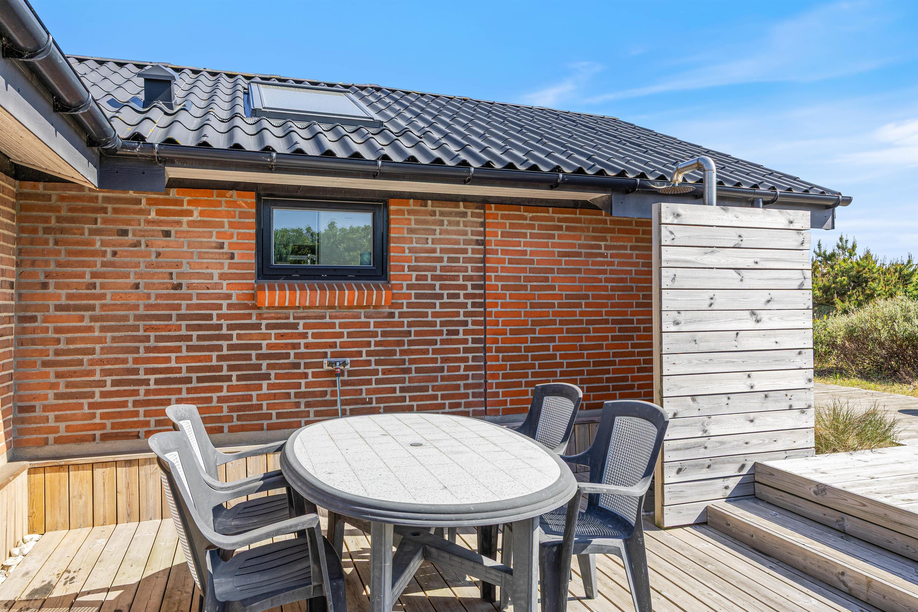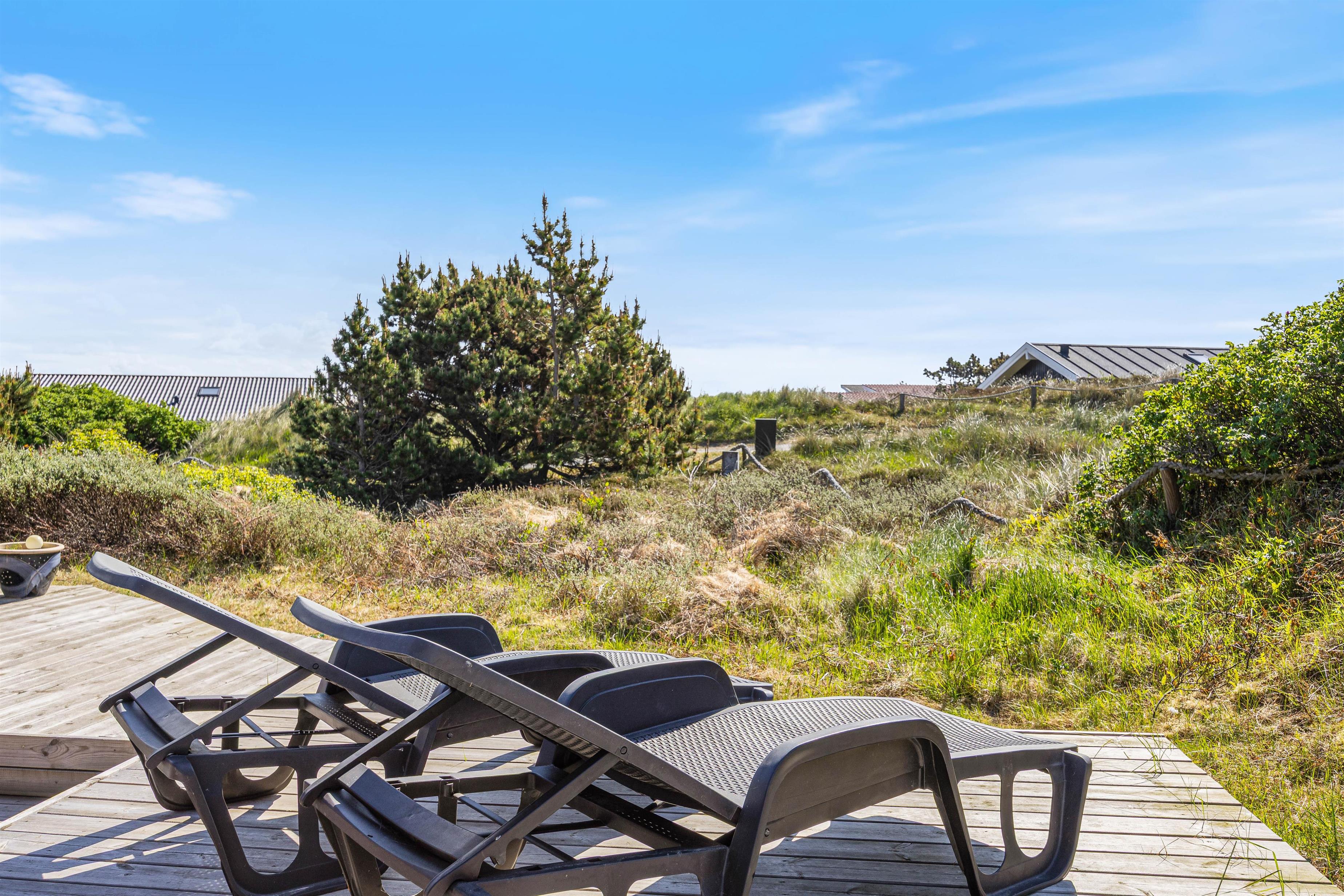 Spisebordet har en fantastisk placering foran stuens panoramavinduer med udsigt til klitterne. Fra stuen har I udgang til den sydvendte terrasse. Afhængig af årstiden kan I hygge jer både ude og inde med følelsen af at sidde midt i den dejlige natur, og klitterne giver god afskærmning til naboer, så I kan føle jer ugeneret. Om aftenen kan I nemt og hurtigt tilberede en lækker middag på husets gasgrill, hvilket er til stor fornøjelse hos både store og små.
