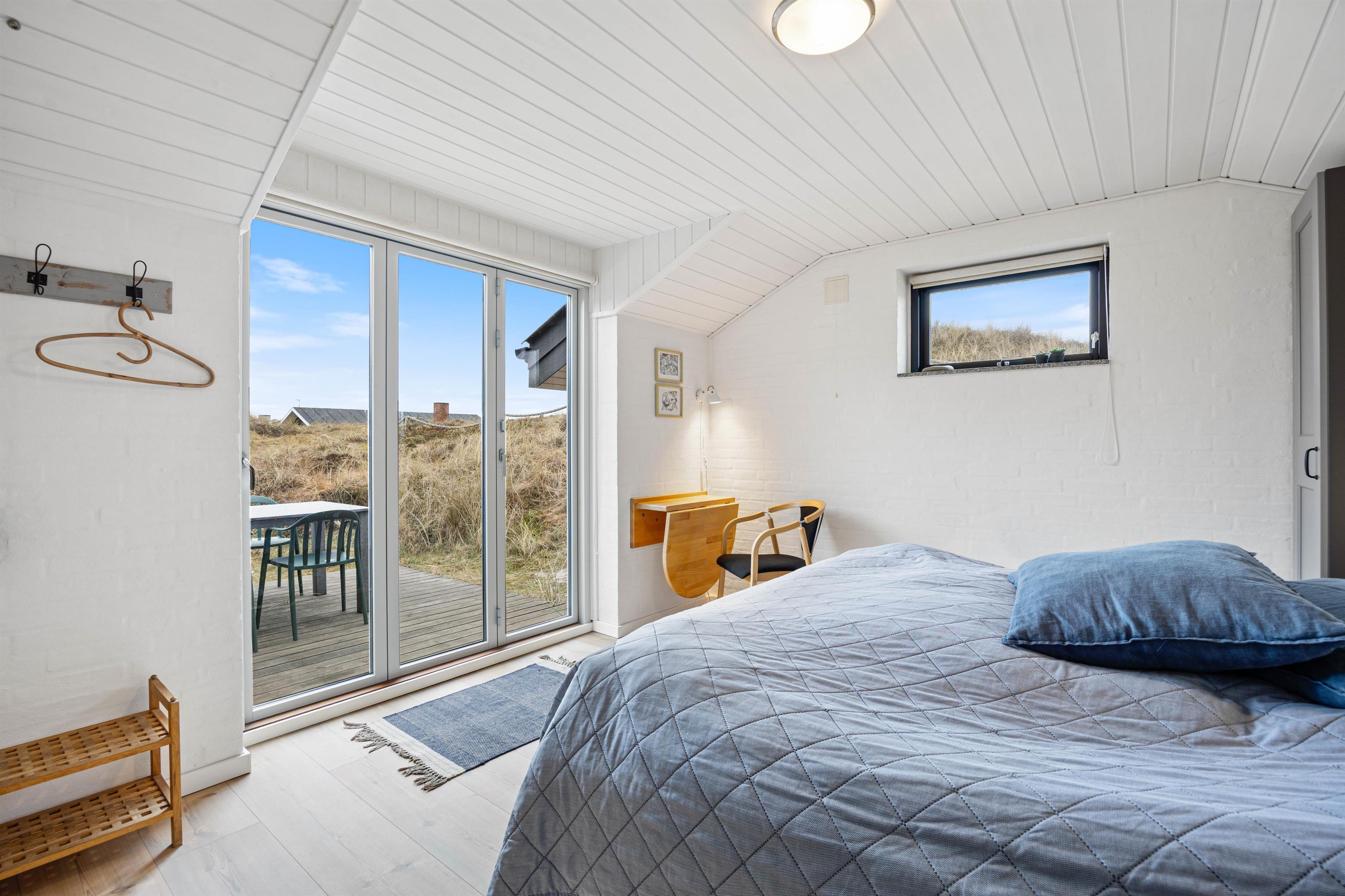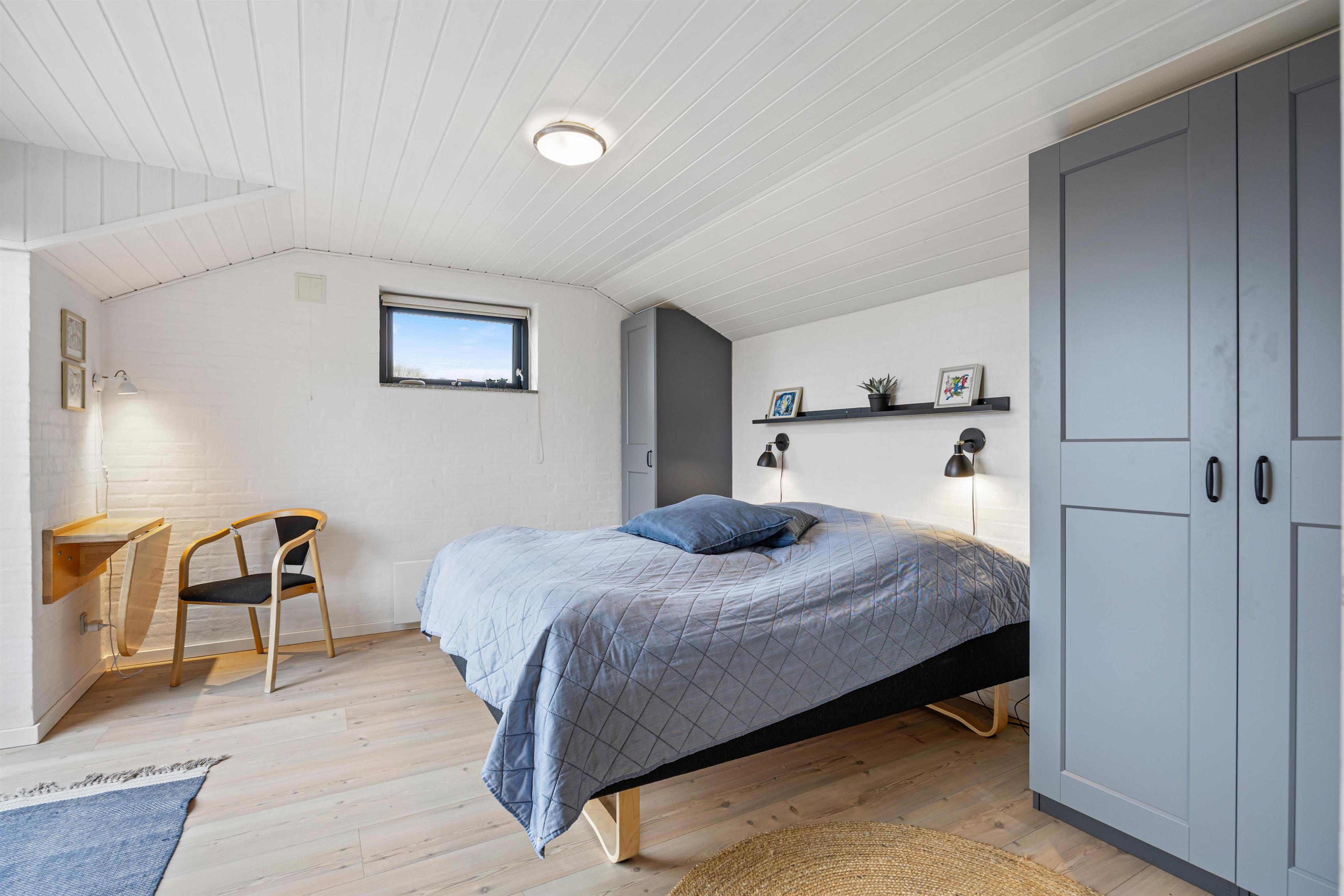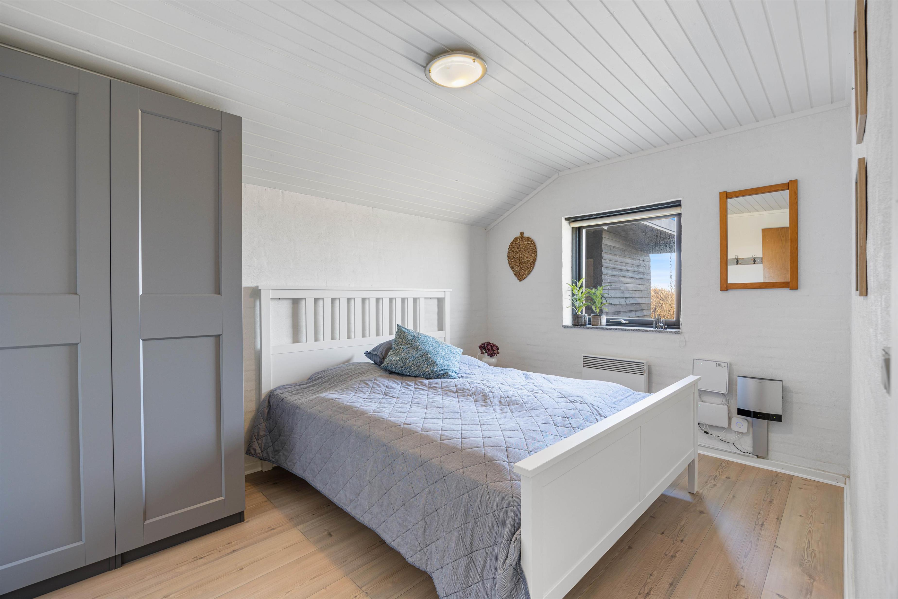 Sommerhuset har et dejligt badeværelse med gulvvarme. Her finder I også både vaskemaskine og tørretumbler, der gør det let at få toppen af vaskekurven, efter en lang dag i klitterne. Sommerhuset råder over 3 soveværelser, der med sine hvide vægge, lyse gulve og lofter venligt indbyder til en god nats søvn.