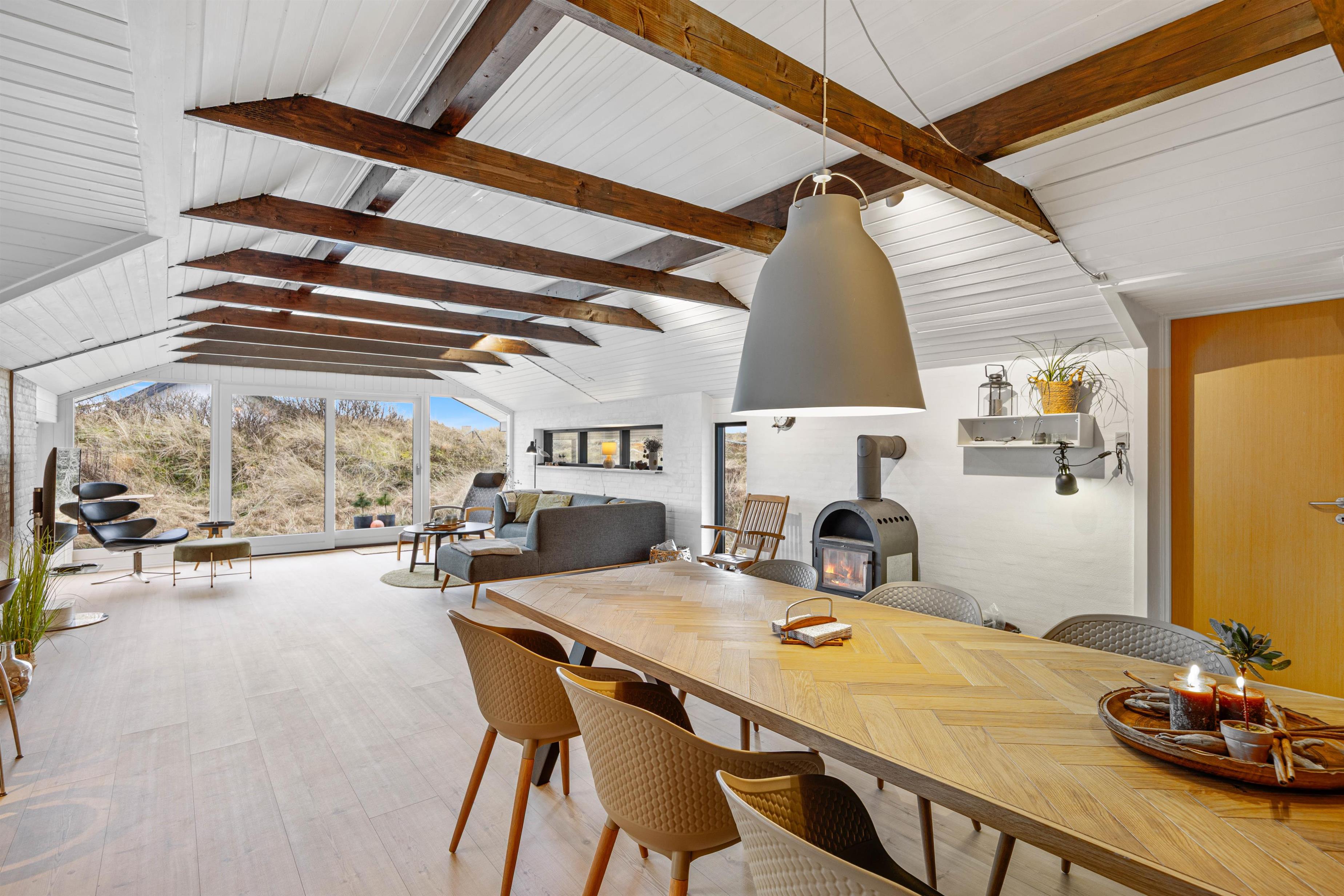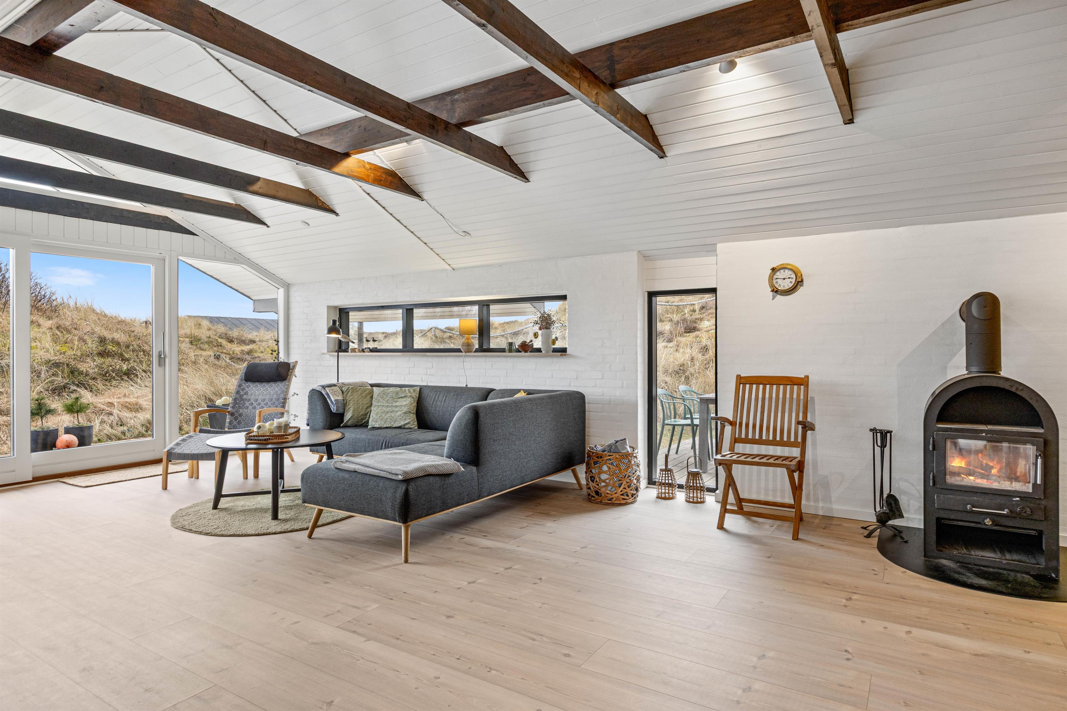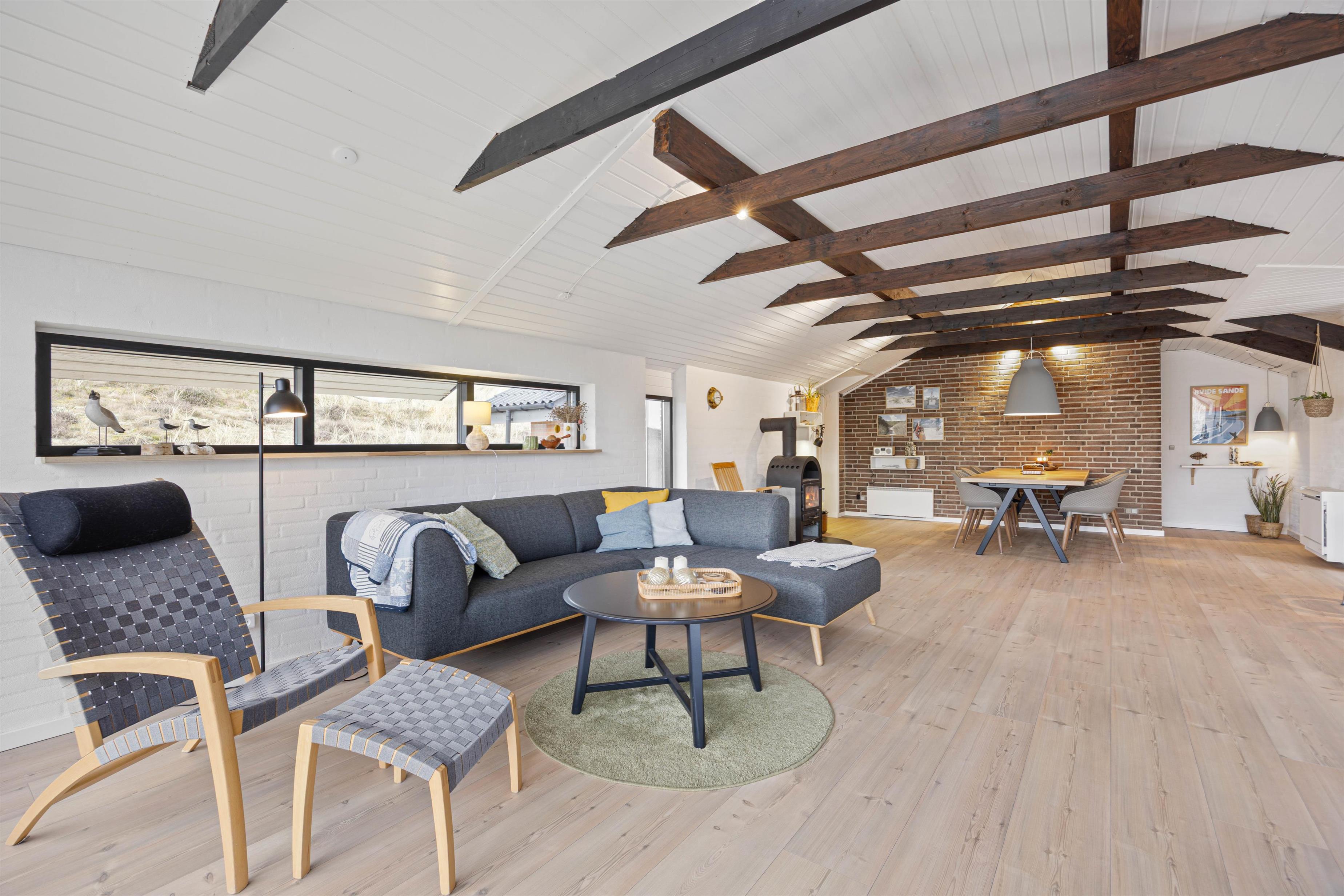 Sommerhuset er på 123 m2. Det moderne køkken med blandt andet nespresso maskine, vinkøleskab, opvaskemaskine og mikroovn samt Philips Hue ligger i åben forbindelse med den hyggelige stue, der er smagfuldt indrettet med møbler, der fint går i tråd med de buede lyse trælofter, de synlige mørkere bjælker, de hvide vægge og den rå murstensvæg, der giver stuen et rustikt og hyggeligt udtryk.