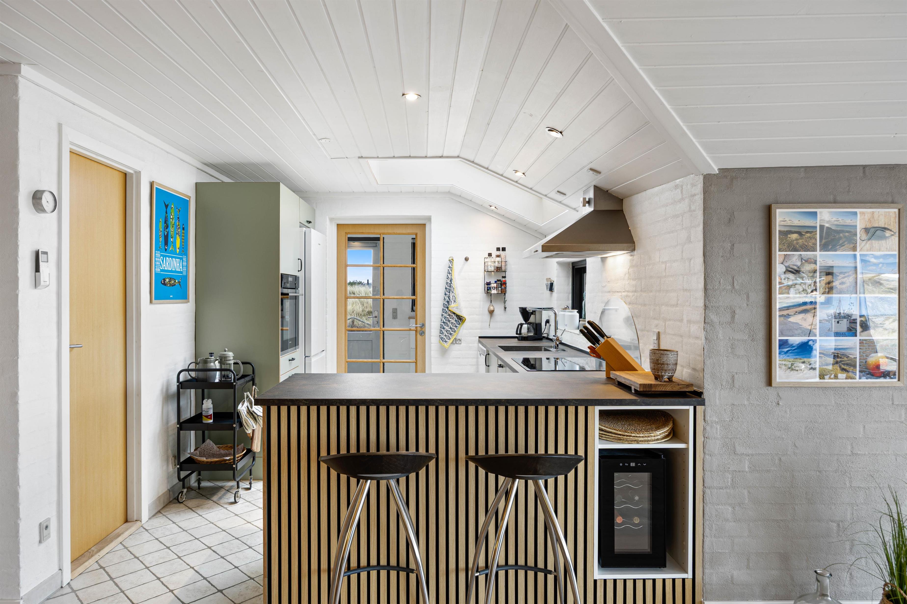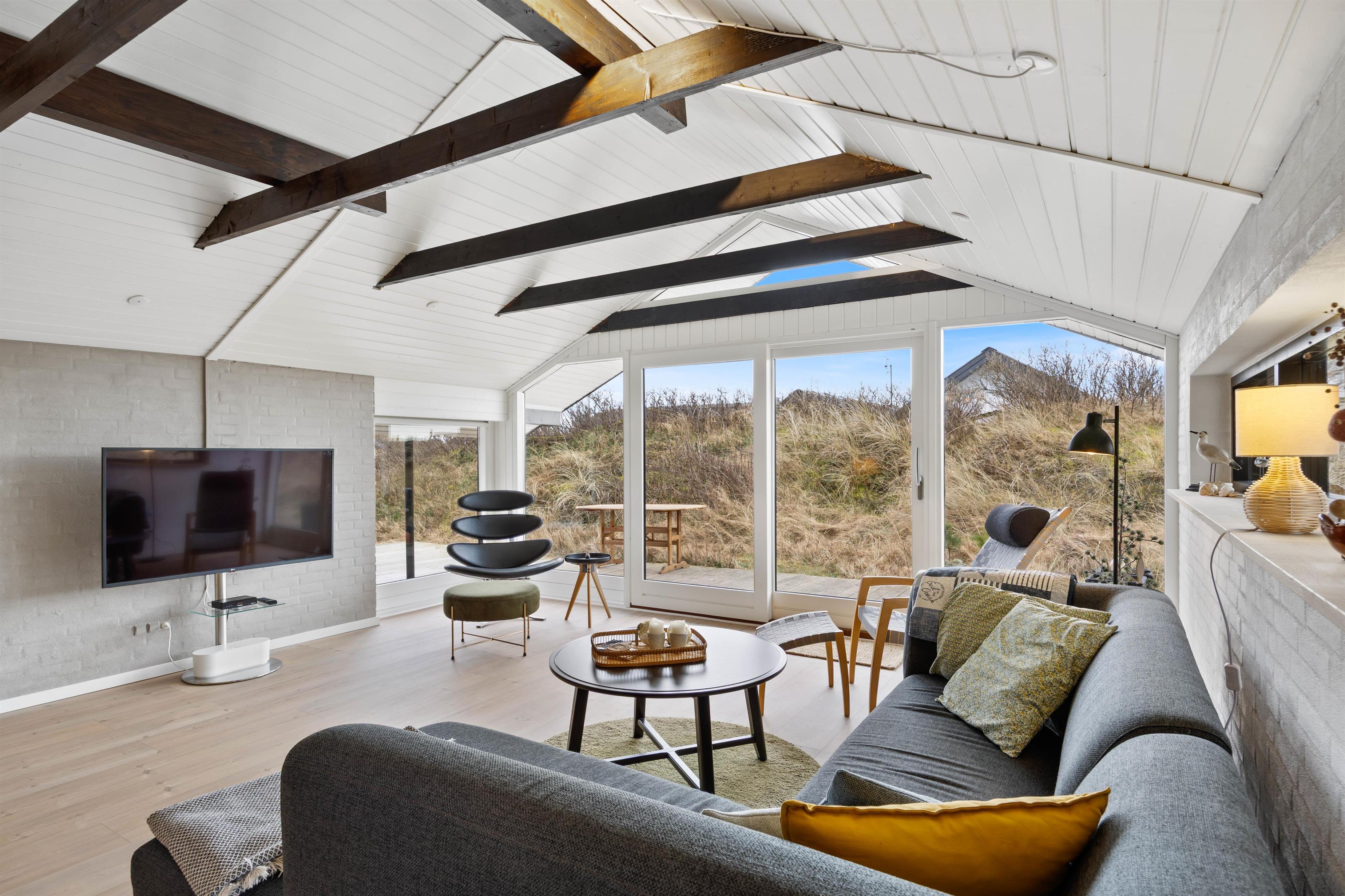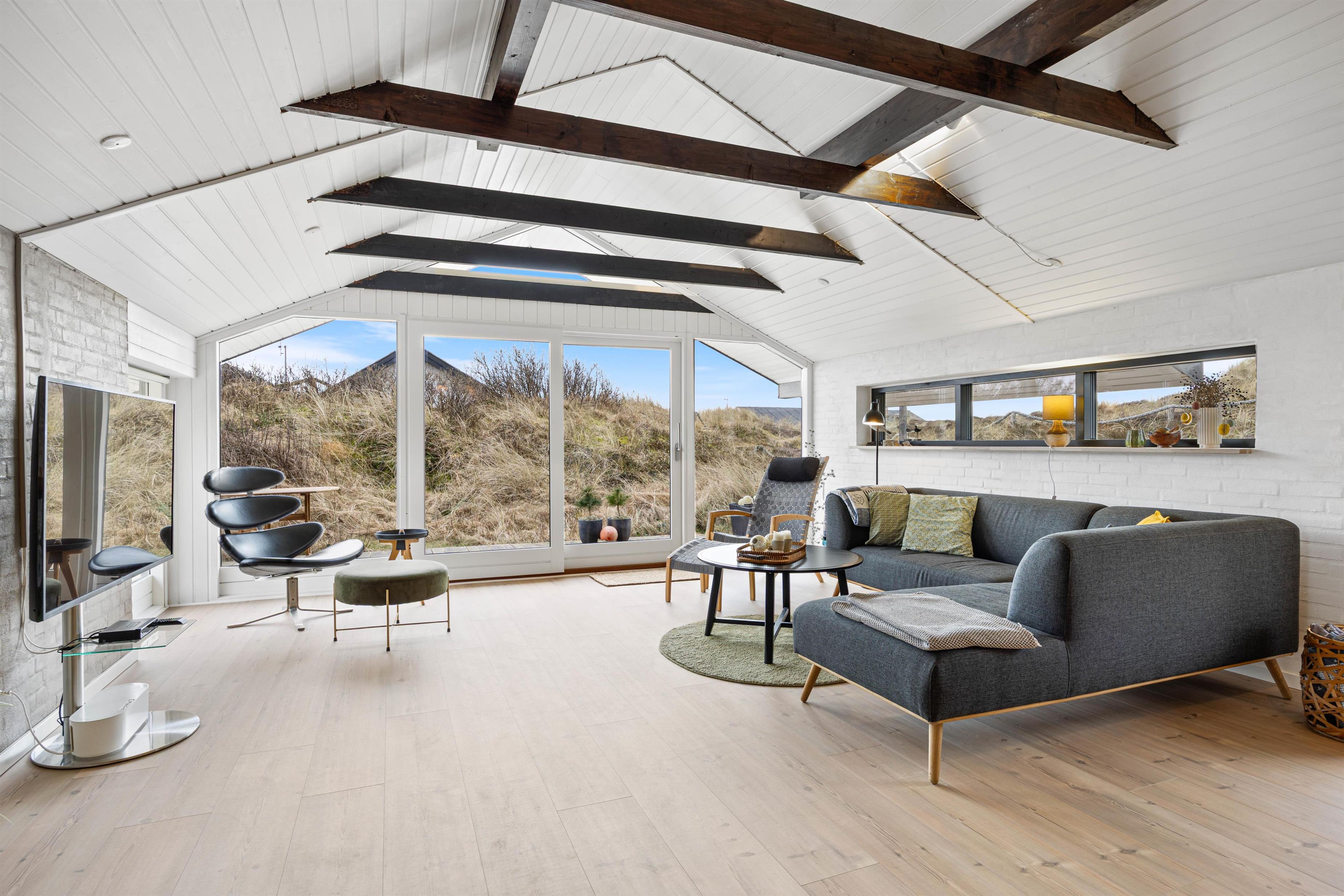 Sommerhuset er på 123 m2. Det moderne køkken med blandt andet nespresso maskine, vinkøleskab, opvaskemaskine og mikroovn samt Philips Hue ligger i åben forbindelse med den hyggelige stue, der er smagfuldt indrettet med møbler, der fint går i tråd med de buede lyse trælofter, de synlige mørkere bjælker, de hvide vægge og den rå murstensvæg, der giver stuen et rustikt og hyggeligt udtryk.