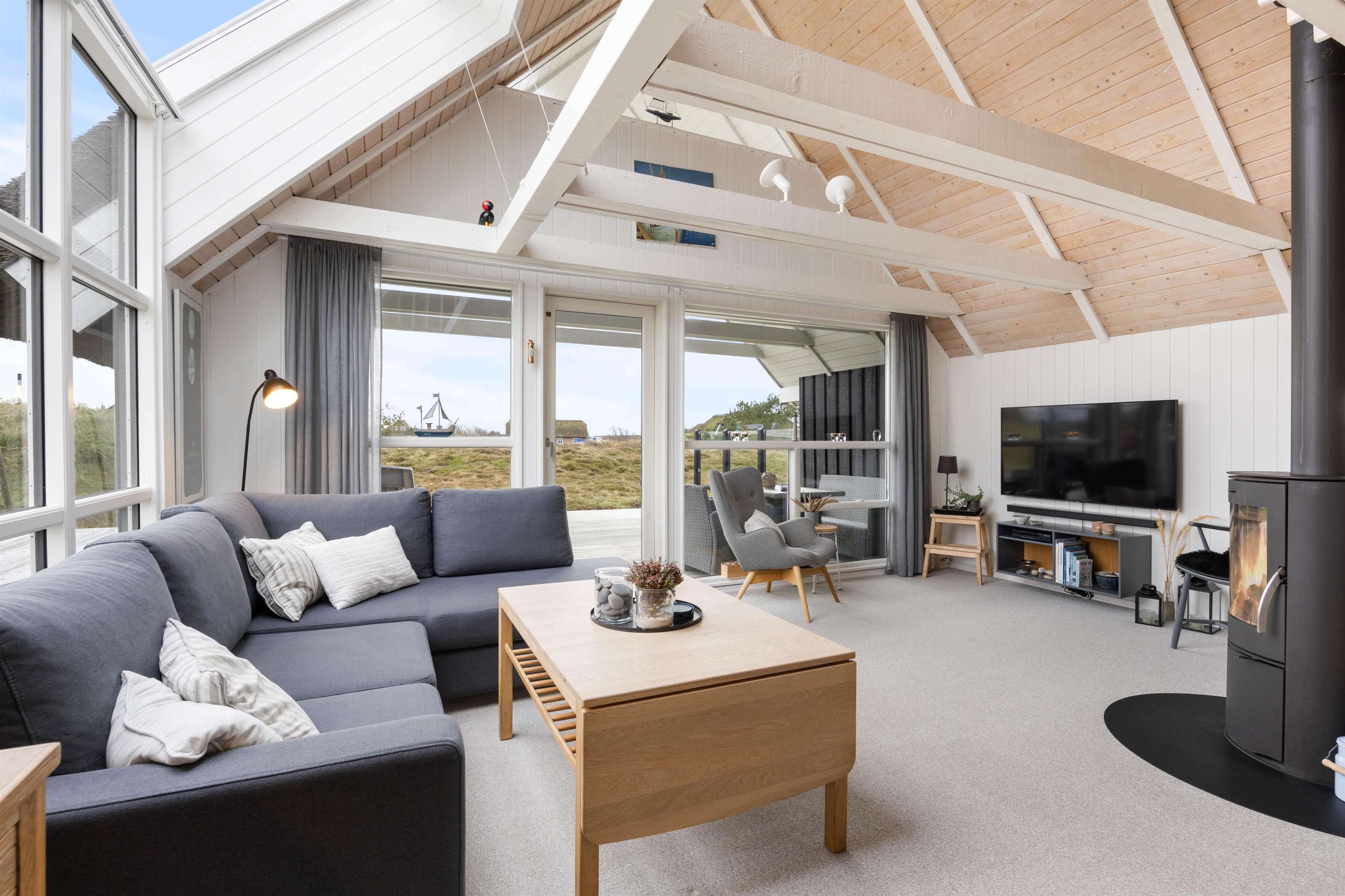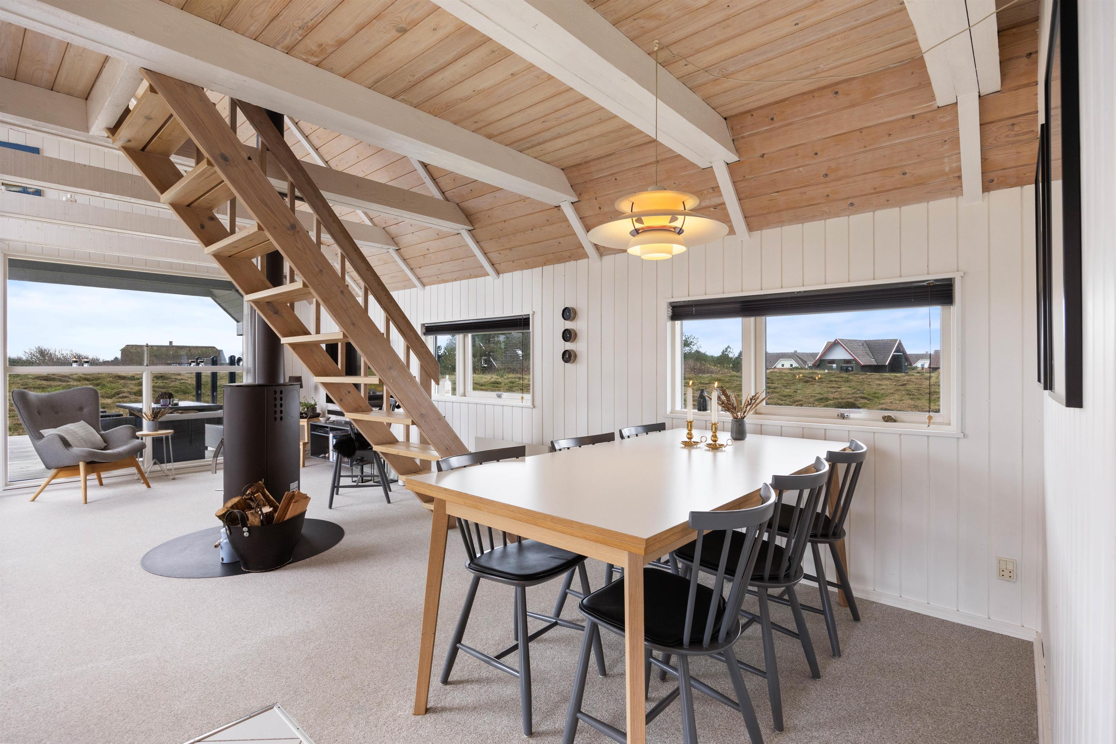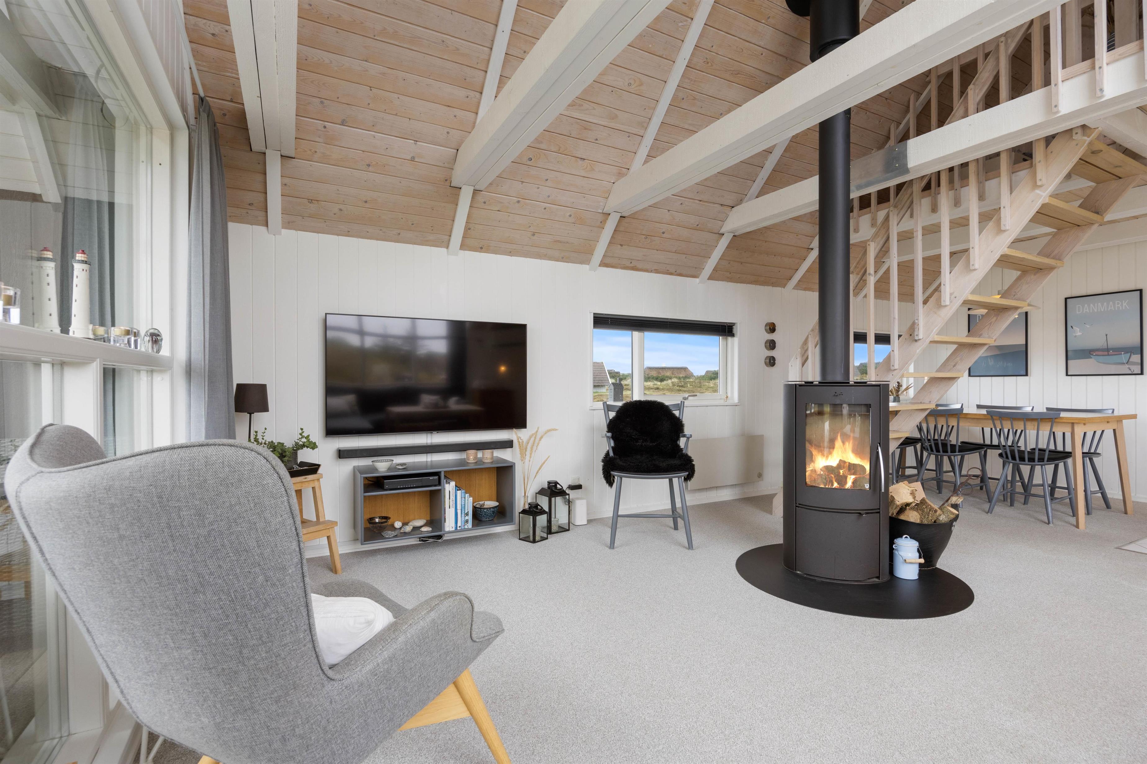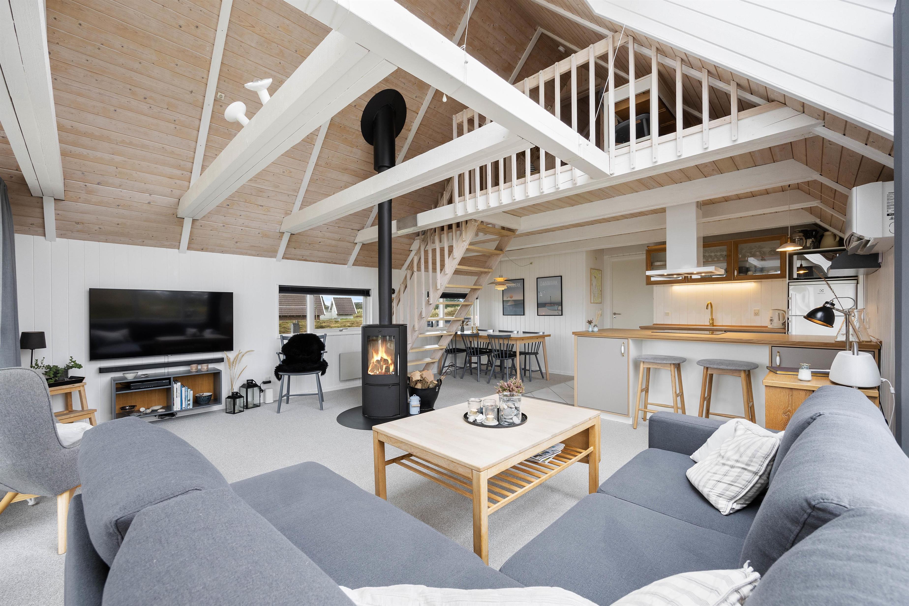 Køkkenet er lyst og velindrettet med opvaskemaskine i åben forbindelse med det skønne opholdsrum. Centrum i stuen er den flotte brændeovn, som kan varme hele rummet op på en kølig dag. Ligemeget hvor du befinder dig i stuen, har du udsigt til det smukke landskab, gennem de mange glaspartier. Her er åbent til kip og ovenlysvinduer, hvilket yderligere forstærker fornemmelsen af at være midt i naturen. Her er også en varmepumpe, som sørger for en behagelig temperatur.