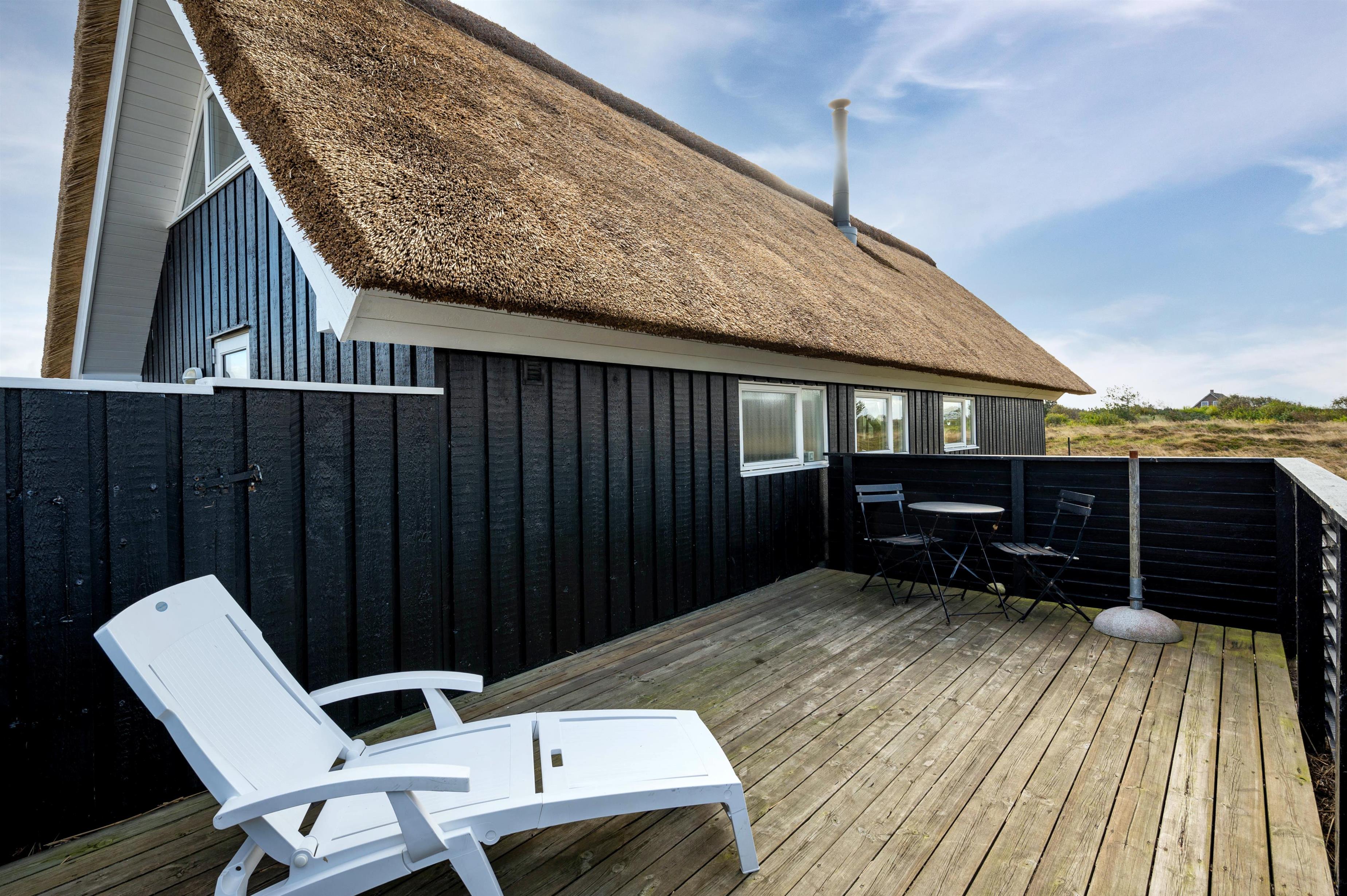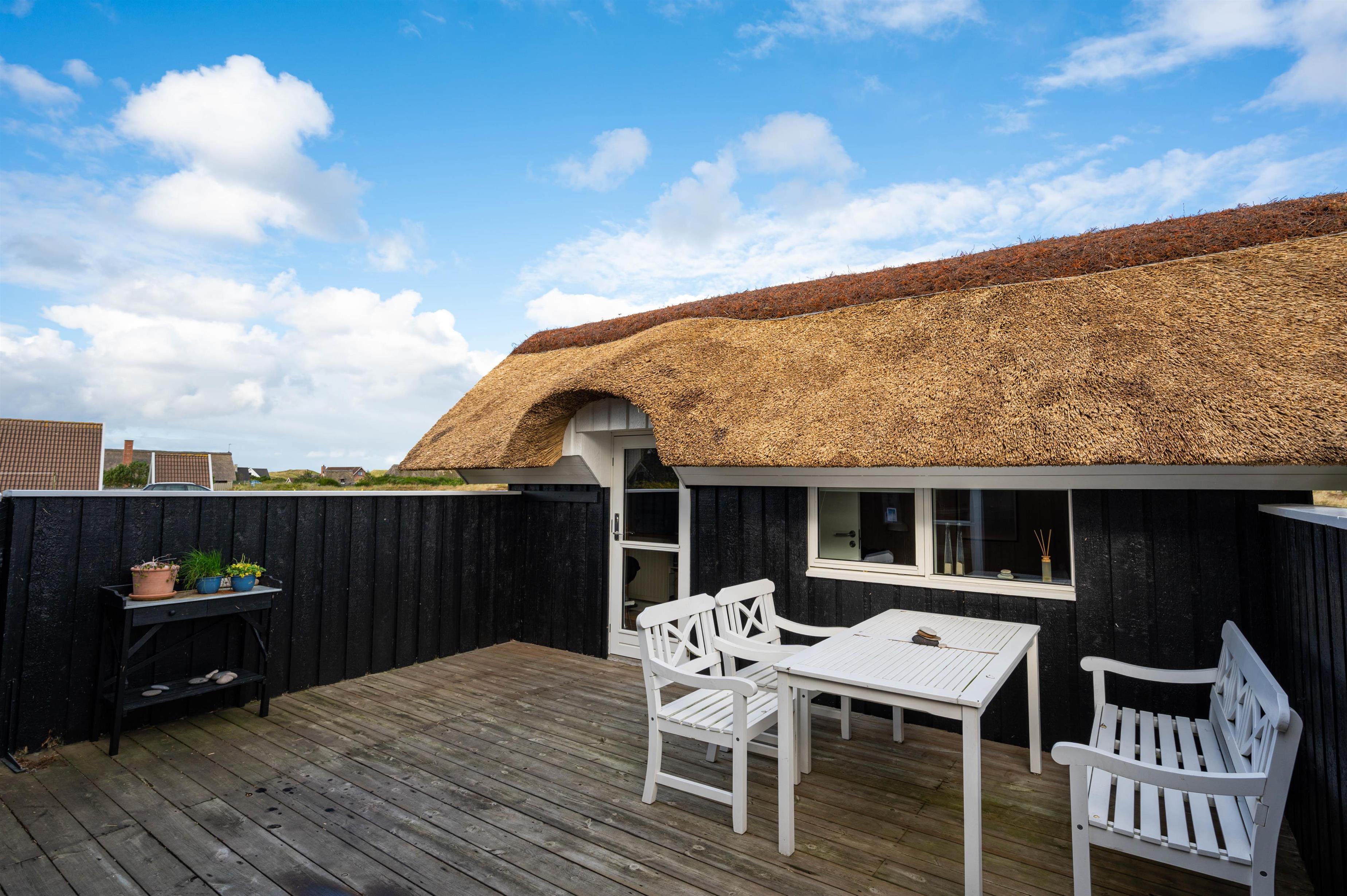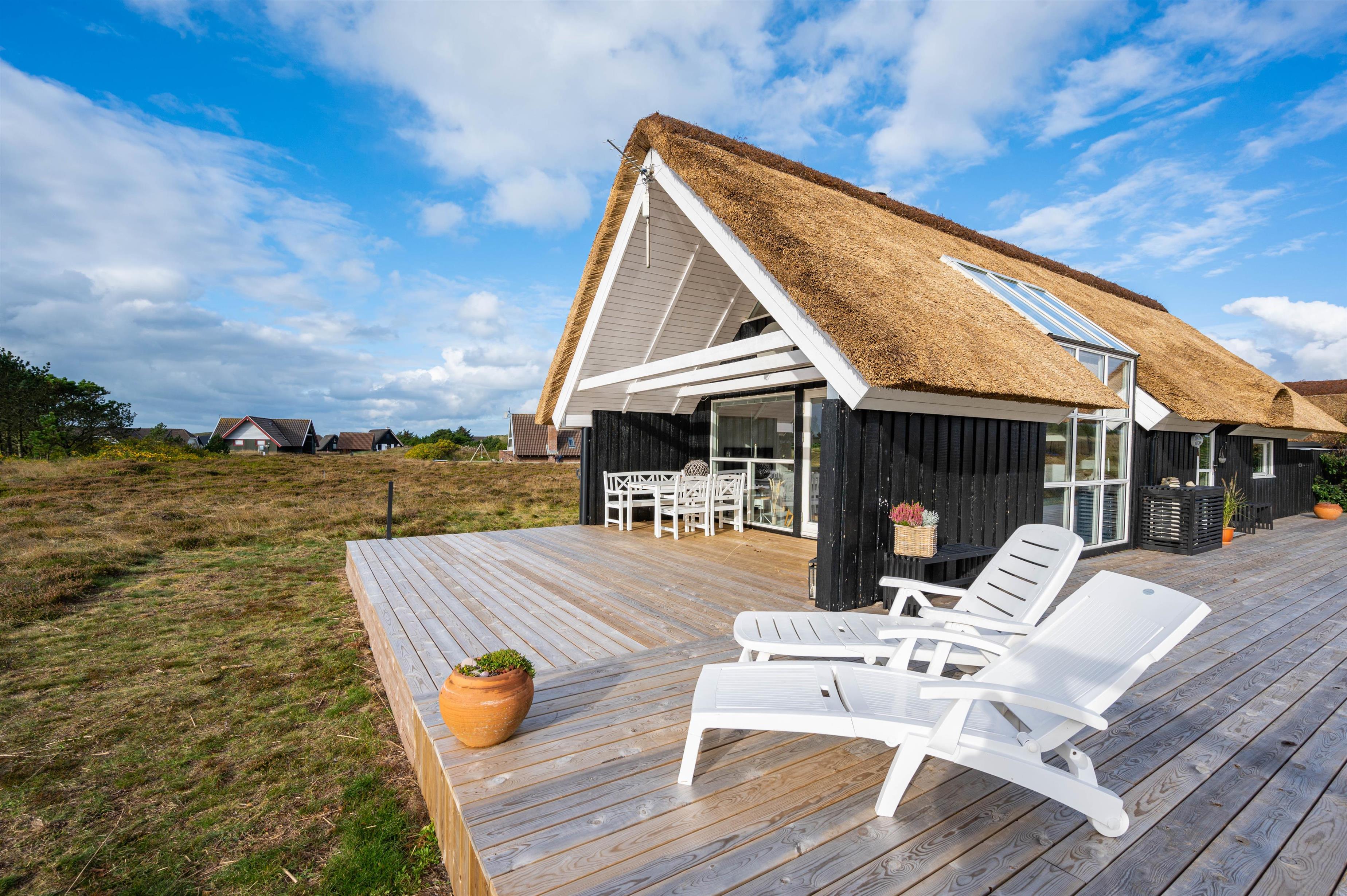 Dette charmerende og velindrettede sommerhus med stråtag ligger i Bjerregård, ca. 15 kilometer syd for Hvide Sande. Her er skønt at være, såvel inde som ude. Feriehuset ligger på en stor naturgrund, og fra stuen er der en dejlig udsigt til den smukke natur. På en blæsende dag, finder du læ enten i den hyggelige, lille gårdhave eller på en af de fine terrasser.