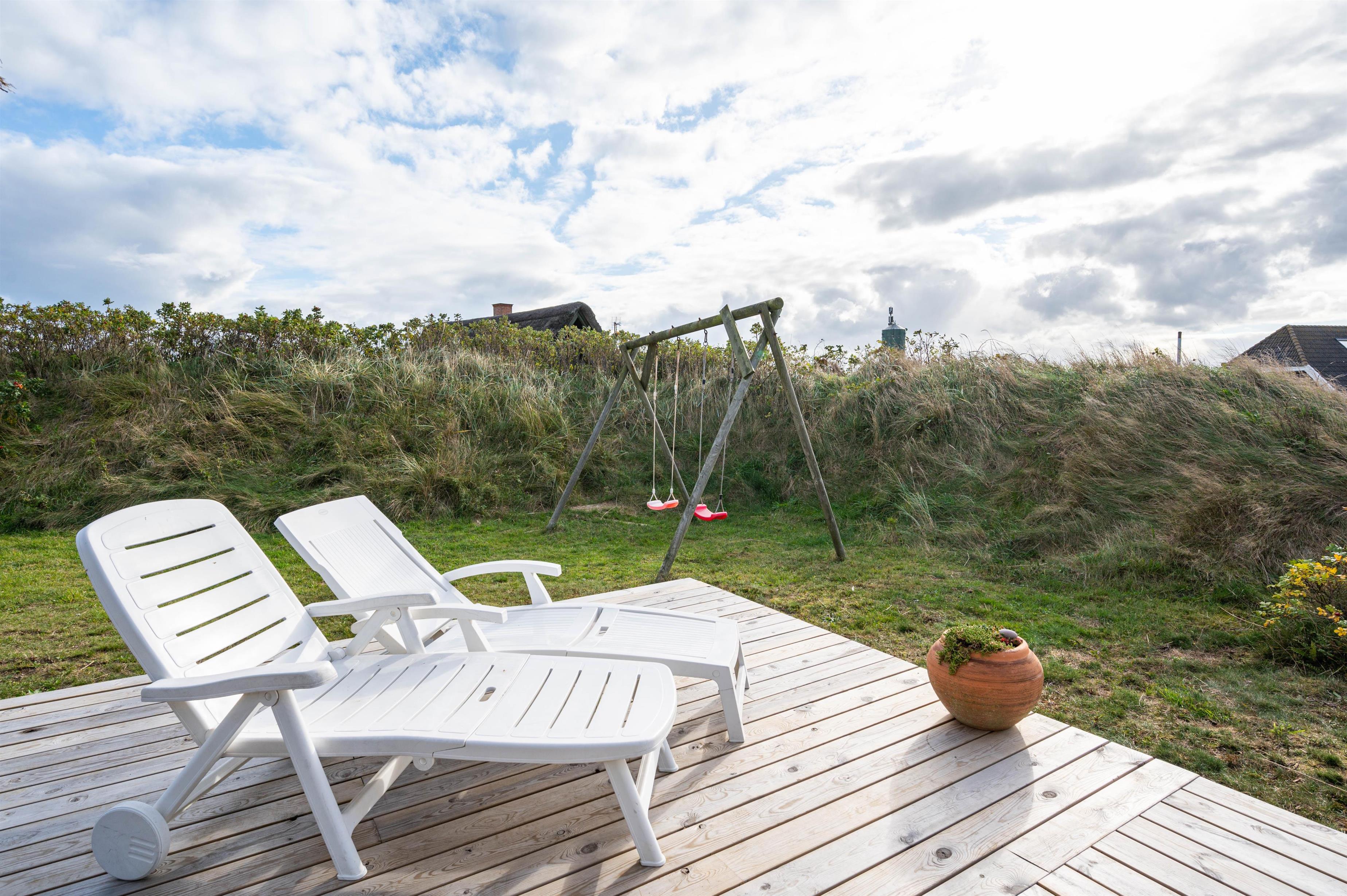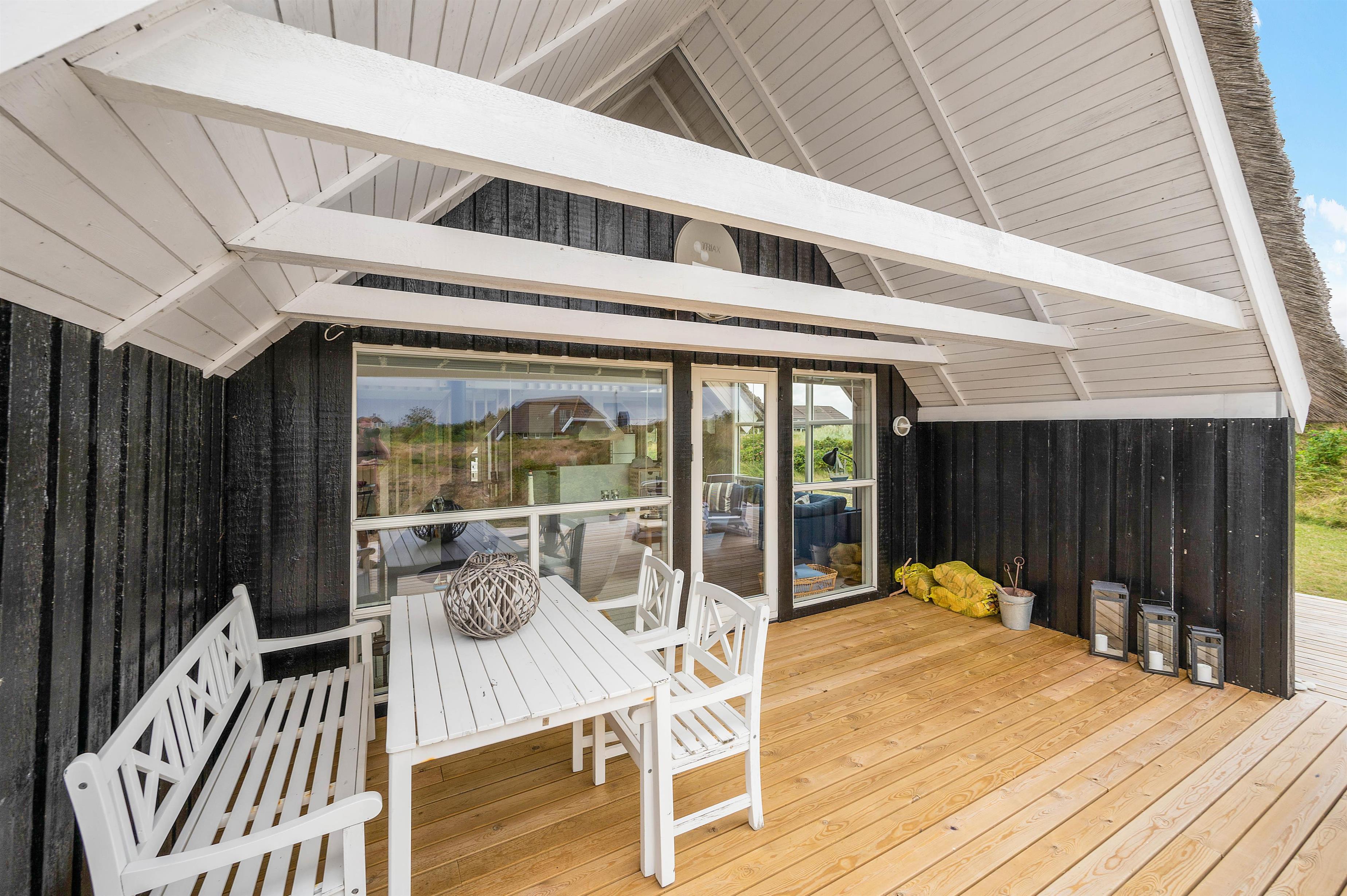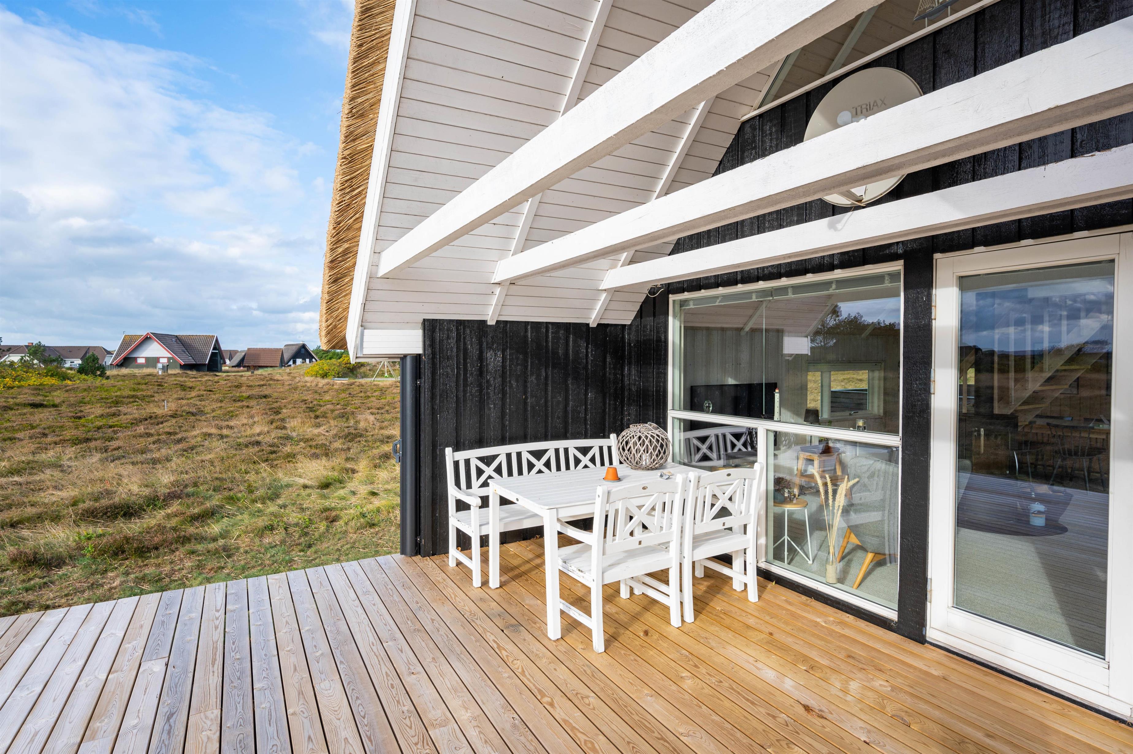 Dette charmerende og velindrettede sommerhus med stråtag ligger i Bjerregård, ca. 15 kilometer syd for Hvide Sande. Her er skønt at være, såvel inde som ude. Feriehuset ligger på en stor naturgrund, og fra stuen er der en dejlig udsigt til den smukke natur. På en blæsende dag, finder du læ enten i den hyggelige, lille gårdhave eller på en af de fine terrasser.