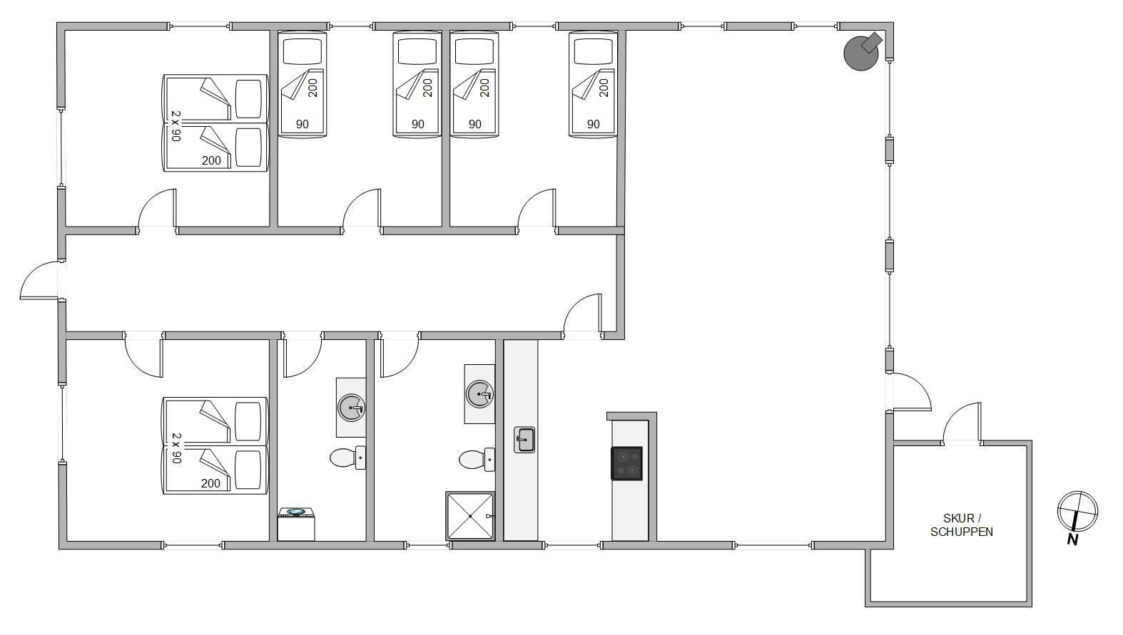 Med 4 soverum, bad og gæste-wc egner sommerhuset sig både til den større familie – måske sammen med bedsteforældrene - og til ferien med 2 familier. De praktiske detaljer som opvaskemaskine i køkkenet og et vasketårn i badeværelset gør det dejligt nemt at slappe af. Håndklæder og børnetøj er således hurtigt rene og friske igen til næste dags tur til stranden.