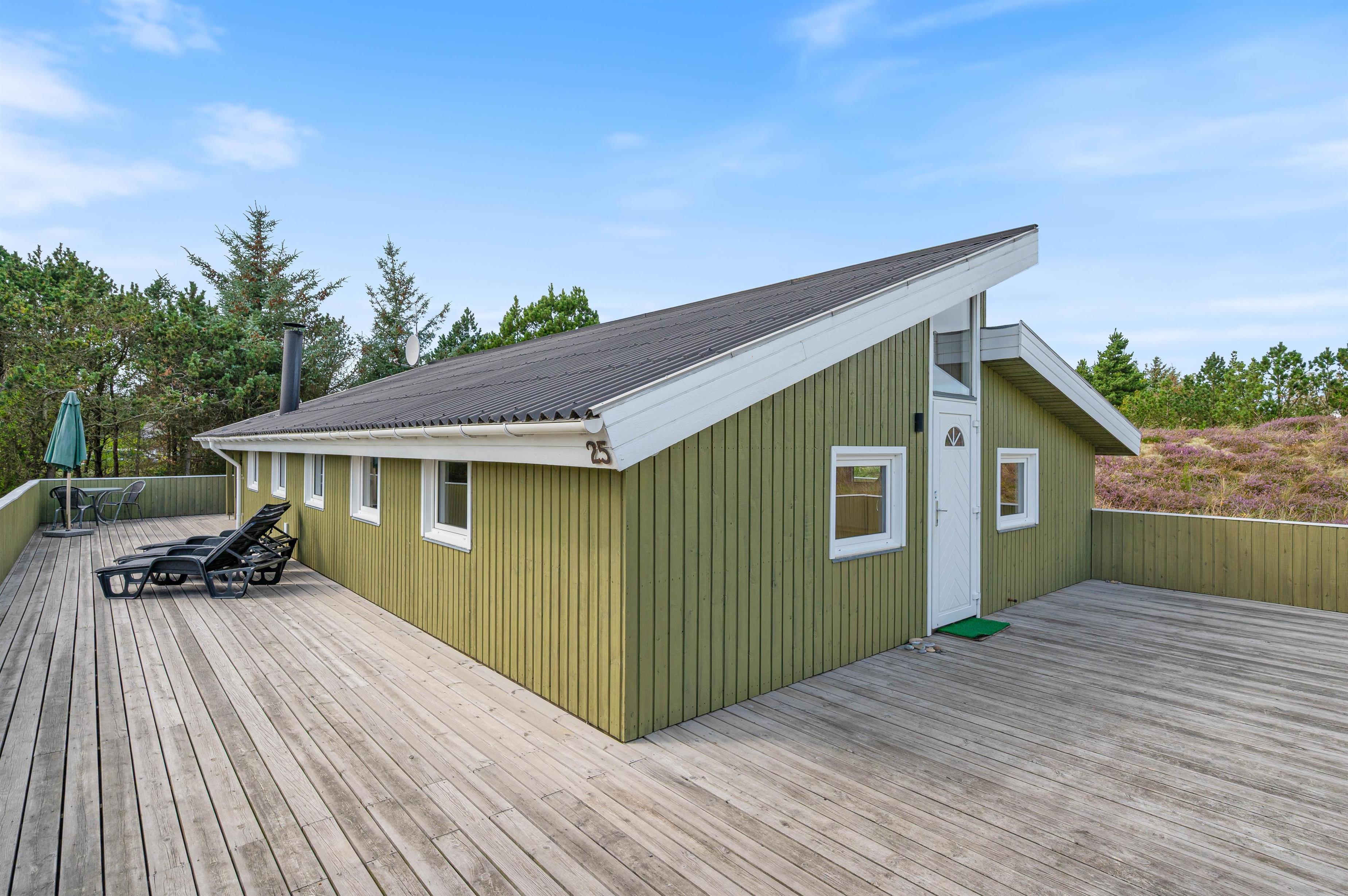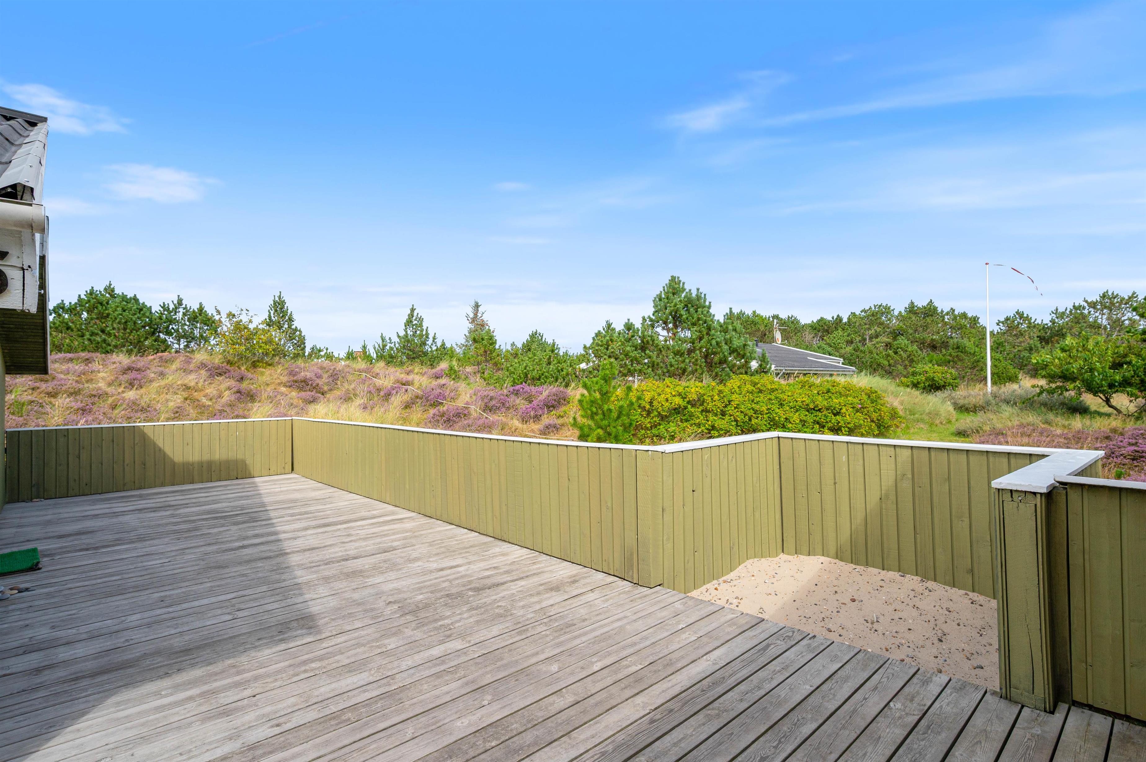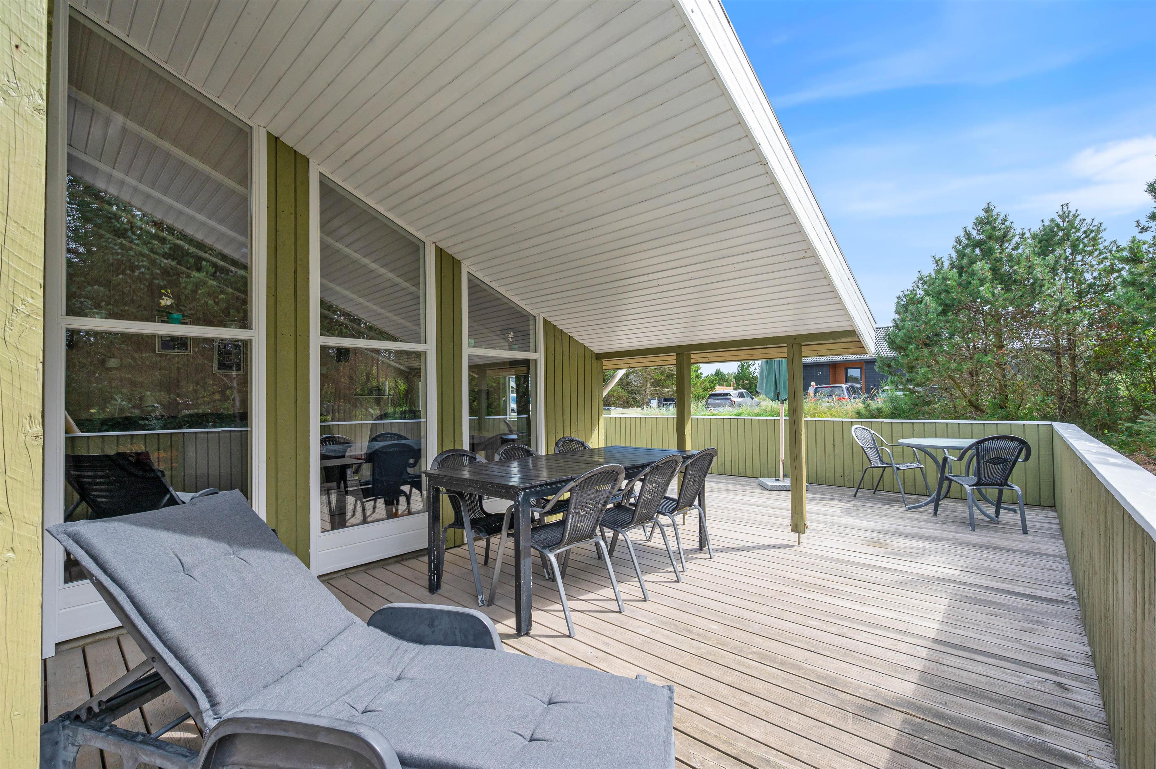 Til feriehuset på Bjerregårdsvej 25 hører en usædvanlig dejlig terrasse. Den er helt aflukket, så I sagtens kan lade småbørn stavre rundt på egen hånd. Terrassen strækker sig omkring tre af feriehusets fire sider og det er storset altid muligt for at finde et dejligt sted med læ. Og skulle den danske sommer vise sig fra sin drilske side, har terrassen også en god hyggekrog med halvtag og afskærmning, så I kan sidde i læ og tørvejr og stadig nyde en hyggelig grillaften.