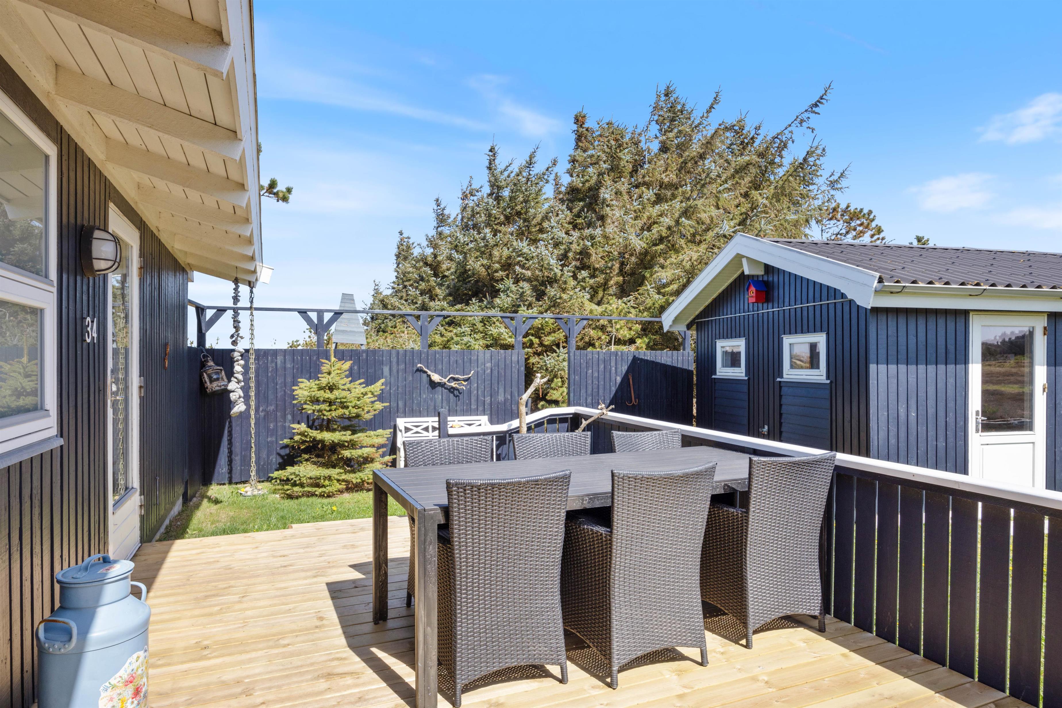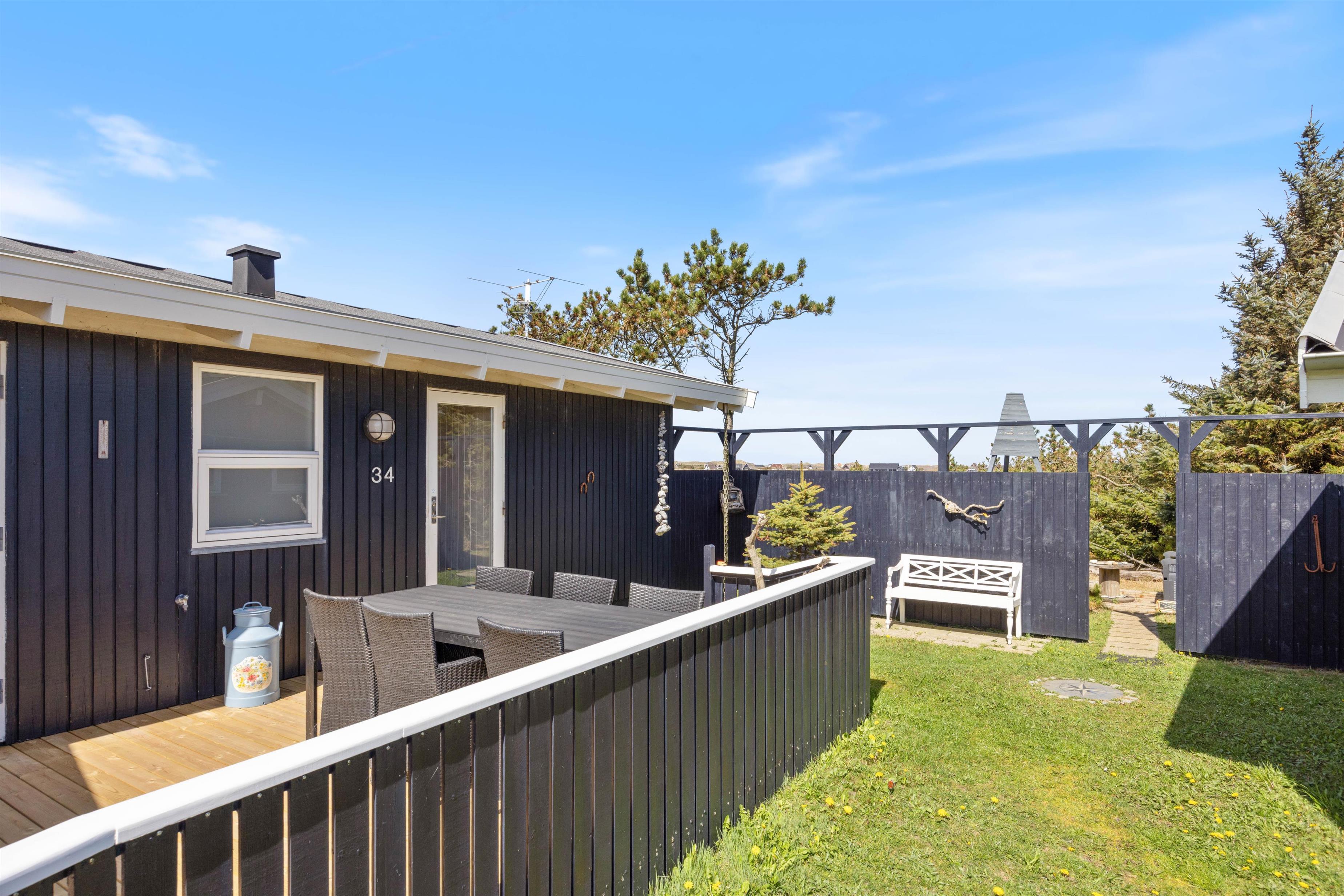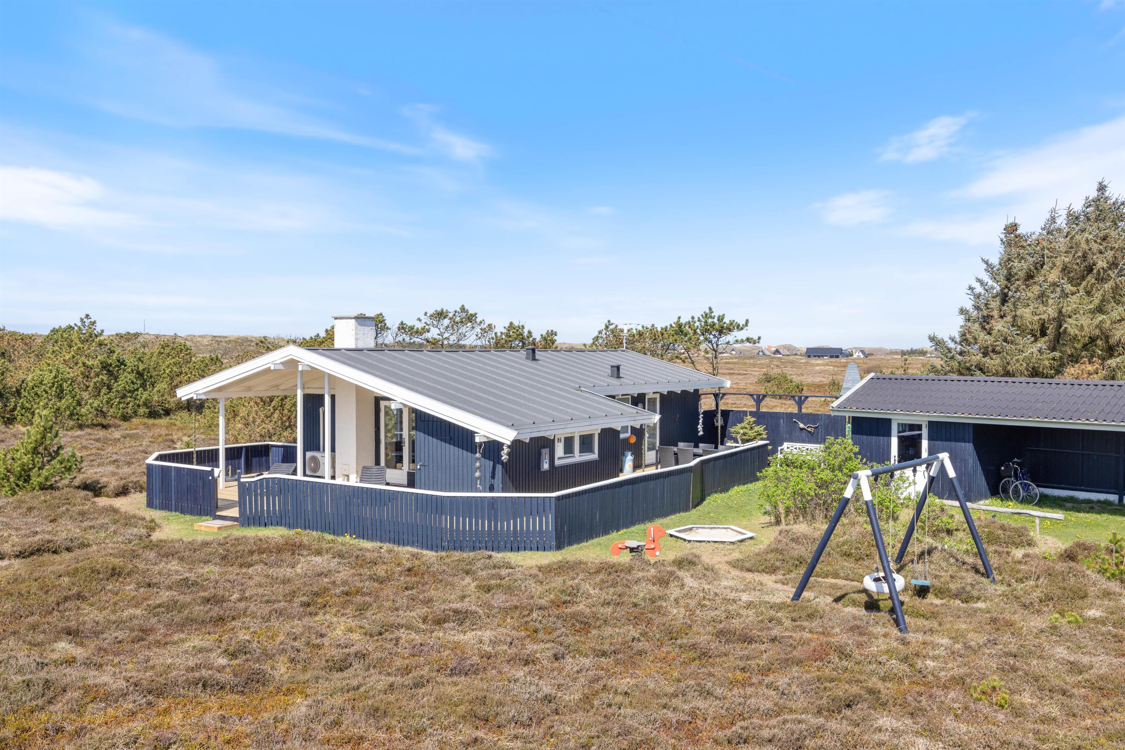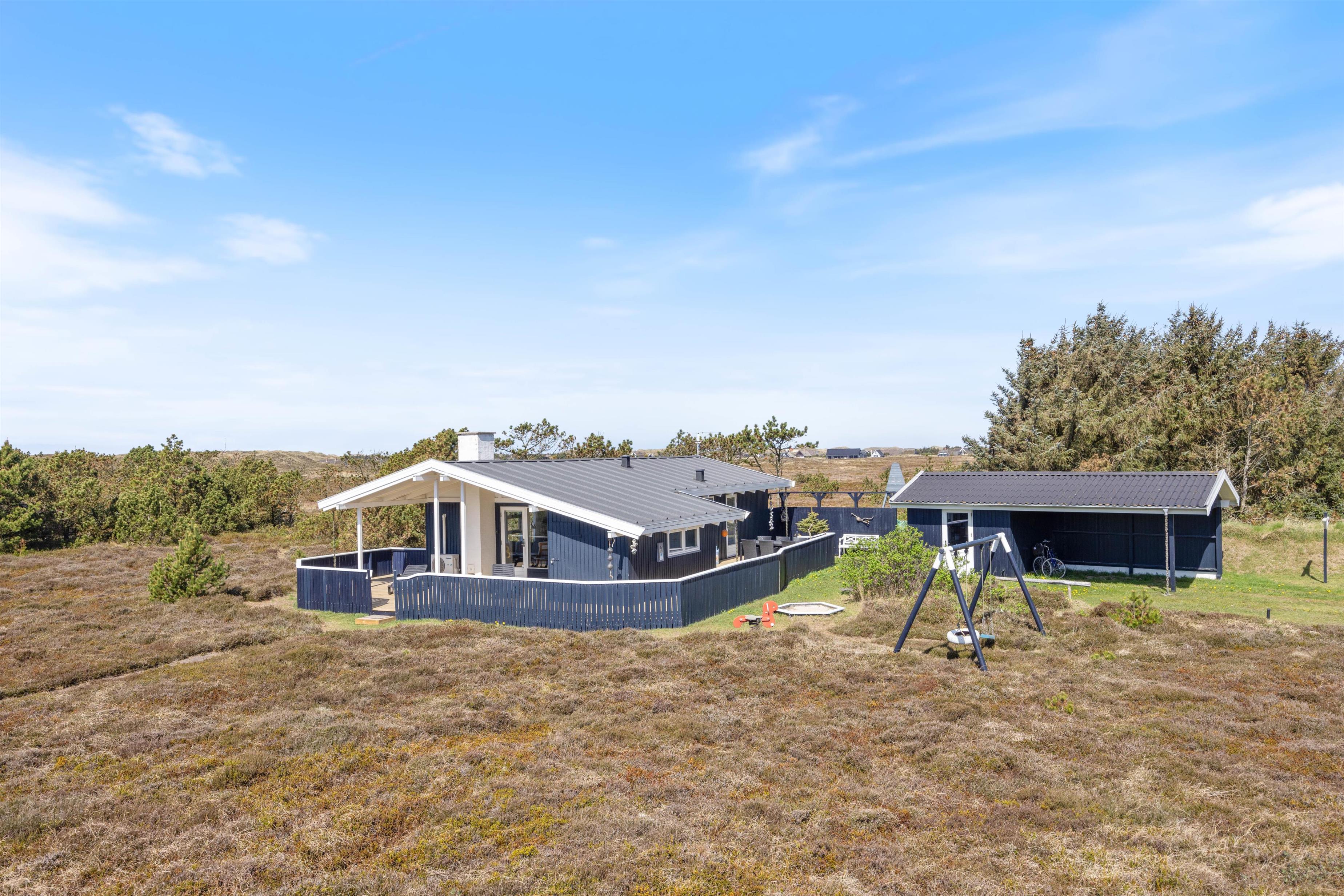 Blåbærheden 34 ligger på en 2500 m2 stor naturgrund og er omgivet af hede og klitter. På tre sider af huset er der en afskærmet og delvist overdækket terrasse, så du altid kan finde et sted at slappe af alt efter solens placering.