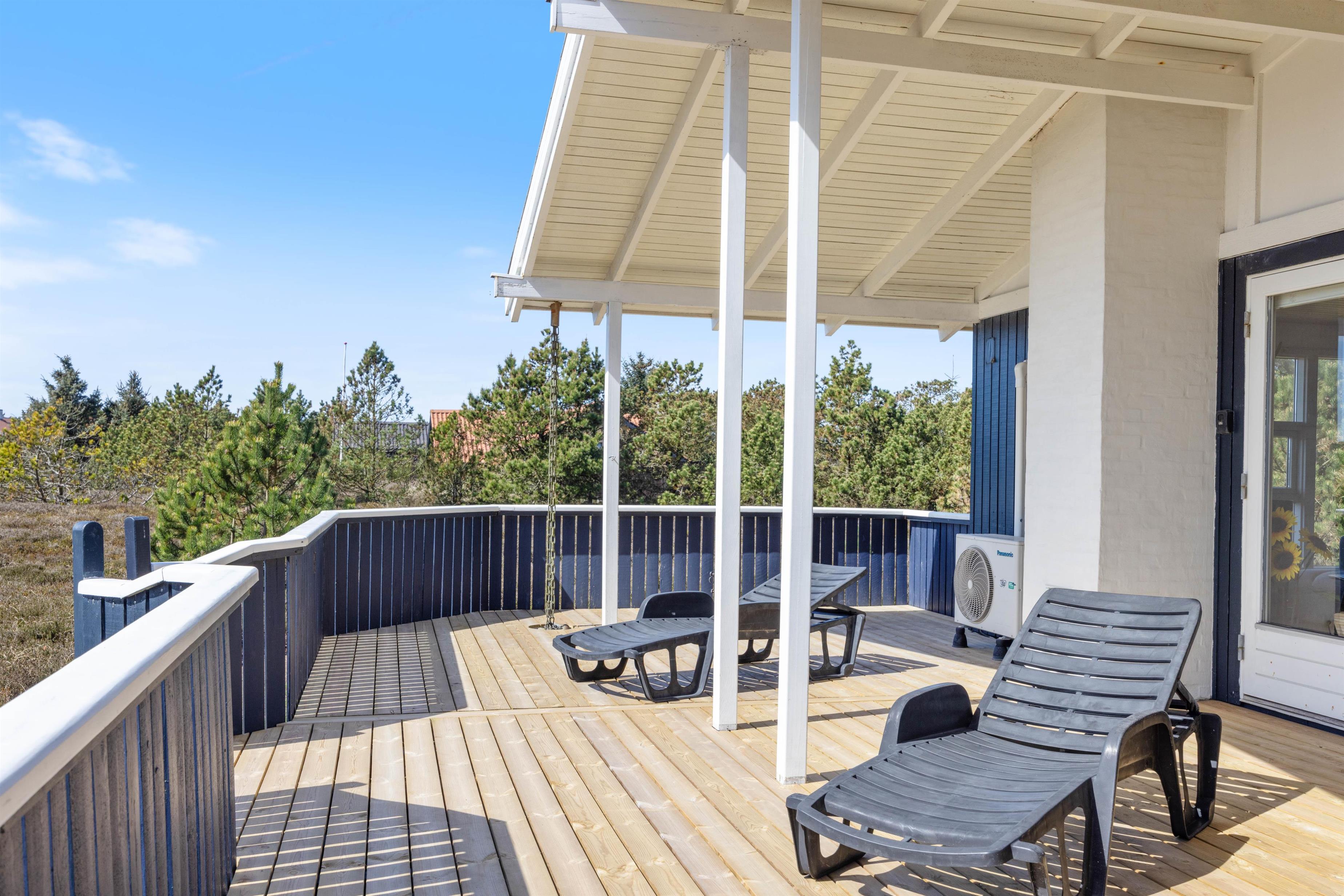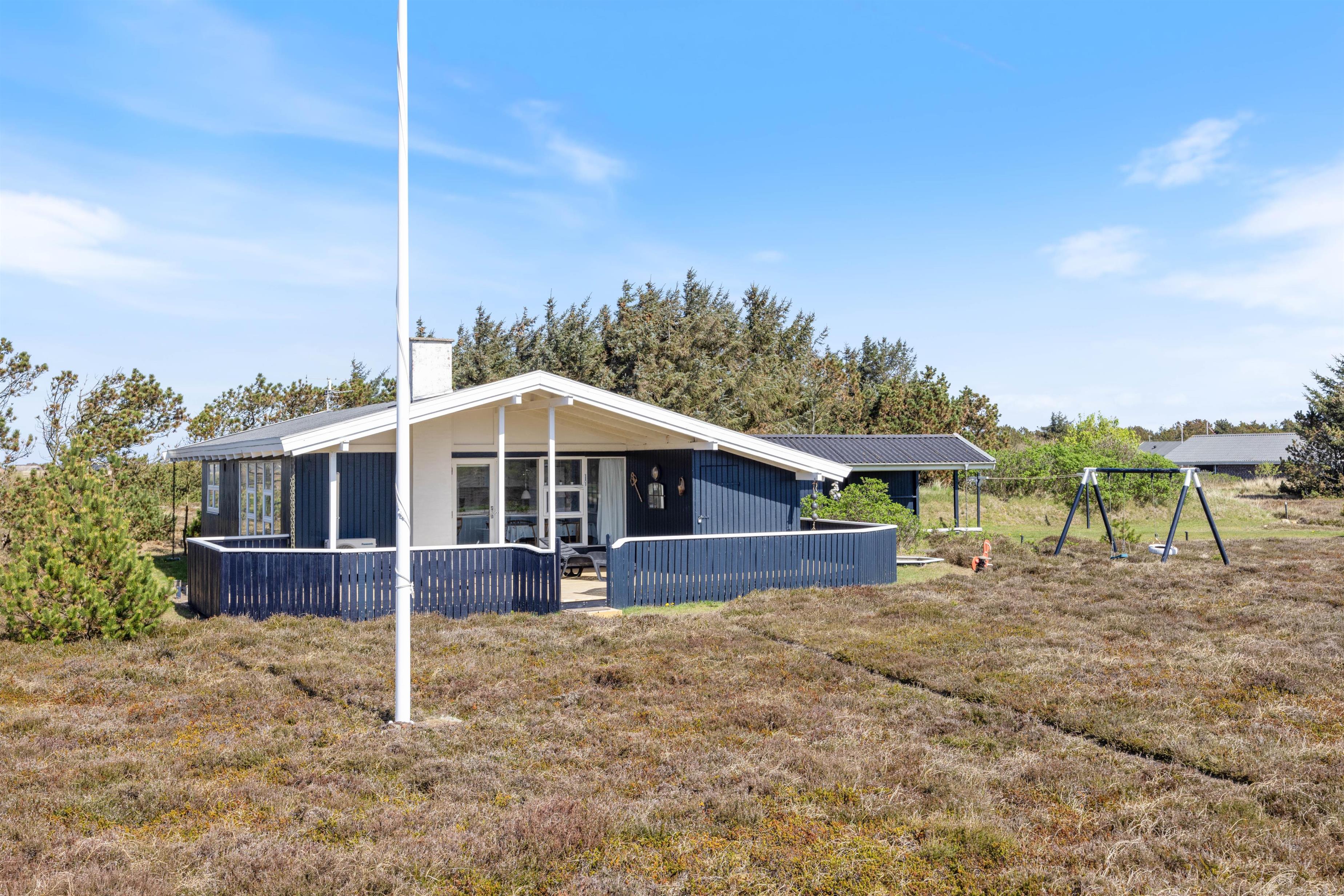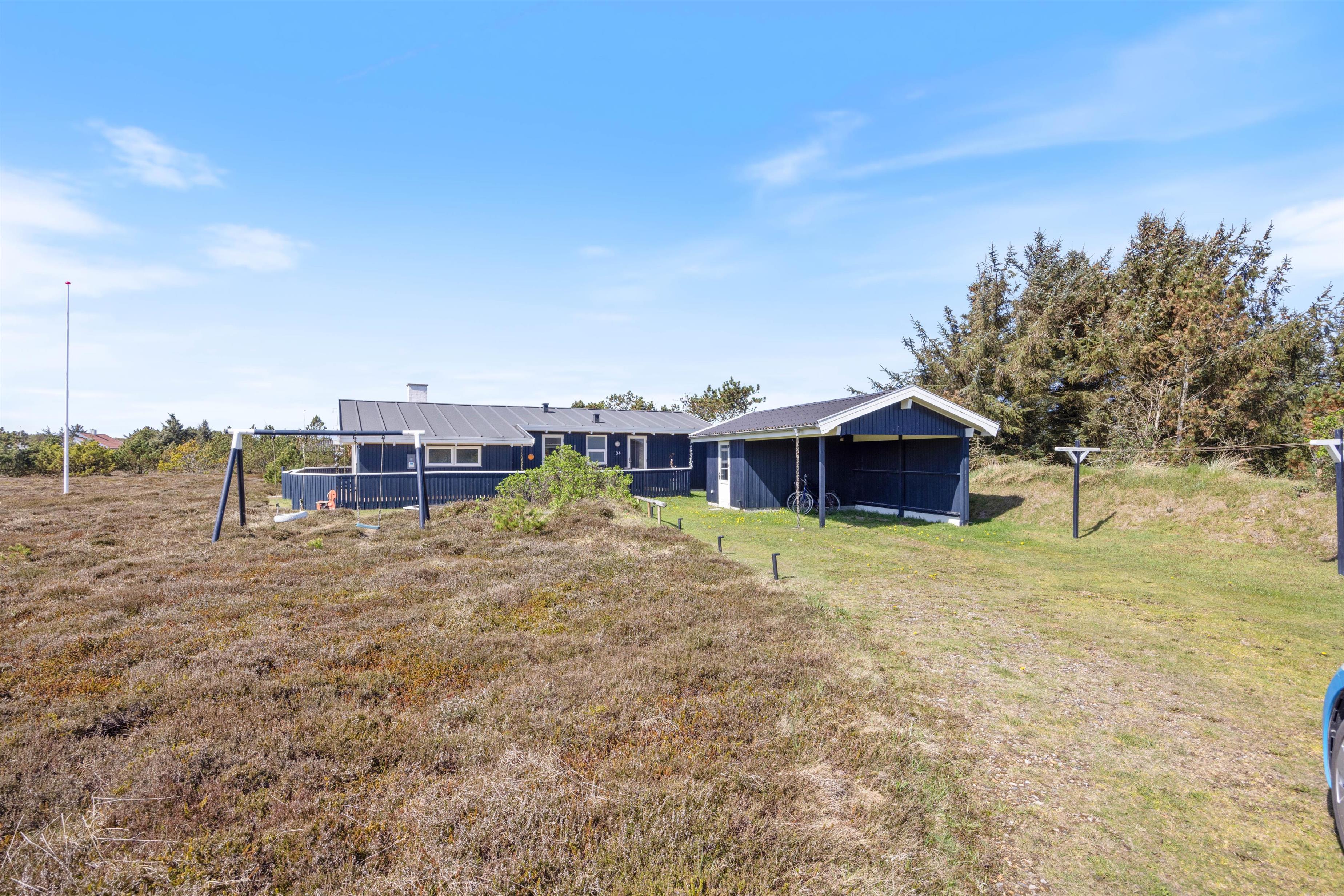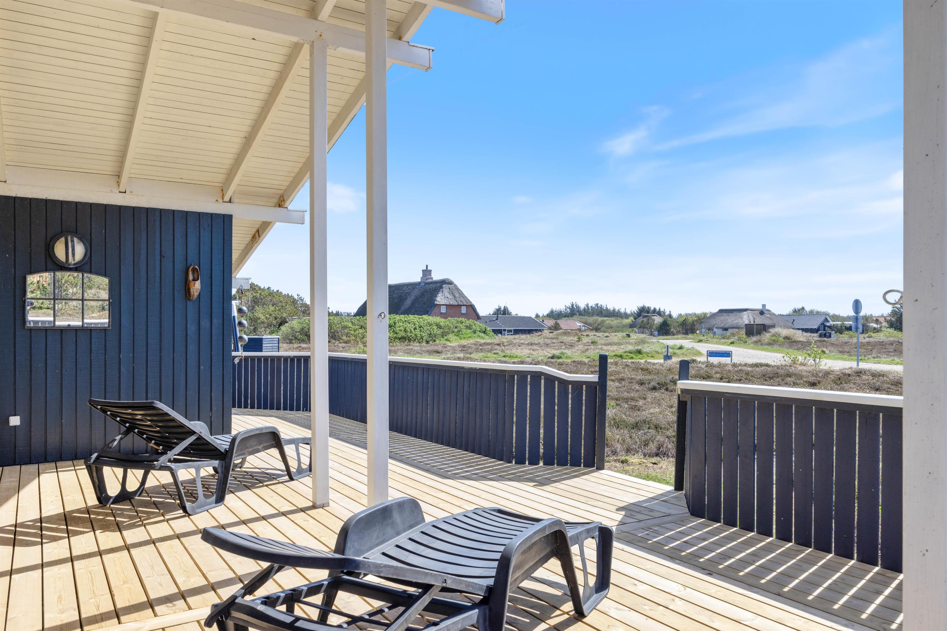 Blåbærheden 34 ligger på en 2500 m2 stor naturgrund og er omgivet af hede og klitter. På tre sider af huset er der en afskærmet og delvist overdækket terrasse, så du altid kan finde et sted at slappe af alt efter solens placering.