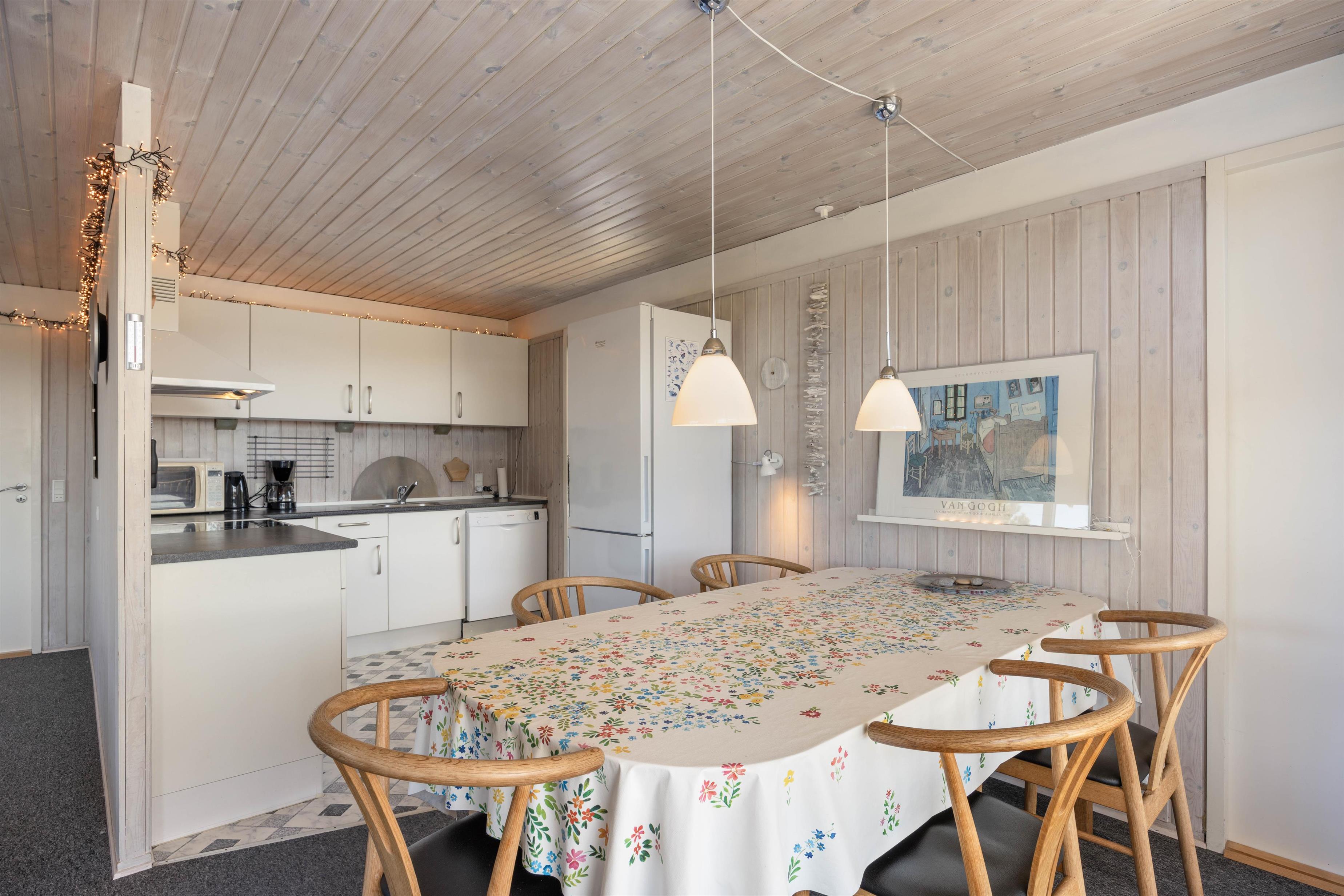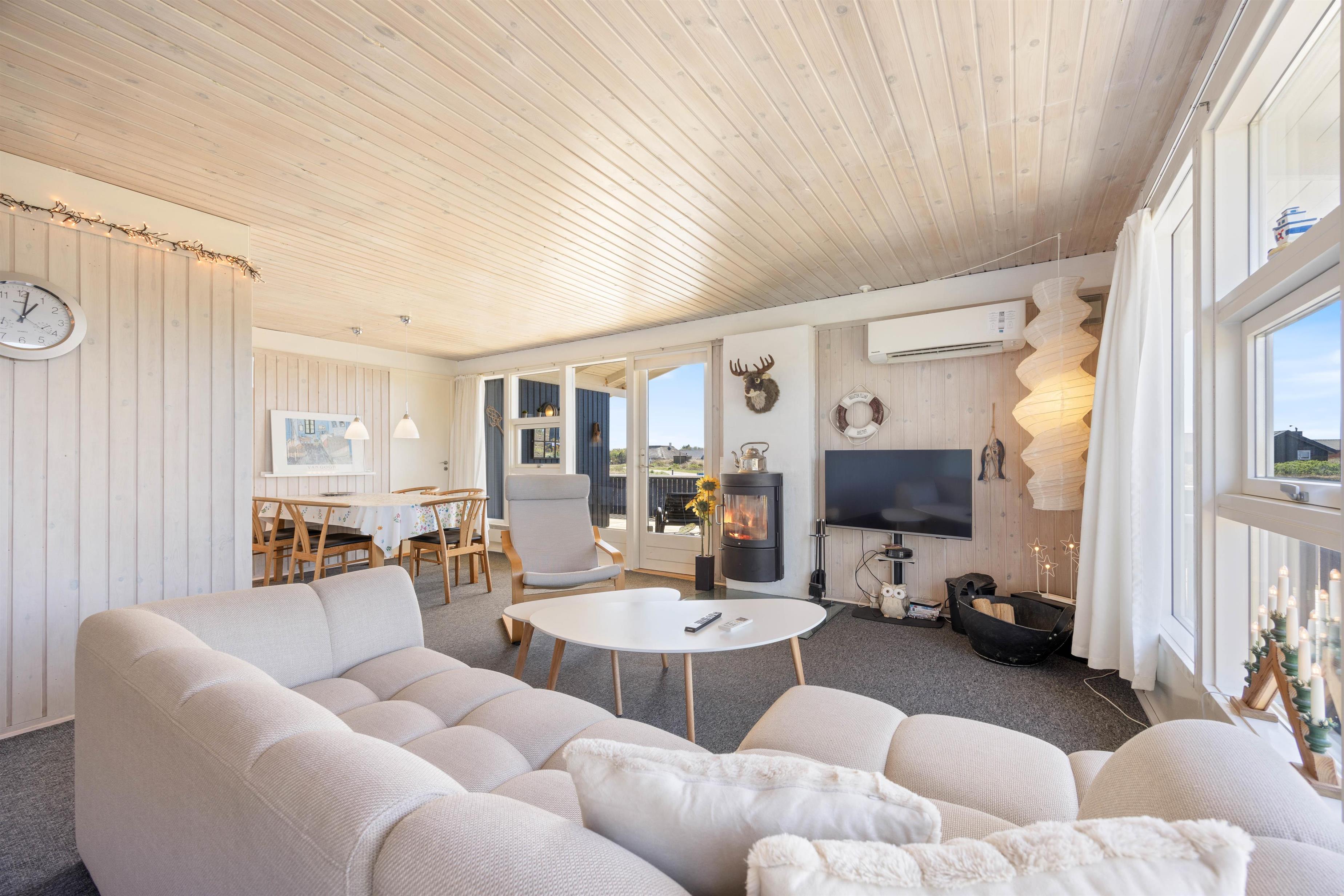 Dette feriehus udstråler hygge. Husets hjerterum er den lyse stue med gulvtæppe, som desuden ligger i forbindelse med det funktionelle køkken. Her er god plads hele familien, hvad end I vil hygge jer med en god middag, et brætspil eller holde filmaften med popcorn. Eller sid foran pejsen med en kop varm kakao og en god bog, imens brændeovnen knitrer og skaber varme og glæde.