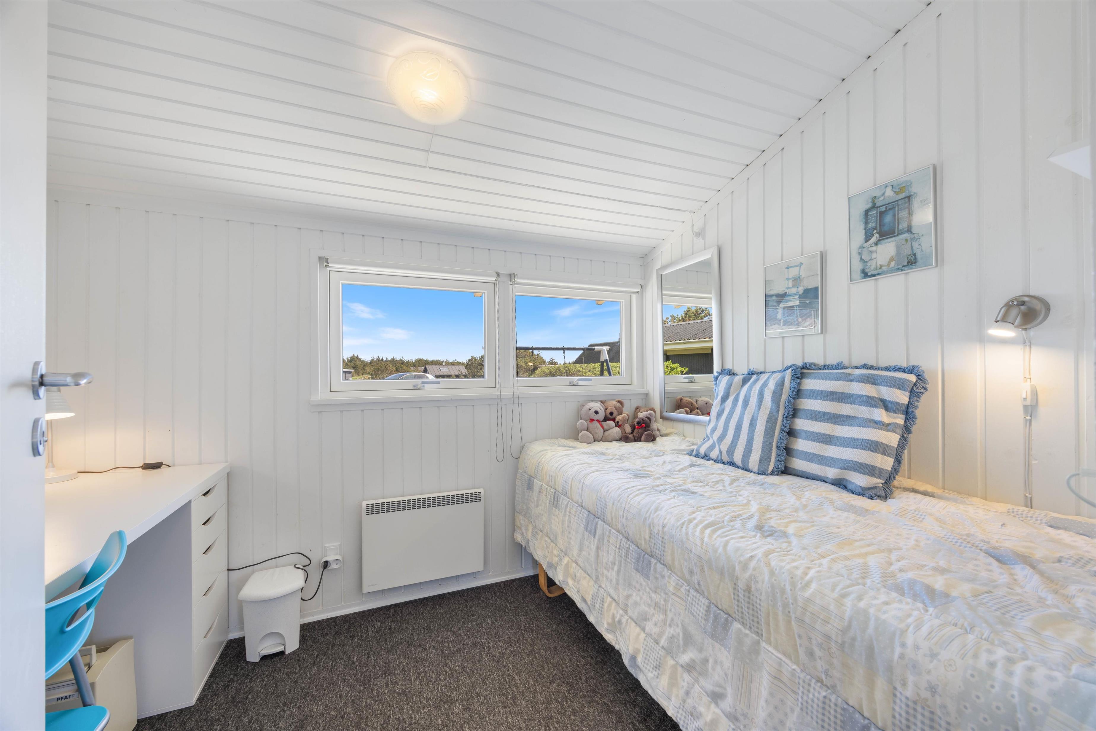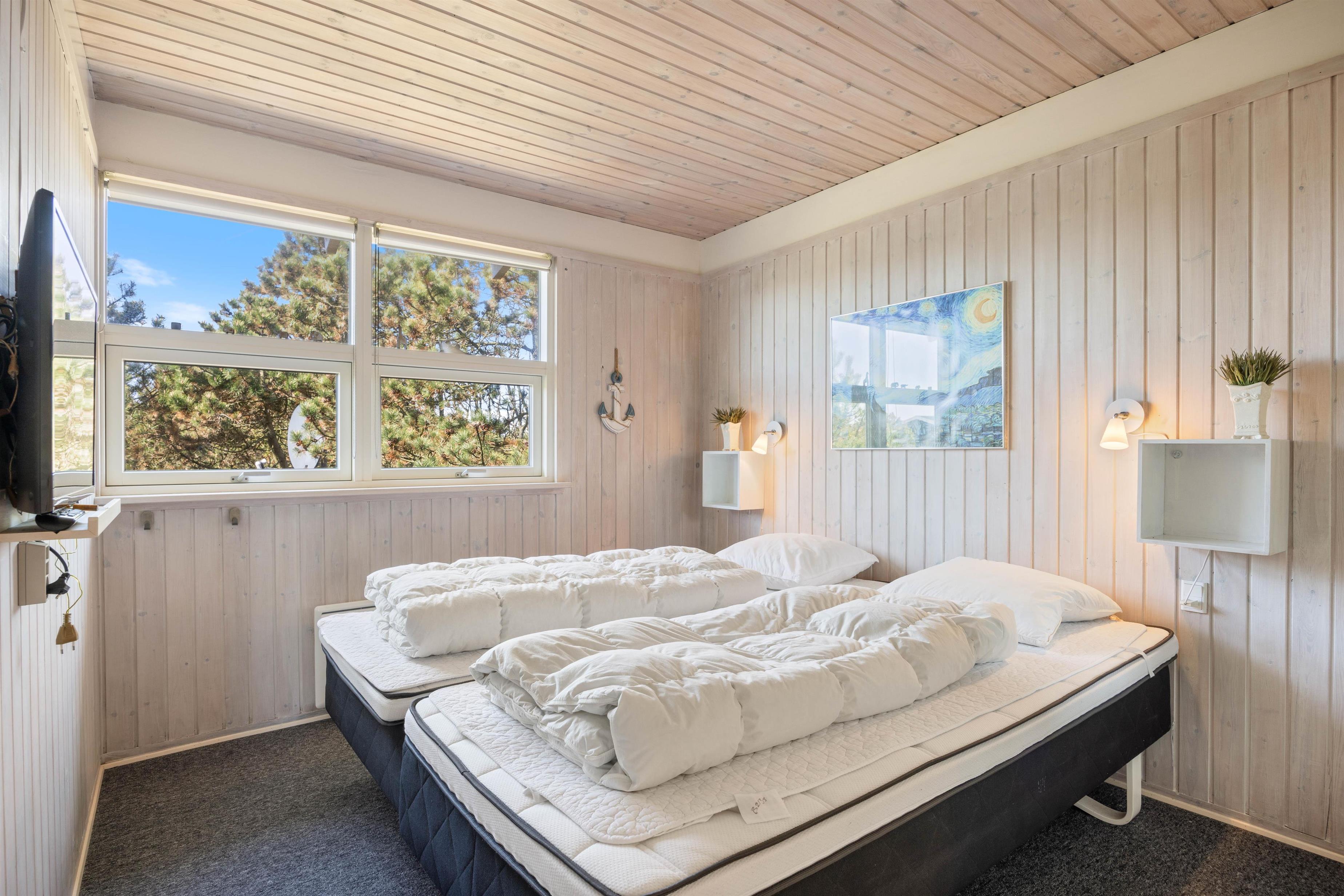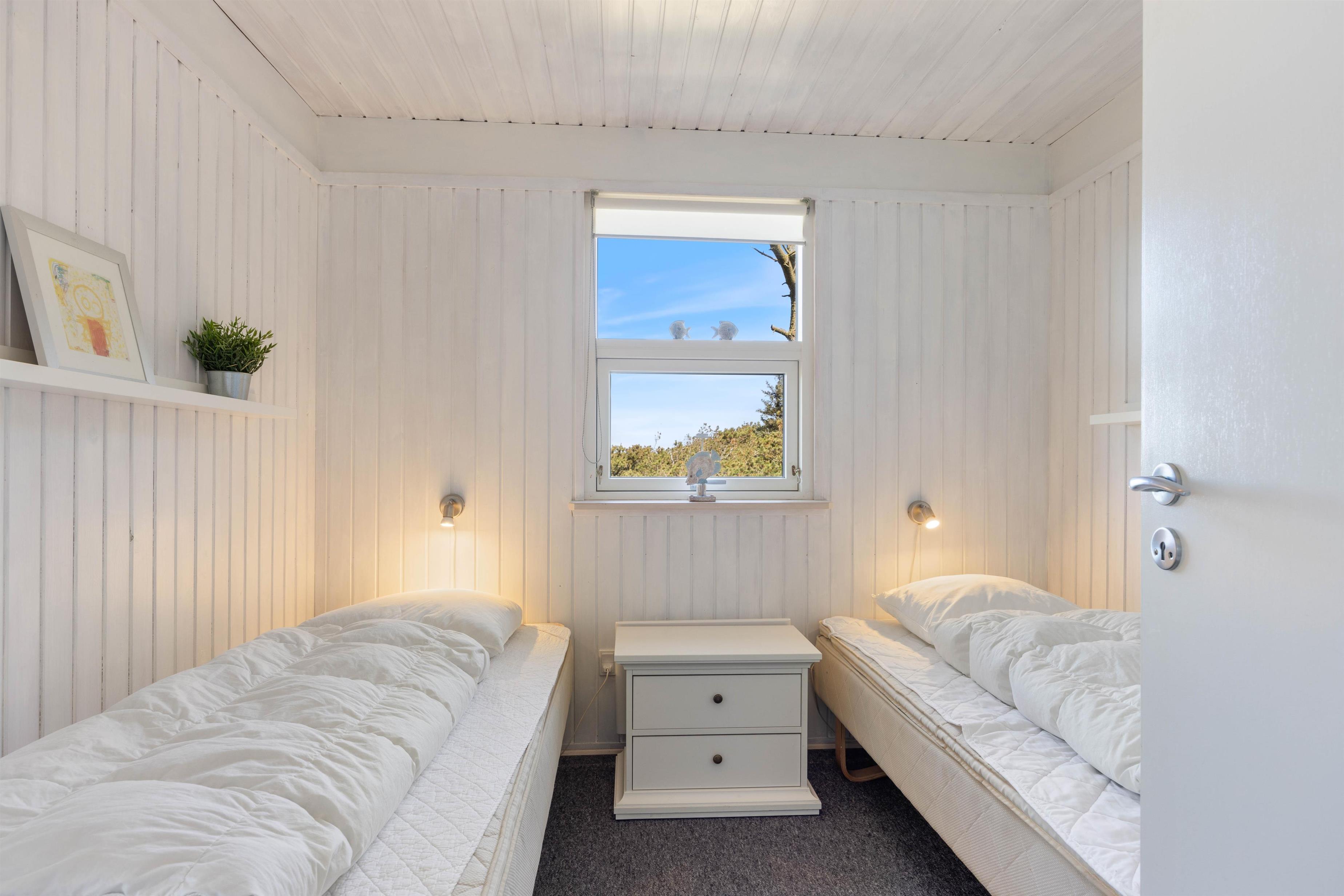 Efter en dejlig dag på den danske vestkyst vil du helt sikkert sove godt i de komfortable senge. Der er et soveværelse med en dobbeltseng og 2 soveværelser med i alt 3 enkeltsenge.