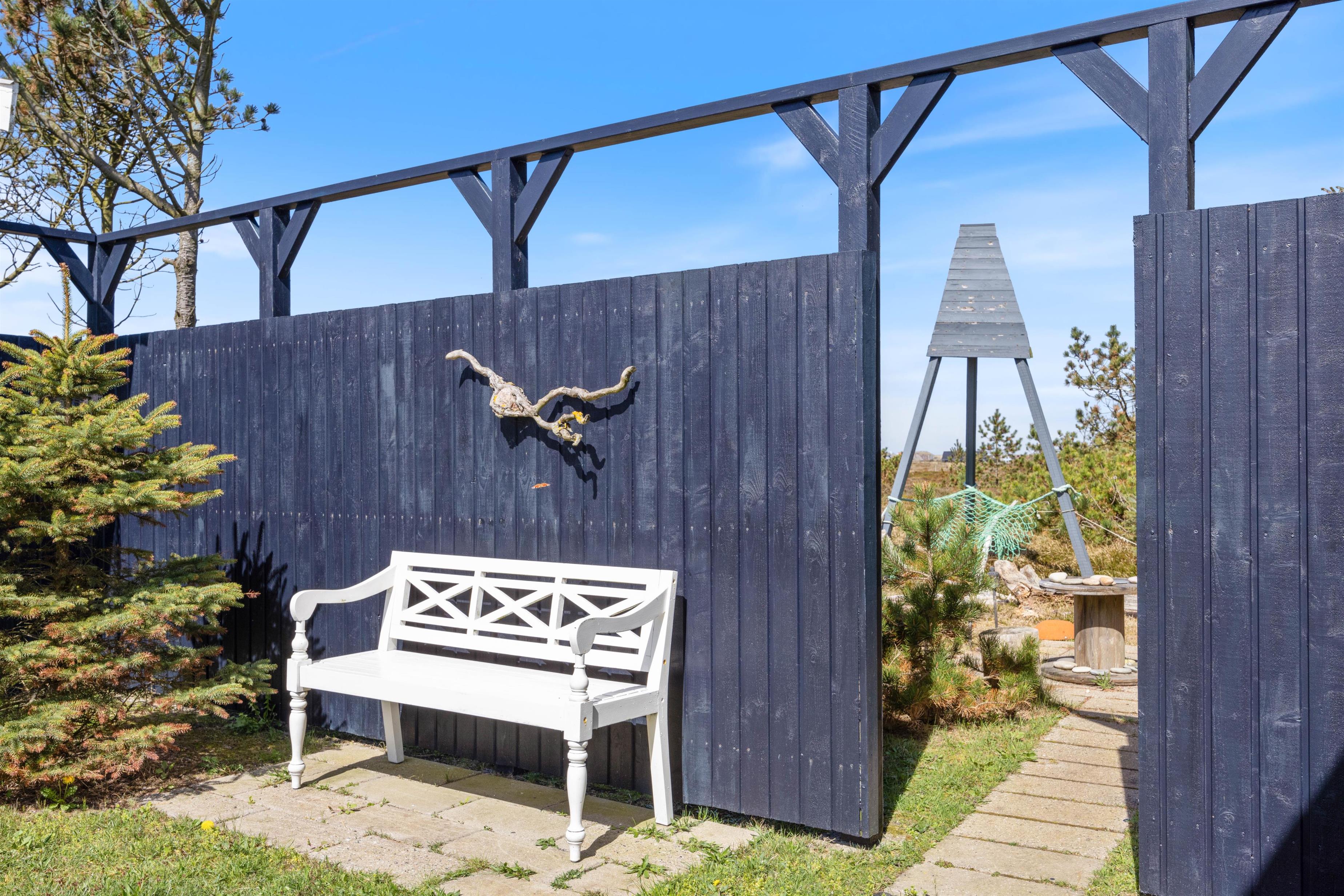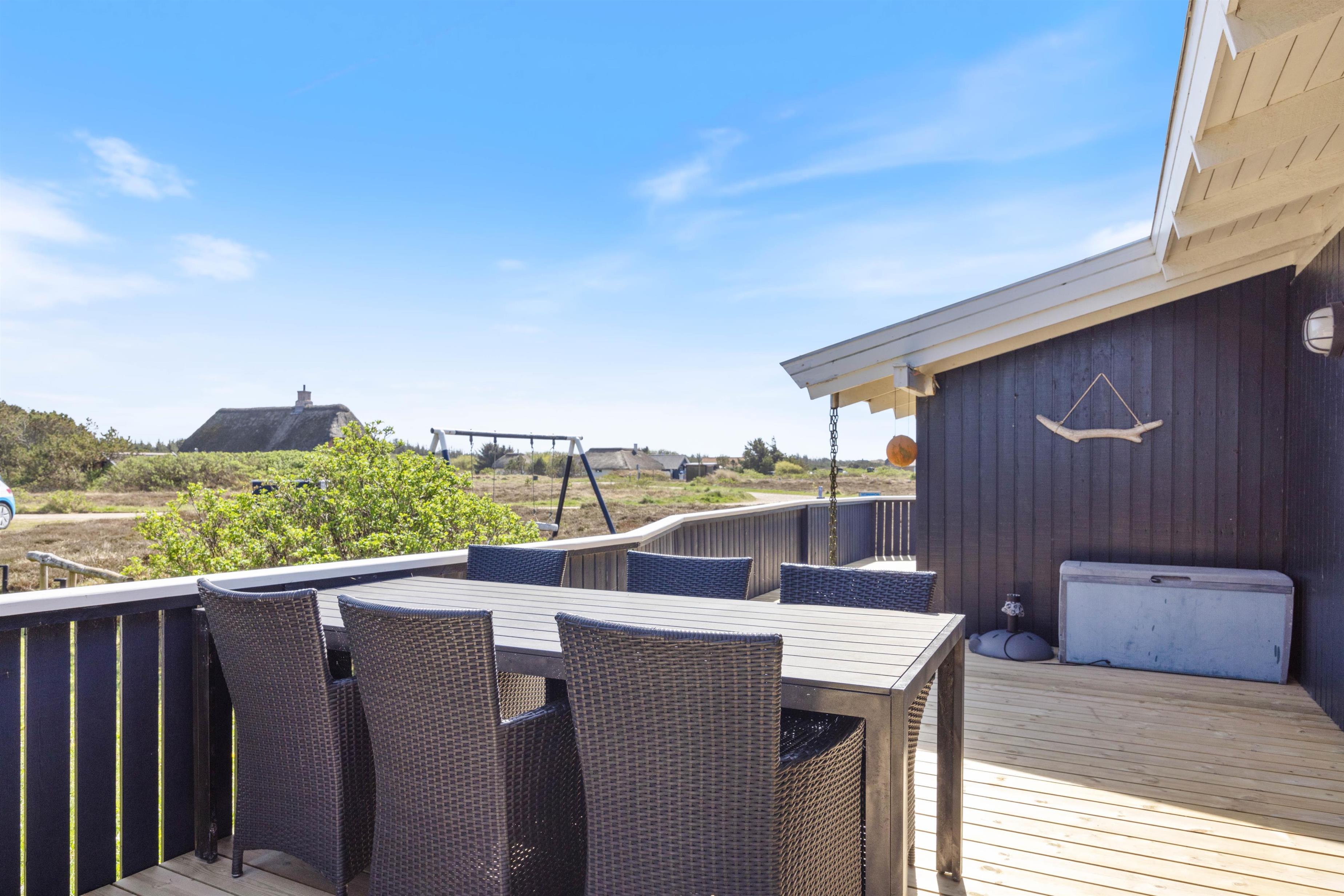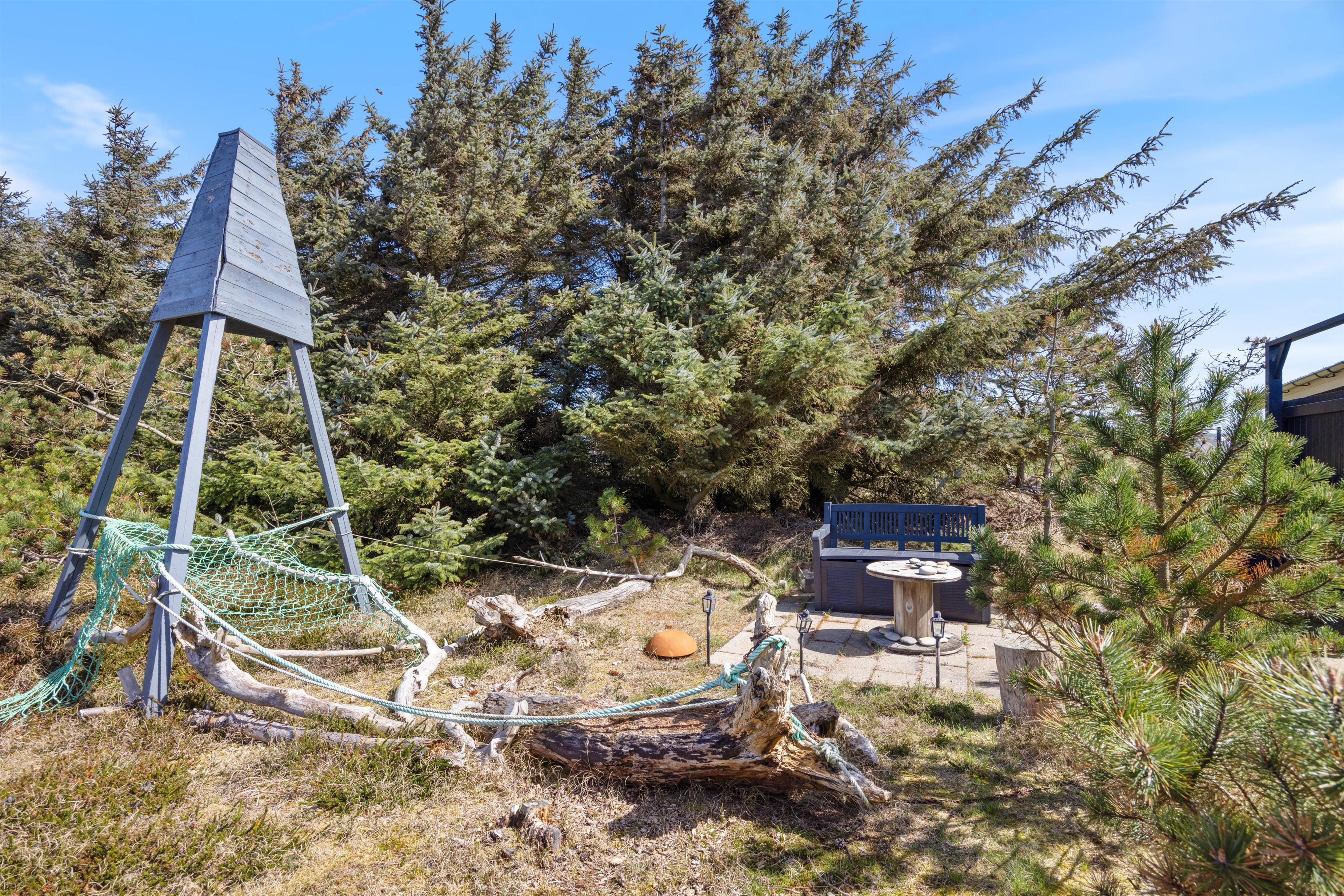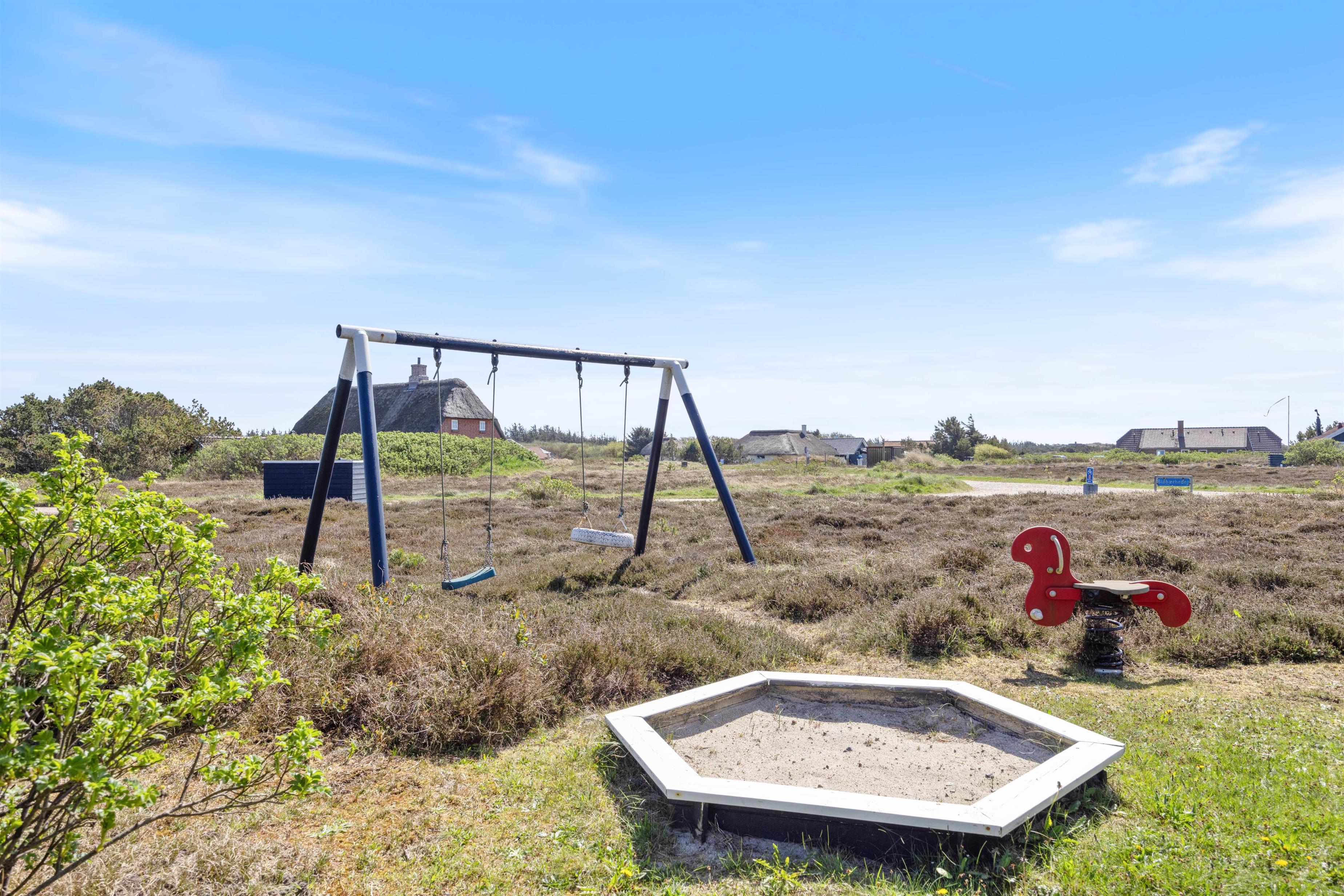 Mens I kan slappe af på liggestolene eller i hængekøjen, kan børnene gynge eller lege i sandkassen. Nyd udsigten over hedelandskabet - et vidunderligt sted at komme ned i tempo. Om aftenen kan I nyde en hyggelig grillaften og se solen gå ned bag klitterne.