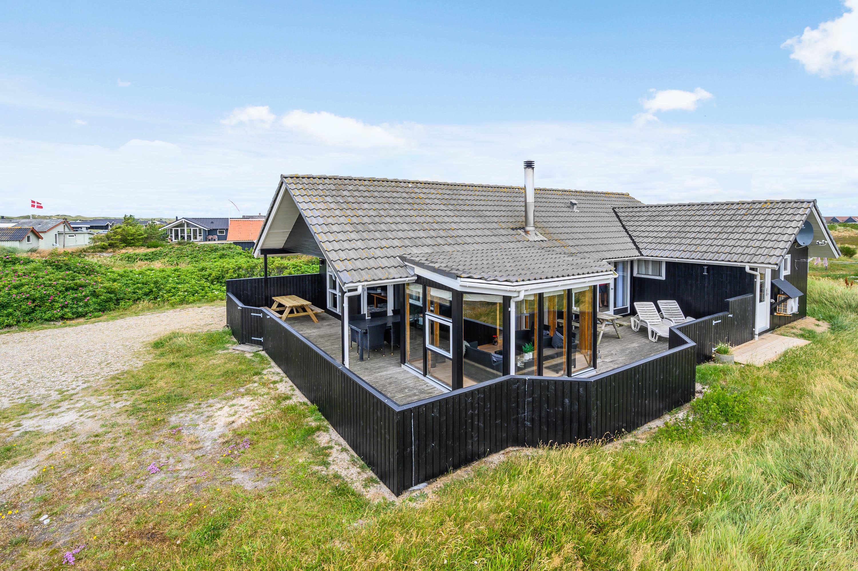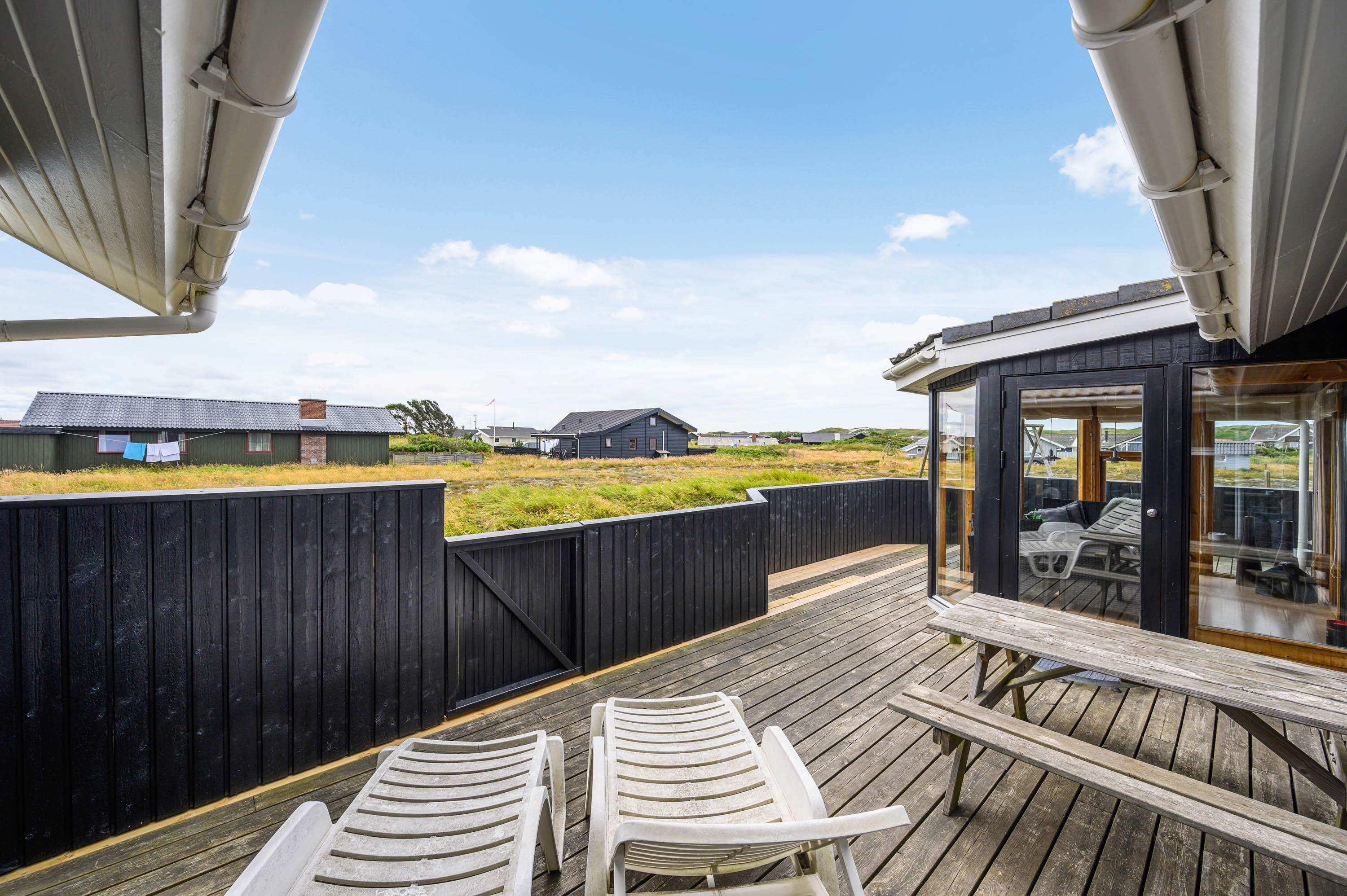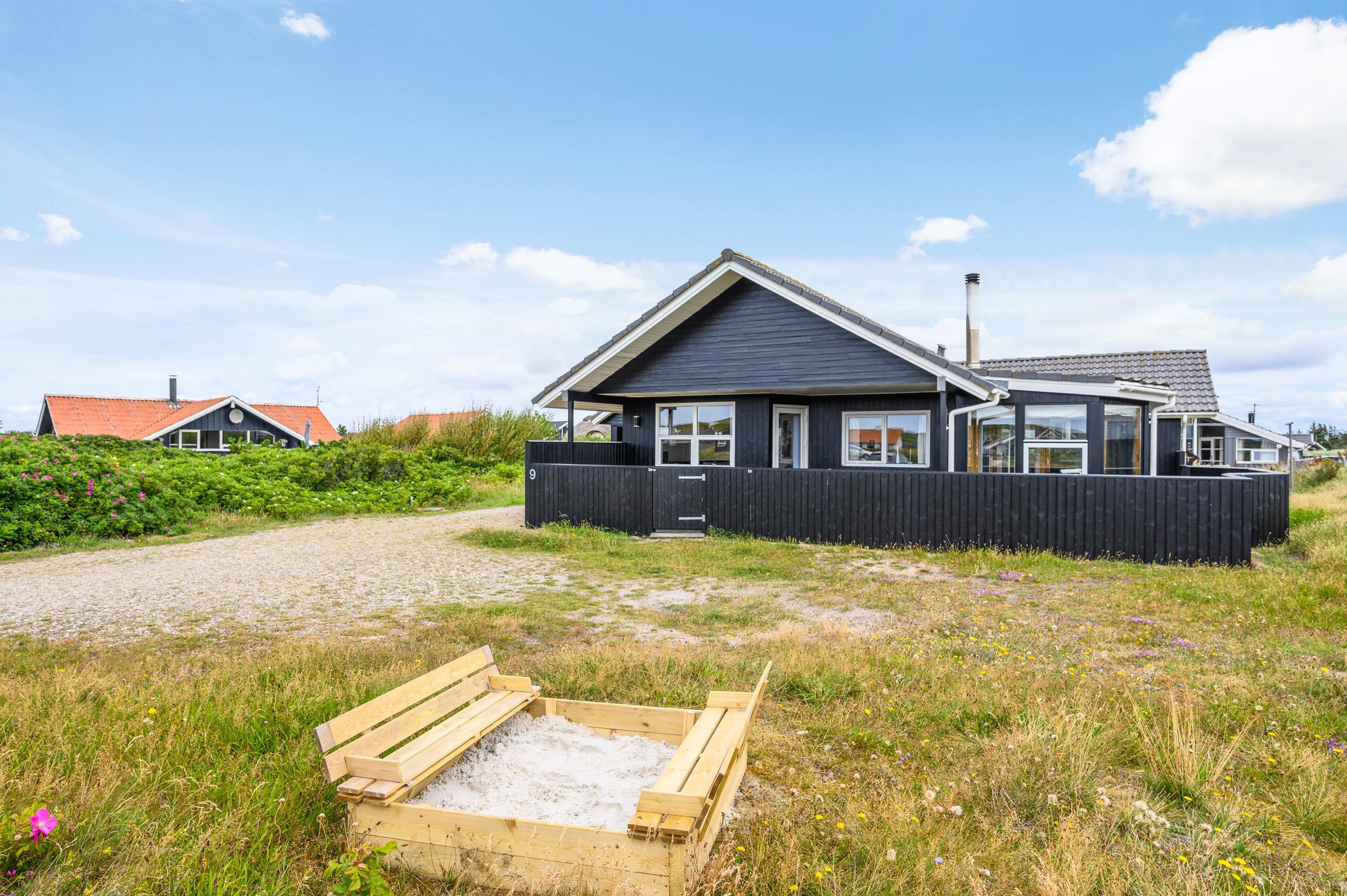 På naturgrunden, der bare ligger 400 meter fra det brusende Vesterhav, er der også tænkt på børnene. Hvis de ikke boltrer sig på stranden, kan de snuppe sig en gyngetur eller lege i sandkassen, mens de voksne indenfor synsvidde hygger på terrassen. Skulle der efter dagens strabadser være top på vasketøjskurven, klares vasketøjet nemt, da der i sommerhuset findes både vaskemaskine og tumbler.
