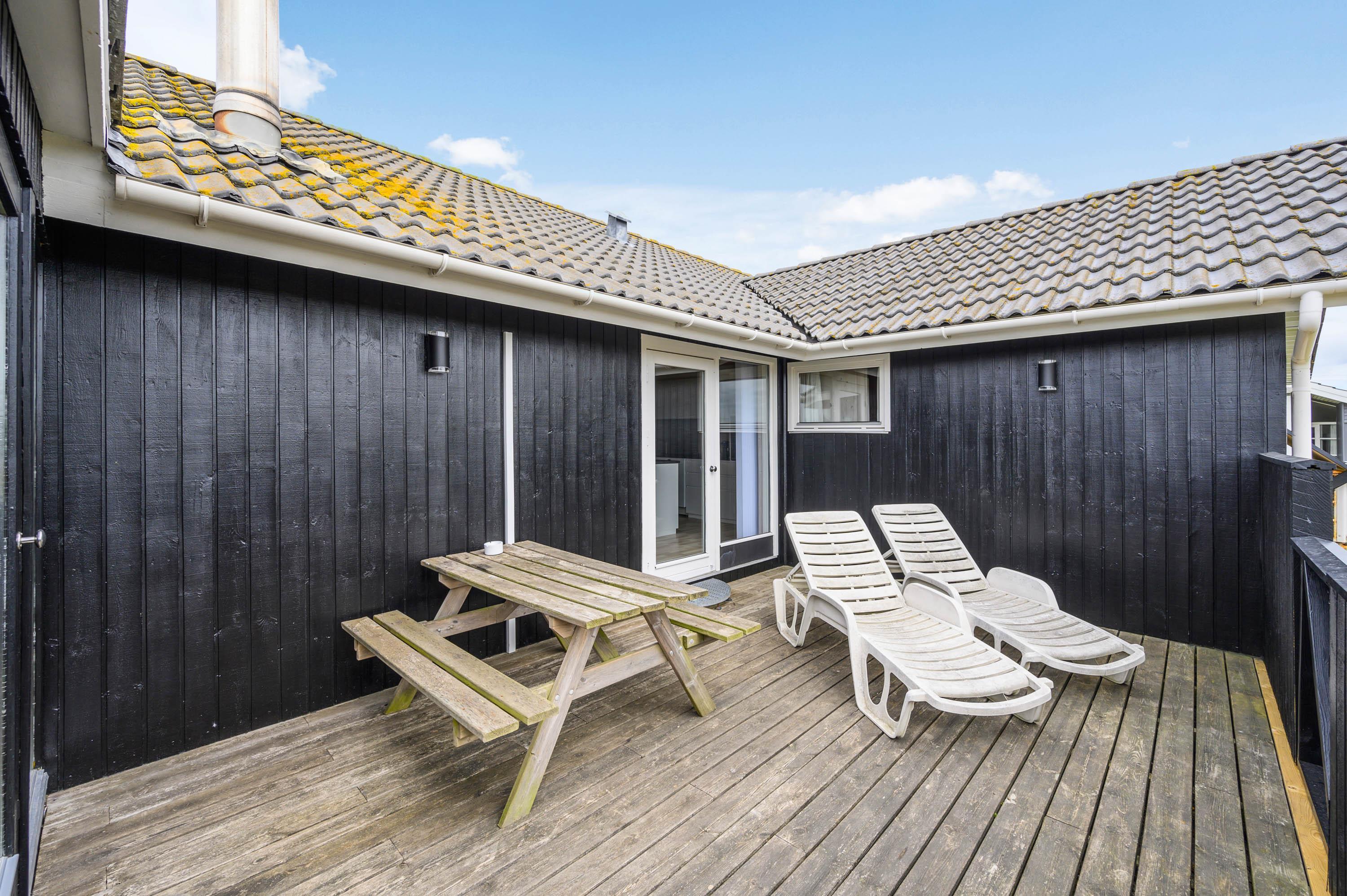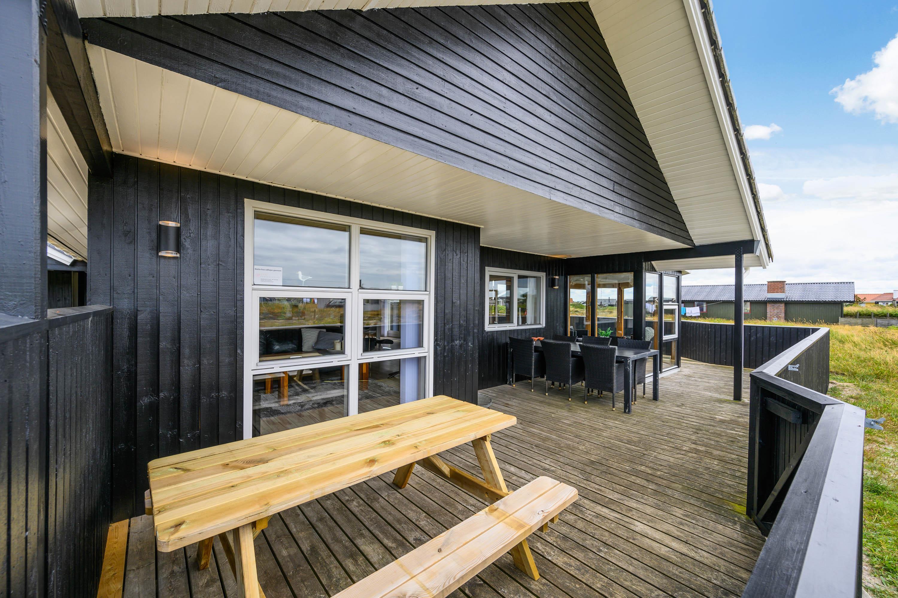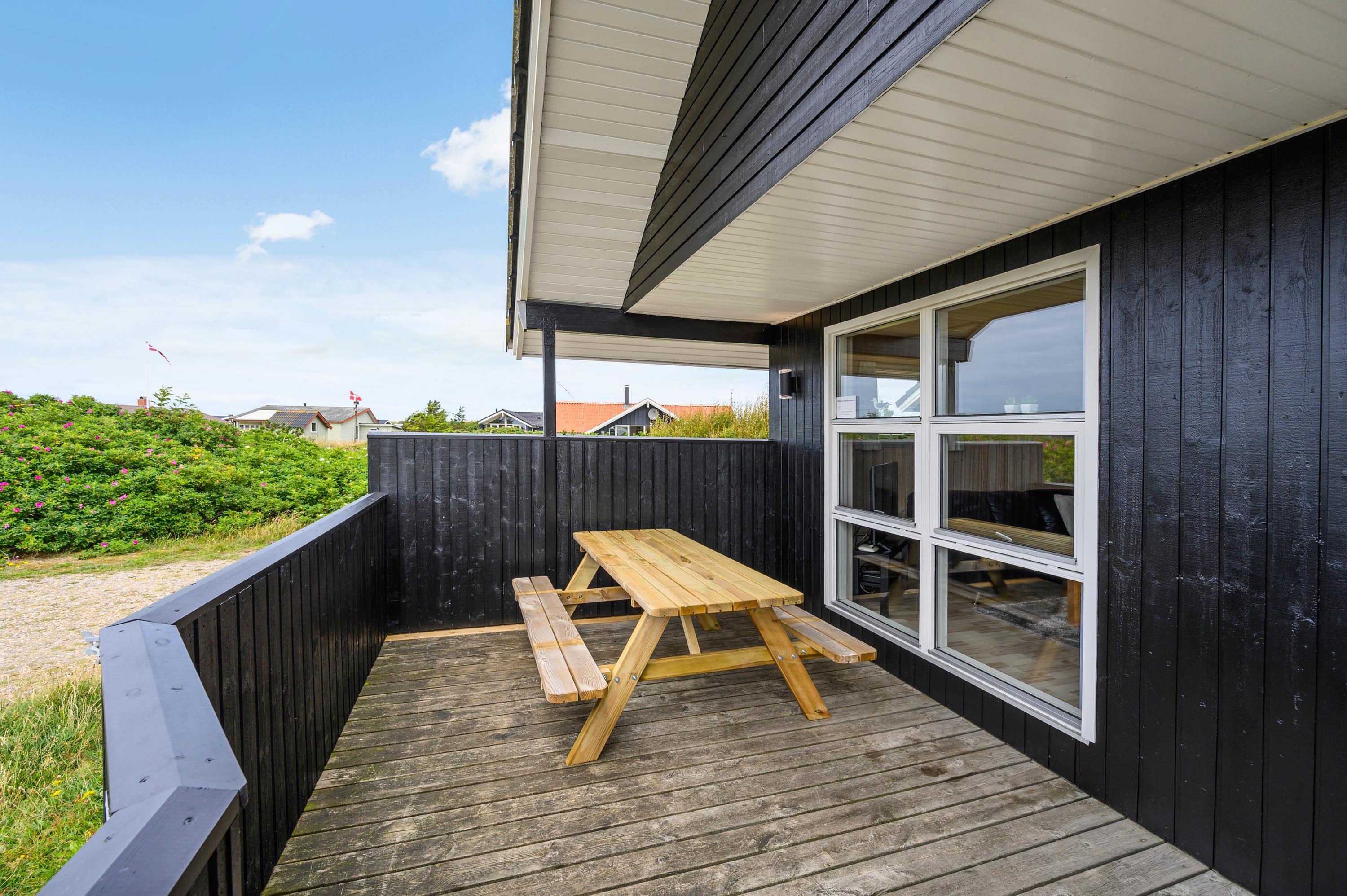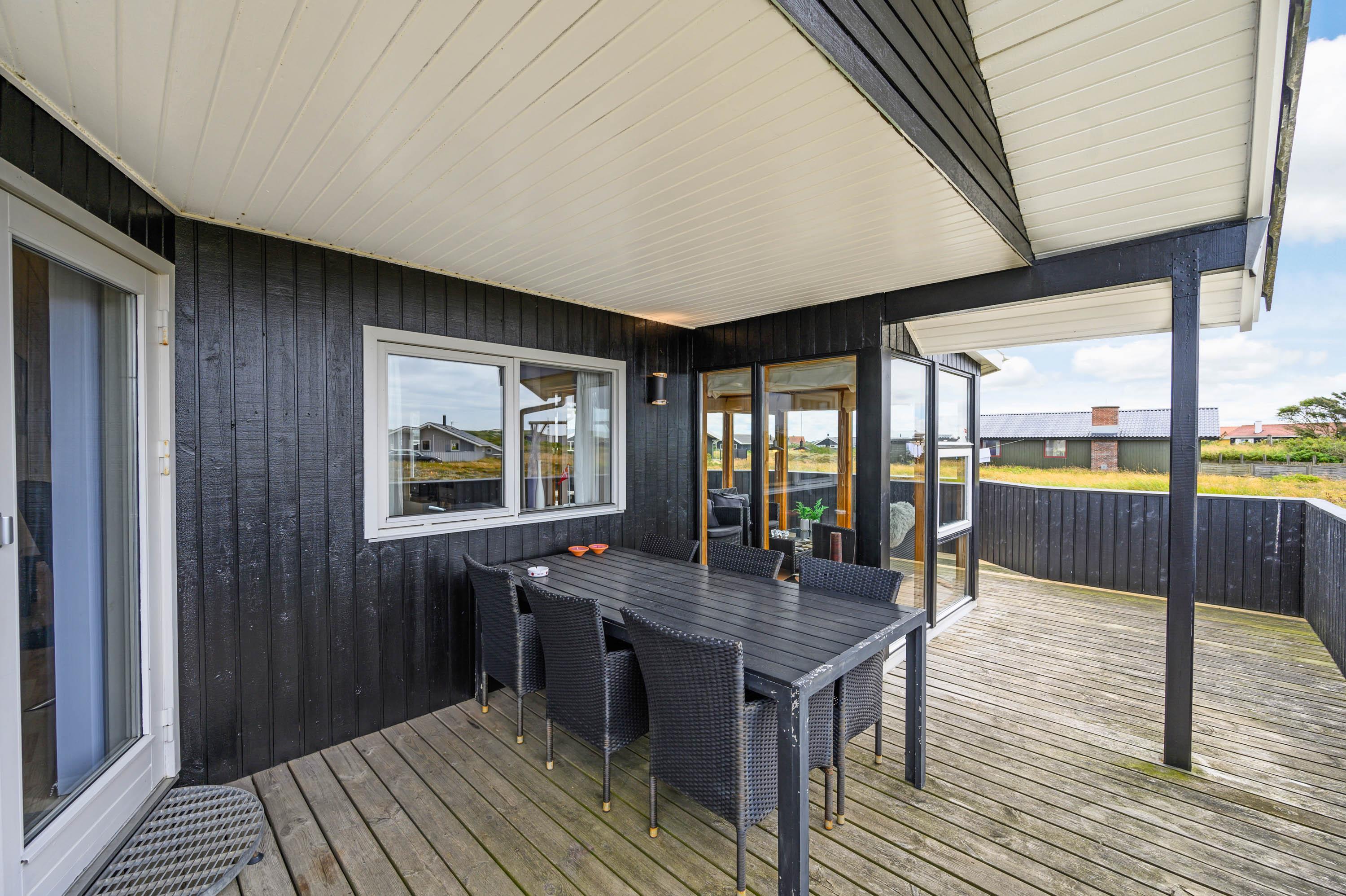 På naturgrunden, der bare ligger 400 meter fra det brusende Vesterhav, er der også tænkt på børnene. Hvis de ikke boltrer sig på stranden, kan de snuppe sig en gyngetur eller lege i sandkassen, mens de voksne indenfor synsvidde hygger på terrassen. Skulle der efter dagens strabadser være top på vasketøjskurven, klares vasketøjet nemt, da der i sommerhuset findes både vaskemaskine og tumbler.