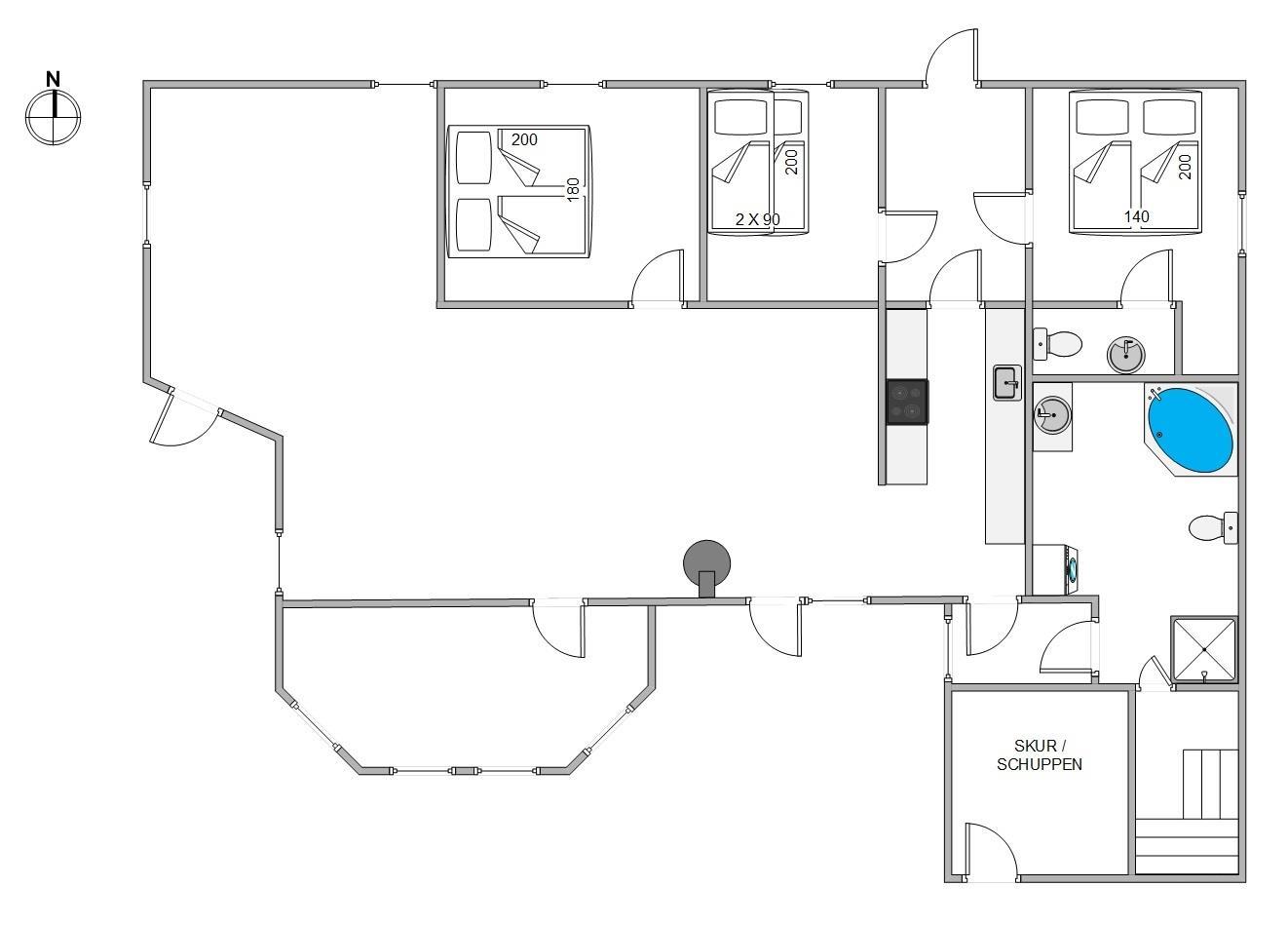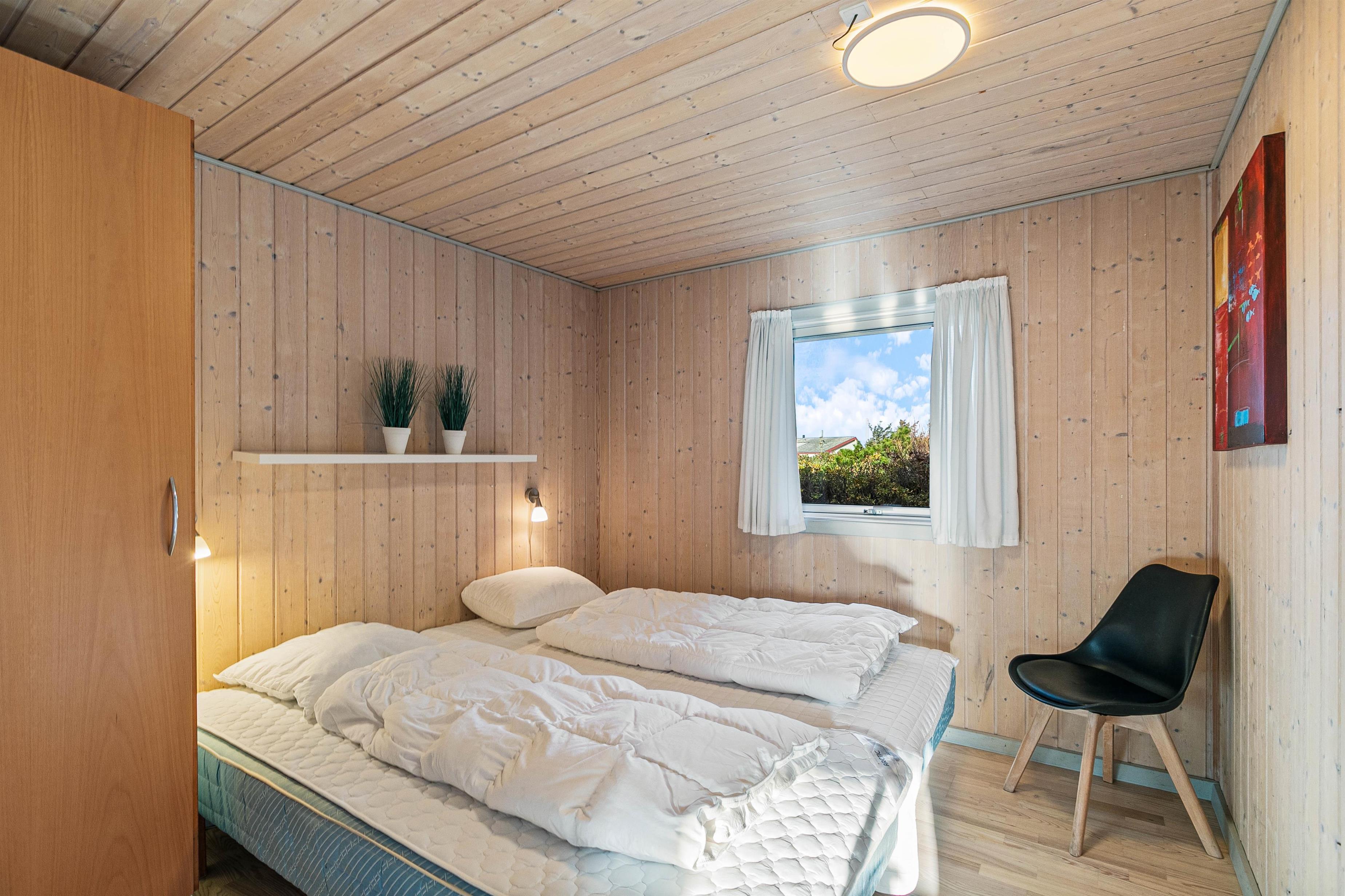 I sommerhuset findes der et praktisk gæstetoilet, der kan afbøde mulig kø, hvis andre hygger i spa eller sauna i det store badeværelse med gulvvarme – en perfekt afslutning på en dejlig dag, inden I går til ro for natten i feriehusets 3 soveværelser.