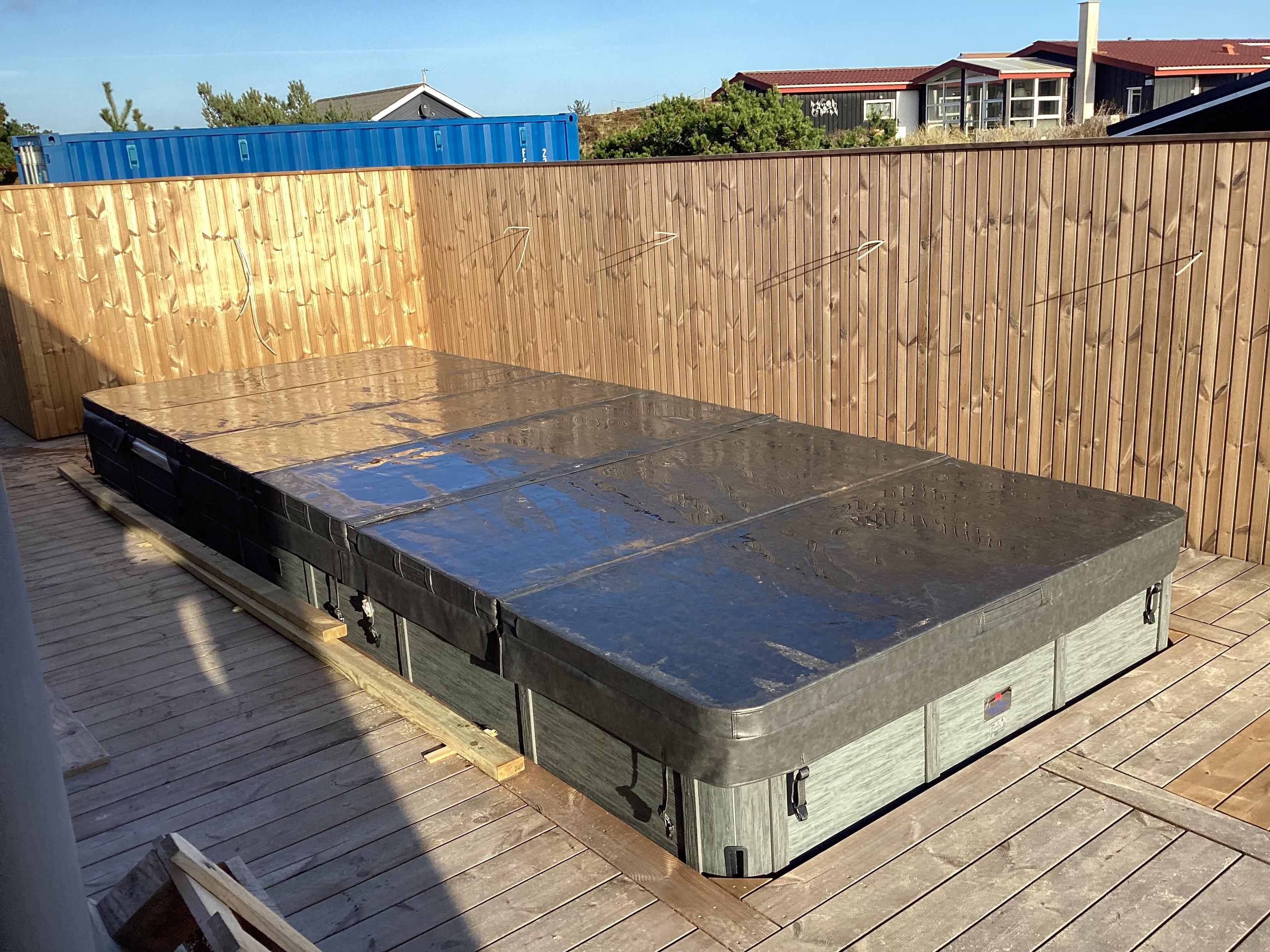 Fra alrummet er der udgang til en stor lukket træterrasse. Terrassen er perfekt til afslapning og nydelse med både udespa og udebruser, som giver en luksuriøs følelse af velvære. I udespaens dejlige varme kan I nyde den flotte stjernehimmel – og i løbet af dagen kan man træne i det andet bassin med integreret modstrømsanlæg – næsten som i en rigtig swimmingpool. Svømmebassinet er også opvarmet. Udebruseren kan bruges fra april til november.