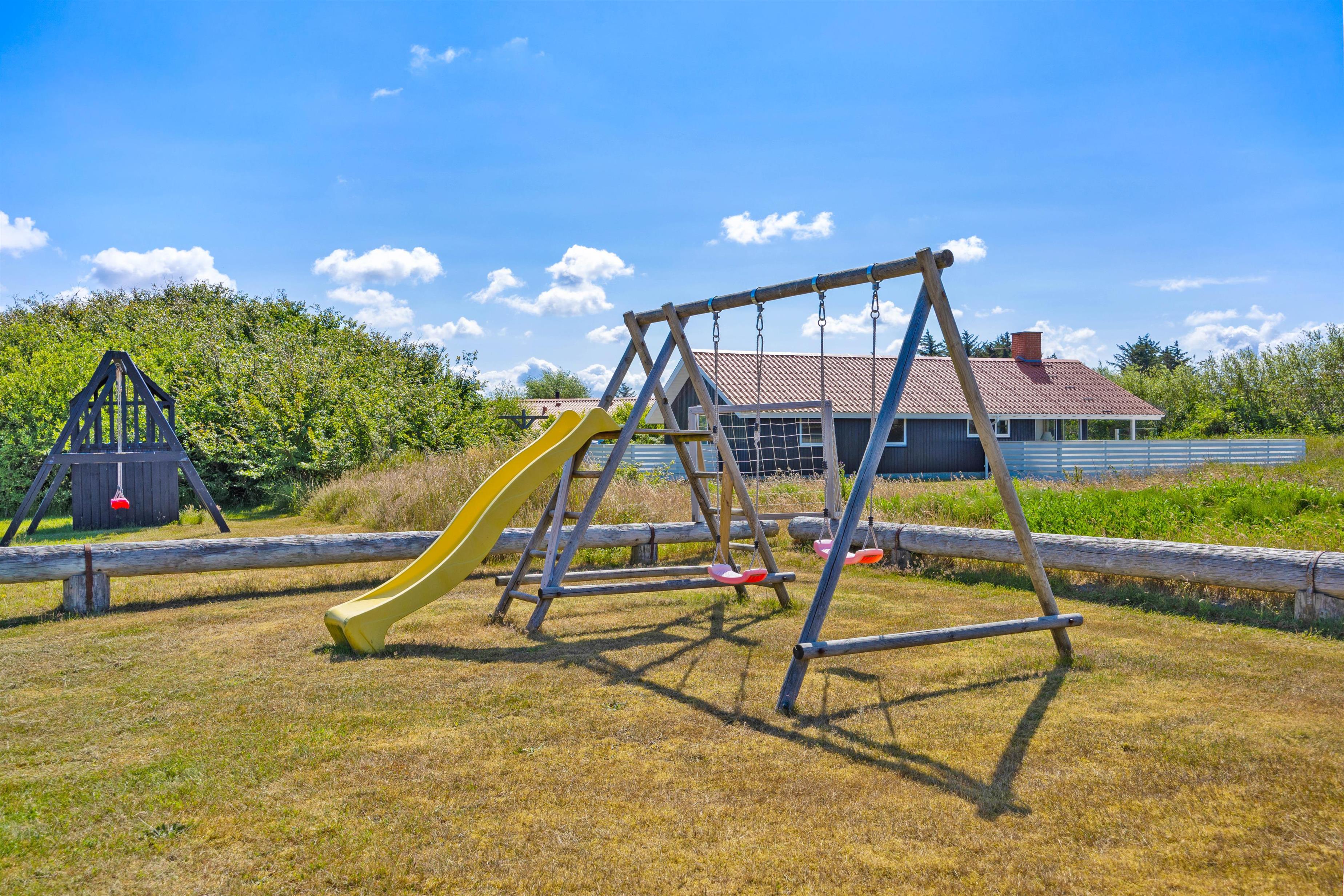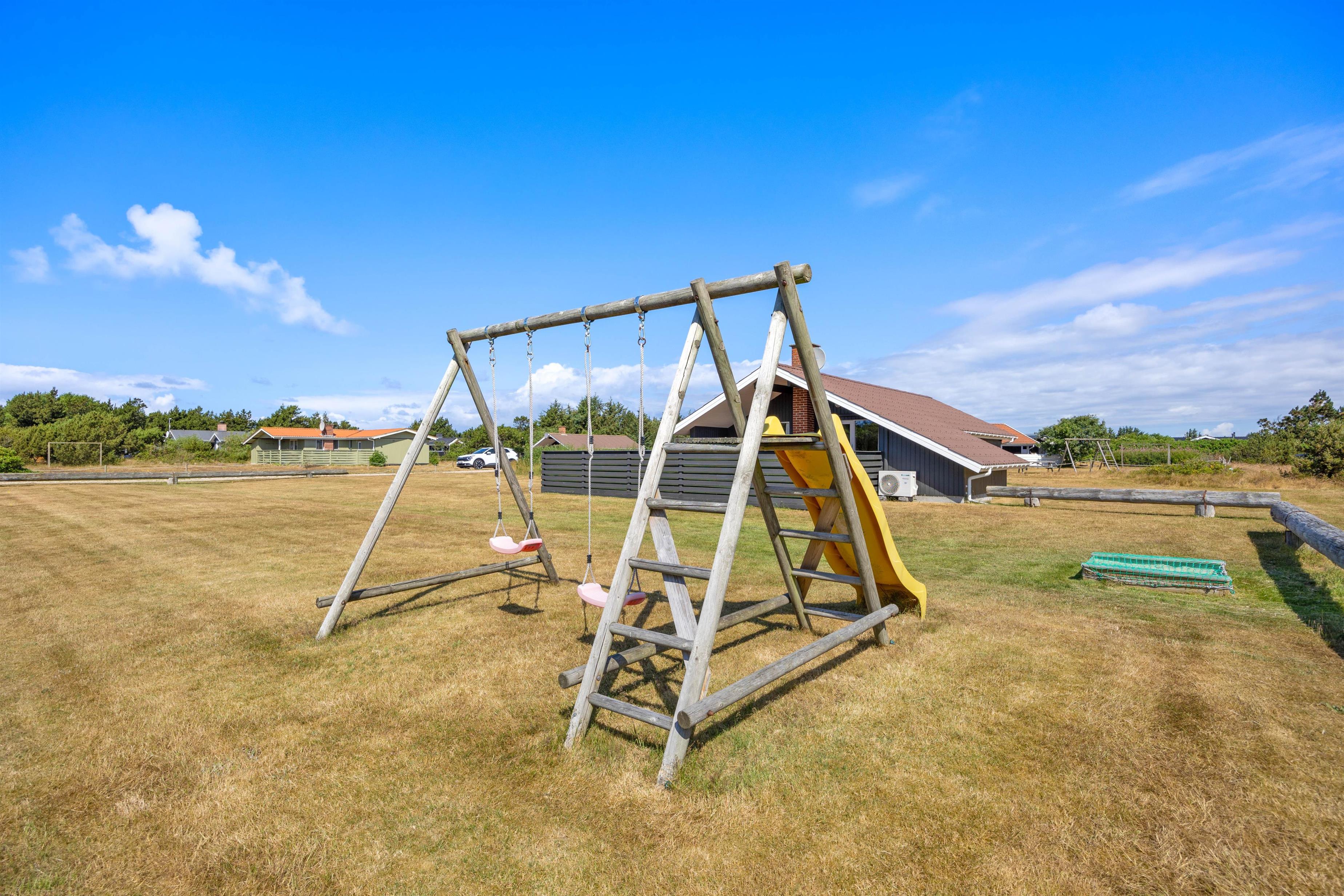 På den store plænegrund er der desuden både gynger og sandkasse til stor glæde for de små. Blot 400 meter fra sommerhuset ligger den lokale købmand i Bjerregård, og med kun 900 meter til Vesterhavet kan I altid planlægge en gåtur hertil og gå en tur langs stranden.