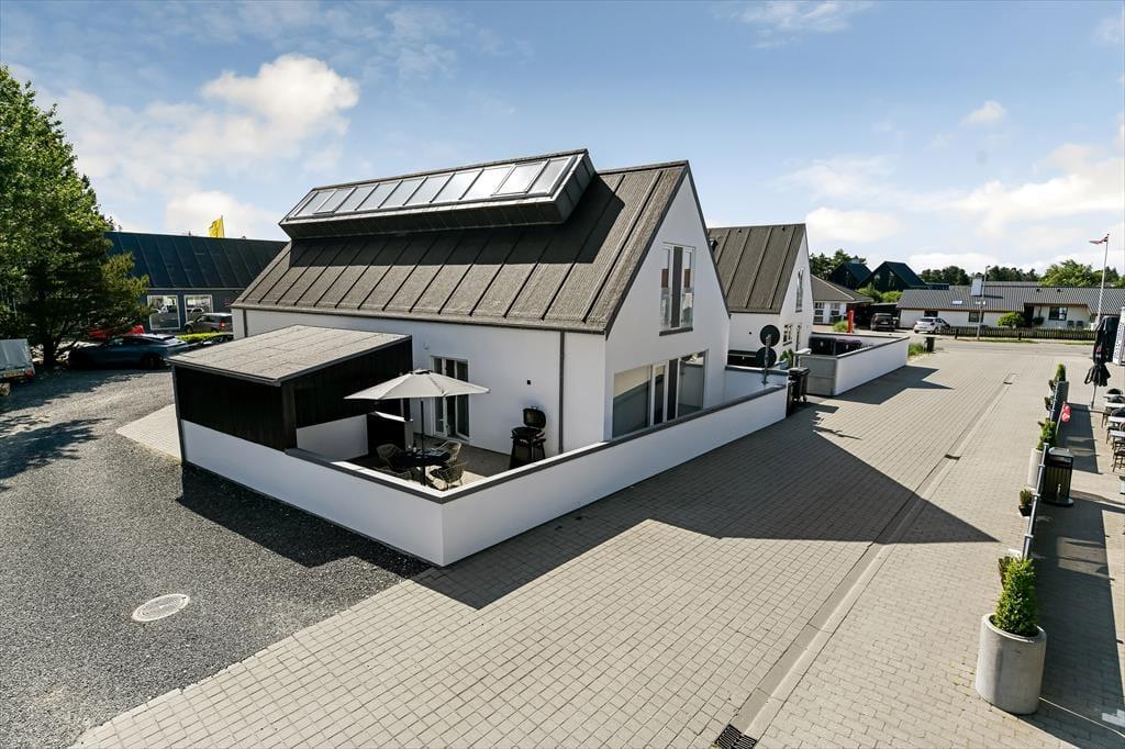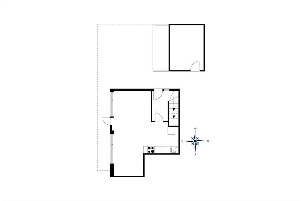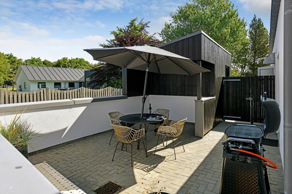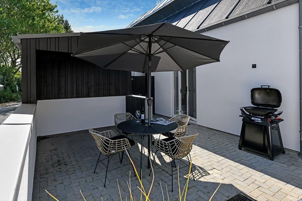 Foran lejligheden har du en mindre, privat terrasse, hvor der er havebord, stole og en god grill. Her kan du nyde aftensolen og feriens måltider, hvis vejret tillader det. Lejligheden ligger bagerst i den ejendom, hvor også Blåvand har kontor og således ikke helt ud til hovedgaden, selvom placeringen er midt i den travle ferieby.