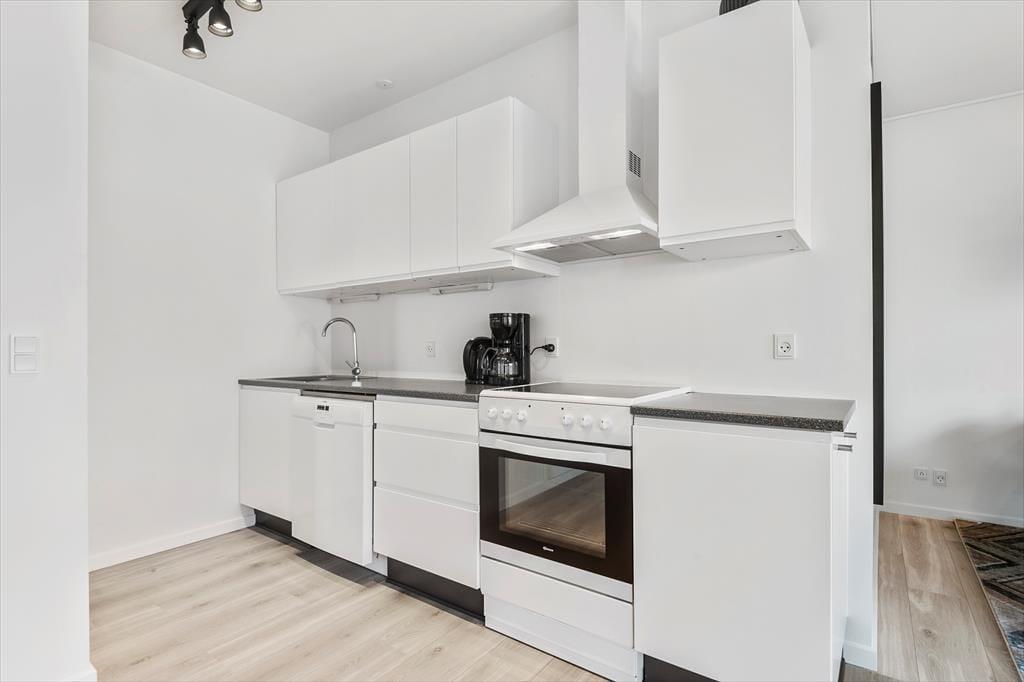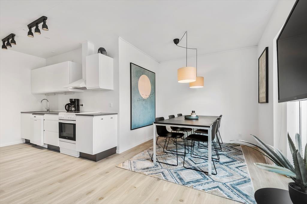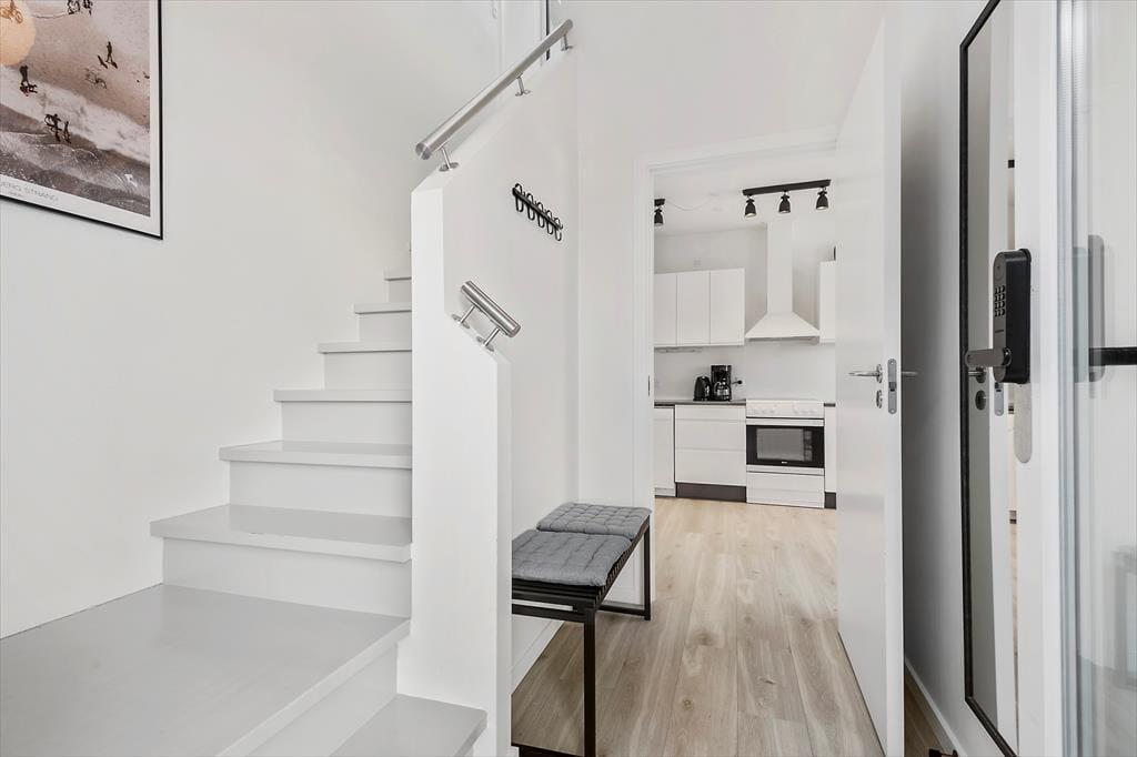 Lejligheden er indrettet i 2 plan. I stueetagen er der et kombineret køkken og opholdsrum med spiseplads og sofagruppe. Køkkenet er veludstyret med bl.a. opvaskemaskine og alt det udstyr, som der skal til for at kunne hygge sig med feriemadlavningen. Indretningen er smagfuld og elegant, og der er gode kvalitetsmøbler. TV med danske og tyske programmer samt gratis Wi-fi. På 1. sal er der to soverum med hver en dobbeltseng. Bemærk kun skabsplads i det ene soverum. Hertil et lækkert badeværelse, hvor også lejlighedens vaskemaskine findes.