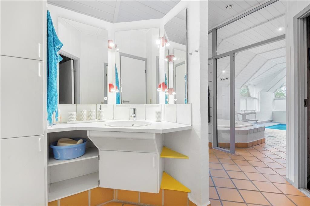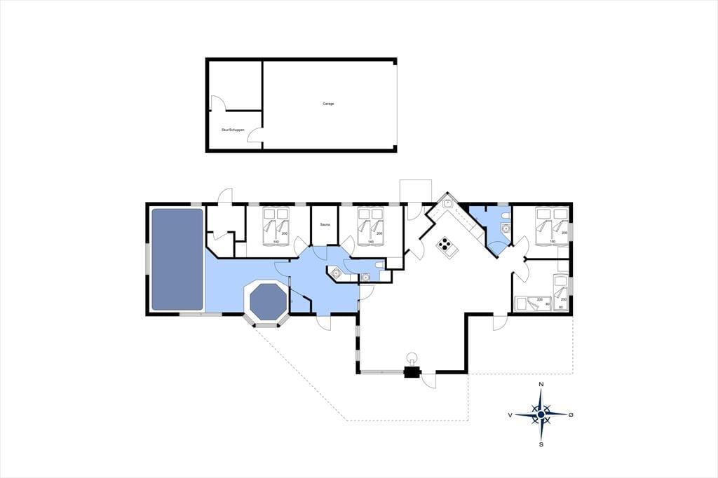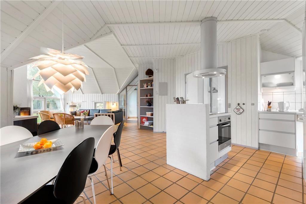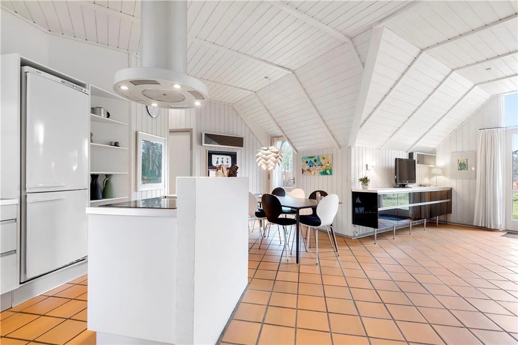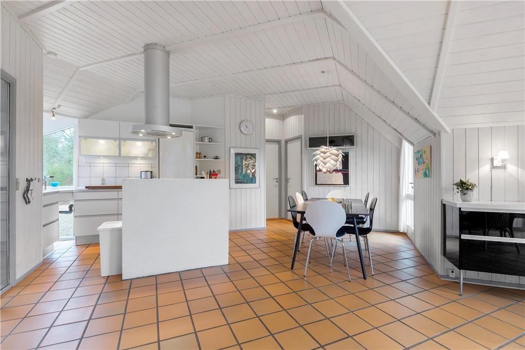 I sommerhuset finder I et dejligt, stort og lyst køkken, som ligger i åben forbindelse med stuen. Køkkenet har en muret kogeø, der vender ud mod spisepladsen, så der er rig mulighed for at deltage i hyggen, mens der laves mad. I stuen har I den smukkeste udsigt, som I kan sidde at nyde, mens ilden buldrer i brændeovnen. Der er en rigtig god indretning i huset, på hver side at køkken og stue, er der to værelser med tilhørende badeværelser. Det gør, at sommerhuset er ideelt for to familier. I den ene ende af huset er der en 14m2 stor pool og en dejlig 4 personers standvandsspa. Huset er bygget i 1991, men har fået en gennemgribende renovering i 2008 og er nu opvarmet med to energibesparende varmepumper.