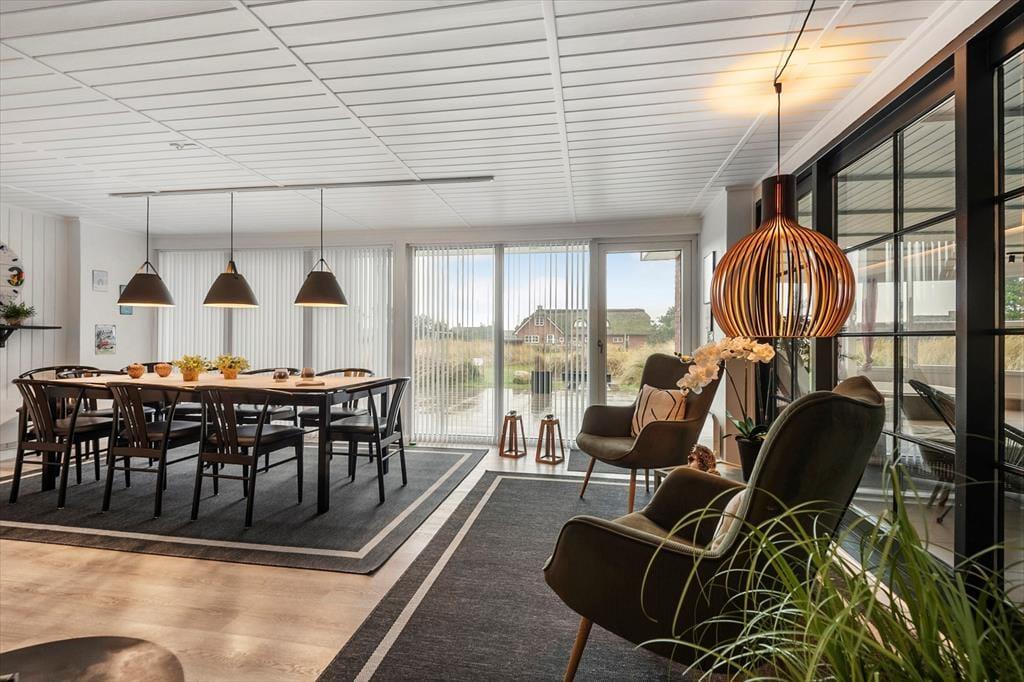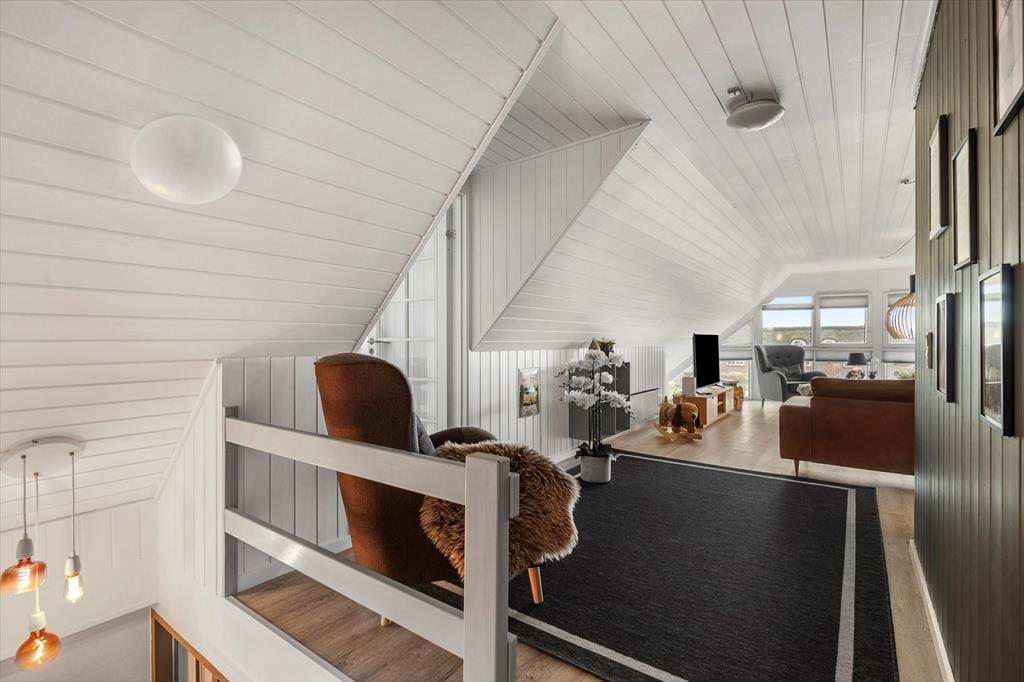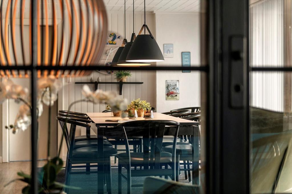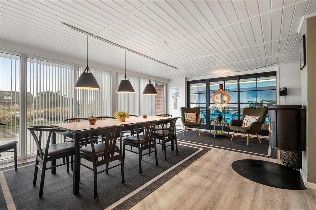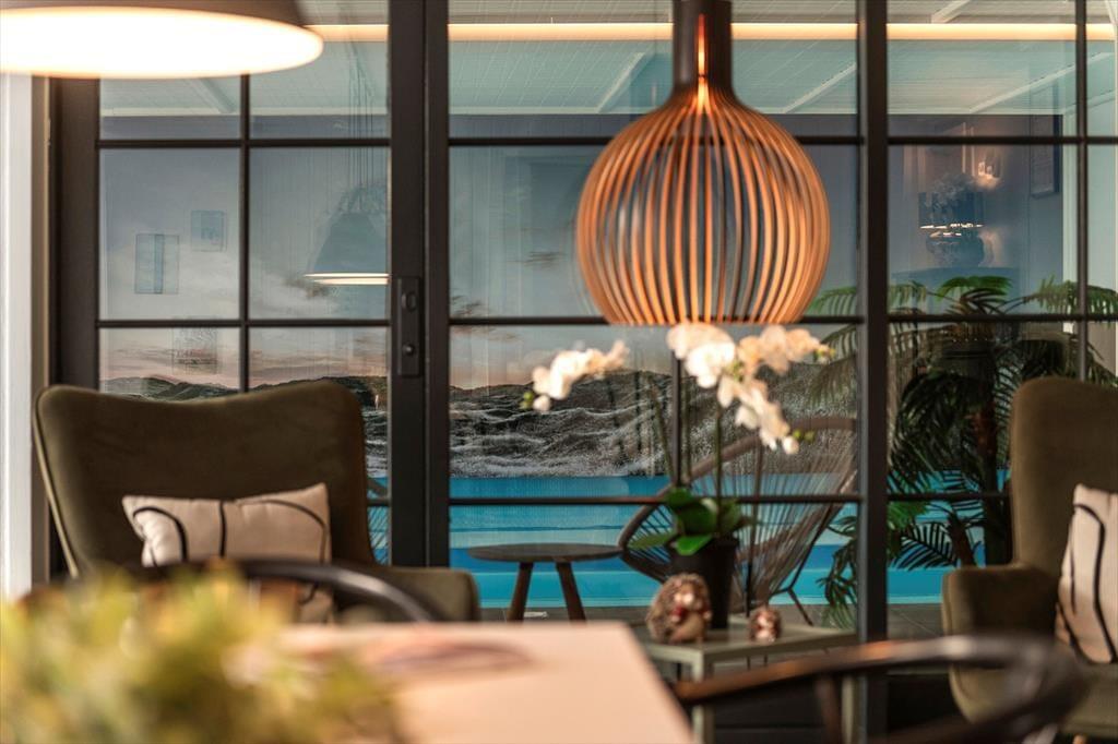 Inde i det stråtækte og særdeles velholdte sommerhus er atmosfæren lys og venlig – ikke bare i stueplan, men også på førstesalen. I alt på de to etager har I 250 m2 at brede jer på, og det betyder også, at 10 personer sagtens kan holde ferie sammen. Fire af sommerhusets fem soveværelser er placeret på førstesalen, der derudover byder på en skøn opholdsstue og et hyggeligt aktivitetsrum. Hvis I ikke bruger tiden heroppe på at spille bordfodbold og airhockey eller slappe af i sofaafdelingen, kan I samles i stueetagen – for eksempel til et lækkert måltid mad i spisestuen, der ligger i åben forbindelse med et veludstyret køkken. Et soveværelse og to badeværelser ligger også her i stueplan foruden poolafdelingen, hvor I kan benytte jer af saunaen, dampkabinen, spabadet og selve poolen.